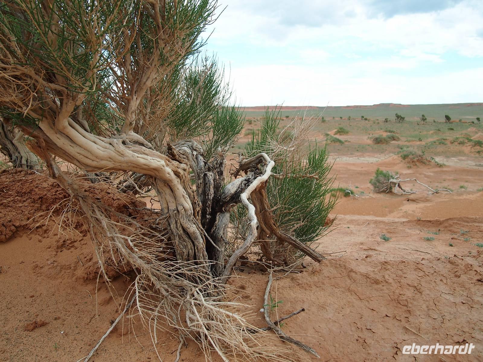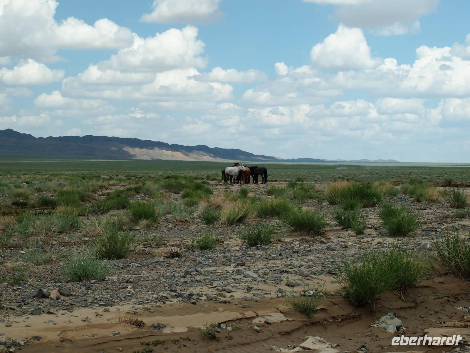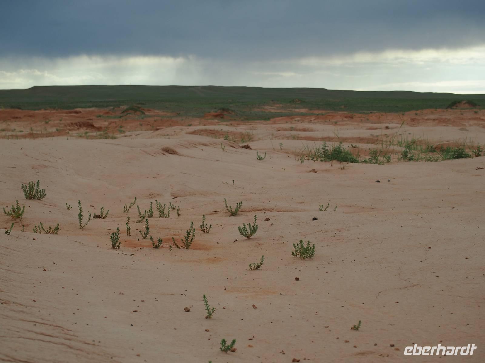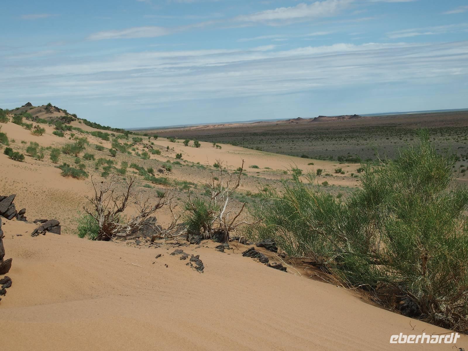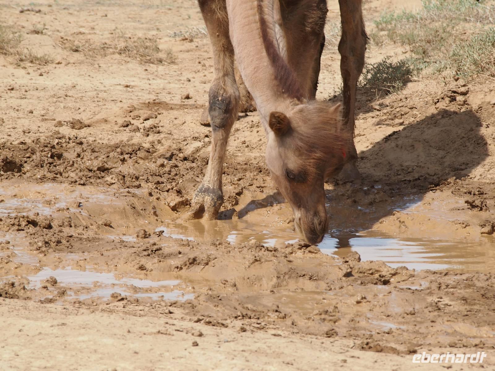 Nach dem Frühstück fuhren wir weiter Richtung Norden durch die Wüste Gobi. Nach relativ kurzer Fahrzeit hatte ein Auto eine Panne und so mussten wir eine kleine Zwangspause einlegen. Die Fahrer konnten das Problem schnell beheben, wir nutzten die Zeit, um die Pflanzenwelt zu begutachten und zu fotografieren. Zu unserem Glück waren zwei größere Kamelherden in unmittelbarer Nähe von uns und so machten wir uns auf den Weg die Tiere zu beobachten. Faszinierend und gespenstisch zugleich war das laute Röhren, welches die Kamele von sich gaben, da die Tiere, die wir bis dahin zu Gesicht bekommen hatten, völlig geräuschlos waren. Wir waren doch sehr erstaunt über den Klang, der mit einem Motorradgeräusch zu vergleichen ist.