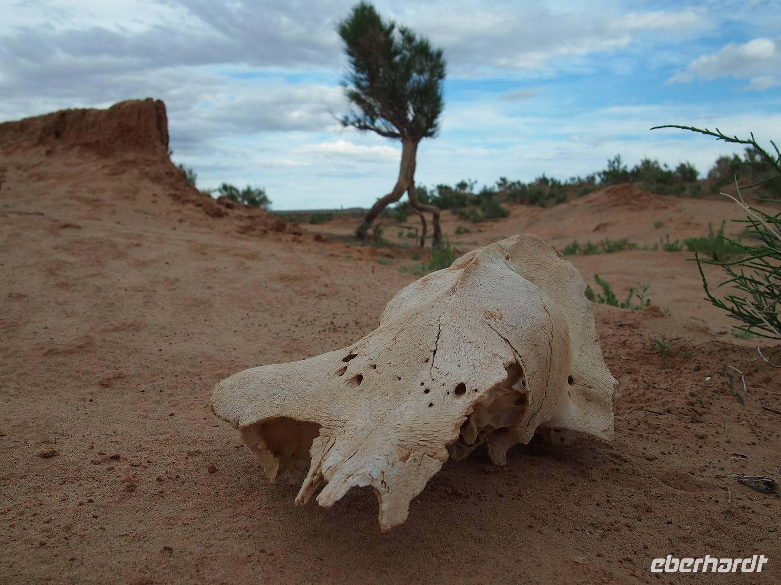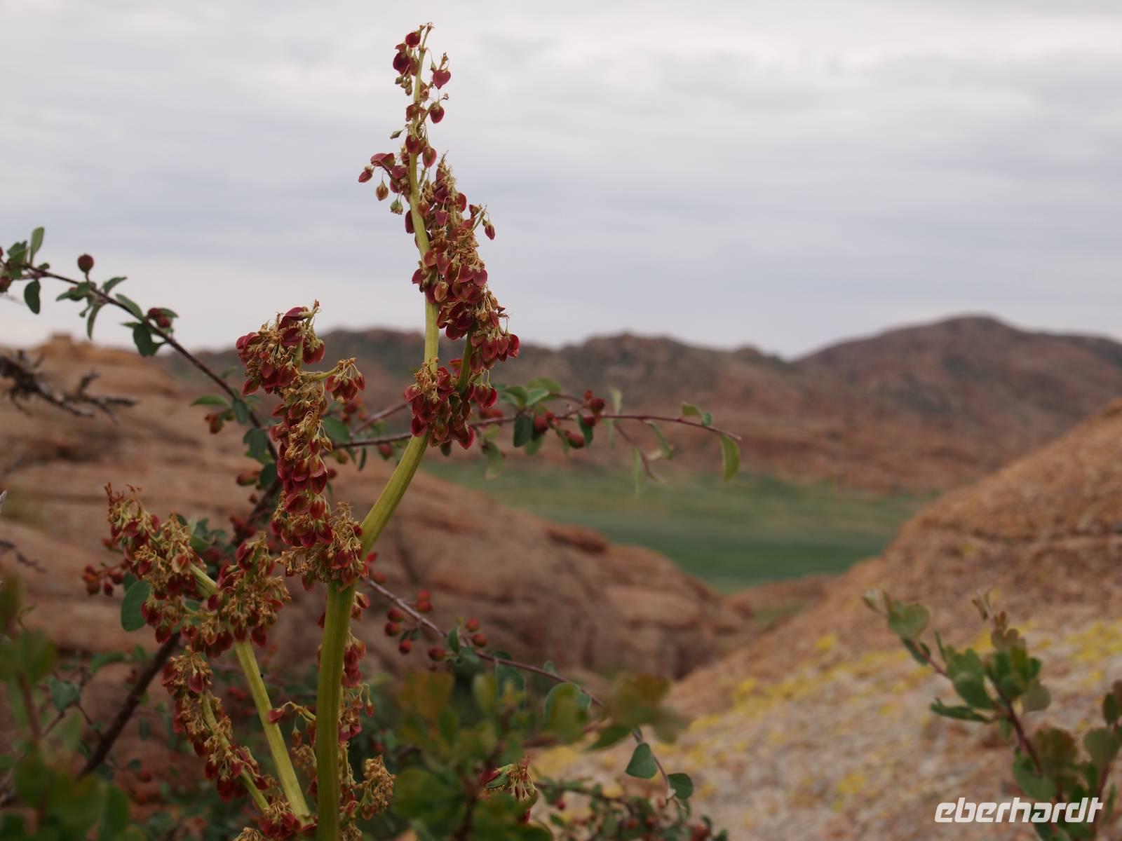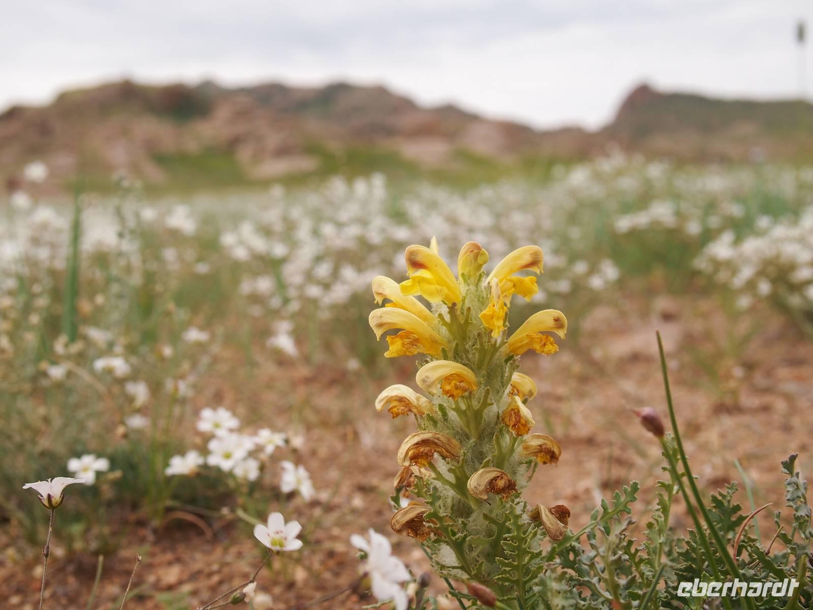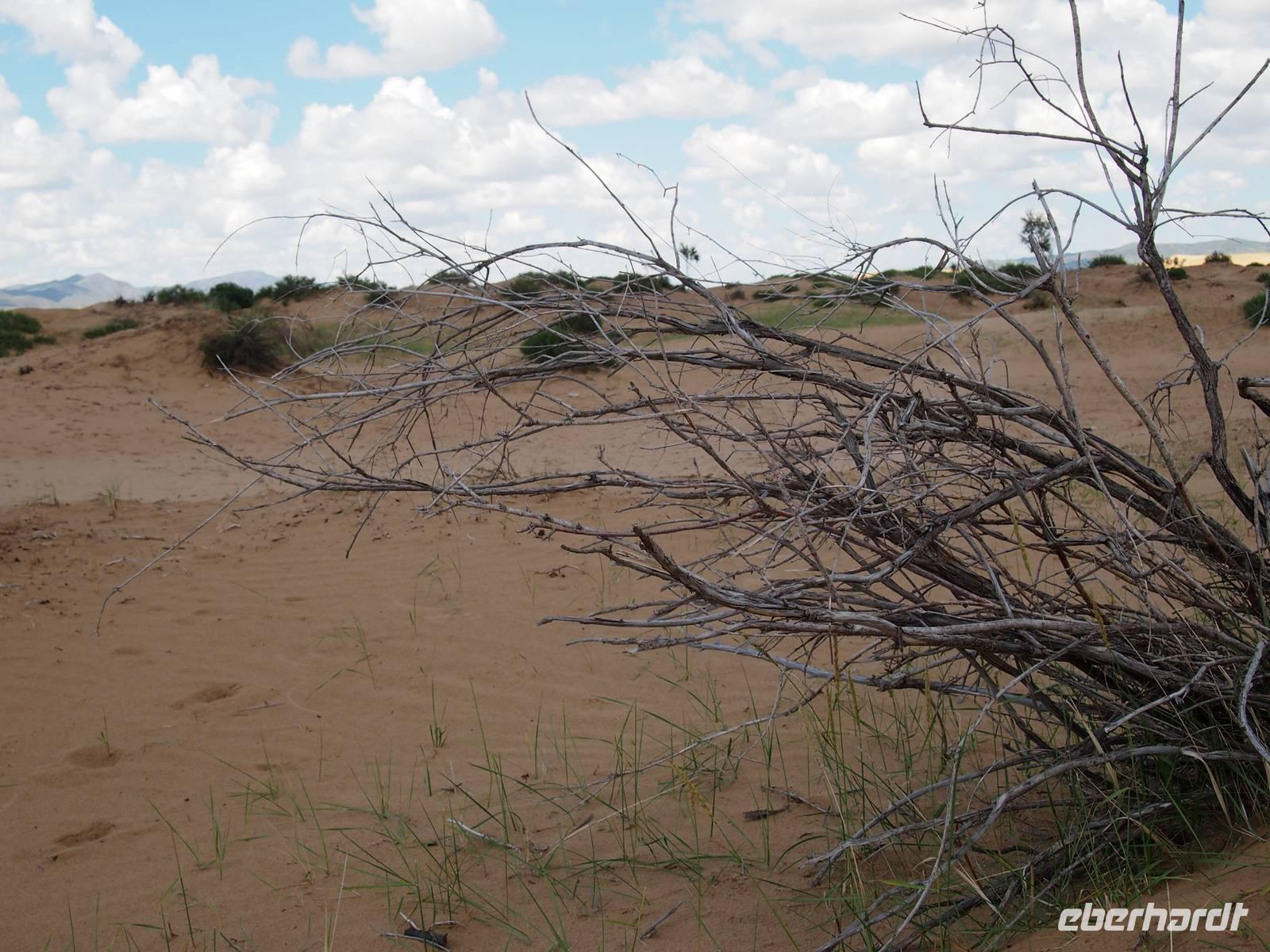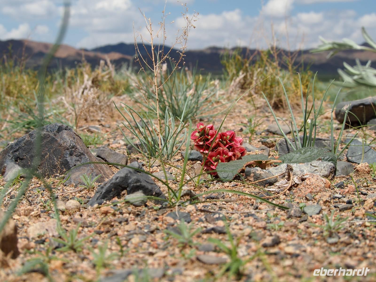 Nach dem Frühstück fuhren wir weiter Richtung Norden durch die Wüste Gobi. Nach relativ kurzer Fahrzeit hatte ein Auto eine Panne und so mussten wir eine kleine Zwangspause einlegen. Die Fahrer konnten das Problem schnell beheben, wir nutzten die Zeit, um die Pflanzenwelt zu begutachten und zu fotografieren. Zu unserem Glück waren zwei größere Kamelherden in unmittelbarer Nähe von uns und so machten wir uns auf den Weg die Tiere zu beobachten. Faszinierend und gespenstisch zugleich war das laute Röhren, welches die Kamele von sich gaben, da die Tiere, die wir bis dahin zu Gesicht bekommen hatten, völlig geräuschlos waren. Wir waren doch sehr erstaunt über den Klang, der mit einem Motorradgeräusch zu vergleichen ist.