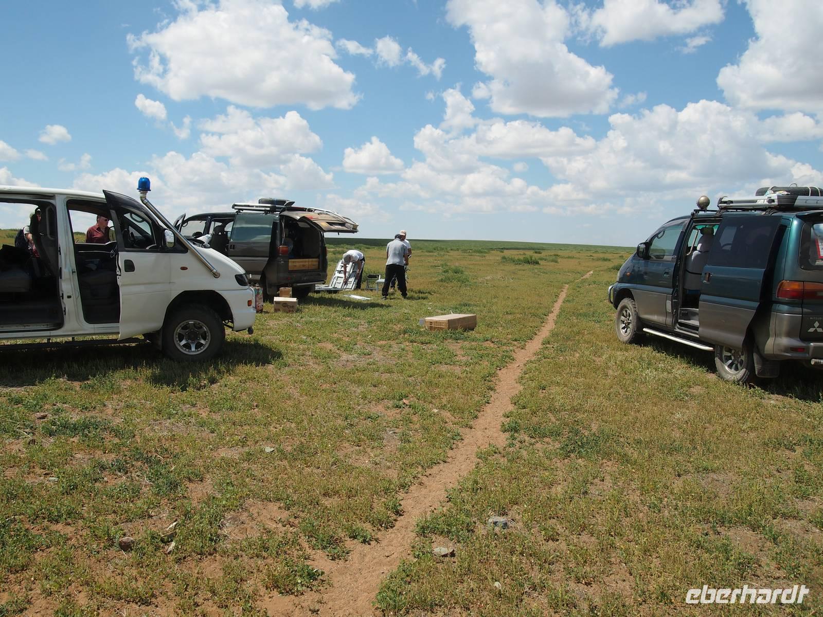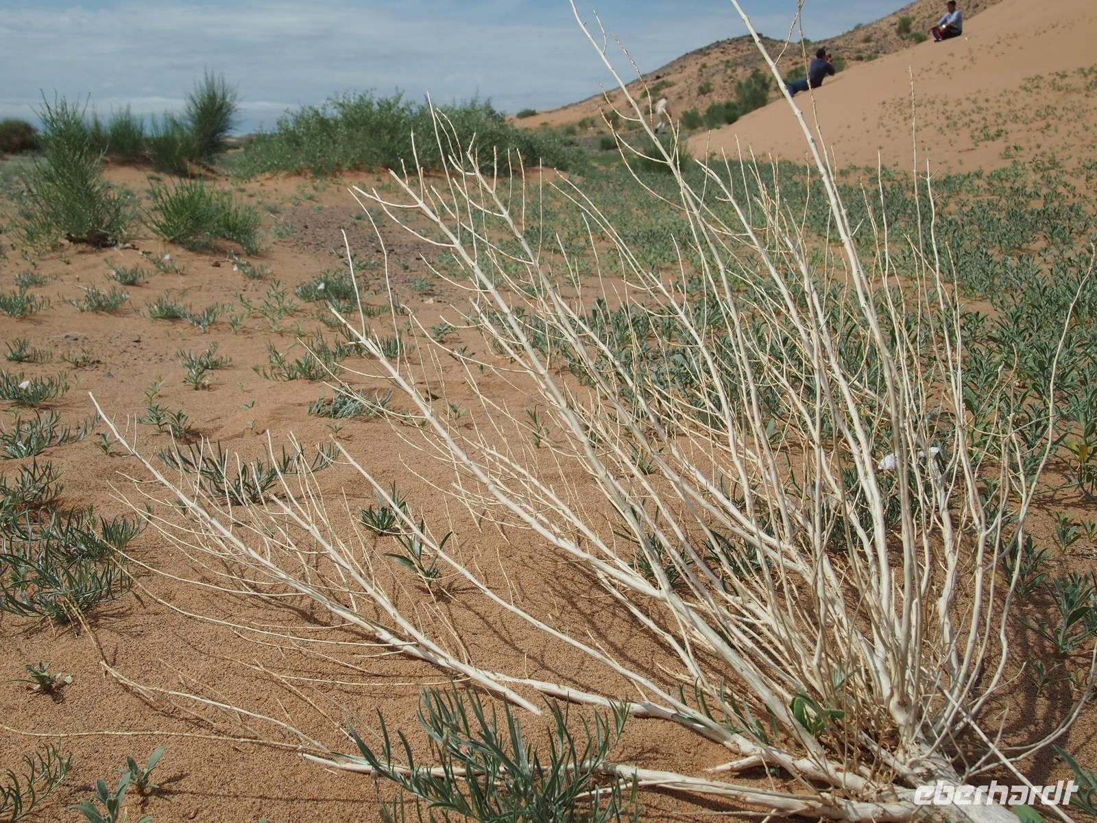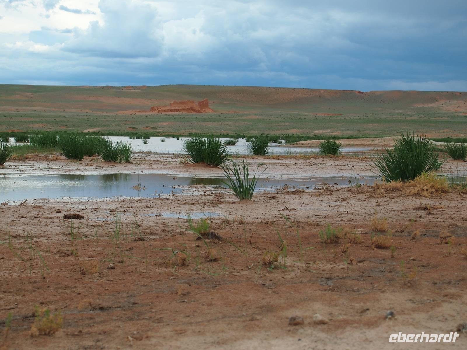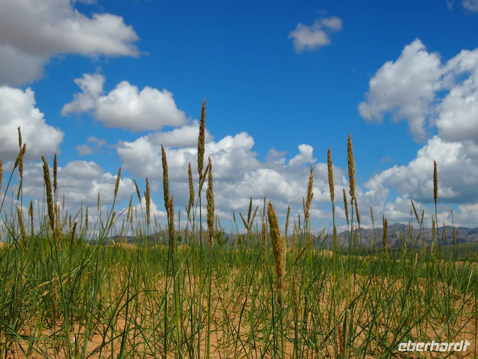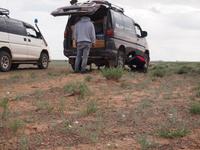 Nach dem Frühstück fuhren wir weiter Richtung Norden durch die Wüste Gobi. Nach relativ kurzer Fahrzeit hatte ein Auto eine Panne und so mussten wir eine kleine Zwangspause einlegen. Die Fahrer konnten das Problem schnell beheben, wir nutzten die Zeit, um die Pflanzenwelt zu begutachten und zu fotografieren. Zu unserem Glück waren zwei größere Kamelherden in unmittelbarer Nähe von uns und so machten wir uns auf den Weg die Tiere zu beobachten. Faszinierend und gespenstisch zugleich war das laute Röhren, welches die Kamele von sich gaben, da die Tiere, die wir bis dahin zu Gesicht bekommen hatten, völlig geräuschlos waren. Wir waren doch sehr erstaunt über den Klang, der mit einem Motorradgeräusch zu vergleichen ist.