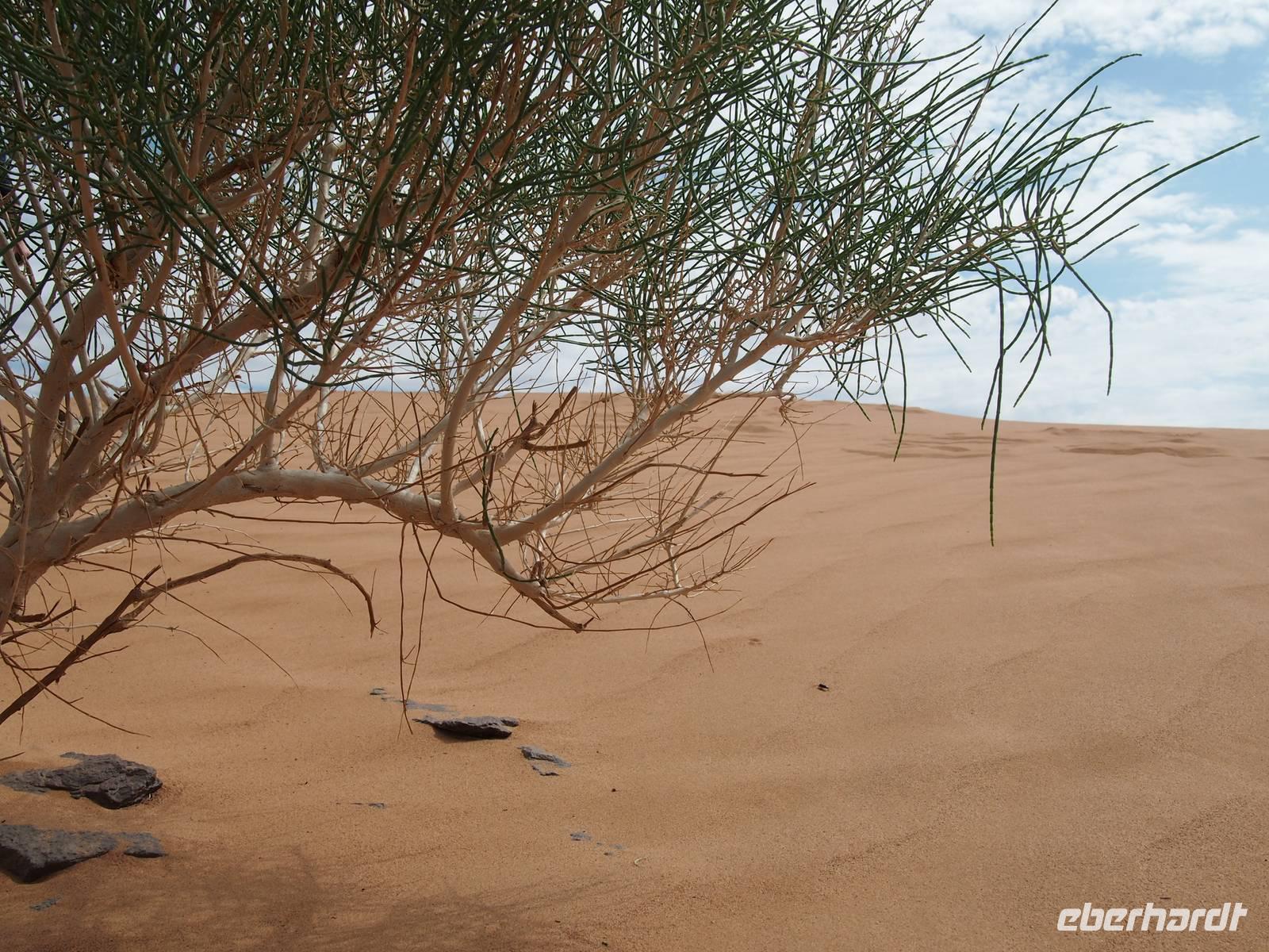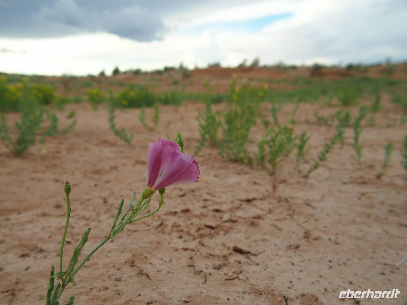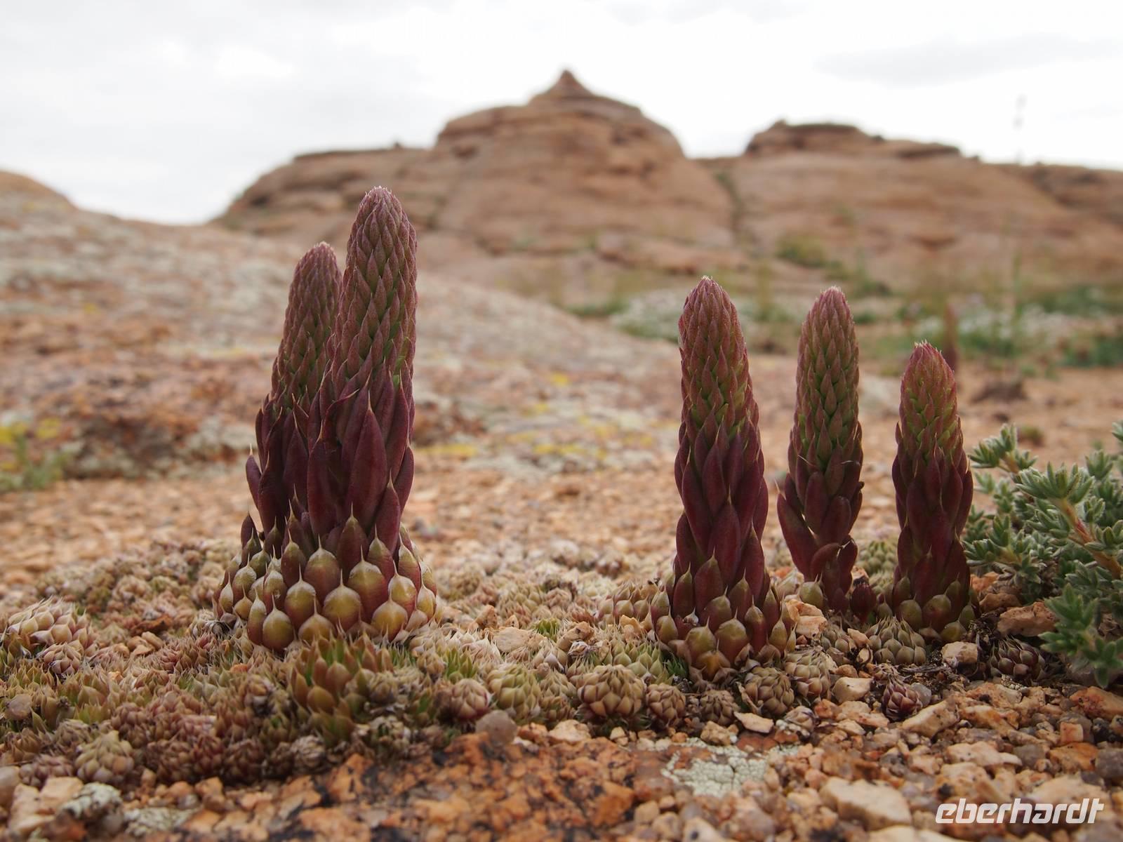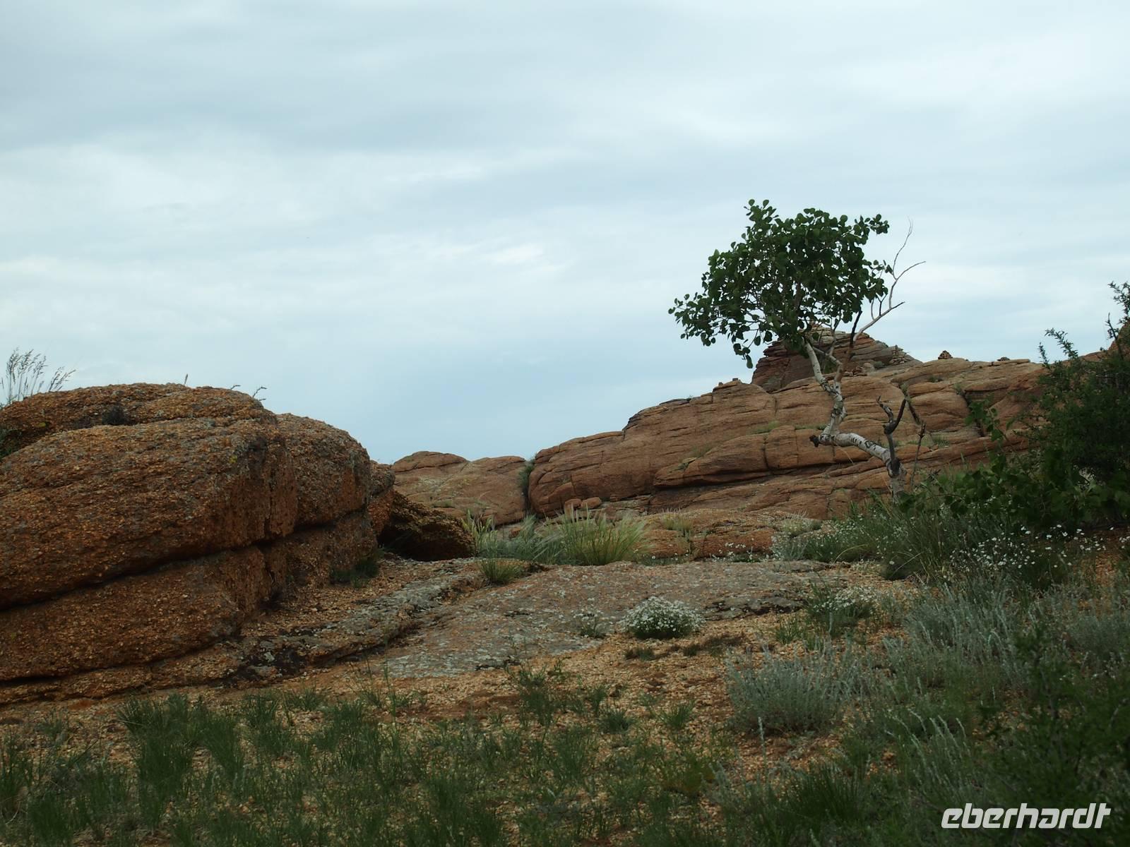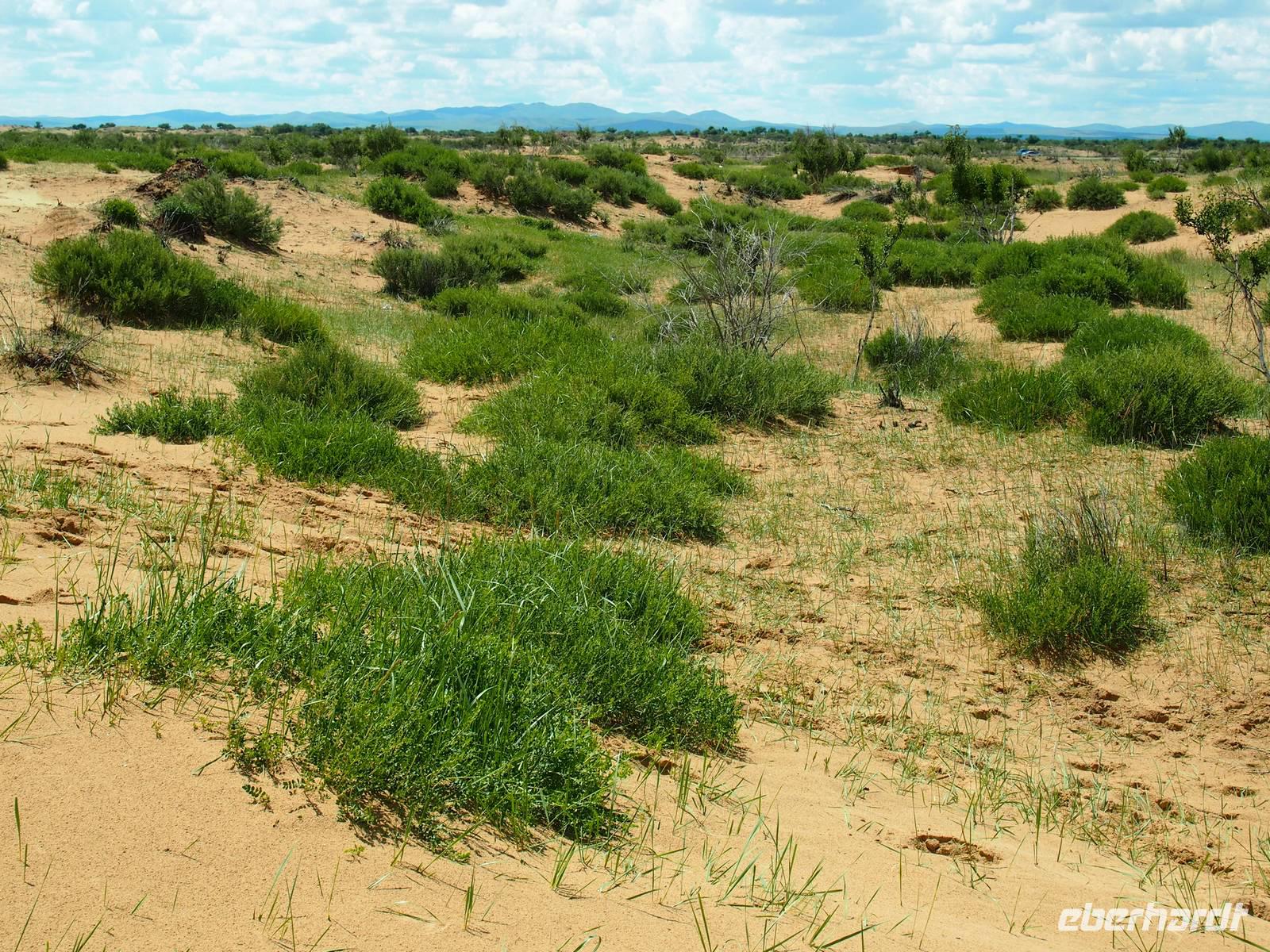 Nach dem Frühstück fuhren wir weiter Richtung Norden durch die Wüste Gobi. Nach relativ kurzer Fahrzeit hatte ein Auto eine Panne und so mussten wir eine kleine Zwangspause einlegen. Die Fahrer konnten das Problem schnell beheben, wir nutzten die Zeit, um die Pflanzenwelt zu begutachten und zu fotografieren. Zu unserem Glück waren zwei größere Kamelherden in unmittelbarer Nähe von uns und so machten wir uns auf den Weg die Tiere zu beobachten. Faszinierend und gespenstisch zugleich war das laute Röhren, welches die Kamele von sich gaben, da die Tiere, die wir bis dahin zu Gesicht bekommen hatten, völlig geräuschlos waren. Wir waren doch sehr erstaunt über den Klang, der mit einem Motorradgeräusch zu vergleichen ist.
