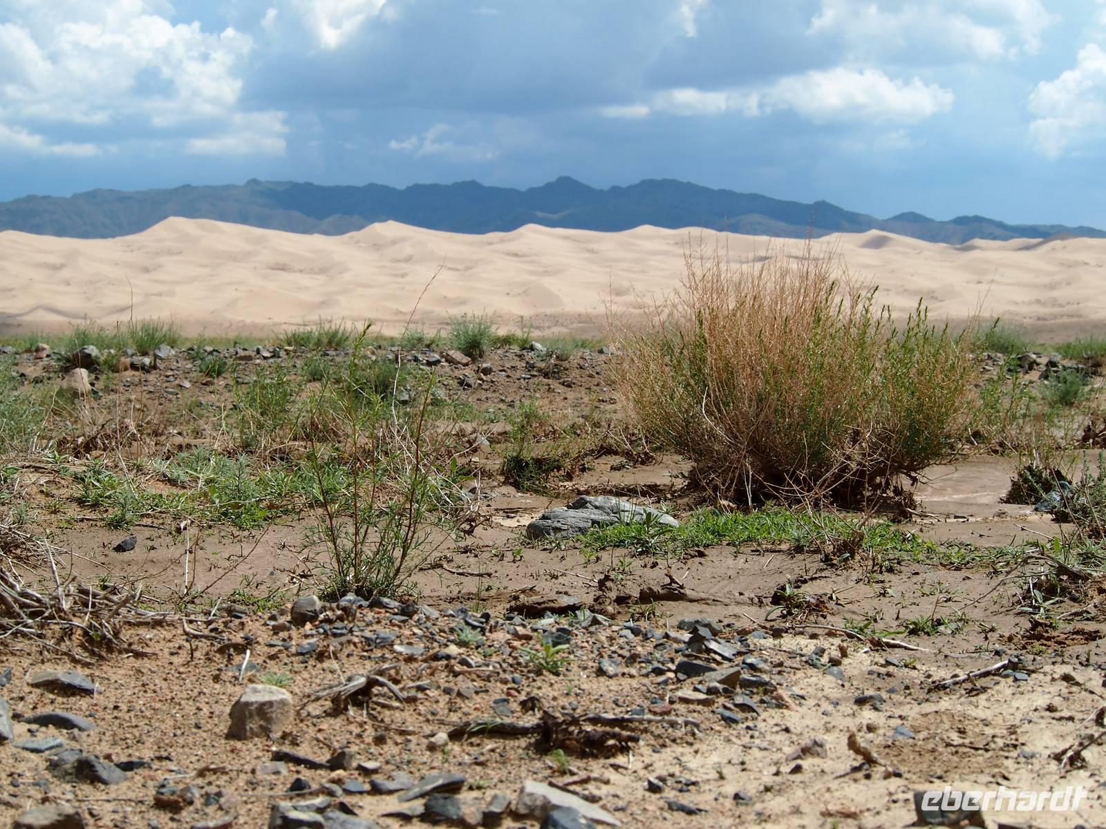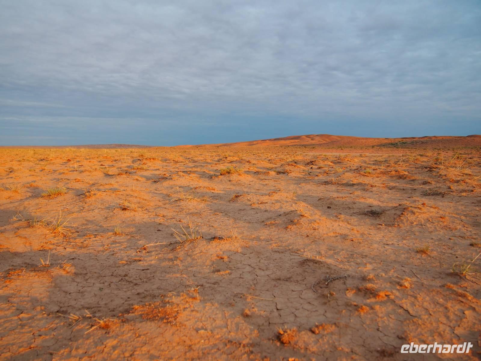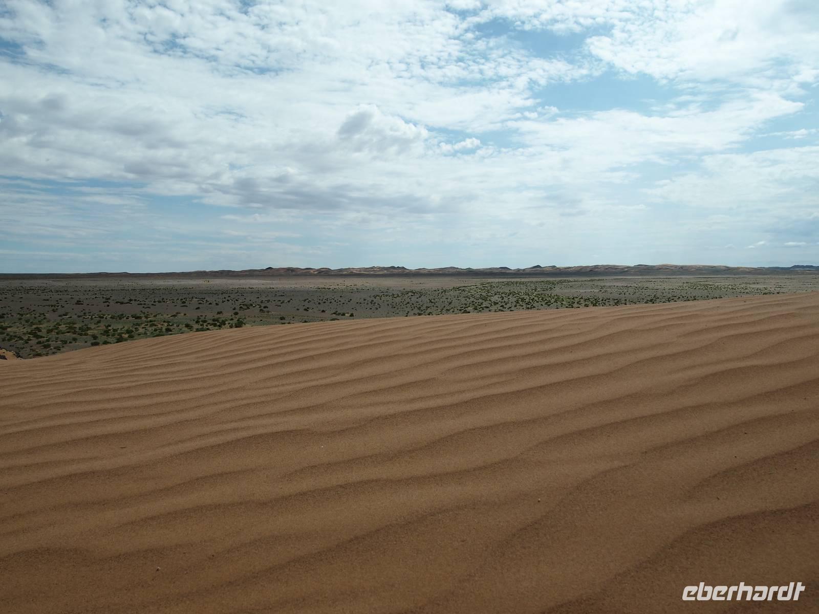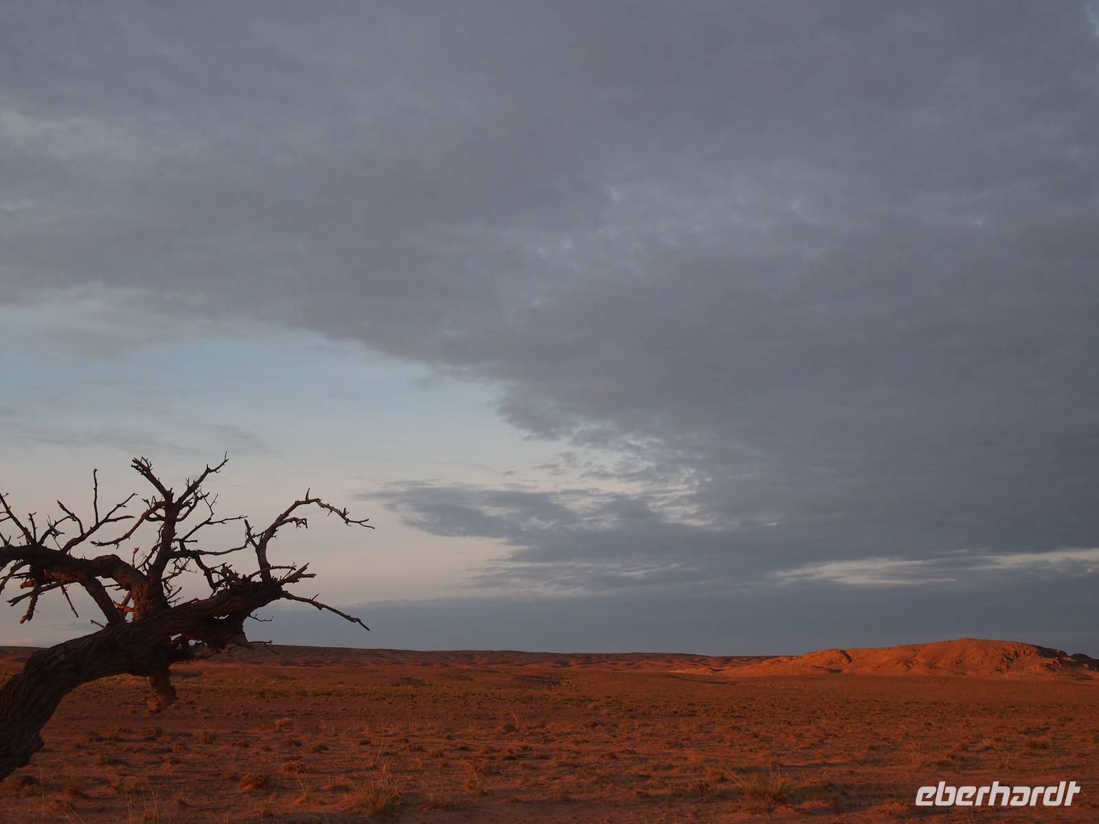 Kurz nach 4 Uhr trafen sich heute einige Gäste, um eine kleine Morgenwanderung auf einen nahegelegenen Berg zu unternehmen. Zusammen wollte man den Sonnenaufgang und das herrliche Farbspiel im Tal bestaunen. Die restlichen Reisenden schliefen noch ein paar Minuten länger und schauten sich von einem der vielen Hügel den Sonnenaufgang an. Alle Beteiligten wurden für das frühe Aufstehen belohnt. Nach dem Frühstück ging es anfangs durch die faszinierende Berglandschaft, die wir auf dem Weg zur "Chongor Sanddüne", unserem heutigen Tagesziel, durchquerten. Auch heute kamen die Fotografen in der Gruppe aufgrund zahlreicher Stopps nicht zu kurz. So sahen wir neben den einen oder anderen Kamelherden auch mehrere Geier. Beeindruckend war die kilometerlange Sanddüne, die uns seit dem späten Mittag begleitete. Wir haben einen kurzen Halt an unserem neuen Camp eingelegt und die Jurten bezogen. Über uns brauten sich ein paar dunkle Wolken zusammen, aber dies sollte uns nicht vom Kamelreiten bzw. von einem Besuch an den Dünen abhalten. Wir fuhren zu einer Nomadenfamilie, die uns auf einen Tee und Gebäck einluden. Anschließend ritten drei Gäste bei einer geführten Tour die Sanddüne entlang. Für diese Gäste war das ein tolles Erlebnis und ihre Premiere auf dem Kamel. Die anderen Gäste fuhren noch ein Stück weiter, um die Sanddünen zu besteigen. Selbst die Fahrer ließen es sich nicht nehmen, auch ein Stück die Dünen zu besteigen. Der Weg war wirklich beschwerlich und als die drei Kamelreiter ankamen, hatten es nur zwei Gäste bis nach oben geschafft. Ein Kamelreiter legte einen Sprint ein und war somit sehr schnell oben. Auch er wollte sich den Ausblick nicht entgehen lassen. Runter ging es dann sehr schnell, einige schlitterten auf den Schuhen runter, andere rannten und sprangen und wieder andere wählten den vorsichtigeren Abstieg. Nachdem wir uns alle im Camp frisch gemacht haben, ging es zum Abendbrot. Anschließend beobachteten einige Gäste noch den fast sternenklaren Himmel, bevor es zu Bett ging.