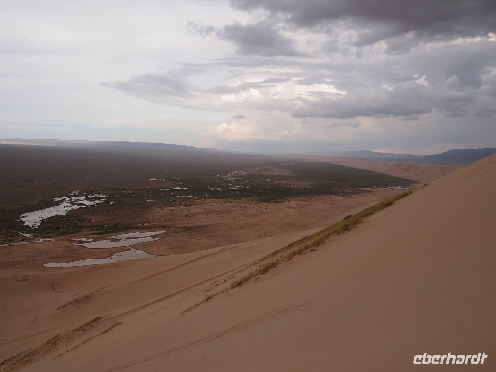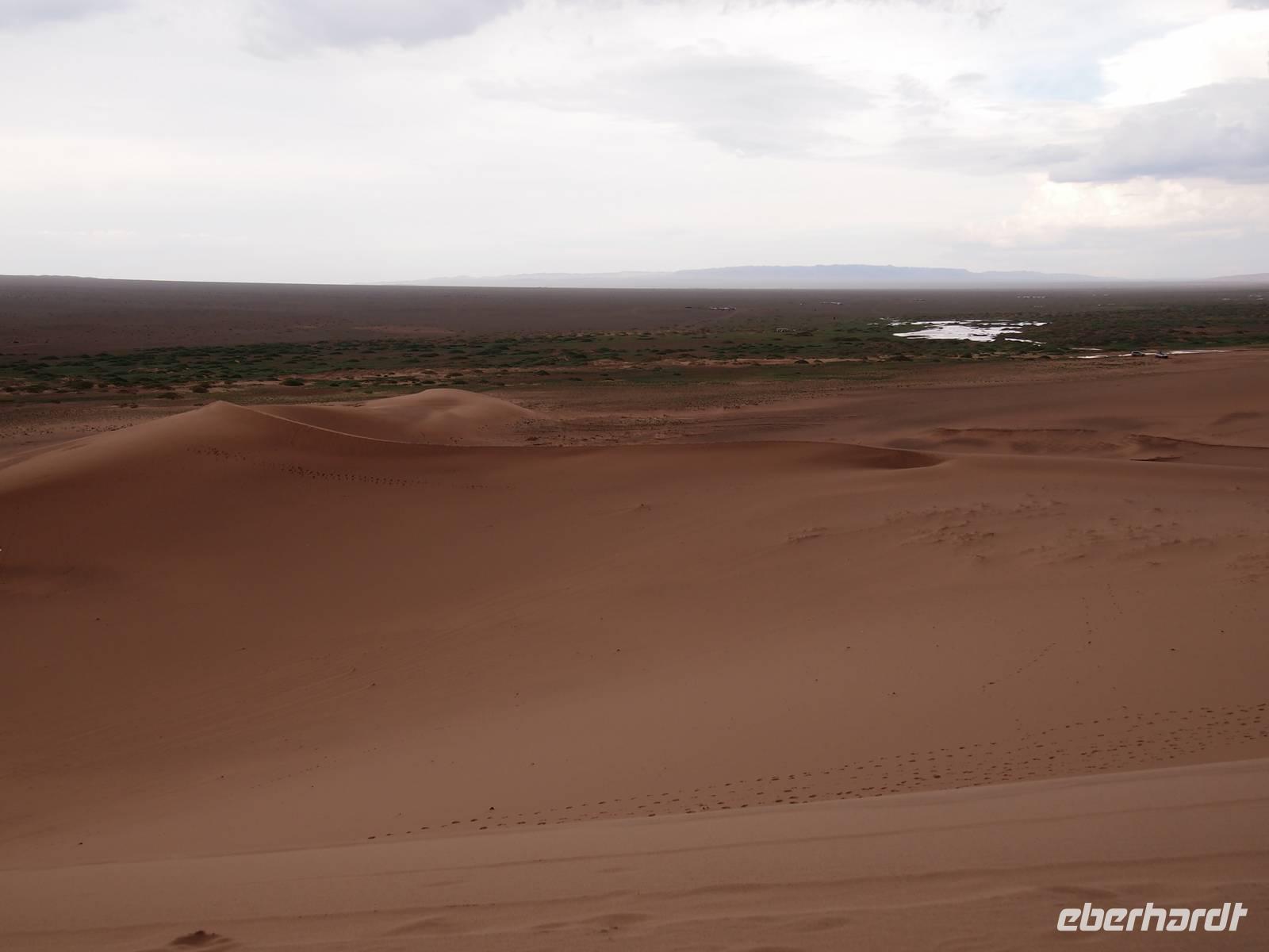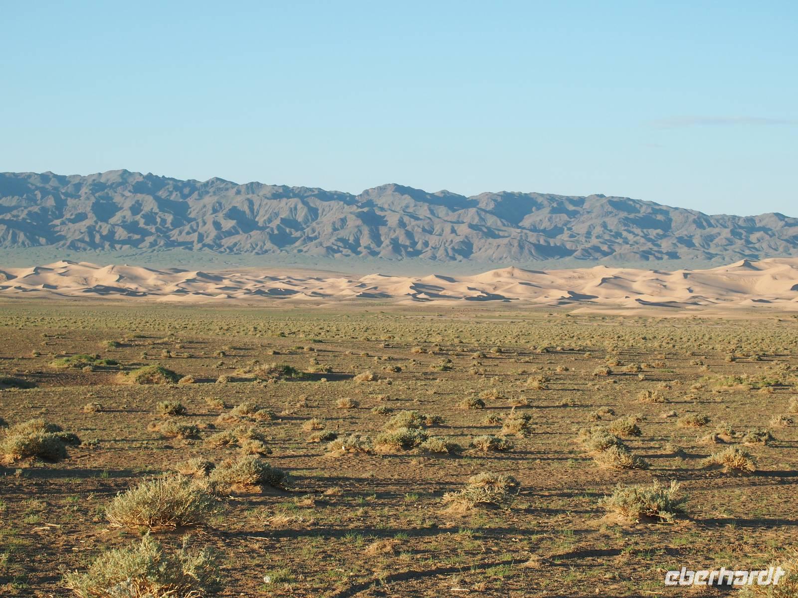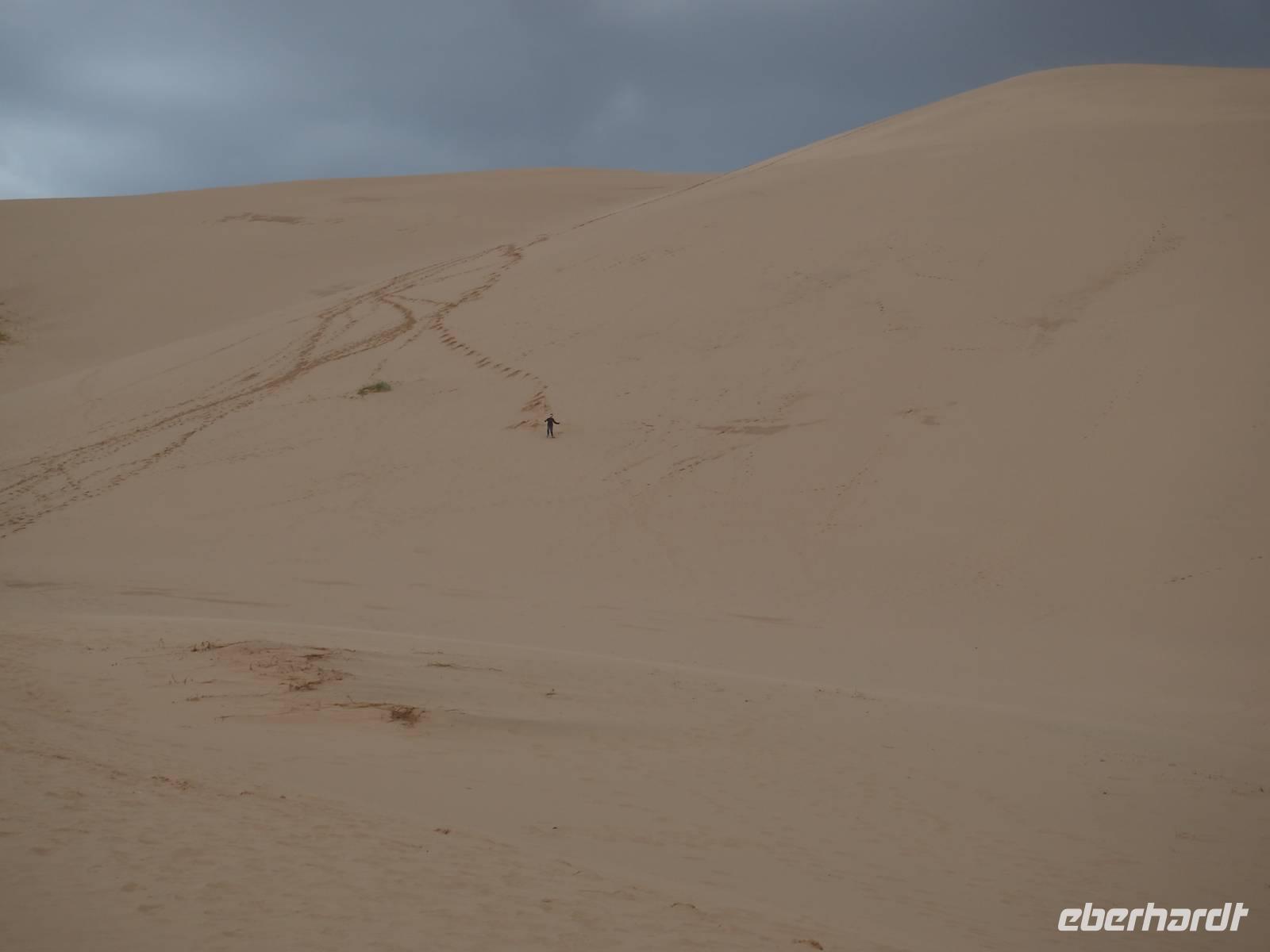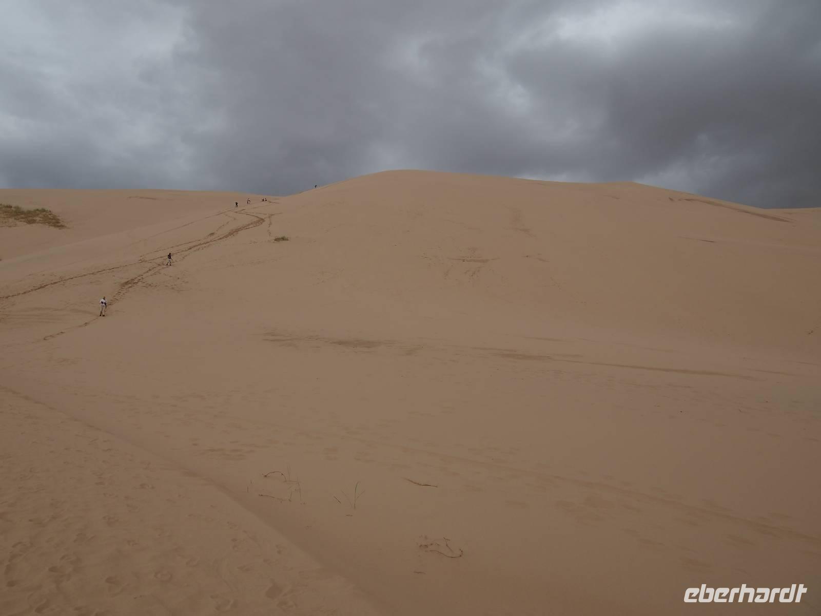 Kurz nach 4 Uhr trafen sich heute einige Gäste, um eine kleine Morgenwanderung auf einen nahegelegenen Berg zu unternehmen. Zusammen wollte man den Sonnenaufgang und das herrliche Farbspiel im Tal bestaunen. Die restlichen Reisenden schliefen noch ein paar Minuten länger und schauten sich von einem der vielen Hügel den Sonnenaufgang an. Alle Beteiligten wurden für das frühe Aufstehen belohnt. Nach dem Frühstück ging es anfangs durch die faszinierende Berglandschaft, die wir auf dem Weg zur "Chongor Sanddüne", unserem heutigen Tagesziel, durchquerten. Auch heute kamen die Fotografen in der Gruppe aufgrund zahlreicher Stopps nicht zu kurz. So sahen wir neben den einen oder anderen Kamelherden auch mehrere Geier. Beeindruckend war die kilometerlange Sanddüne, die uns seit dem späten Mittag begleitete. Wir haben einen kurzen Halt an unserem neuen Camp eingelegt und die Jurten bezogen. Über uns brauten sich ein paar dunkle Wolken zusammen, aber dies sollte uns nicht vom Kamelreiten bzw. von einem Besuch an den Dünen abhalten. Wir fuhren zu einer Nomadenfamilie, die uns auf einen Tee und Gebäck einluden. Anschließend ritten drei Gäste bei einer geführten Tour die Sanddüne entlang. Für diese Gäste war das ein tolles Erlebnis und ihre Premiere auf dem Kamel. Die anderen Gäste fuhren noch ein Stück weiter, um die Sanddünen zu besteigen. Selbst die Fahrer ließen es sich nicht nehmen, auch ein Stück die Dünen zu besteigen. Der Weg war wirklich beschwerlich und als die drei Kamelreiter ankamen, hatten es nur zwei Gäste bis nach oben geschafft. Ein Kamelreiter legte einen Sprint ein und war somit sehr schnell oben. Auch er wollte sich den Ausblick nicht entgehen lassen. Runter ging es dann sehr schnell, einige schlitterten auf den Schuhen runter, andere rannten und sprangen und wieder andere wählten den vorsichtigeren Abstieg. Nachdem wir uns alle im Camp frisch gemacht haben, ging es zum Abendbrot. Anschließend beobachteten einige Gäste noch den fast sternenklaren Himmel, bevor es zu Bett ging.