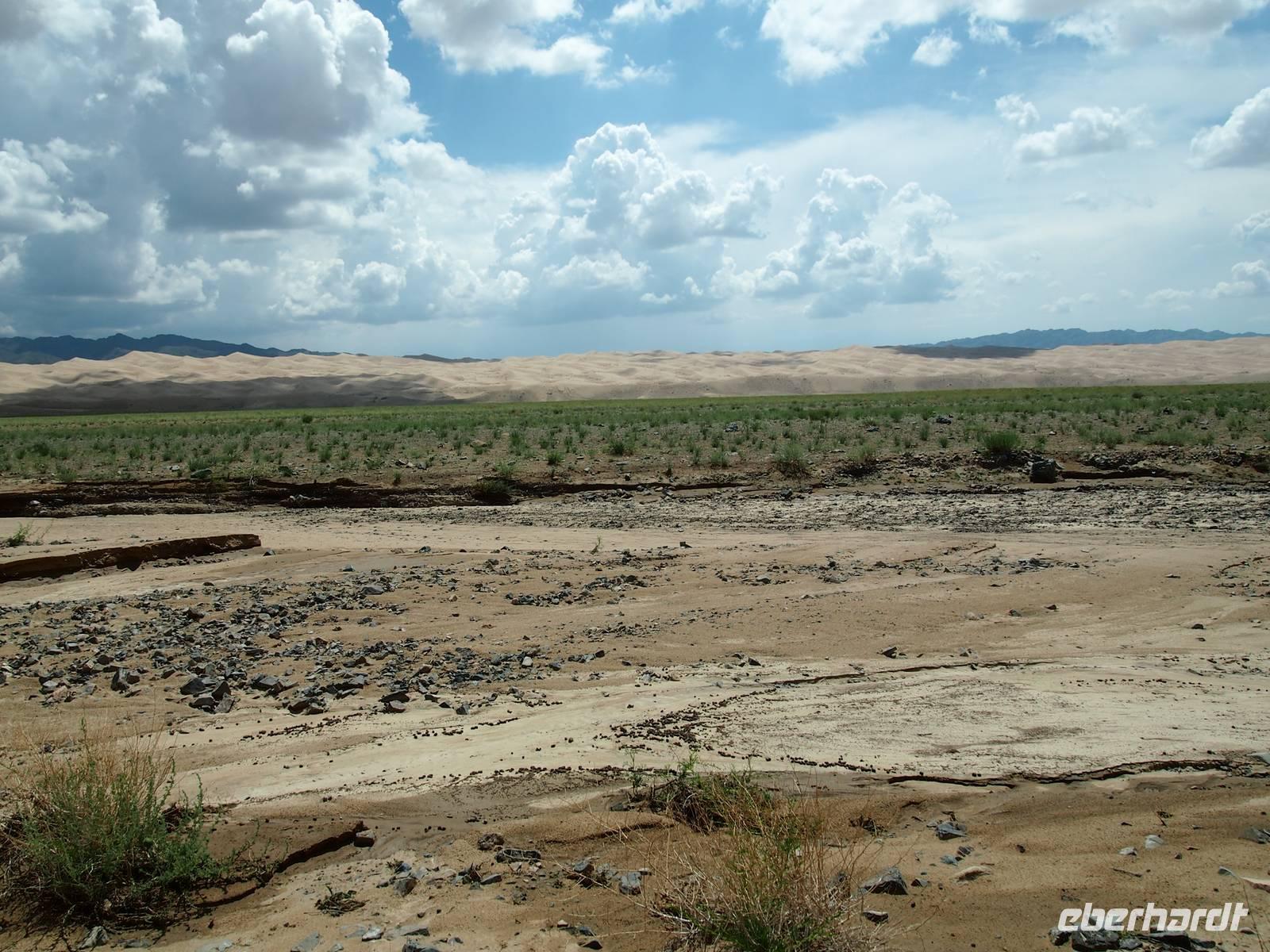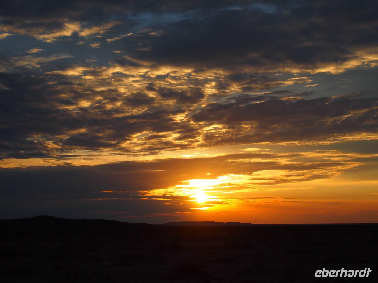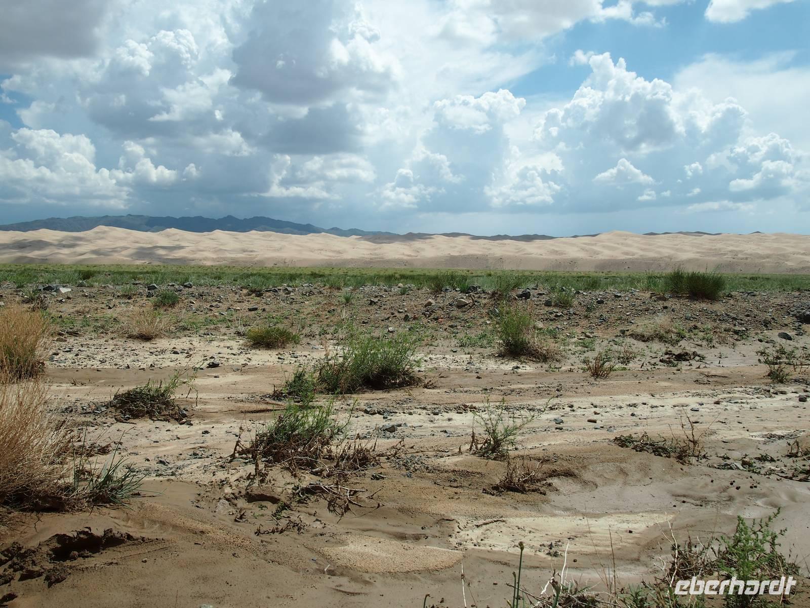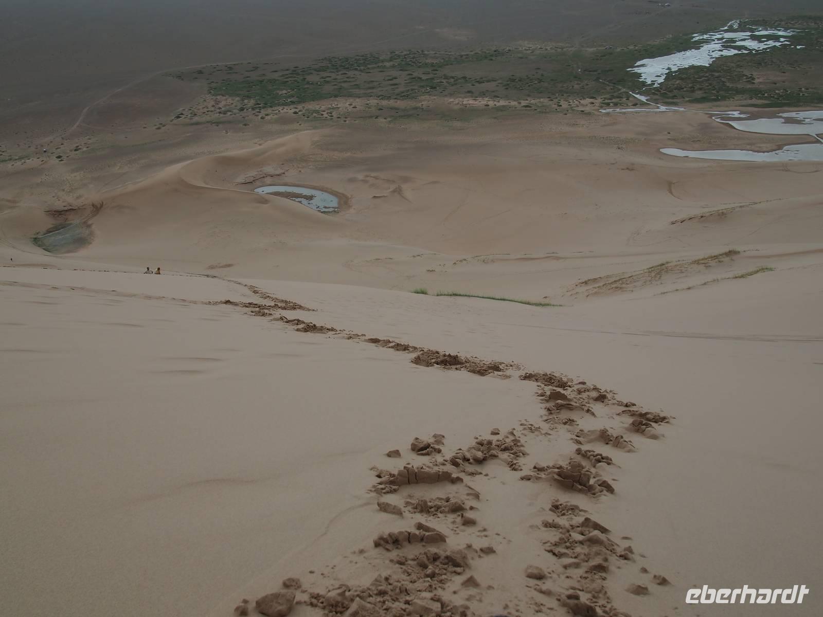 Kurz nach 4 Uhr trafen sich heute einige Gäste, um eine kleine Morgenwanderung auf einen nahegelegenen Berg zu unternehmen. Zusammen wollte man den Sonnenaufgang und das herrliche Farbspiel im Tal bestaunen. Die restlichen Reisenden schliefen noch ein paar Minuten länger und schauten sich von einem der vielen Hügel den Sonnenaufgang an. Alle Beteiligten wurden für das frühe Aufstehen belohnt. Nach dem Frühstück ging es anfangs durch die faszinierende Berglandschaft, die wir auf dem Weg zur "Chongor Sanddüne", unserem heutigen Tagesziel, durchquerten. Auch heute kamen die Fotografen in der Gruppe aufgrund zahlreicher Stopps nicht zu kurz. So sahen wir neben den einen oder anderen Kamelherden auch mehrere Geier. Beeindruckend war die kilometerlange Sanddüne, die uns seit dem späten Mittag begleitete. Wir haben einen kurzen Halt an unserem neuen Camp eingelegt und die Jurten bezogen. Über uns brauten sich ein paar dunkle Wolken zusammen, aber dies sollte uns nicht vom Kamelreiten bzw. von einem Besuch an den Dünen abhalten. Wir fuhren zu einer Nomadenfamilie, die uns auf einen Tee und Gebäck einluden. Anschließend ritten drei Gäste bei einer geführten Tour die Sanddüne entlang. Für diese Gäste war das ein tolles Erlebnis und ihre Premiere auf dem Kamel. Die anderen Gäste fuhren noch ein Stück weiter, um die Sanddünen zu besteigen. Selbst die Fahrer ließen es sich nicht nehmen, auch ein Stück die Dünen zu besteigen. Der Weg war wirklich beschwerlich und als die drei Kamelreiter ankamen, hatten es nur zwei Gäste bis nach oben geschafft. Ein Kamelreiter legte einen Sprint ein und war somit sehr schnell oben. Auch er wollte sich den Ausblick nicht entgehen lassen. Runter ging es dann sehr schnell, einige schlitterten auf den Schuhen runter, andere rannten und sprangen und wieder andere wählten den vorsichtigeren Abstieg. Nachdem wir uns alle im Camp frisch gemacht haben, ging es zum Abendbrot. Anschließend beobachteten einige Gäste noch den fast sternenklaren Himmel, bevor es zu Bett ging.