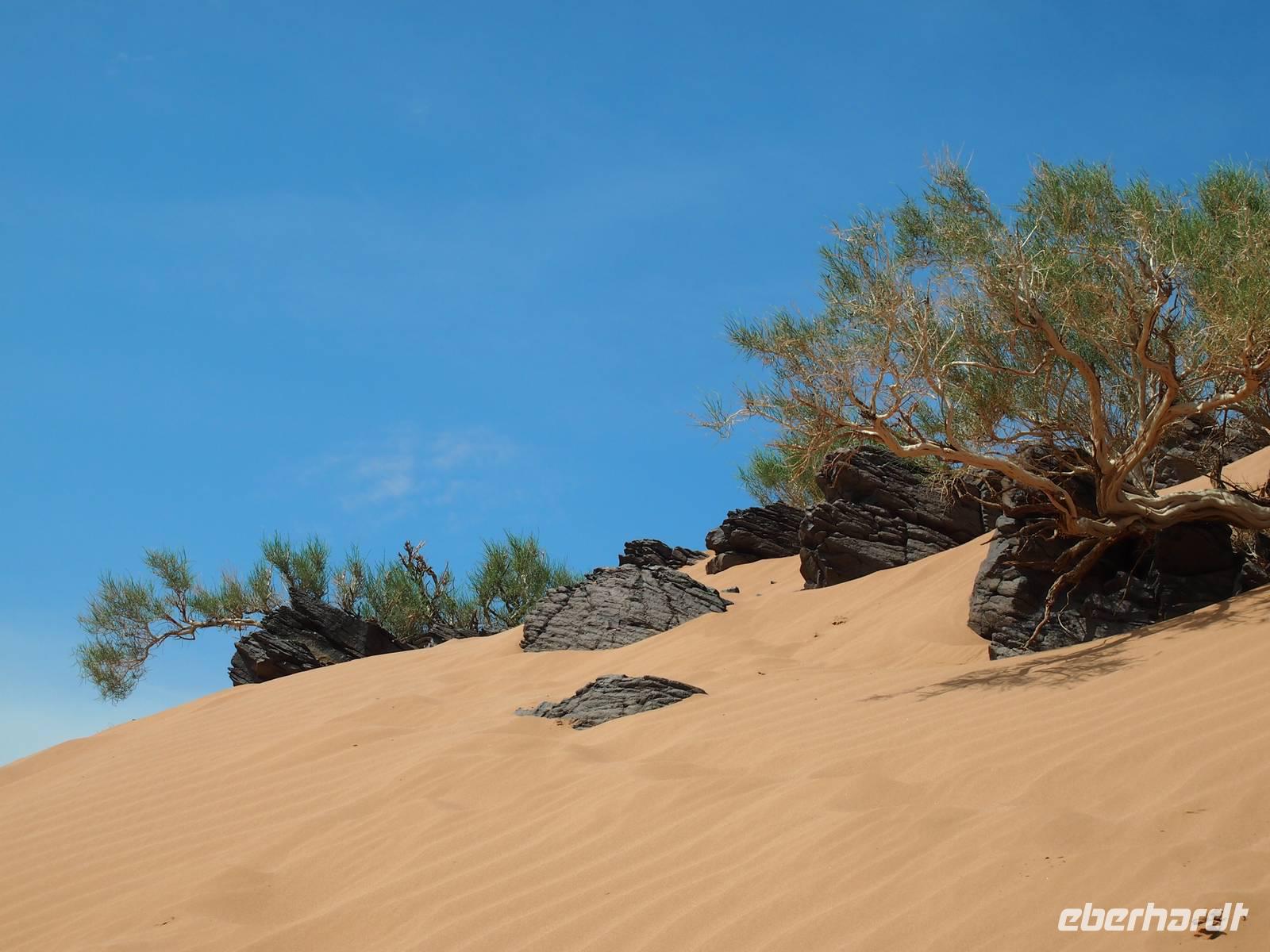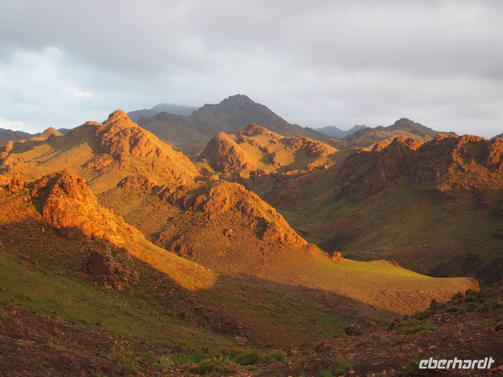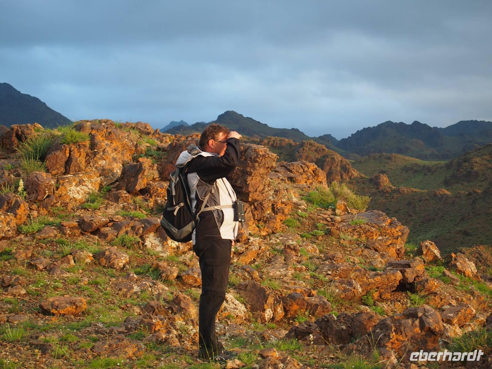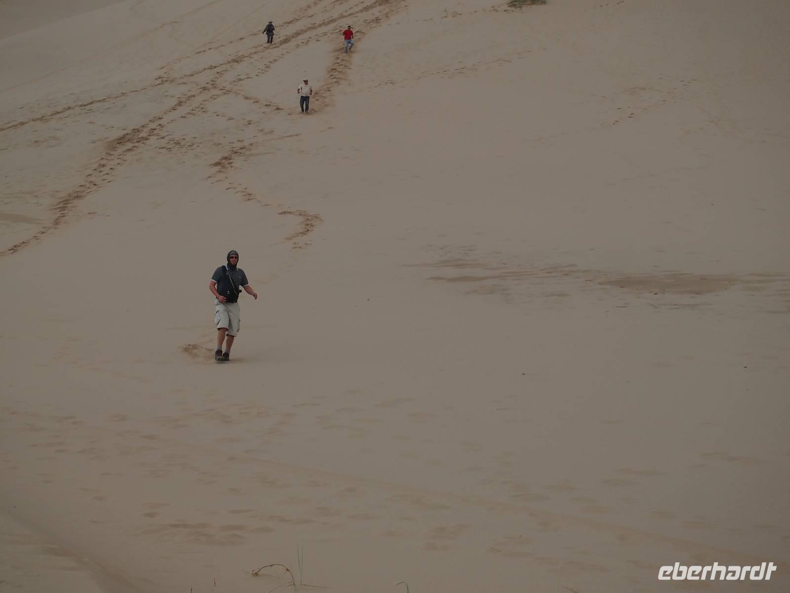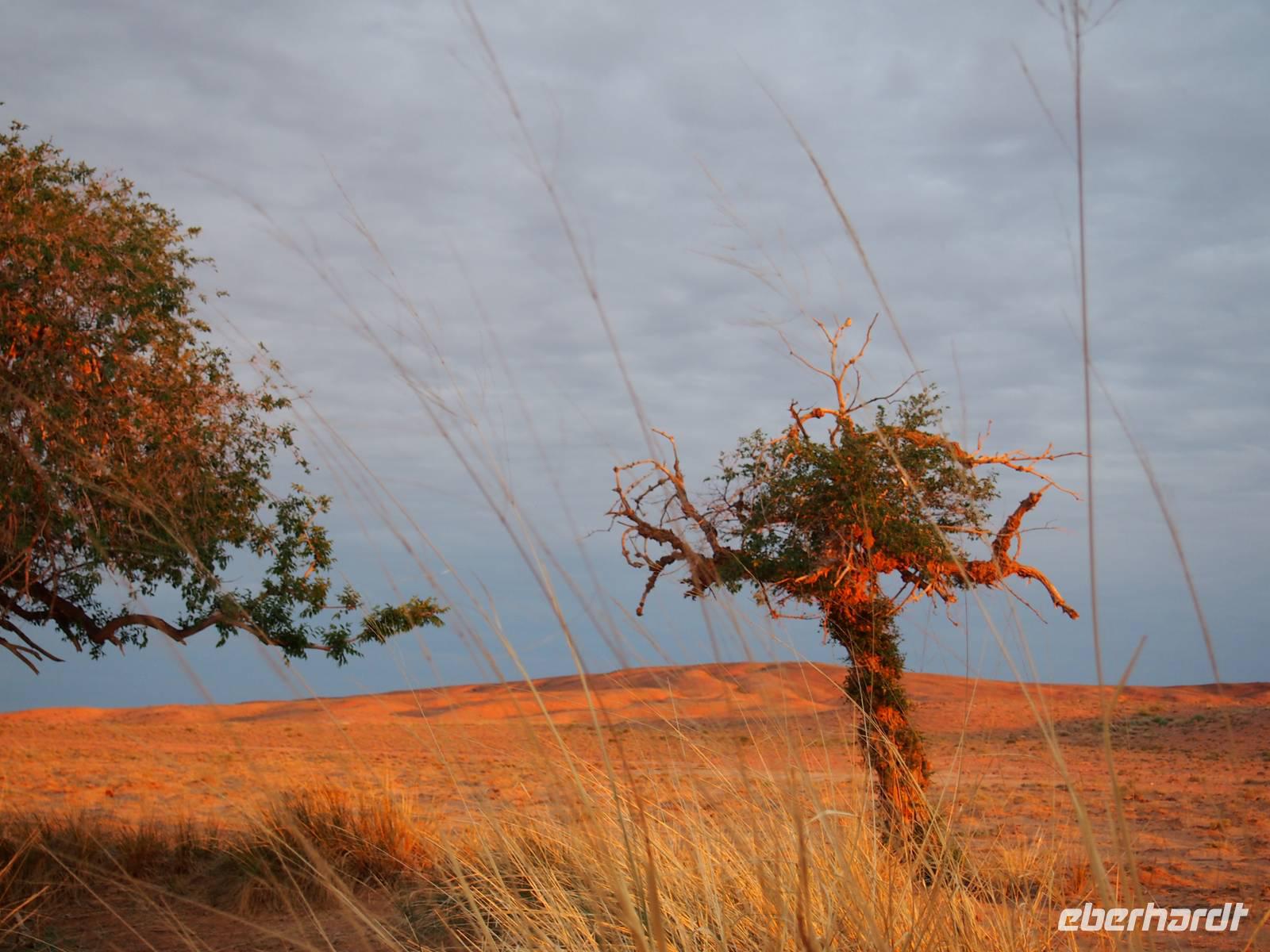 Kurz nach 4 Uhr trafen sich heute einige Gäste, um eine kleine Morgenwanderung auf einen nahegelegenen Berg zu unternehmen. Zusammen wollte man den Sonnenaufgang und das herrliche Farbspiel im Tal bestaunen. Die restlichen Reisenden schliefen noch ein paar Minuten länger und schauten sich von einem der vielen Hügel den Sonnenaufgang an. Alle Beteiligten wurden für das frühe Aufstehen belohnt. Nach dem Frühstück ging es anfangs durch die faszinierende Berglandschaft, die wir auf dem Weg zur "Chongor Sanddüne", unserem heutigen Tagesziel, durchquerten. Auch heute kamen die Fotografen in der Gruppe aufgrund zahlreicher Stopps nicht zu kurz. So sahen wir neben den einen oder anderen Kamelherden auch mehrere Geier. Beeindruckend war die kilometerlange Sanddüne, die uns seit dem späten Mittag begleitete. Wir haben einen kurzen Halt an unserem neuen Camp eingelegt und die Jurten bezogen. Über uns brauten sich ein paar dunkle Wolken zusammen, aber dies sollte uns nicht vom Kamelreiten bzw. von einem Besuch an den Dünen abhalten. Wir fuhren zu einer Nomadenfamilie, die uns auf einen Tee und Gebäck einluden. Anschließend ritten drei Gäste bei einer geführten Tour die Sanddüne entlang. Für diese Gäste war das ein tolles Erlebnis und ihre Premiere auf dem Kamel. Die anderen Gäste fuhren noch ein Stück weiter, um die Sanddünen zu besteigen. Selbst die Fahrer ließen es sich nicht nehmen, auch ein Stück die Dünen zu besteigen. Der Weg war wirklich beschwerlich und als die drei Kamelreiter ankamen, hatten es nur zwei Gäste bis nach oben geschafft. Ein Kamelreiter legte einen Sprint ein und war somit sehr schnell oben. Auch er wollte sich den Ausblick nicht entgehen lassen. Runter ging es dann sehr schnell, einige schlitterten auf den Schuhen runter, andere rannten und sprangen und wieder andere wählten den vorsichtigeren Abstieg. Nachdem wir uns alle im Camp frisch gemacht haben, ging es zum Abendbrot. Anschließend beobachteten einige Gäste noch den fast sternenklaren Himmel, bevor es zu Bett ging.