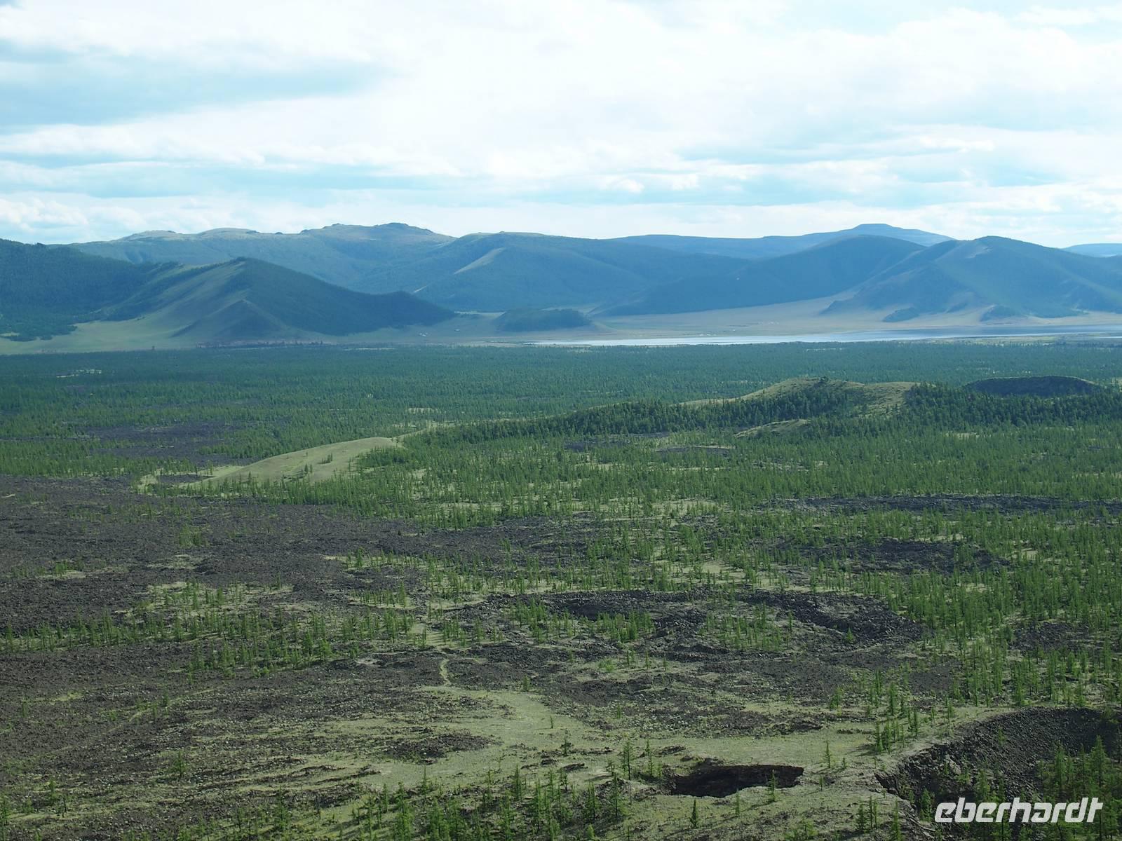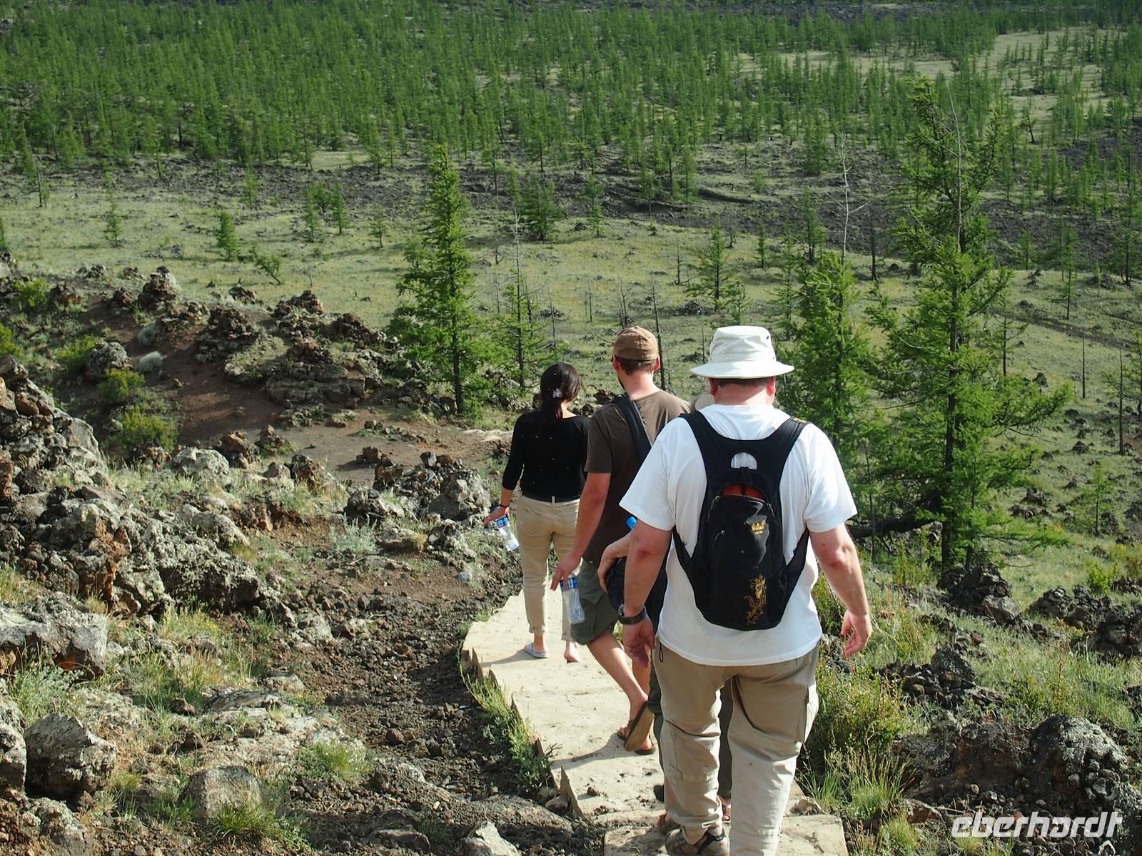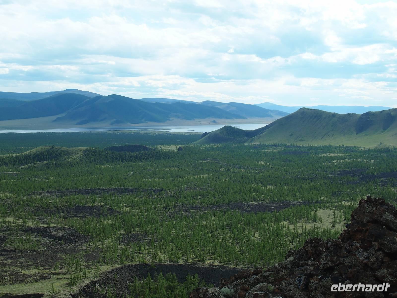 Unsere Mittagspause legten wir zwischen einem dünnbesiedelten Nadelbaumwald in der Nähe einer Schlucht ein. Am Nachmittag erreichten wir unser eigentliches Tages Highlight, den inaktiven Vulkan Chorgo. Wir bestiegen den Vulkan und einige wanderten um ihn oder gingen sogar zum Krater, in das Innere runter. Die Aussicht vom Vulkan aus war der Wahnsinn. Wir konnten sogar unser neues Camp am See von oben aus erkennen. Dort angekommen freuten wir uns über die sehr idyllische Lage direkt am See. Nach dem Essen besuchten viele von uns noch ein Kehlkopfgesang Konzert im Camp und ließen sich ihre Jurte beheizen.