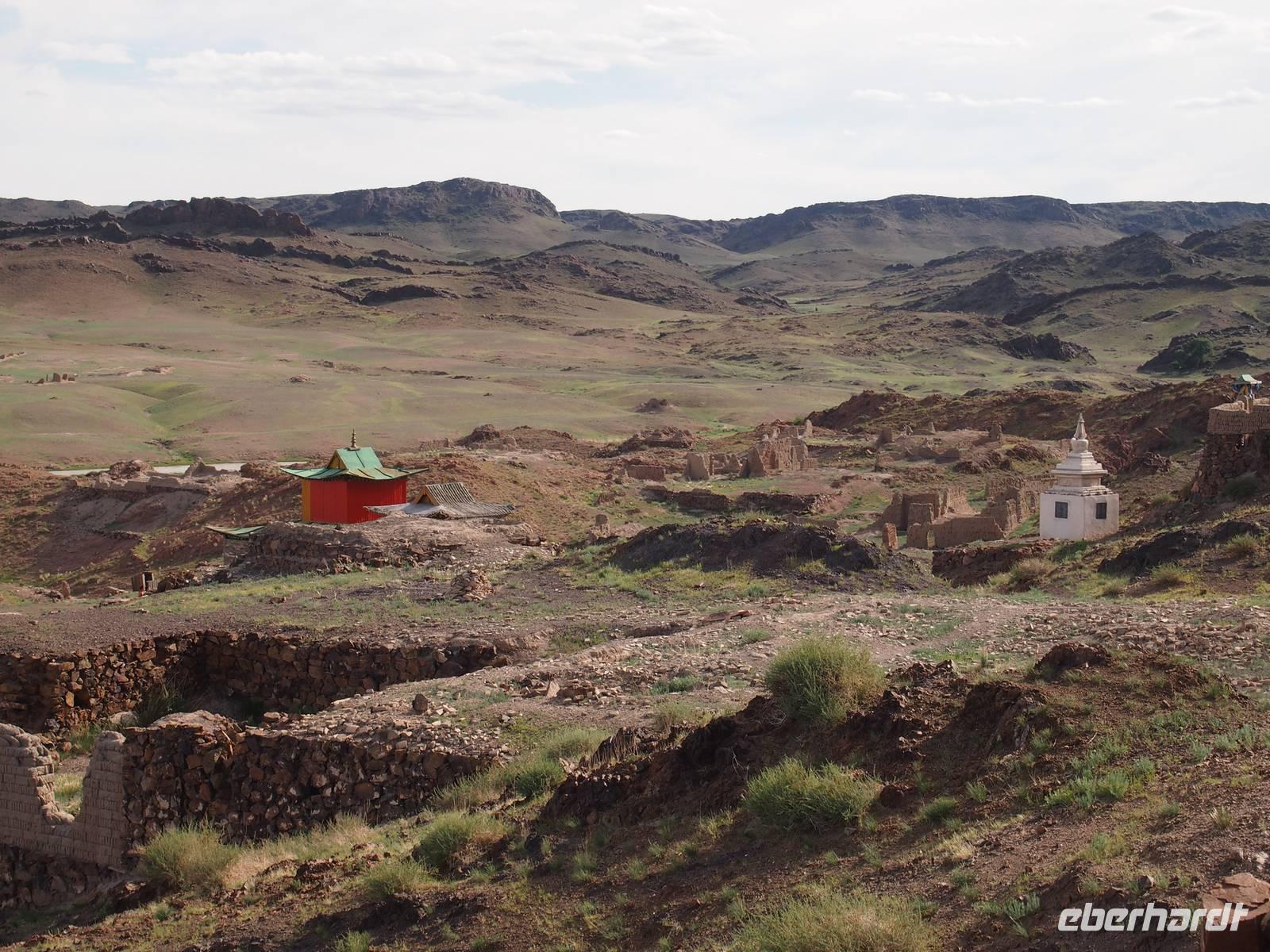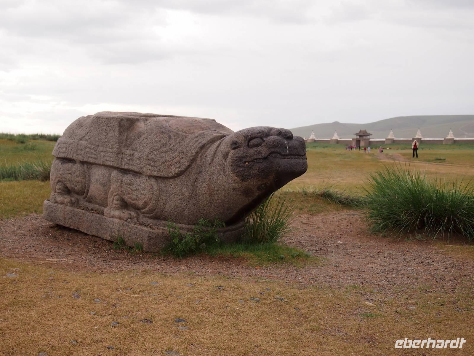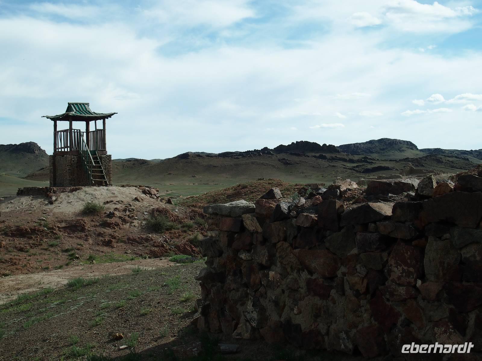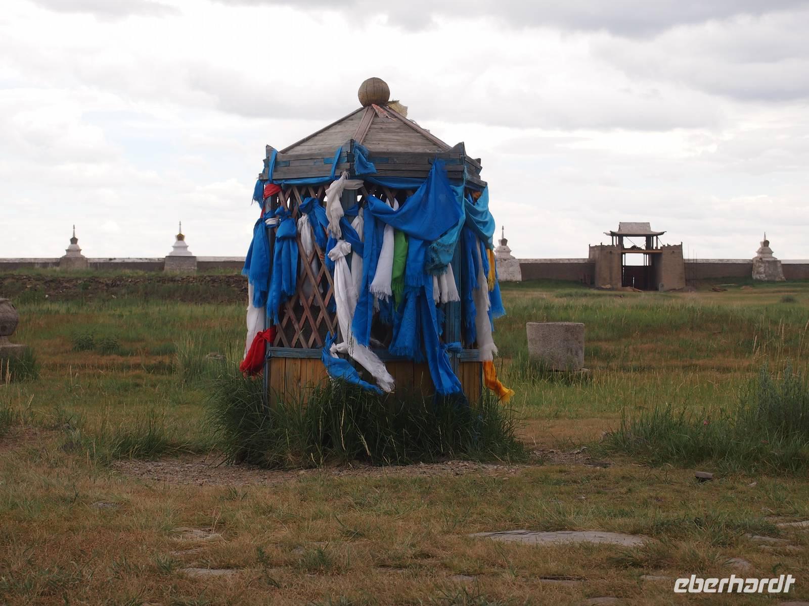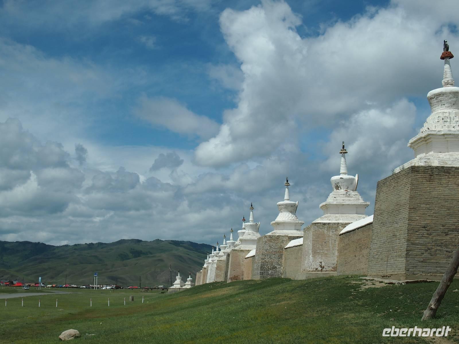 Um den Tag in Karakorum voll und ganz zu nutzen, sind wir zeitiger als sonst gestartet. Auf dem Weg nach Karakorum konnten wir unterwegs wieder ein Pferderennen beobachten, leider war der Start schwer auszumachen und so verpassten wir ihn um einige Meter. Dafür waren wir trotzdem ganz nah an dem Rennen und konnten die Teilnehmer aus nächster Nähe beobachten. Ein weiteres Highlight auf der Fahrt nach Karakorum waren circa acht Adler und mehrere Geier, die sich gerade über einen Kadaver hermachten. Die Tiere gaben uns kurzzeitig die Gelegenheit, sie ungestört dabei zu beobachten. Was für ein Erlebnis! Nach etwa vier Stunden erreichten wir die einstige Hauptstadt unter der Führung von Dschingis Khan der Mongolei. Beeindruckend dabei sind vor allem die ehemaligen Stadtmauern. Zuerst besuchten wir das Museum, welches einige Fundstücke und auch eine Miniaturansicht der ehemaligen Hauptstadt ausstellt. Wenn man die Fundstücke sieht, ist es sehr traurig anzusehen, wie viel von diesen wertvollen Schätzen zerstört wurde. Interessant war auch zu sehen, wie weit die Mongolei einst ging. Für uns ist es kaum vorstellbar, dass die unterschiedlichen Khans in alle Himmelsrichtungen soweit vorgedrungen sind. Anschließend besuchten wir das ehemalige Gelände bzw. das, was davon noch übrig geblieben ist. Am faszinierendsten waren dabei das Kloster mit seinen drei Tempeln und die alten Zeichnungen und Stoffe.