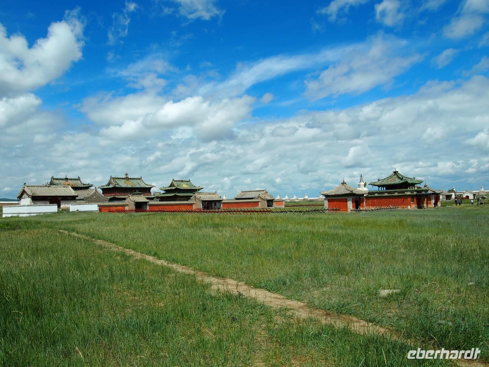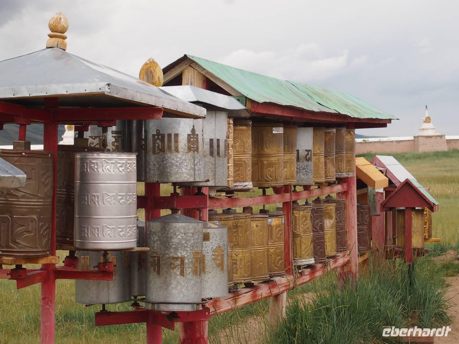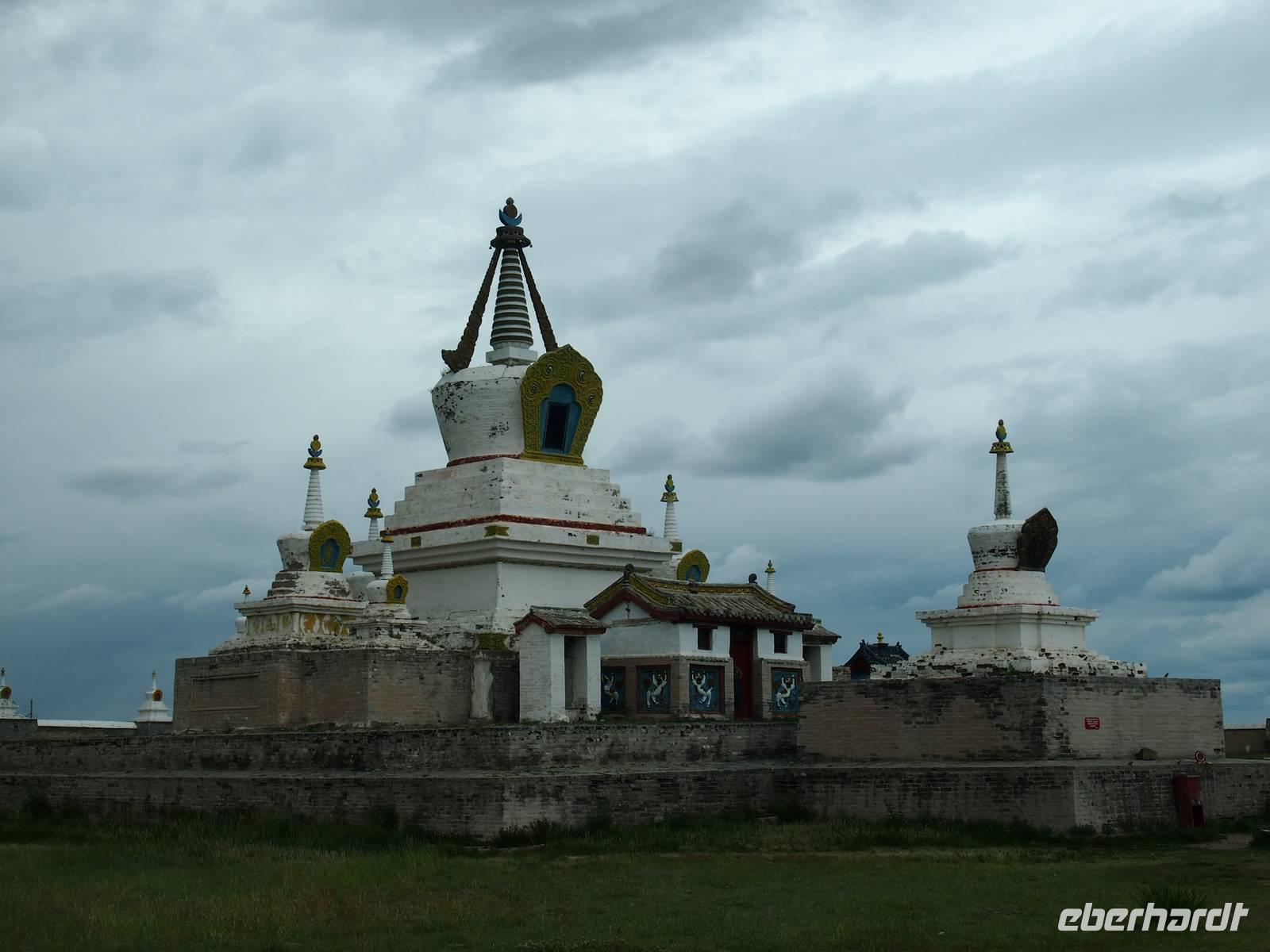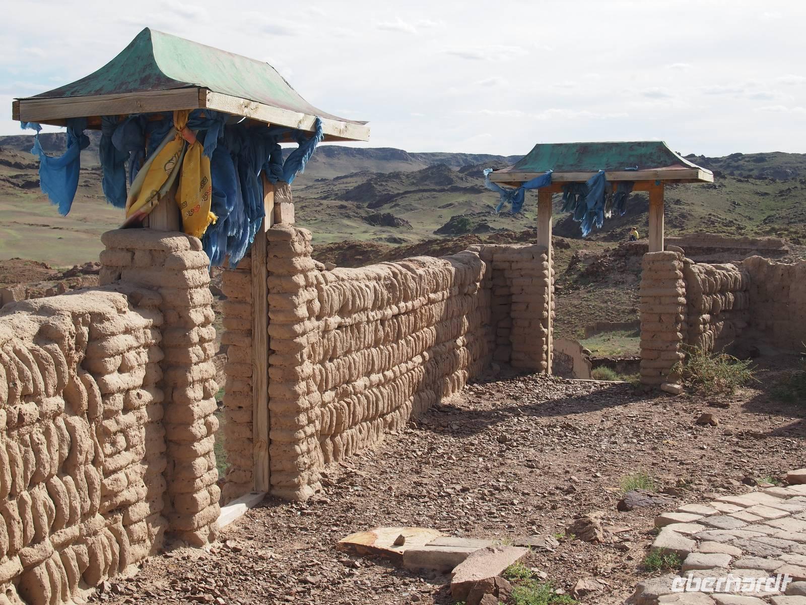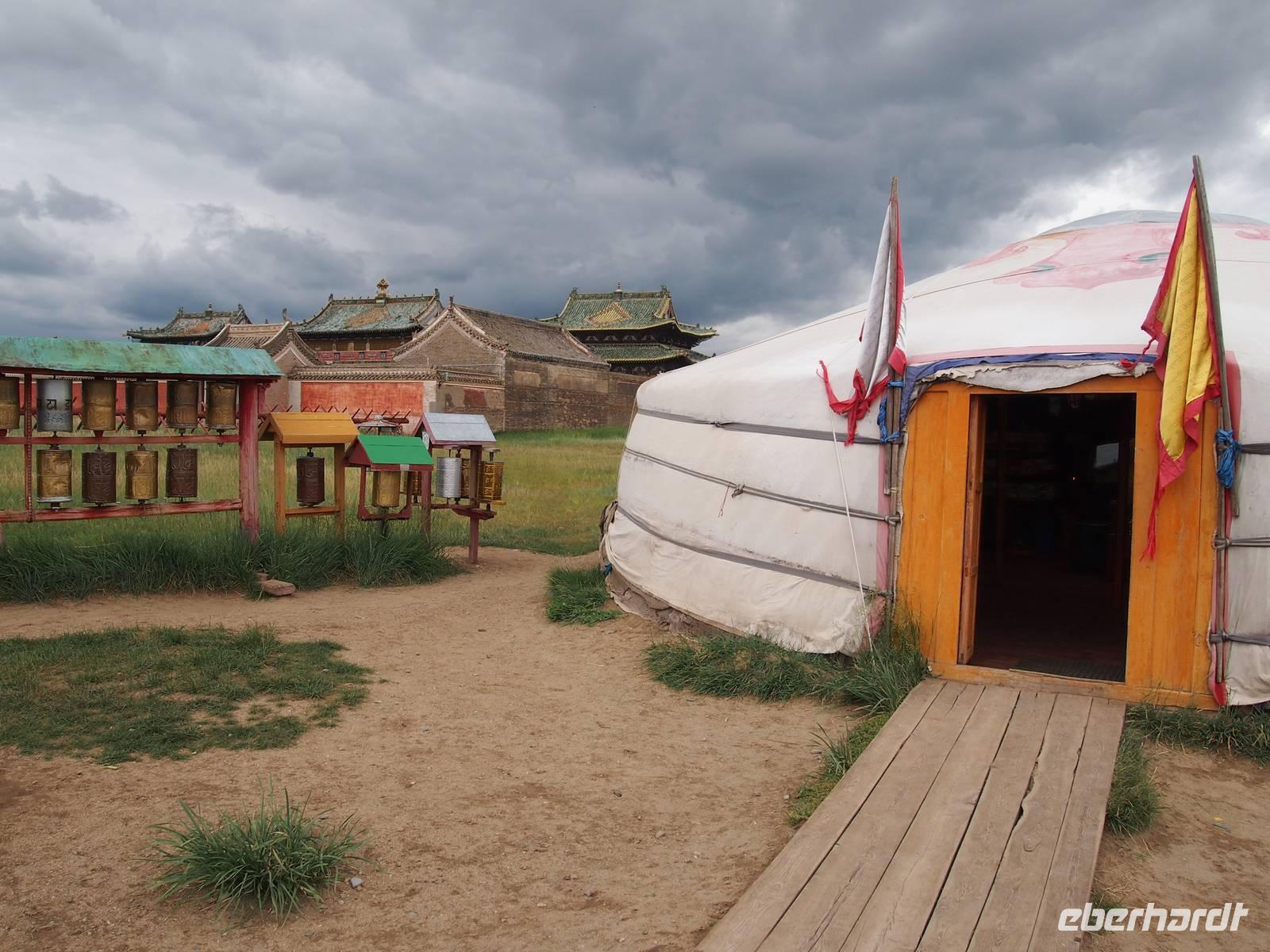 Um den Tag in Karakorum voll und ganz zu nutzen, sind wir zeitiger als sonst gestartet. Auf dem Weg nach Karakorum konnten wir unterwegs wieder ein Pferderennen beobachten, leider war der Start schwer auszumachen und so verpassten wir ihn um einige Meter. Dafür waren wir trotzdem ganz nah an dem Rennen und konnten die Teilnehmer aus nächster Nähe beobachten. Ein weiteres Highlight auf der Fahrt nach Karakorum waren circa acht Adler und mehrere Geier, die sich gerade über einen Kadaver hermachten. Die Tiere gaben uns kurzzeitig die Gelegenheit, sie ungestört dabei zu beobachten. Was für ein Erlebnis! Nach etwa vier Stunden erreichten wir die einstige Hauptstadt unter der Führung von Dschingis Khan der Mongolei. Beeindruckend dabei sind vor allem die ehemaligen Stadtmauern. Zuerst besuchten wir das Museum, welches einige Fundstücke und auch eine Miniaturansicht der ehemaligen Hauptstadt ausstellt. Wenn man die Fundstücke sieht, ist es sehr traurig anzusehen, wie viel von diesen wertvollen Schätzen zerstört wurde. Interessant war auch zu sehen, wie weit die Mongolei einst ging. Für uns ist es kaum vorstellbar, dass die unterschiedlichen Khans in alle Himmelsrichtungen soweit vorgedrungen sind. Anschließend besuchten wir das ehemalige Gelände bzw. das, was davon noch übrig geblieben ist. Am faszinierendsten waren dabei das Kloster mit seinen drei Tempeln und die alten Zeichnungen und Stoffe.