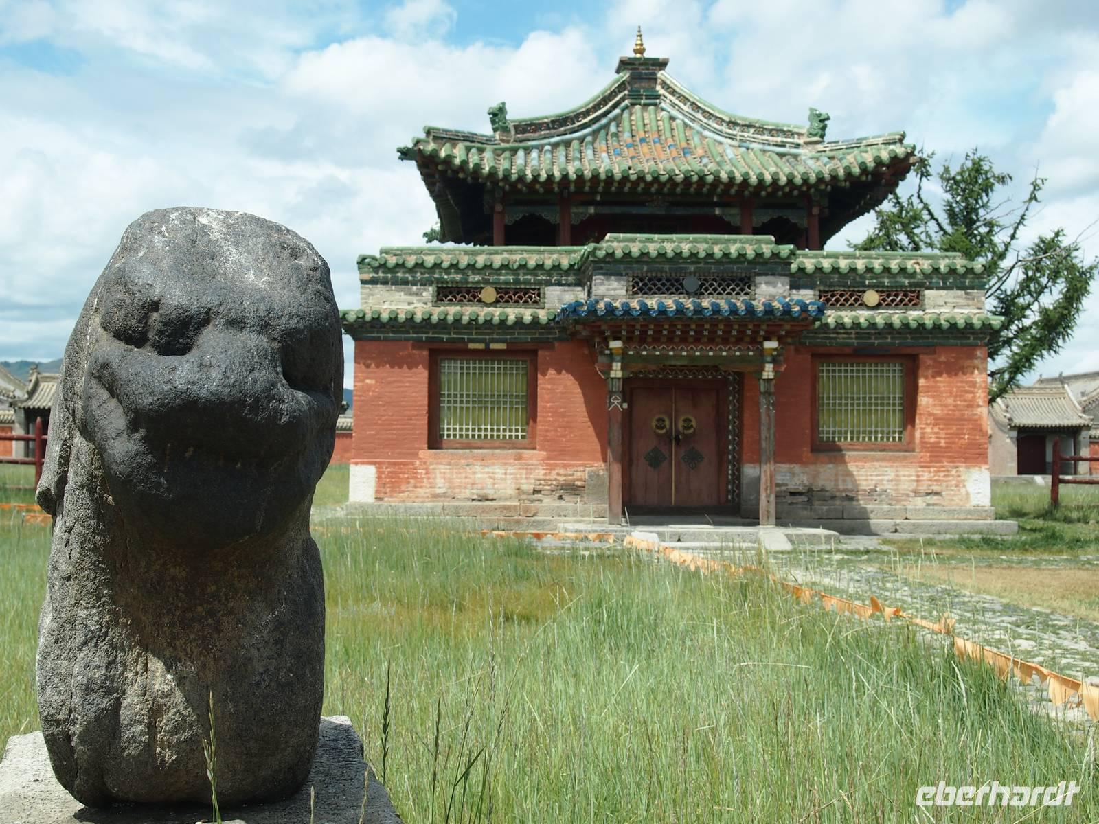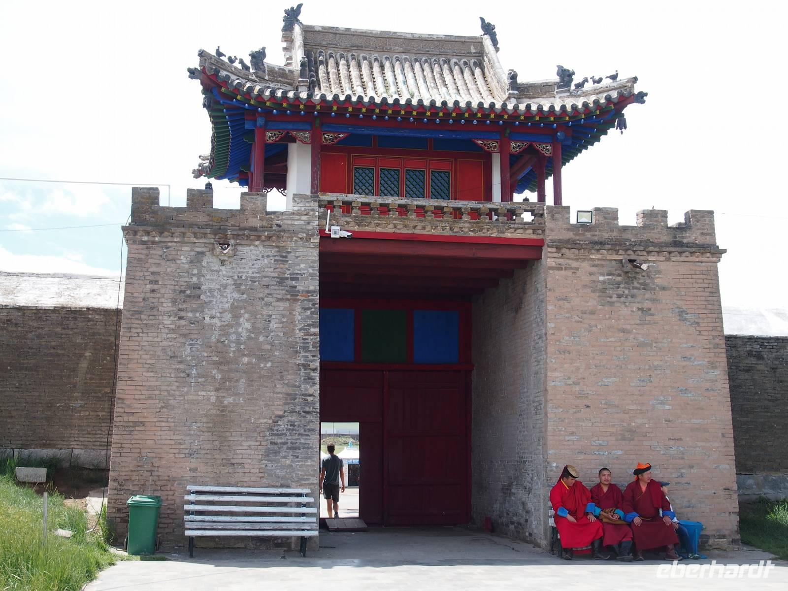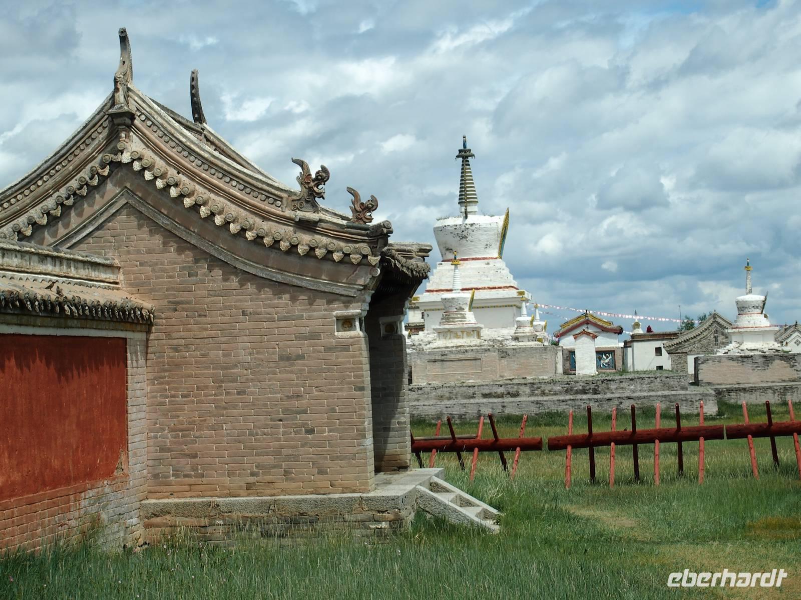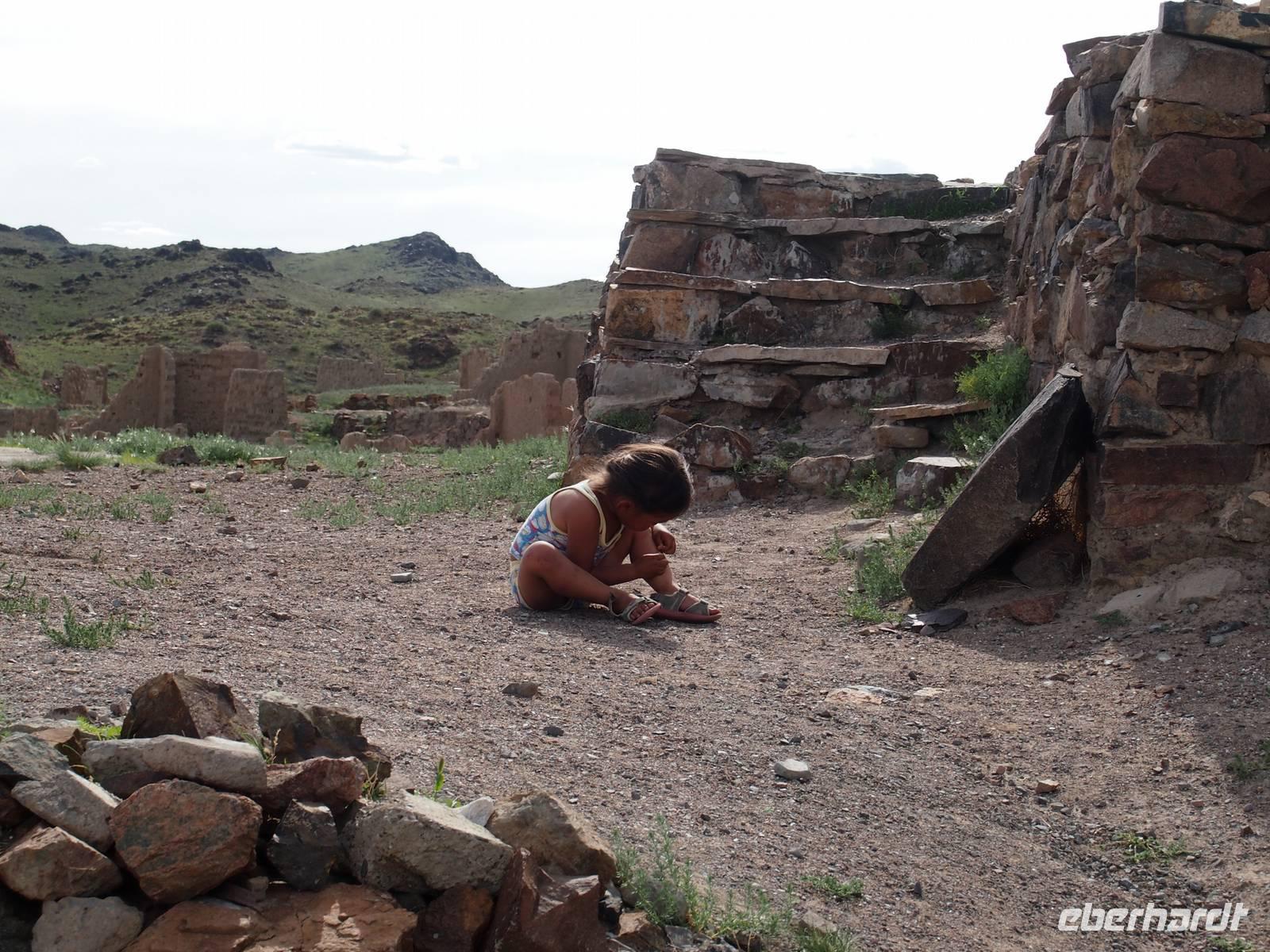 Um den Tag in Karakorum voll und ganz zu nutzen, sind wir zeitiger als sonst gestartet. Auf dem Weg nach Karakorum konnten wir unterwegs wieder ein Pferderennen beobachten, leider war der Start schwer auszumachen und so verpassten wir ihn um einige Meter. Dafür waren wir trotzdem ganz nah an dem Rennen und konnten die Teilnehmer aus nächster Nähe beobachten. Ein weiteres Highlight auf der Fahrt nach Karakorum waren circa acht Adler und mehrere Geier, die sich gerade über einen Kadaver hermachten. Die Tiere gaben uns kurzzeitig die Gelegenheit, sie ungestört dabei zu beobachten. Was für ein Erlebnis! Nach etwa vier Stunden erreichten wir die einstige Hauptstadt unter der Führung von Dschingis Khan der Mongolei. Beeindruckend dabei sind vor allem die ehemaligen Stadtmauern. Zuerst besuchten wir das Museum, welches einige Fundstücke und auch eine Miniaturansicht der ehemaligen Hauptstadt ausstellt. Wenn man die Fundstücke sieht, ist es sehr traurig anzusehen, wie viel von diesen wertvollen Schätzen zerstört wurde. Interessant war auch zu sehen, wie weit die Mongolei einst ging. Für uns ist es kaum vorstellbar, dass die unterschiedlichen Khans in alle Himmelsrichtungen soweit vorgedrungen sind. Anschließend besuchten wir das ehemalige Gelände bzw. das, was davon noch übrig geblieben ist. Am faszinierendsten waren dabei das Kloster mit seinen drei Tempeln und die alten Zeichnungen und Stoffe.