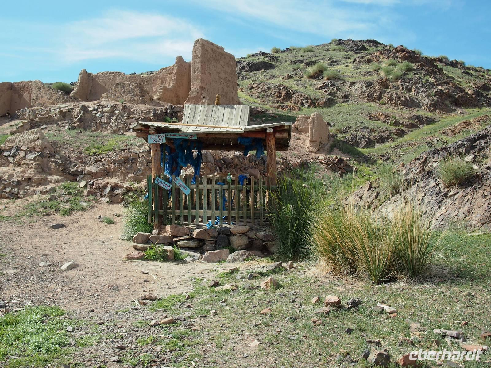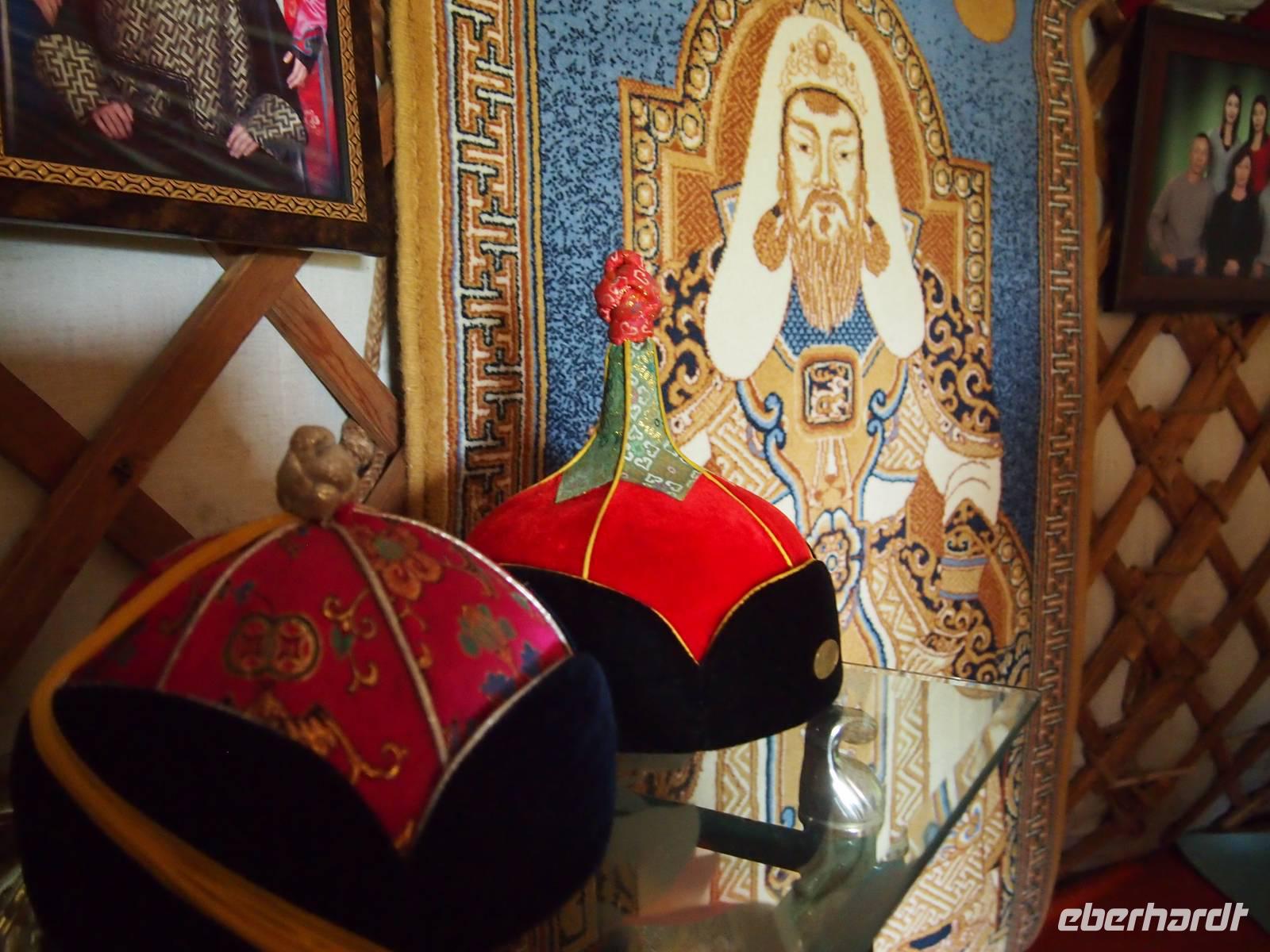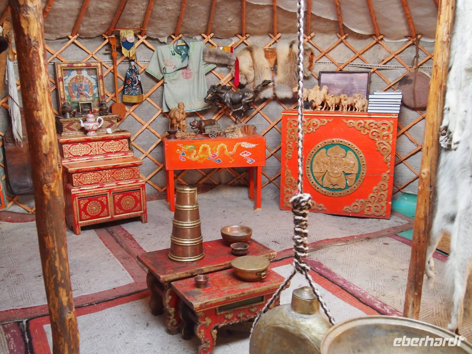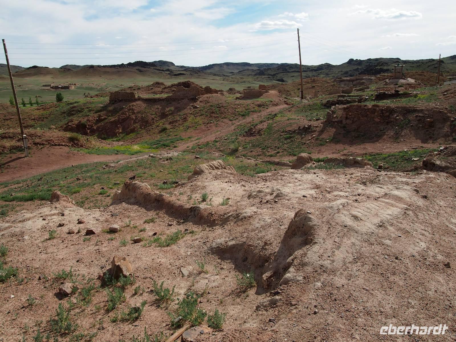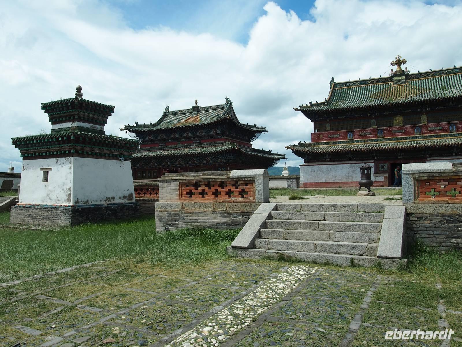 Um den Tag in Karakorum voll und ganz zu nutzen, sind wir zeitiger als sonst gestartet. Auf dem Weg nach Karakorum konnten wir unterwegs wieder ein Pferderennen beobachten, leider war der Start schwer auszumachen und so verpassten wir ihn um einige Meter. Dafür waren wir trotzdem ganz nah an dem Rennen und konnten die Teilnehmer aus nächster Nähe beobachten. Ein weiteres Highlight auf der Fahrt nach Karakorum waren circa acht Adler und mehrere Geier, die sich gerade über einen Kadaver hermachten. Die Tiere gaben uns kurzzeitig die Gelegenheit, sie ungestört dabei zu beobachten. Was für ein Erlebnis! Nach etwa vier Stunden erreichten wir die einstige Hauptstadt unter der Führung von Dschingis Khan der Mongolei. Beeindruckend dabei sind vor allem die ehemaligen Stadtmauern. Zuerst besuchten wir das Museum, welches einige Fundstücke und auch eine Miniaturansicht der ehemaligen Hauptstadt ausstellt. Wenn man die Fundstücke sieht, ist es sehr traurig anzusehen, wie viel von diesen wertvollen Schätzen zerstört wurde. Interessant war auch zu sehen, wie weit die Mongolei einst ging. Für uns ist es kaum vorstellbar, dass die unterschiedlichen Khans in alle Himmelsrichtungen soweit vorgedrungen sind. Anschließend besuchten wir das ehemalige Gelände bzw. das, was davon noch übrig geblieben ist. Am faszinierendsten waren dabei das Kloster mit seinen drei Tempeln und die alten Zeichnungen und Stoffe.