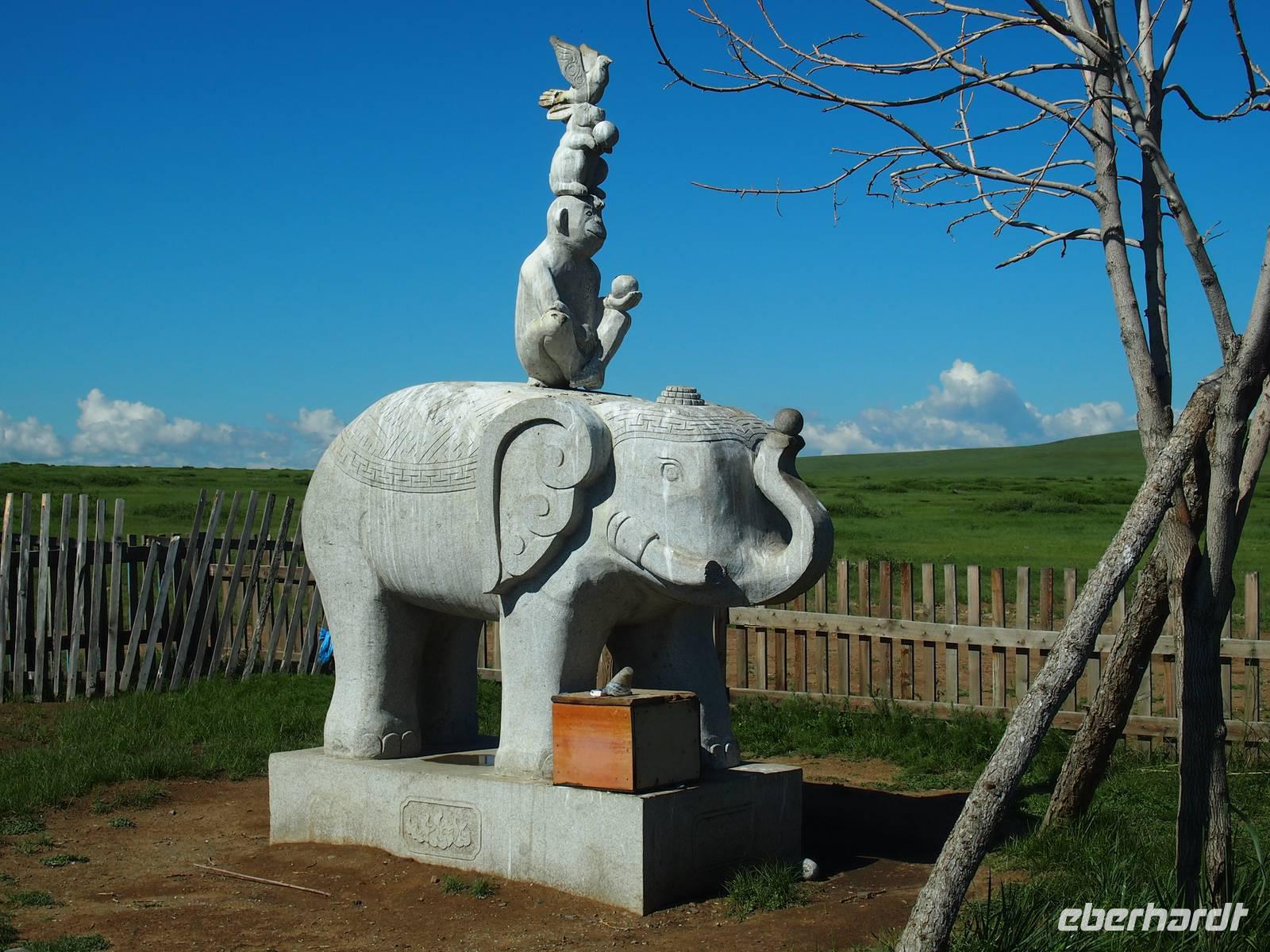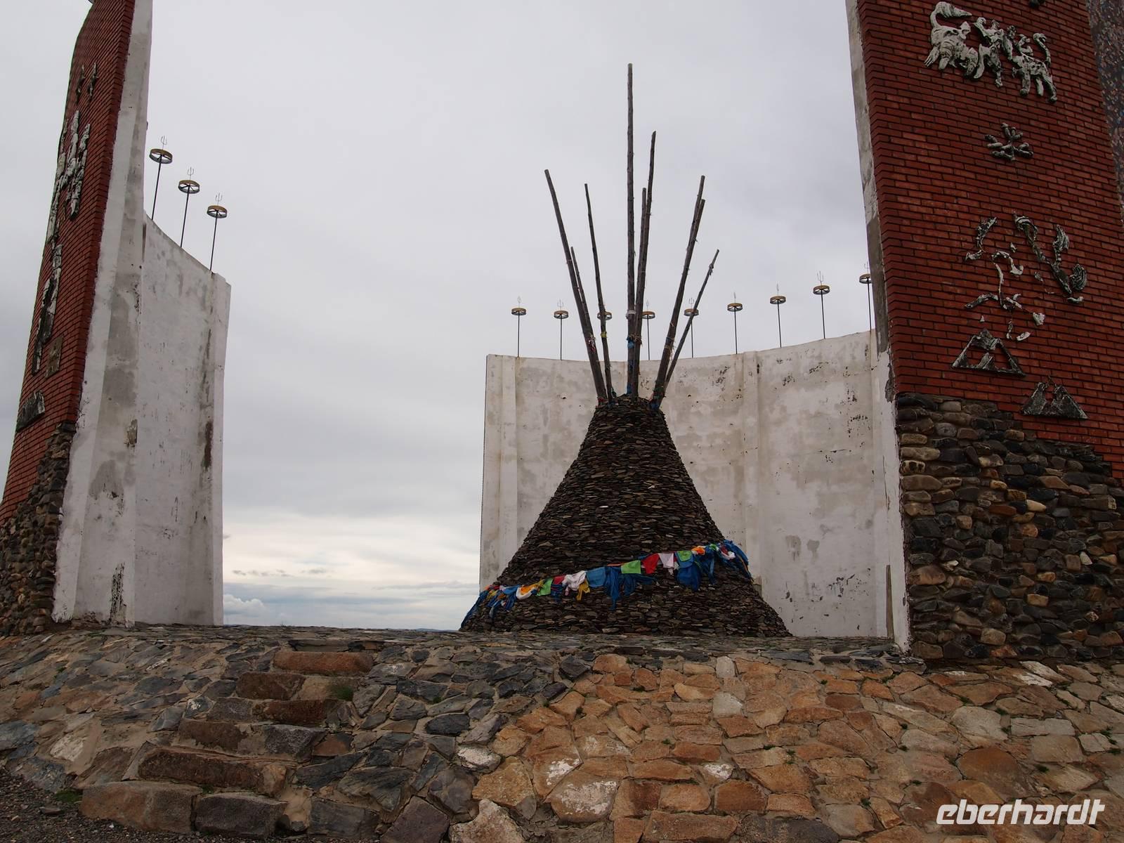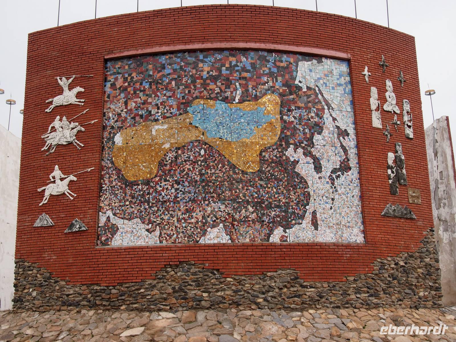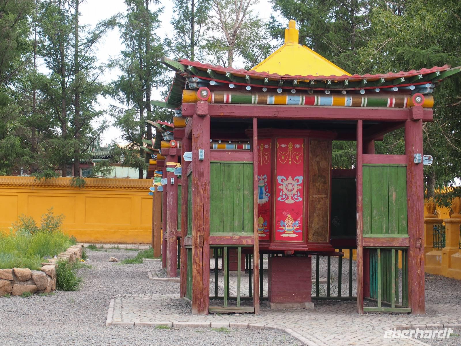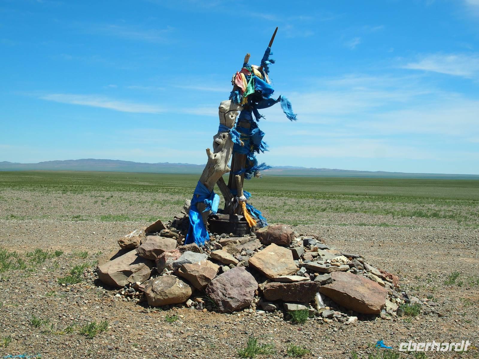 Um den Tag in Karakorum voll und ganz zu nutzen, sind wir zeitiger als sonst gestartet. Auf dem Weg nach Karakorum konnten wir unterwegs wieder ein Pferderennen beobachten, leider war der Start schwer auszumachen und so verpassten wir ihn um einige Meter. Dafür waren wir trotzdem ganz nah an dem Rennen und konnten die Teilnehmer aus nächster Nähe beobachten. Ein weiteres Highlight auf der Fahrt nach Karakorum waren circa acht Adler und mehrere Geier, die sich gerade über einen Kadaver hermachten. Die Tiere gaben uns kurzzeitig die Gelegenheit, sie ungestört dabei zu beobachten. Was für ein Erlebnis! Nach etwa vier Stunden erreichten wir die einstige Hauptstadt unter der Führung von Dschingis Khan der Mongolei. Beeindruckend dabei sind vor allem die ehemaligen Stadtmauern. Zuerst besuchten wir das Museum, welches einige Fundstücke und auch eine Miniaturansicht der ehemaligen Hauptstadt ausstellt. Wenn man die Fundstücke sieht, ist es sehr traurig anzusehen, wie viel von diesen wertvollen Schätzen zerstört wurde. Interessant war auch zu sehen, wie weit die Mongolei einst ging. Für uns ist es kaum vorstellbar, dass die unterschiedlichen Khans in alle Himmelsrichtungen soweit vorgedrungen sind. Anschließend besuchten wir das ehemalige Gelände bzw. das, was davon noch übrig geblieben ist. Am faszinierendsten waren dabei das Kloster mit seinen drei Tempeln und die alten Zeichnungen und Stoffe.