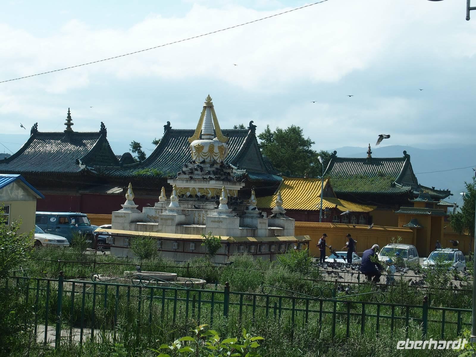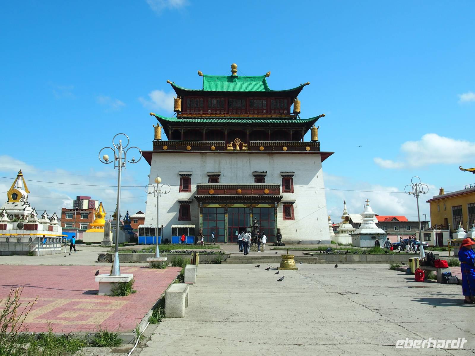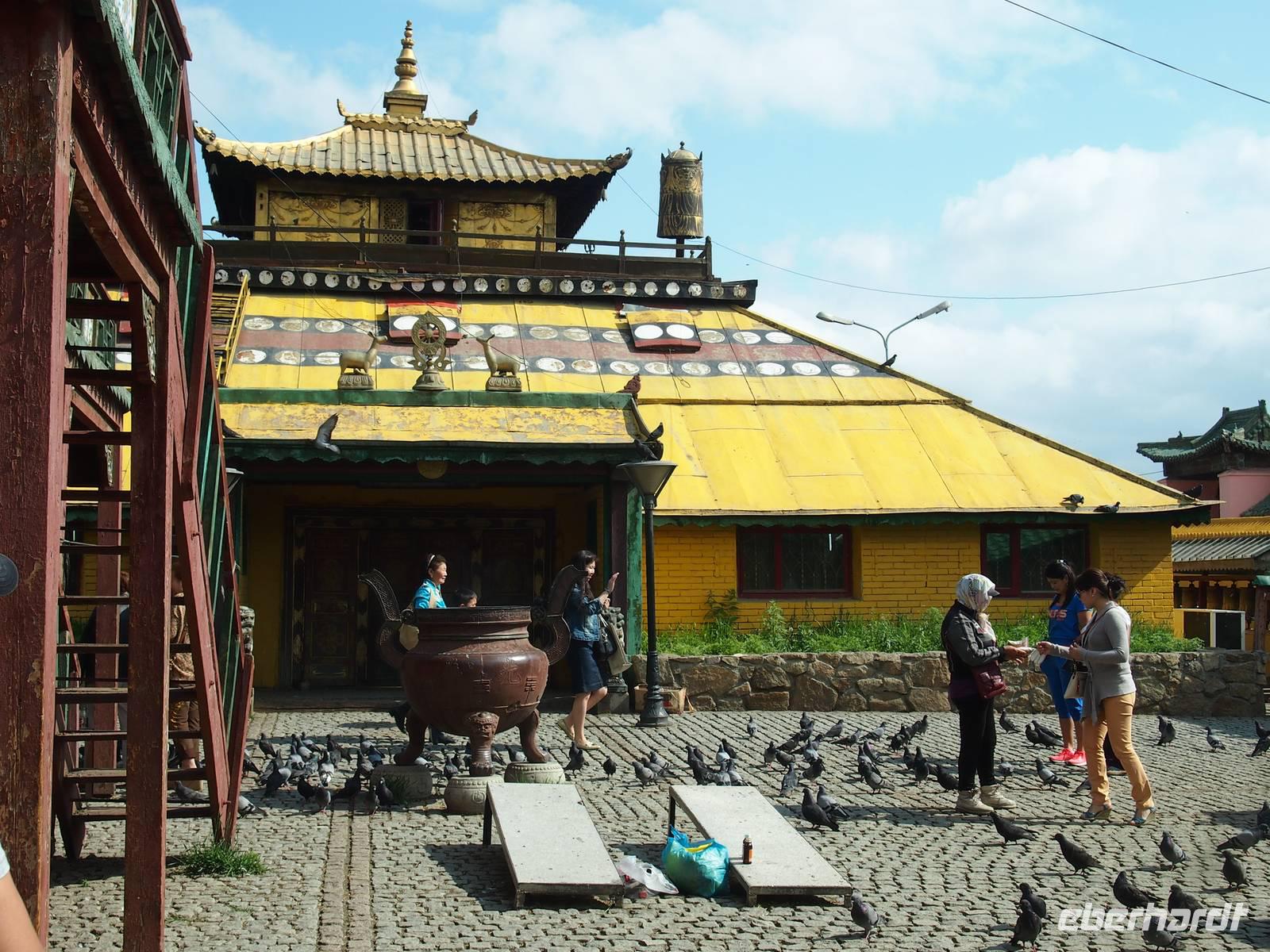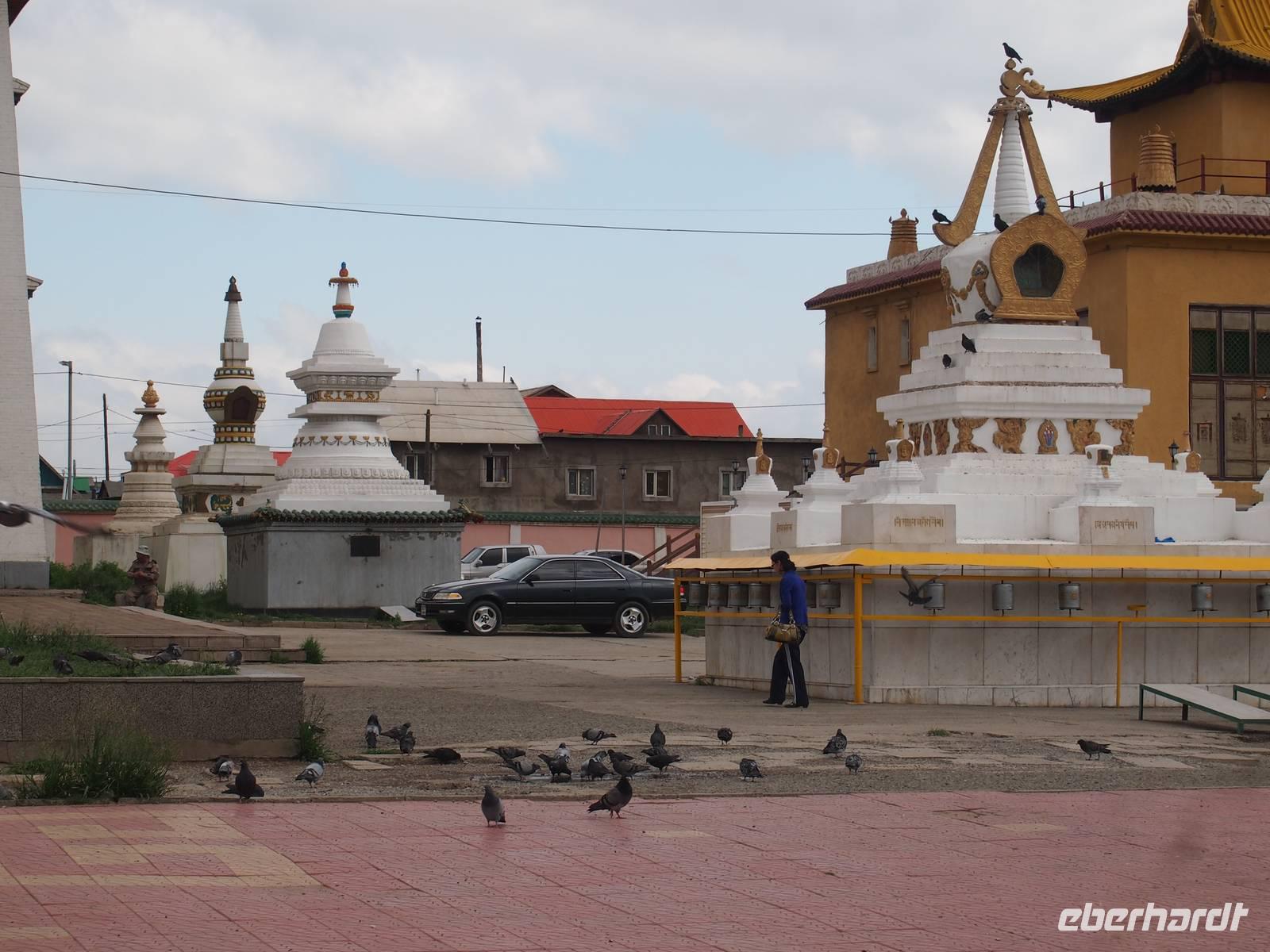 Als erstes haben wir das berühmte Gandan-Kloster, welches heute das religiöse Zentrum der Mongolei ist, besucht, welches vor allem durch die typischen buddhistischen Tempel und die riesige Goldstatue beeindruckte. In dem Kloster gab es viele kleine vergoldete Puppen, jede Figur kann für etwas anderes angebetet werden.