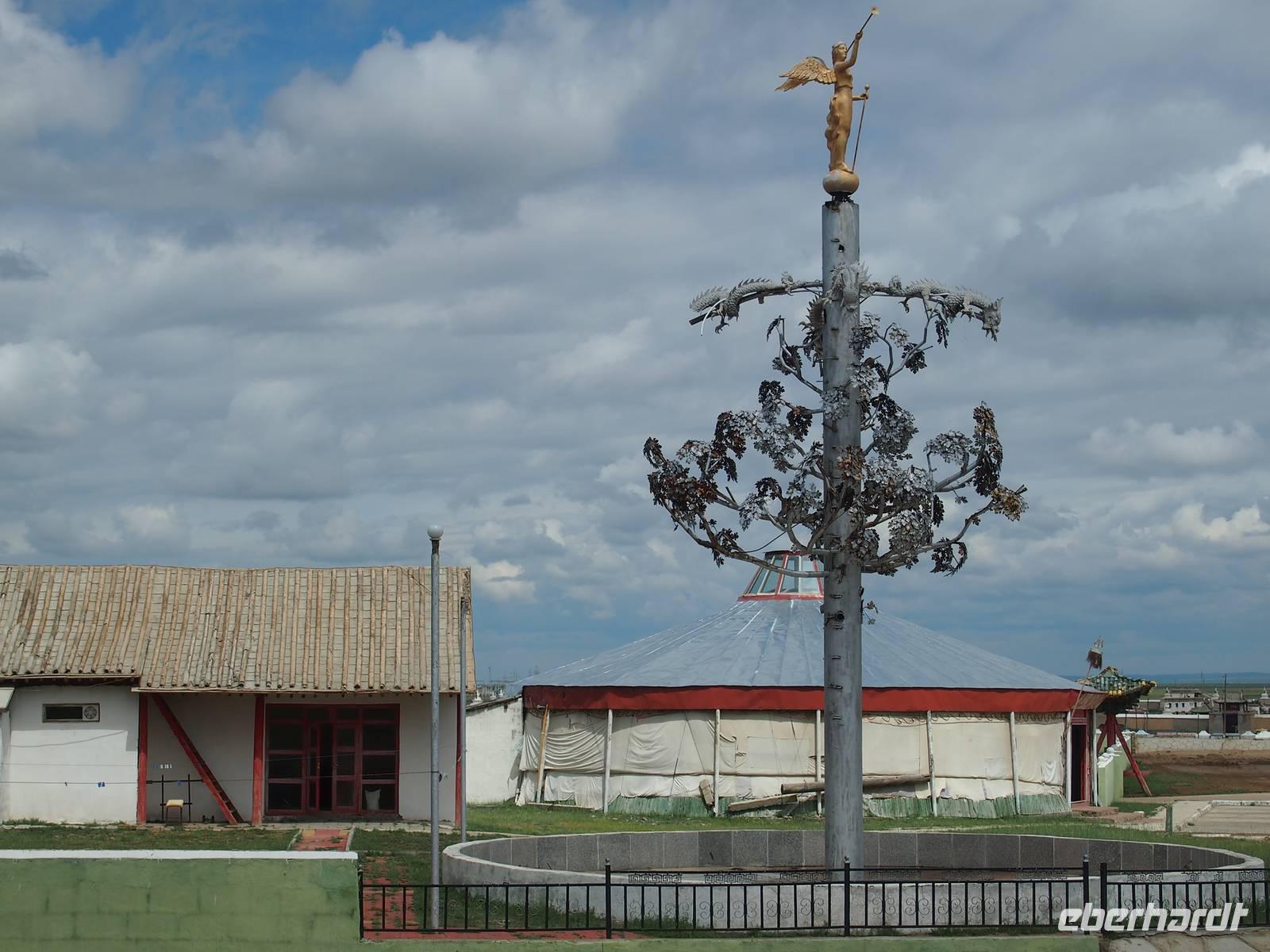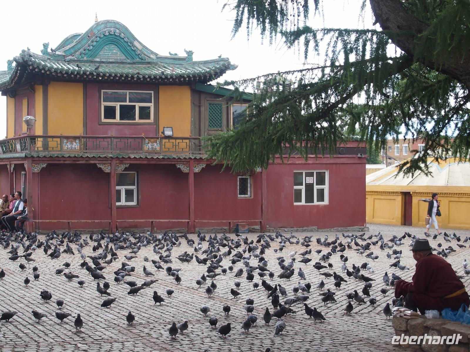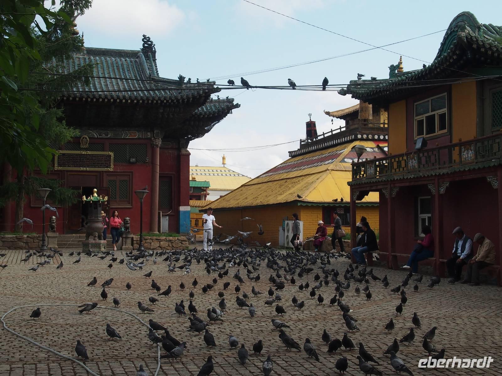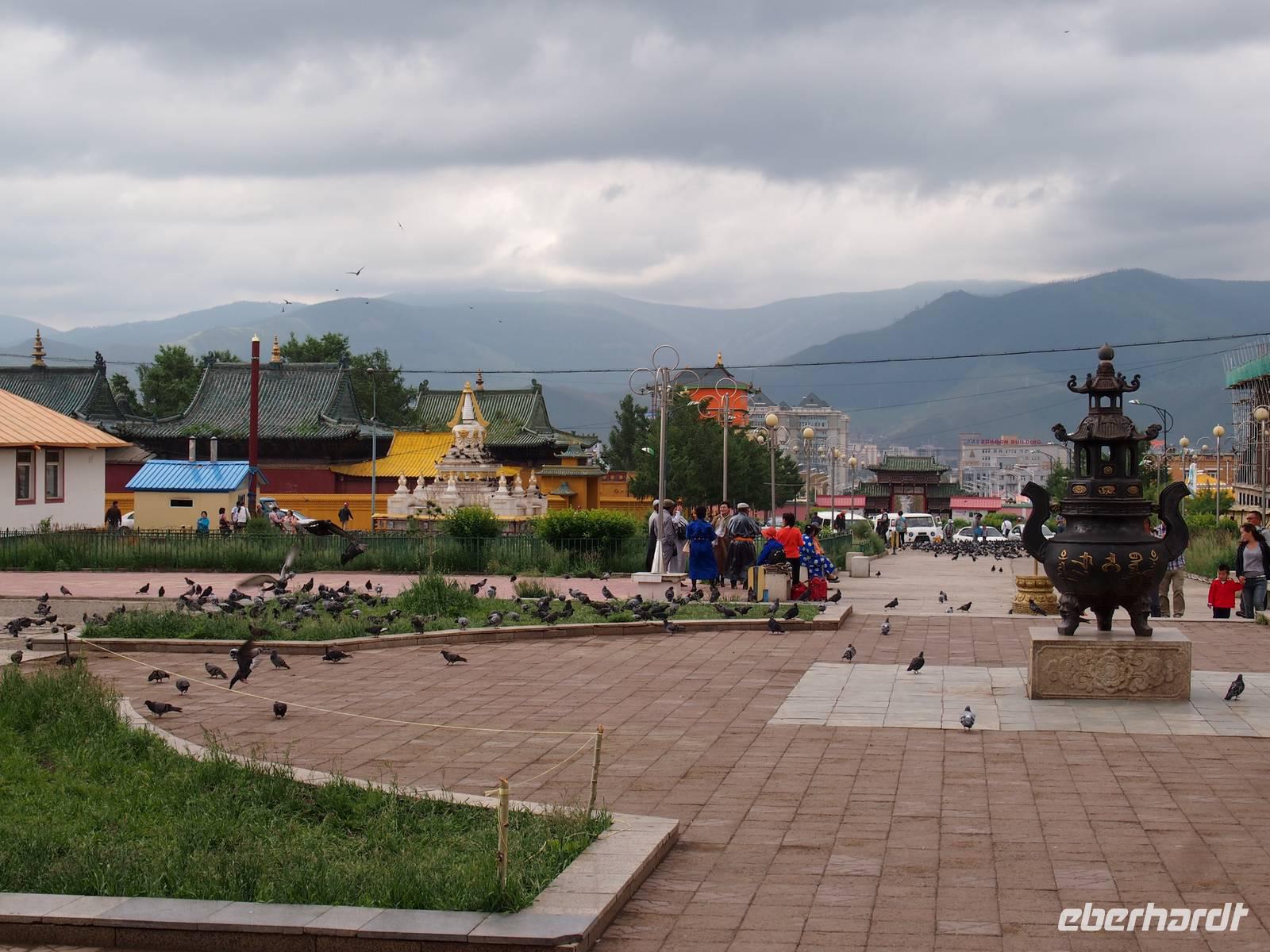 Als erstes haben wir das berühmte Gandan-Kloster, welches heute das religiöse Zentrum der Mongolei ist, besucht, welches vor allem durch die typischen buddhistischen Tempel und die riesige Goldstatue beeindruckte. In dem Kloster gab es viele kleine vergoldete Puppen, jede Figur kann für etwas anderes angebetet werden.