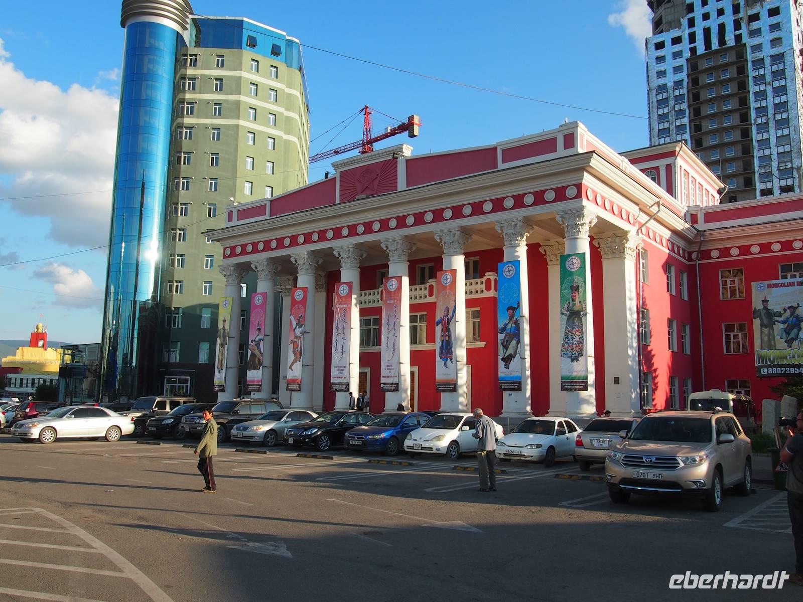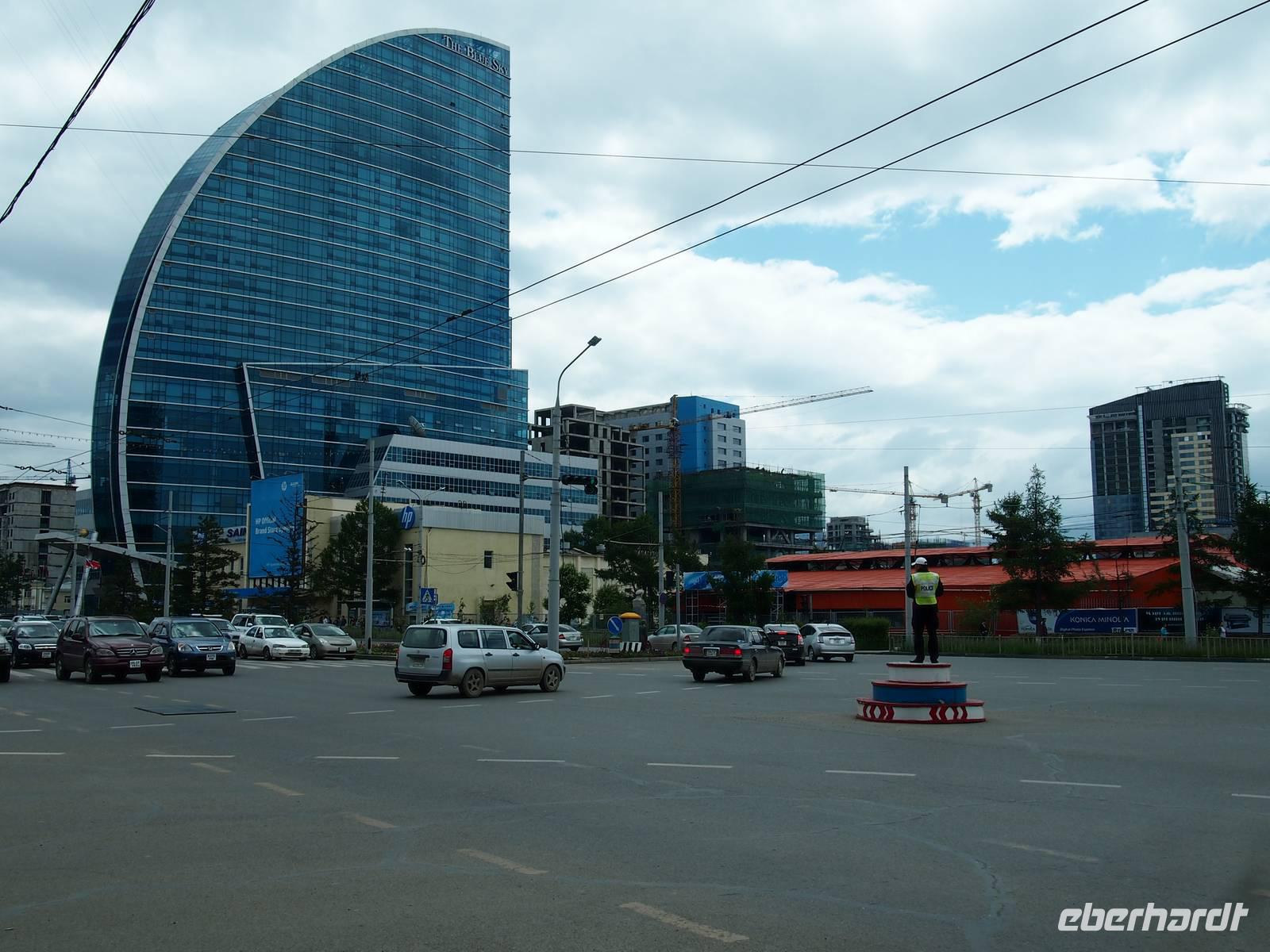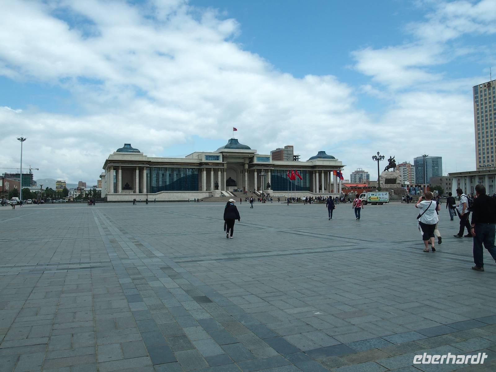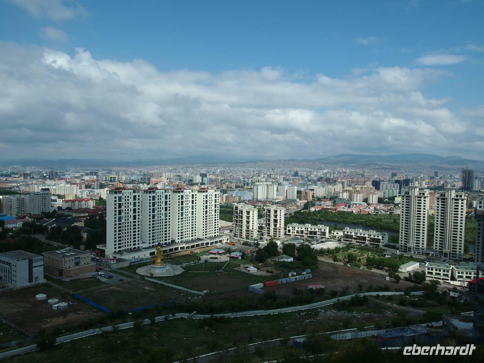 Gegen 6 Uhr sind wir auf dem Hauptflughafen" Dschingis" in der Hauptstadt Ulaanbaatar gelandet. Die Reise bis hier her war lang und anstrengend, da nur wenige von uns ein Auge im Flugzeug zubekommen haben. Am Flughafen begrüßte uns auch gleich Mugi, unsere örtliche Reiseleitung für den ersten Tag. Nachdem sie sich kurz vorgestellt hat, sind wir mit dem Bus zum Hotel Platinum gefahren. Auf dem Weg dorthin haben wir auch gleich die Gelegenheit genutzt, unsere Euro in Tugrik zu tauschen. Durch die kleine Stadtrundfahrt konnten wir schon einen ersten Eindruck von der Stadt bekommen. Nachdem wir unsere Zimmer bezogen und uns kurz frisch gemacht haben, sind wir gleich los, um die Stadt zu erkunden.