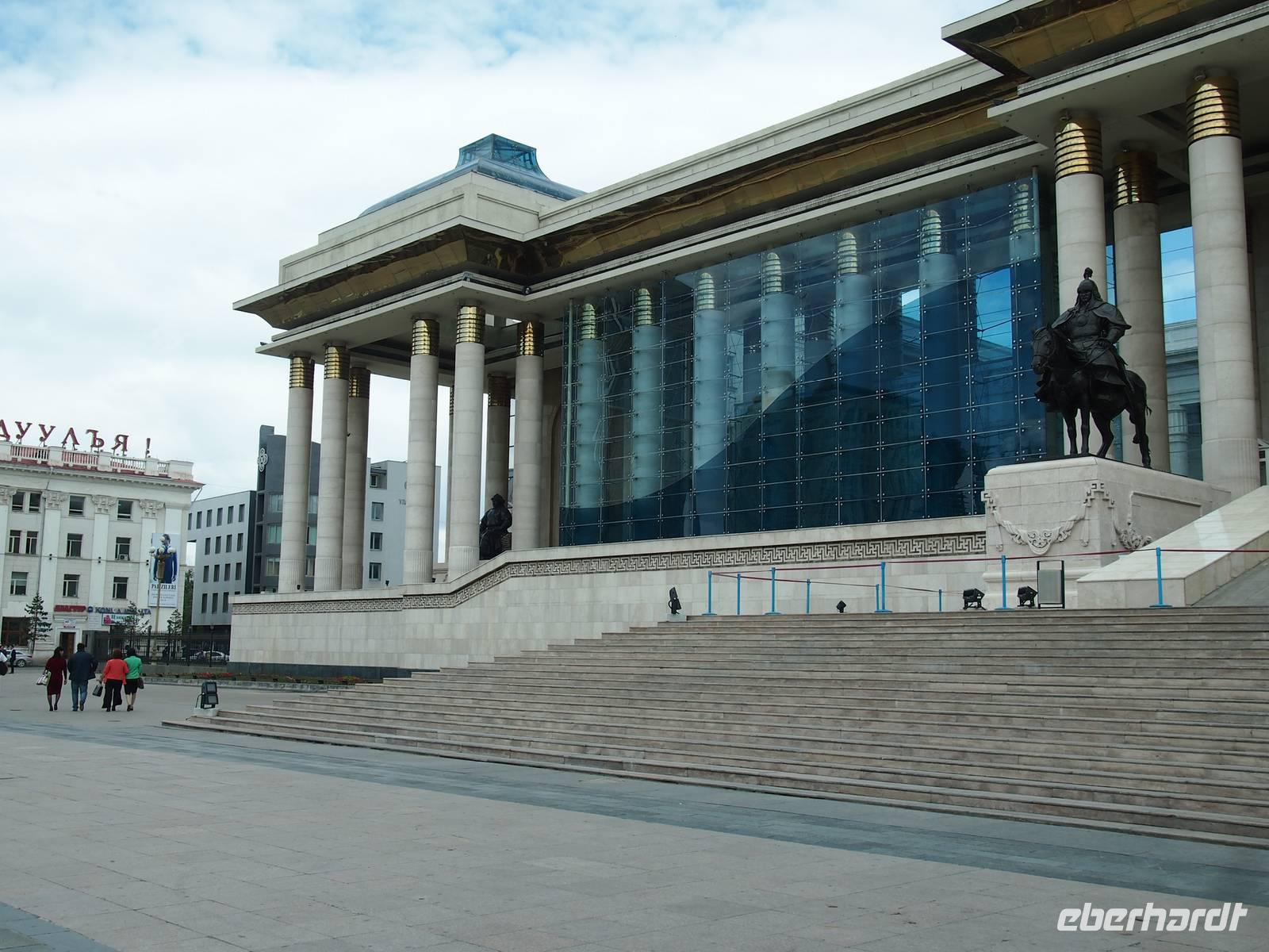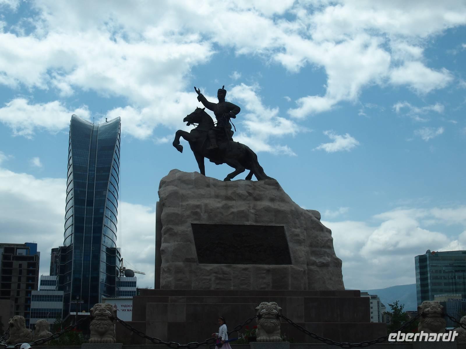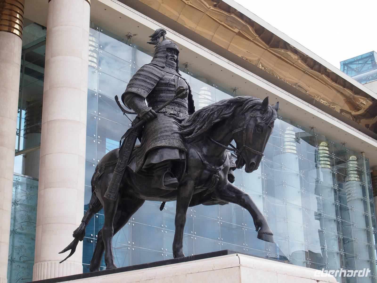 Anschließend sind wir zum Zaisan -Hügel gefahren, von wo aus wir eine beeindruckende Aussicht auf die Hauptstadt hatten. Im Anschluss haben wir einen kurzen Stopp beim Postamt eingelegt, wo wir uns vorsorglich mit Postkarten und Briefmarken eingedeckt haben. Das Postamt liegt direkt an dem Dschingis-Khan-Platz, auf dem sich das Regierungsgebäude befindet. In der Mitte des Platzes steht eine große Statue von Dschingis welche von ihrer Bauart eine Mischung aus alter und neuer Architektur ist. Insgesamt wirkten die Gebäude rund um den Platz sehr modern.