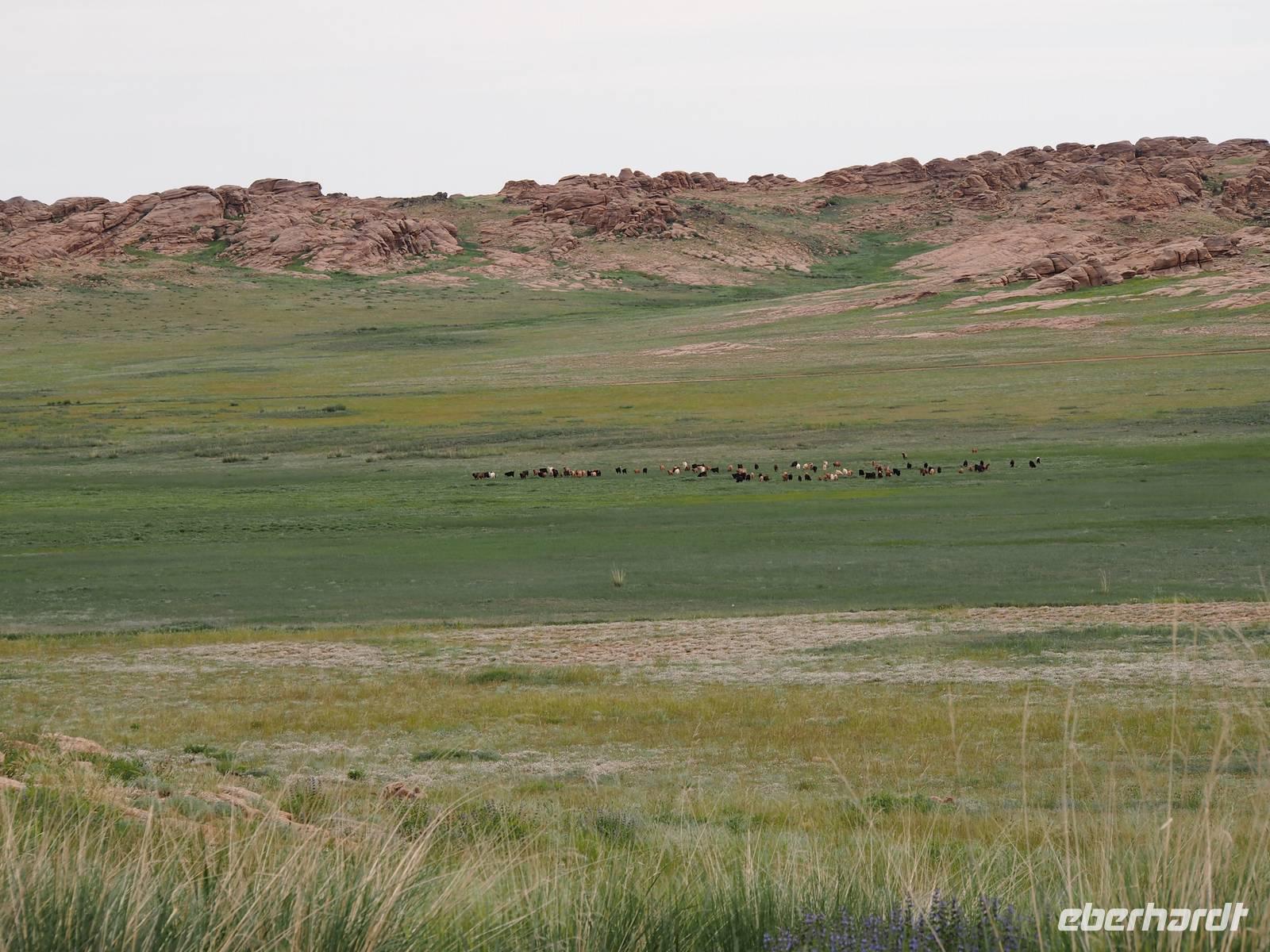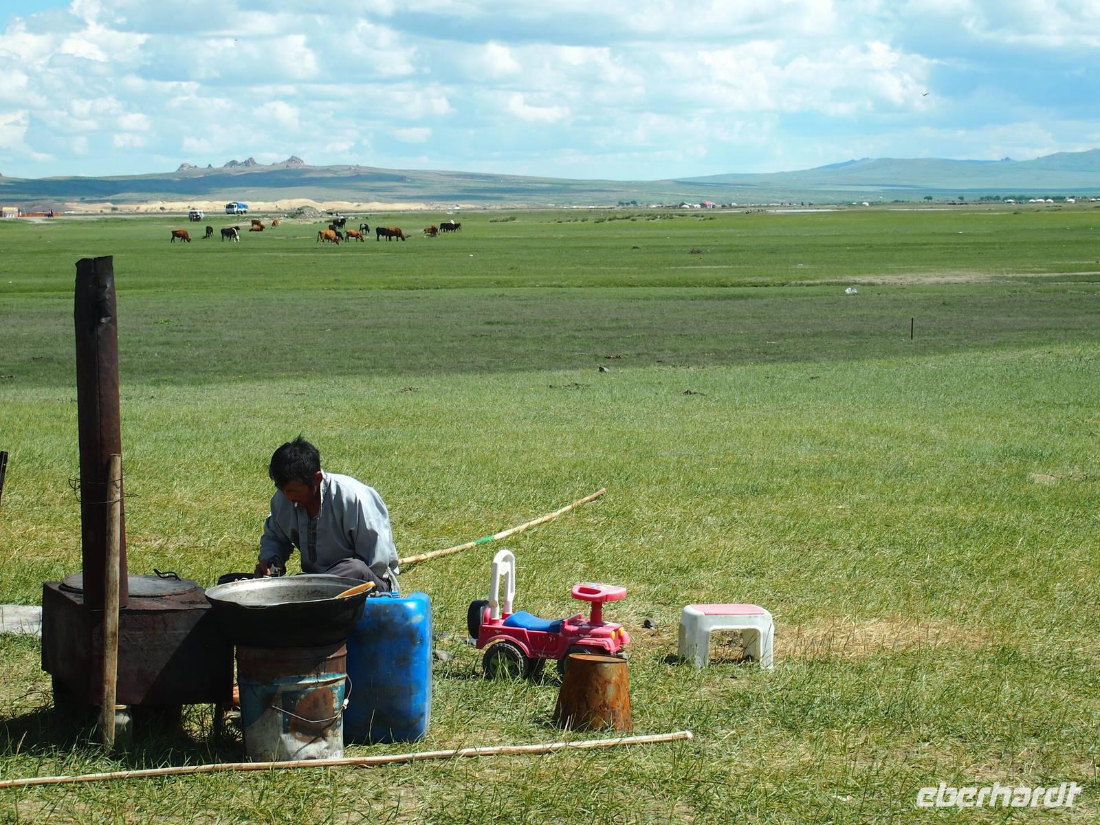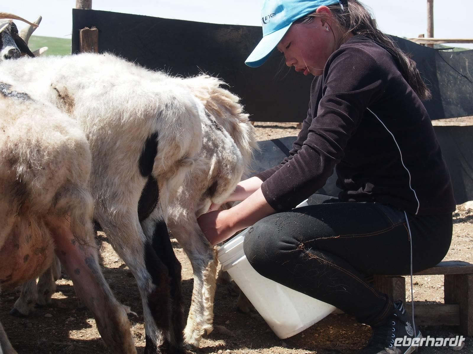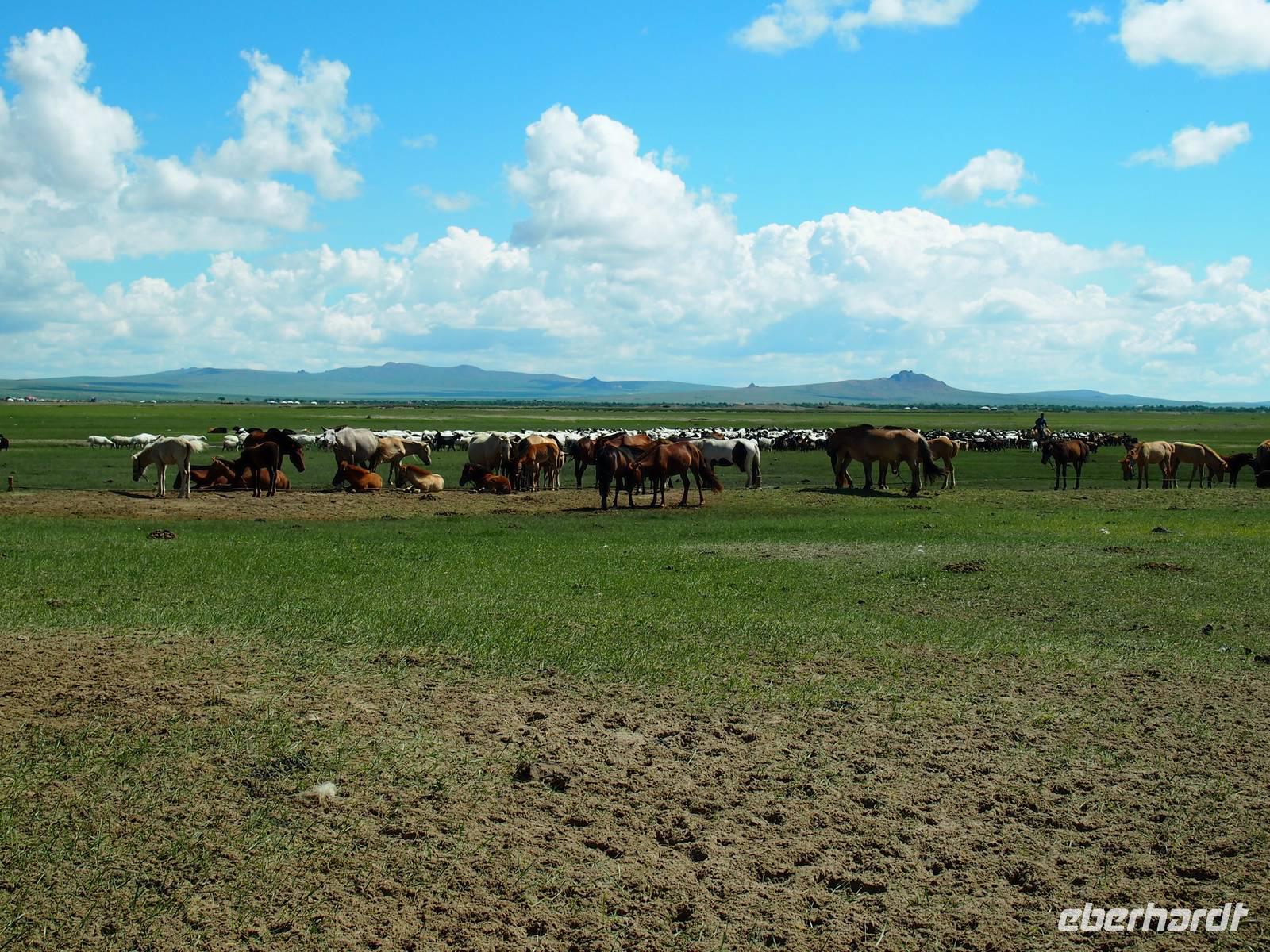 Die Landschaft veränderte sich langsam. Die Natur wurde immer grüner und die Jurten häuften sich. Außerdem sahen wir vermehrt größere Viehherden und bei einer hielten wir sogar nochmal an. Wir konnten sehen, wie die Frauen die Ziegen und Schafe melkten. Hinter den Jurten wurde Quark getrocknet und die Jungs bestiegen sogar extra für uns ihre Pferde.