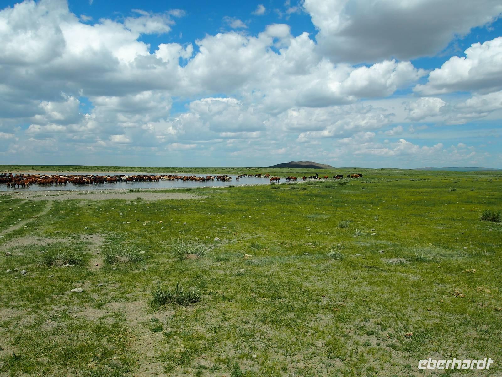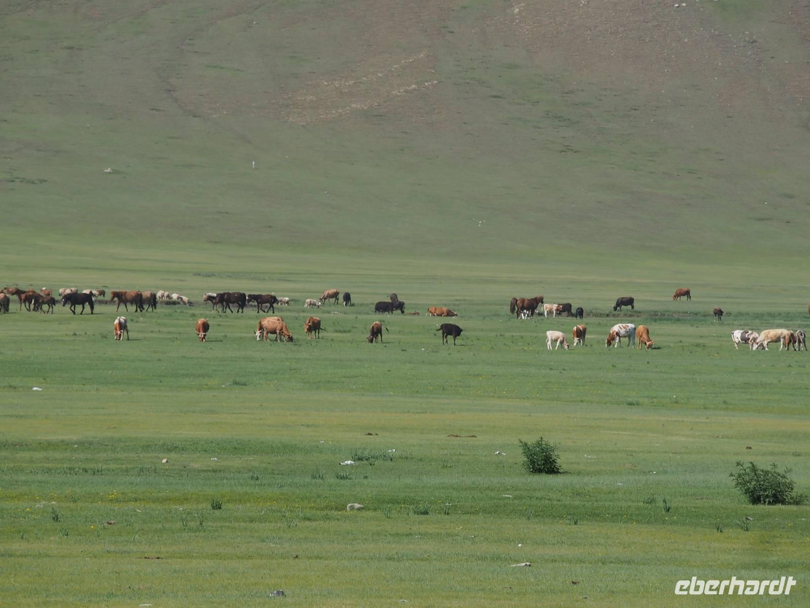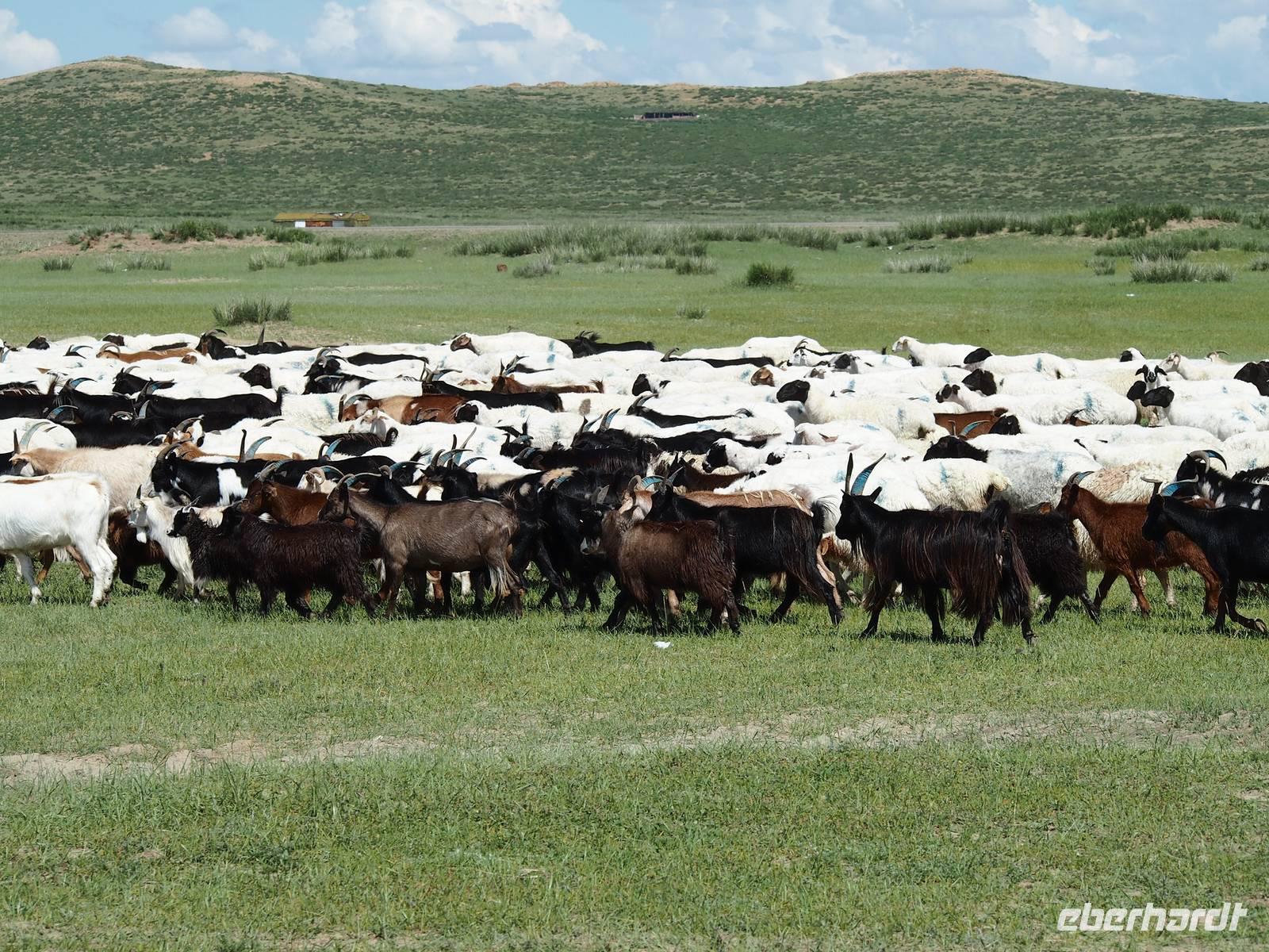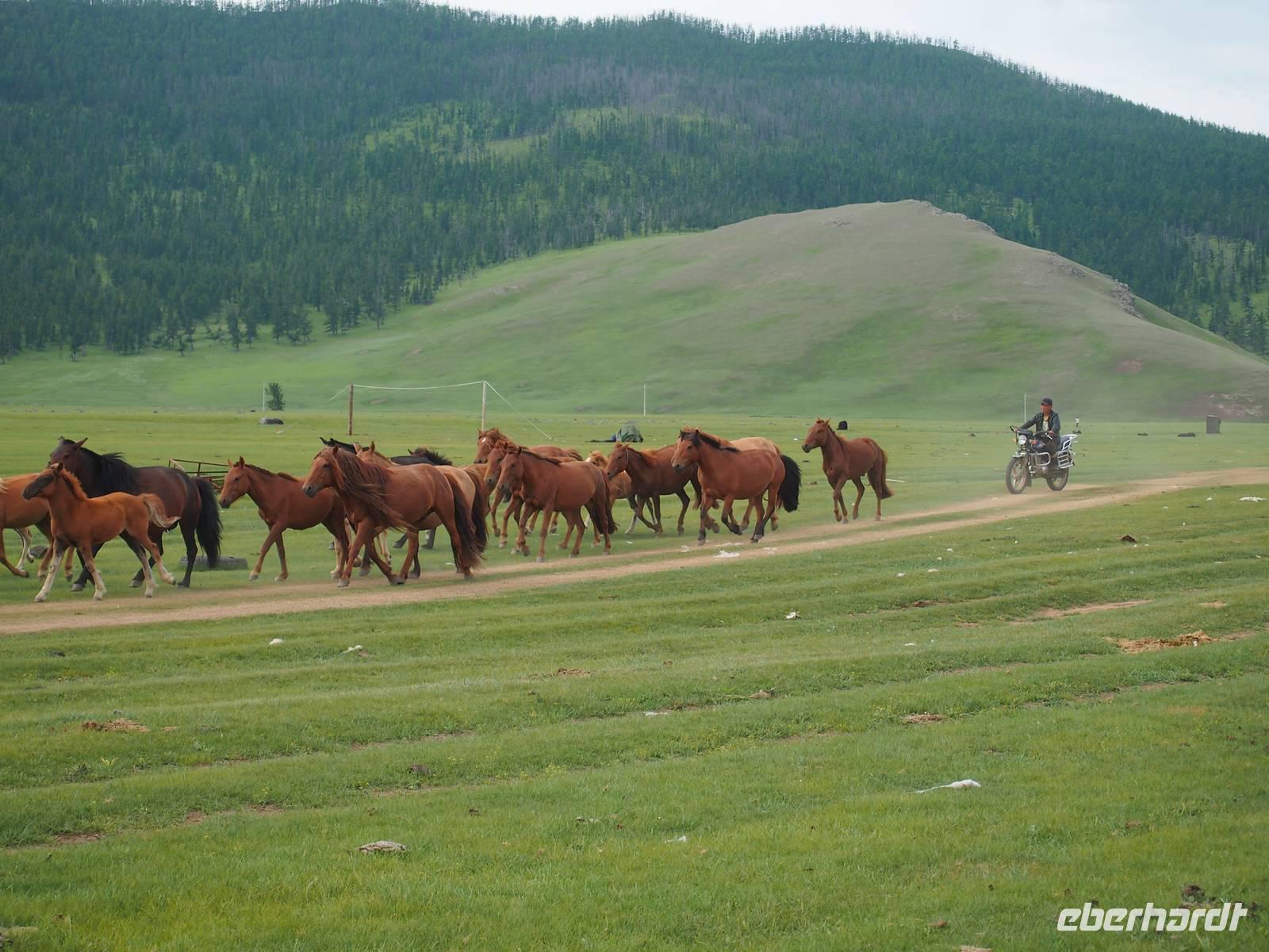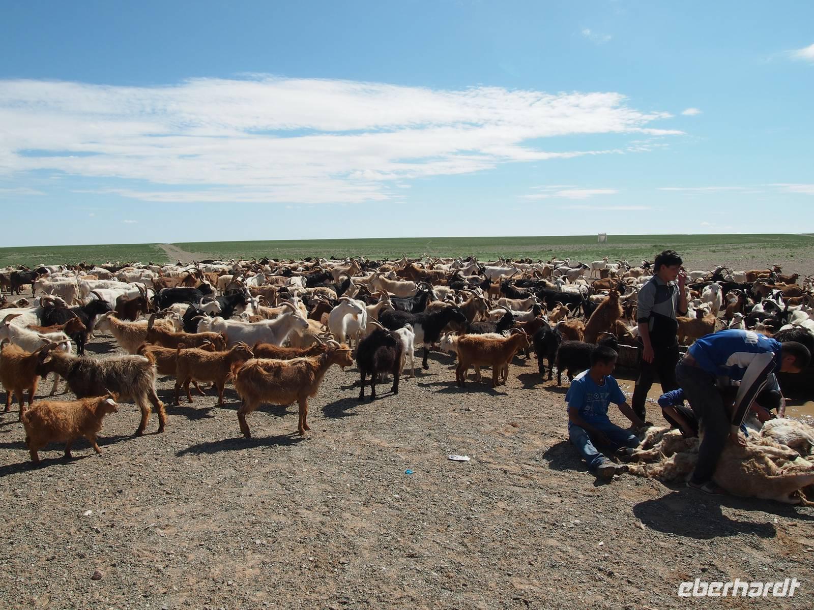 Die Landschaft veränderte sich langsam. Die Natur wurde immer grüner und die Jurten häuften sich. Außerdem sahen wir vermehrt größere Viehherden und bei einer hielten wir sogar nochmal an. Wir konnten sehen, wie die Frauen die Ziegen und Schafe melkten. Hinter den Jurten wurde Quark getrocknet und die Jungs bestiegen sogar extra für uns ihre Pferde.