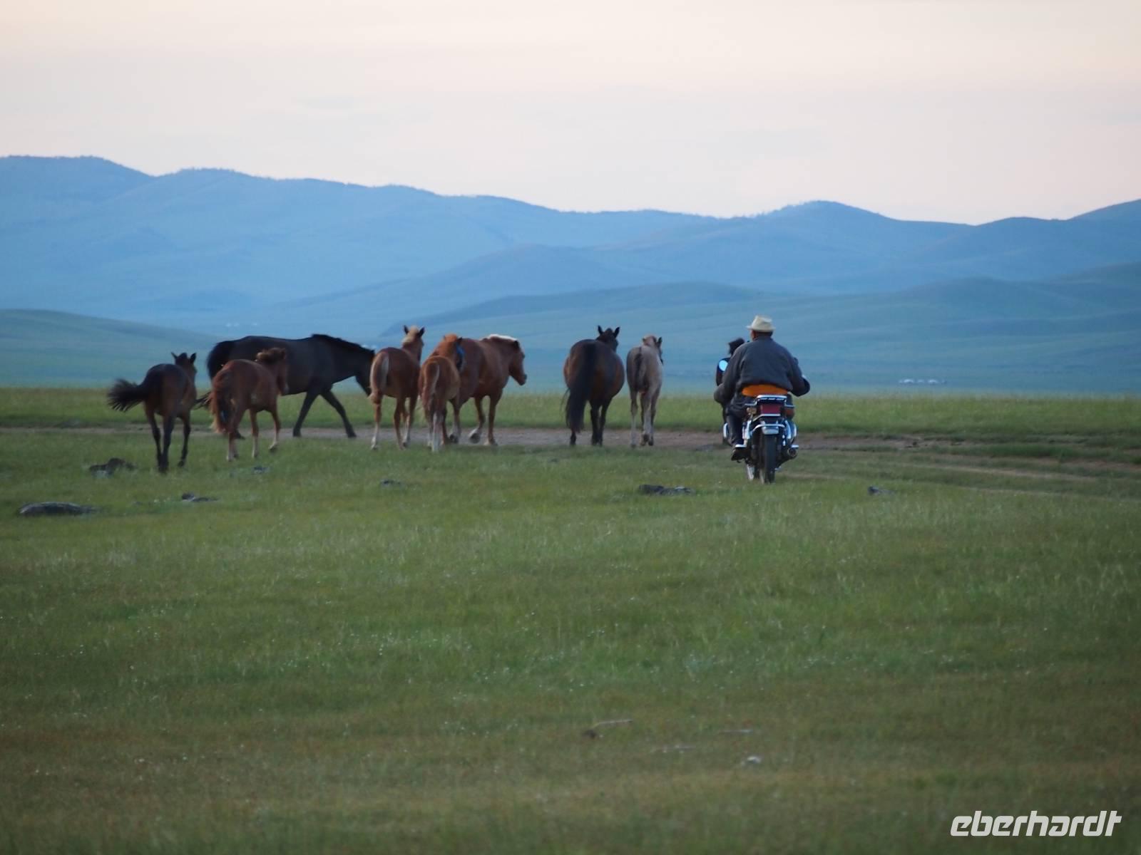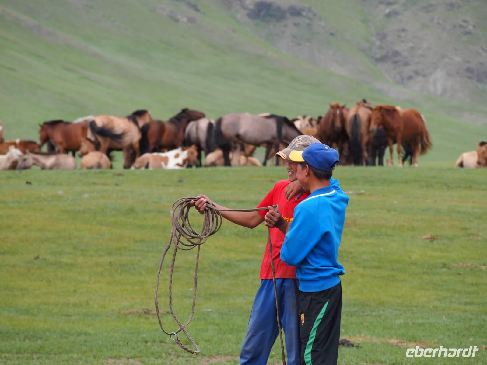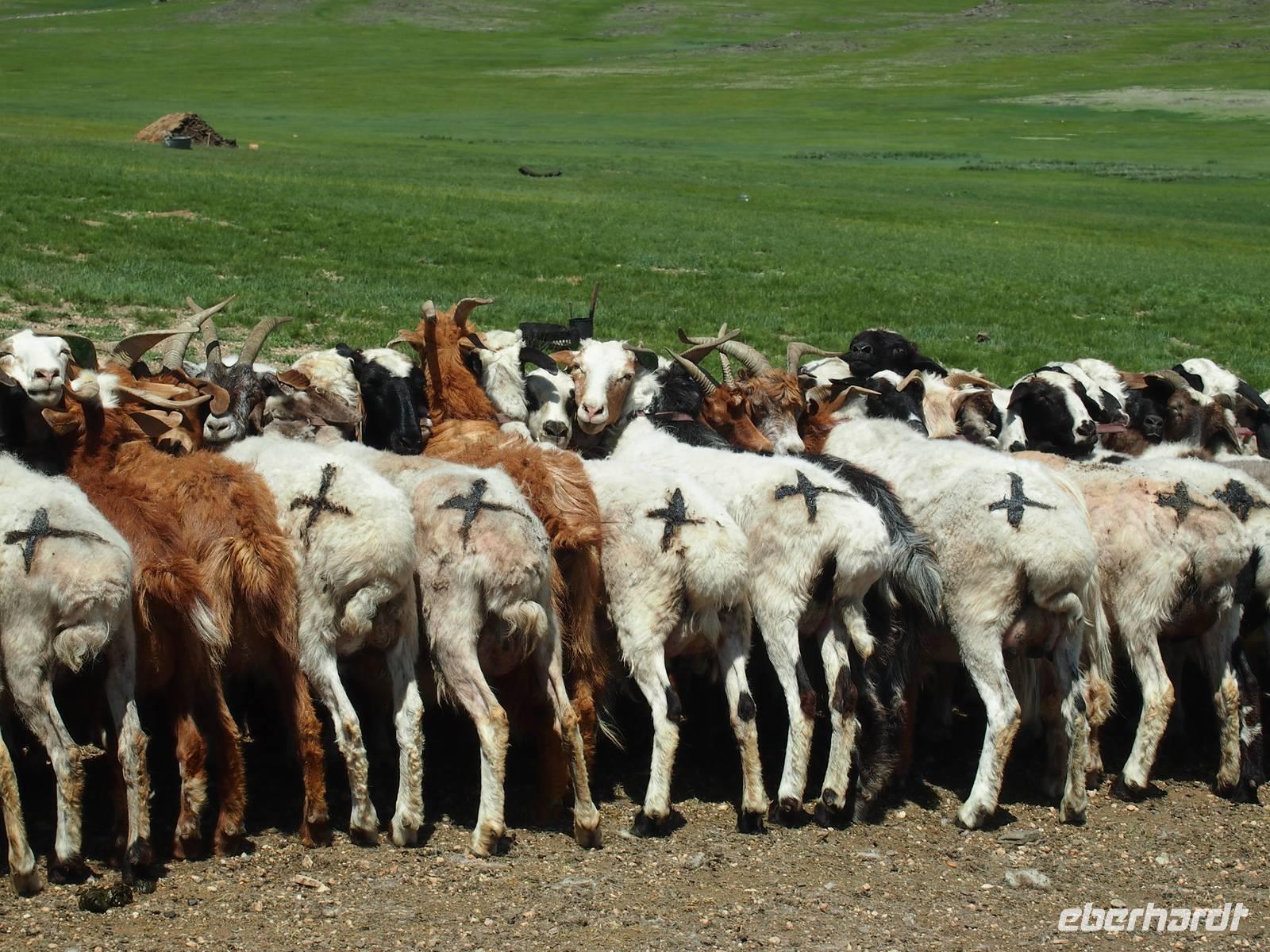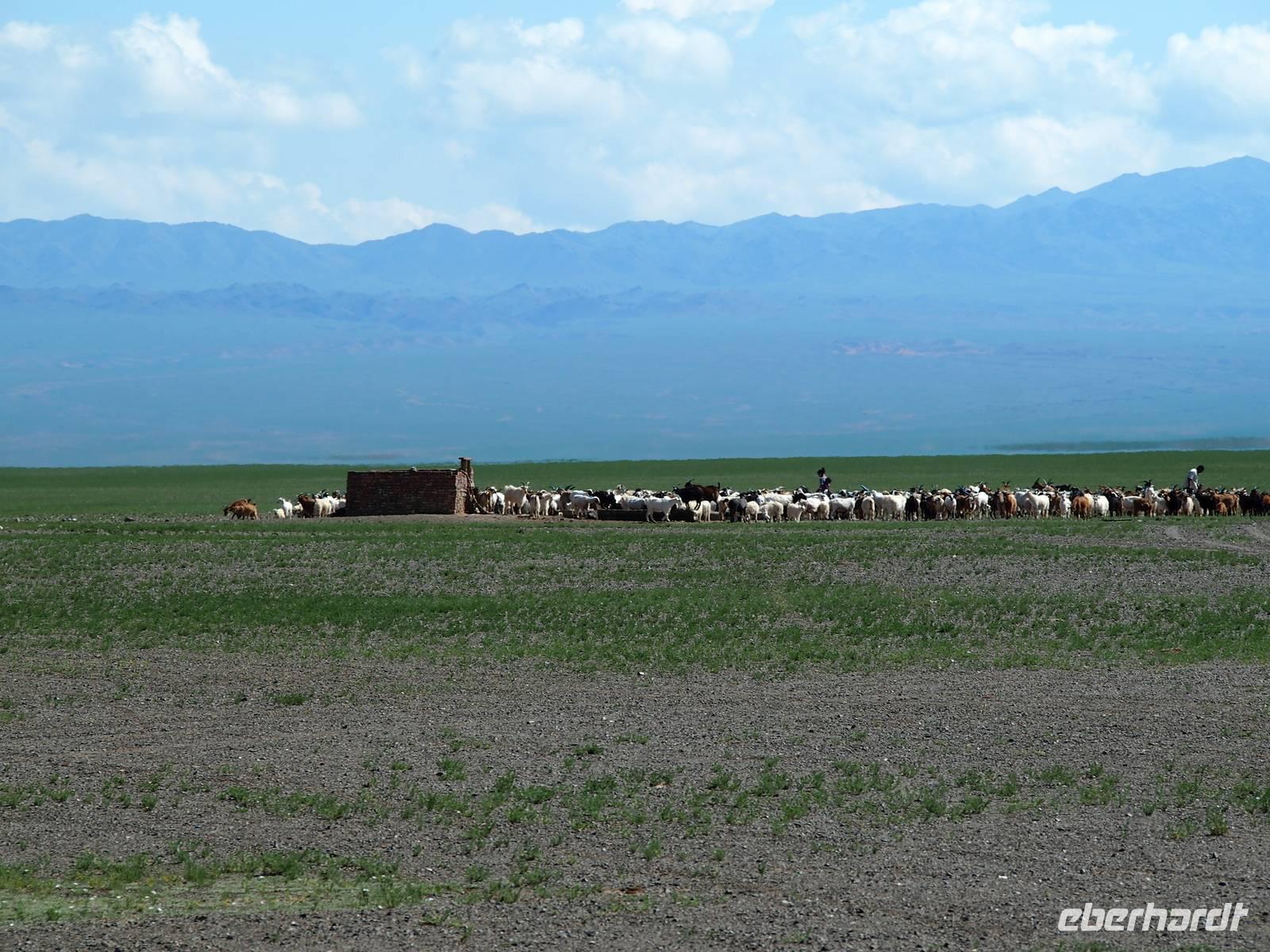 Die Landschaft veränderte sich langsam. Die Natur wurde immer grüner und die Jurten häuften sich. Außerdem sahen wir vermehrt größere Viehherden und bei einer hielten wir sogar nochmal an. Wir konnten sehen, wie die Frauen die Ziegen und Schafe melkten. Hinter den Jurten wurde Quark getrocknet und die Jungs bestiegen sogar extra für uns ihre Pferde.