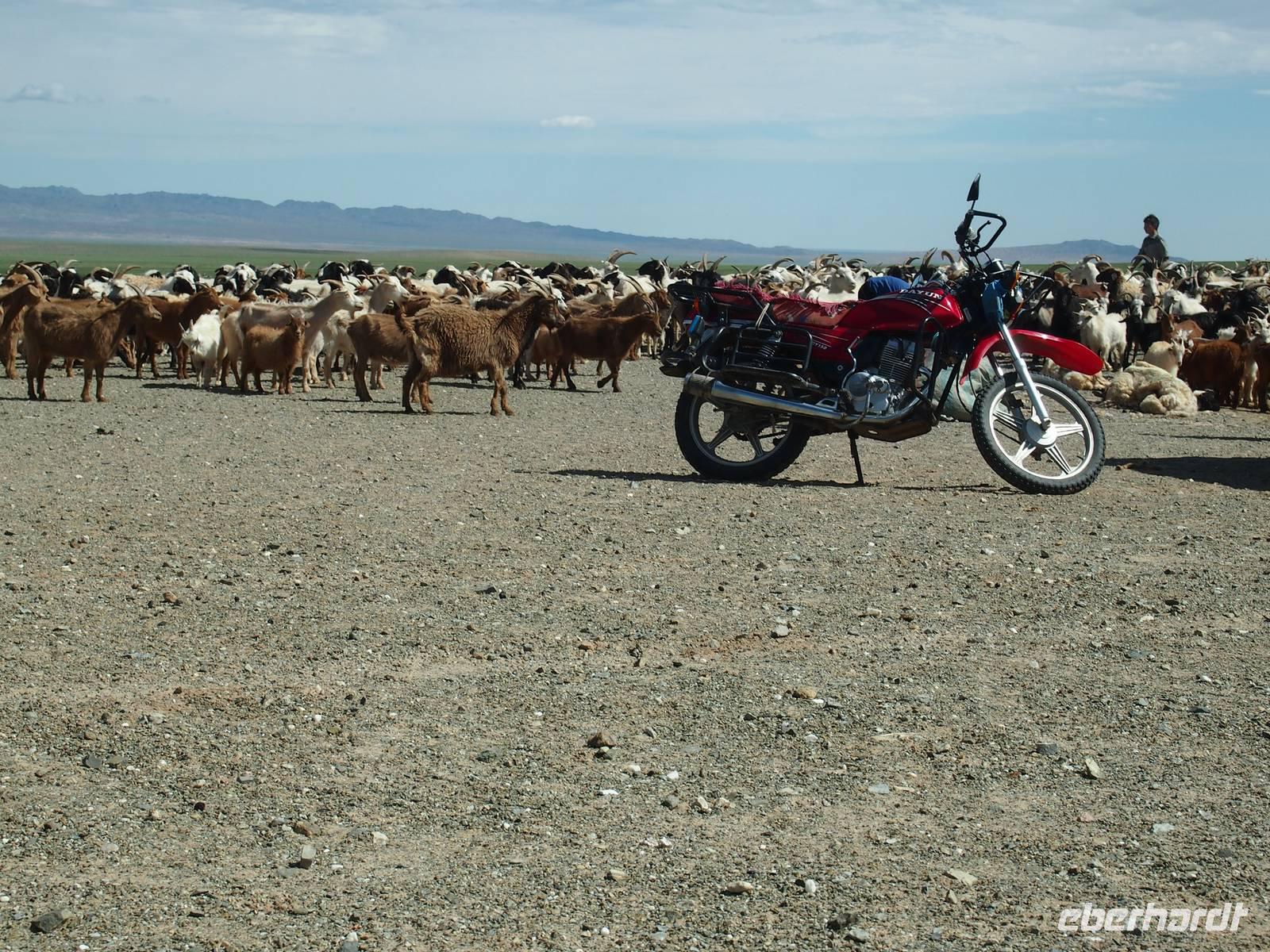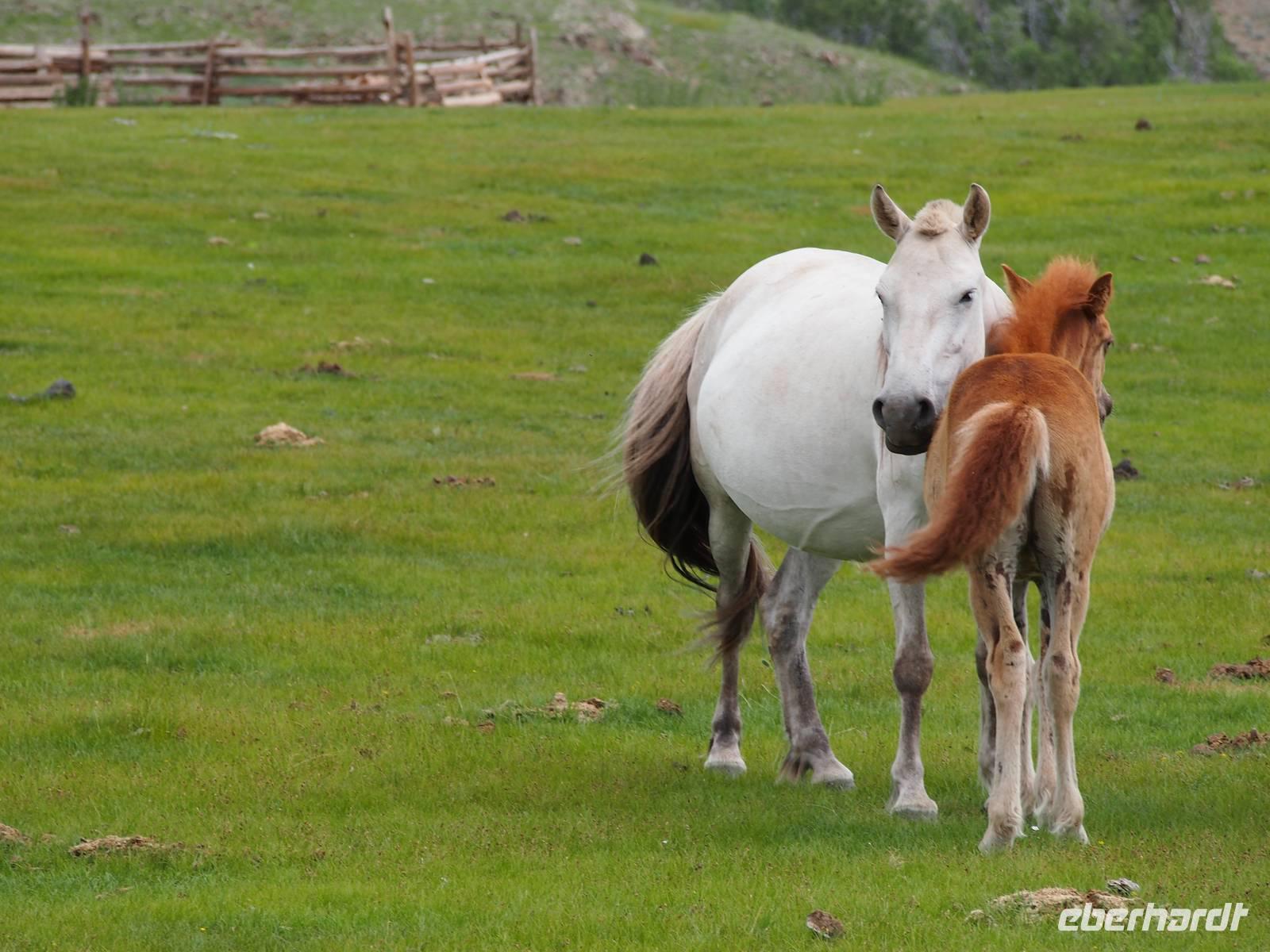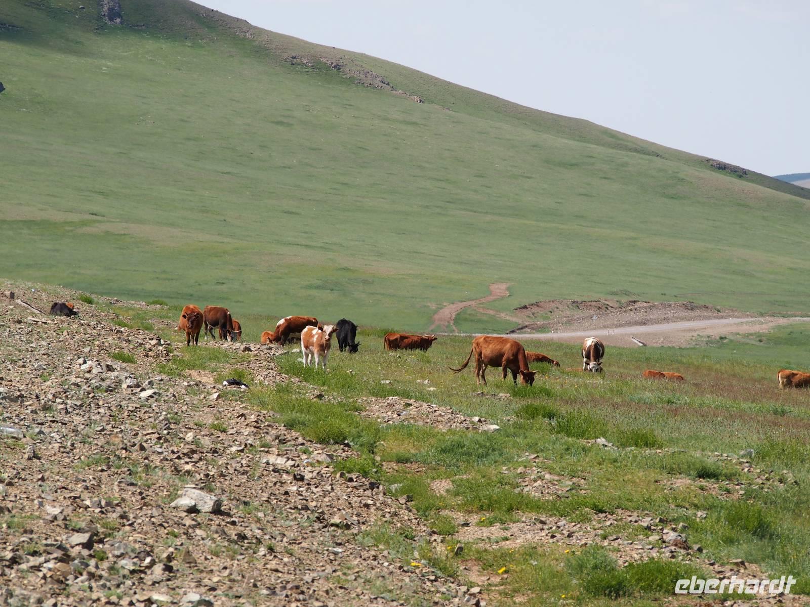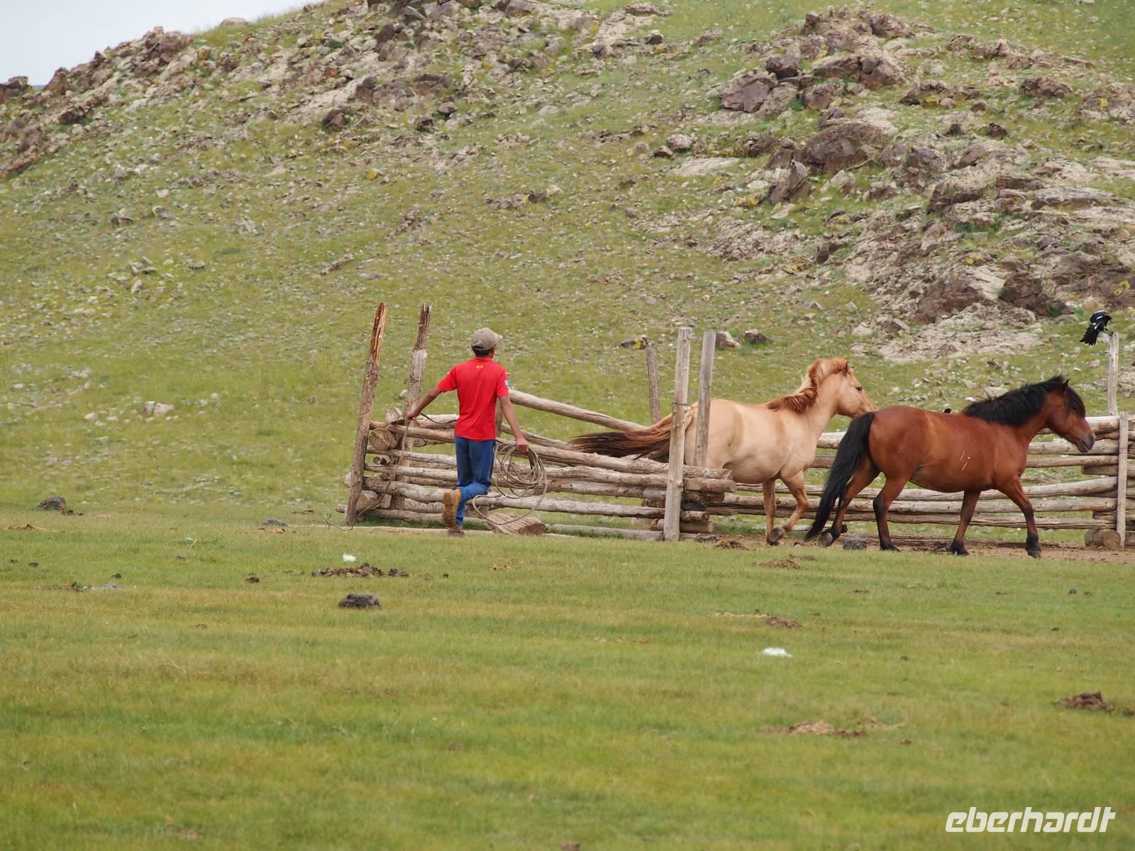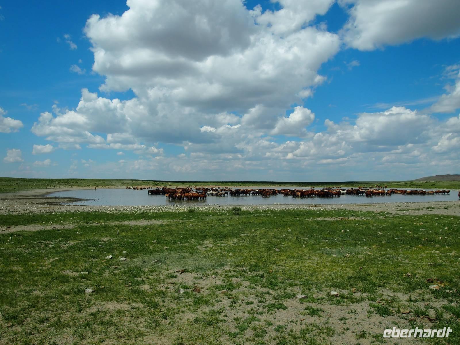Die Landschaft veränderte sich langsam. Die Natur wurde immer grüner und die Jurten häuften sich. Außerdem sahen wir vermehrt größere Viehherden und bei einer hielten wir sogar nochmal an. Wir konnten sehen, wie die Frauen die Ziegen und Schafe melkten. Hinter den Jurten wurde Quark getrocknet und die Jungs bestiegen sogar extra für uns ihre Pferde.