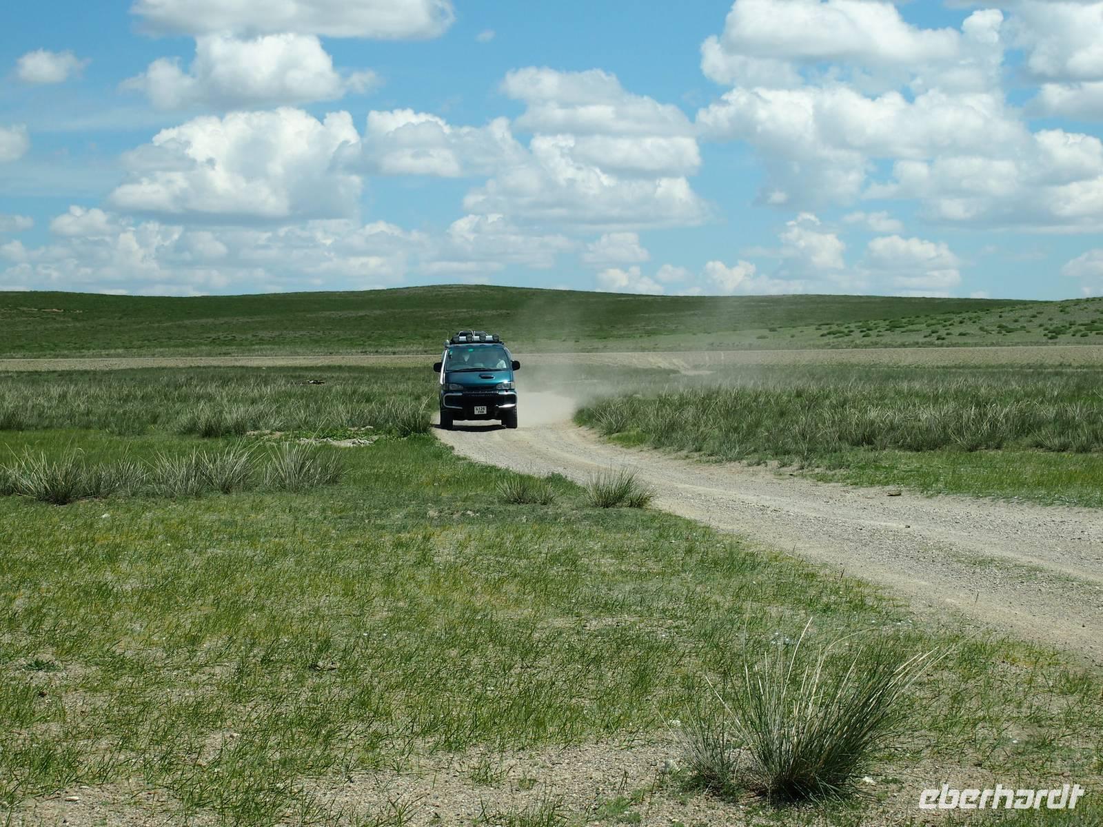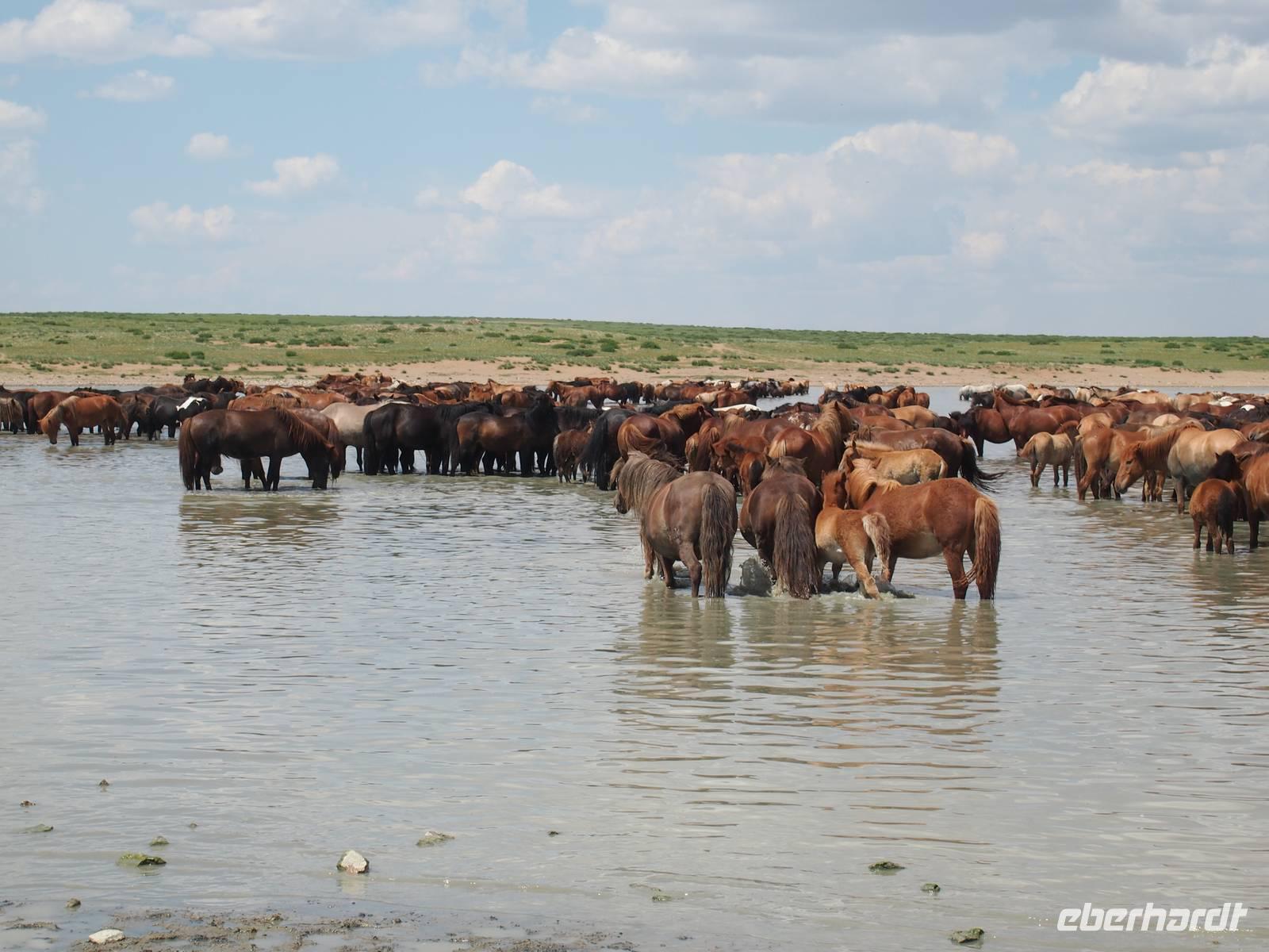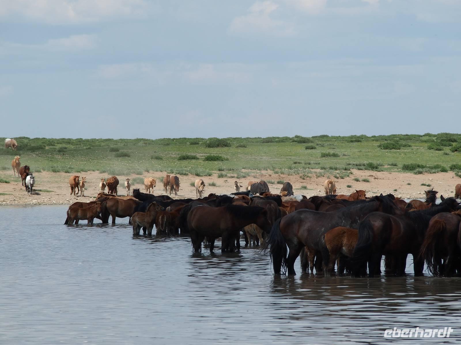 Nach dem Frühstück warteten vor unserem Hotel schon unsere drei Fahrer, Dinska, Tmbro und Suchey, sowie unsere Reiseleiterin Tsegi, die uns durch ihr wunderschönes Land führen sollten. Das Gepäck wurde auf die drei Kleinbusse schnell verteilt. Es ging noch einmal quer durch die Stadt, bis wir so langsam die Asphaltstraße verließen und Richtung Süden fuhren. Der Blick in die Ferne war mit den hügeligen Landschaften, den Wolkenformationen und der unendlichen Weite für uns alle sehr imposant. Weit und breit war keine Stadt und kein Auto zu sehen, geschweige denn Lärm zu hören. Als die Fahrer während einer Pause das Mittagessen für uns vorbereiteten, gingen viele von uns auf einen Hügel, um eine noch bessere Aussicht zu genießen. Zum Mittag wurde für uns ein kleiner Tisch mit Bänken aufgebaut. Nach der Stärkung ging es weiter zu unserem heutigen Tagesziel - unser erstes Jurten Camp. Auf dem Weg dorthin haben wir schon die ein oder andere Nomadenfamilie aus der Ferne gesehen, wobei vor allem auffallend war, dass vor den Gers Pferde angebunden waren. Tsegi erzählte uns, dass die Nomaden sich schon auf das Nadaam Fest vorbereiten und deshalb die Pferde schon eingetrieben haben. Auf dem Weg zu unserem Camp sind wir an einer größeren Wasserquelle vorbei gefahren, in der sich etwa 300 Pferde abkühlten. Dieser Anblick war natürlich Grund genug für uns anzuhalten und das Ereignis zu genießen. Die Geräusche und das Gefühl, wenn plötzlich mehrere Pferde losrennen, werden wir wohl nie vergessen. Kurz bevor wir weitergefahren sind, kamen noch mehr Pferde zu dem Gewässer. Es sah so aus, als hätte jedes Pferd seine eigene Gruppe zu dem es gehörte, dabei passten die Stuten besonders auf ihre Fohlen auf. Unser weiterer Reiseverlauf bot uns noch einige kleine Highlights. Beispielsweise sahen wir Mongolische Gazellen und Ziegen, die keine Angst vor Autos haben und Kraniche. Die Jurten im Camp wurden schnell bezogen und inspiziert. Einige nutzten die Zeit vor dem Abendbrot für einen kleinen Spaziergang oder genossen die Aussicht vom Camp in die Ferne.