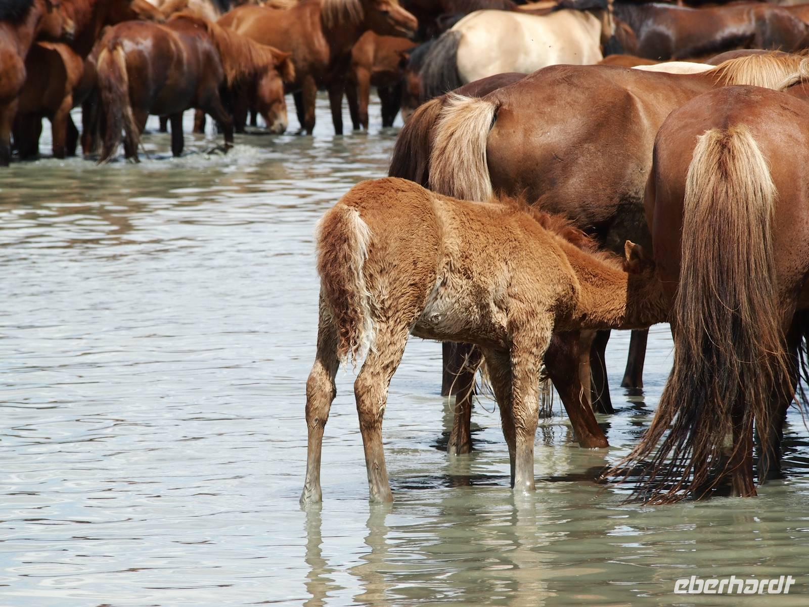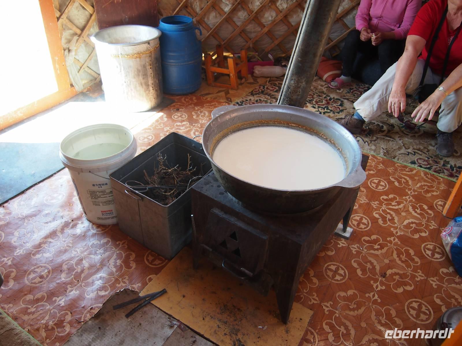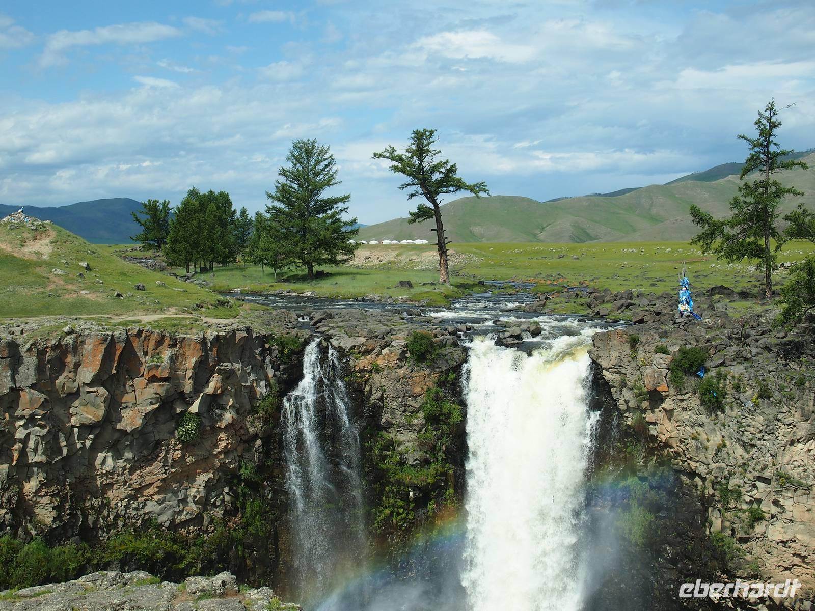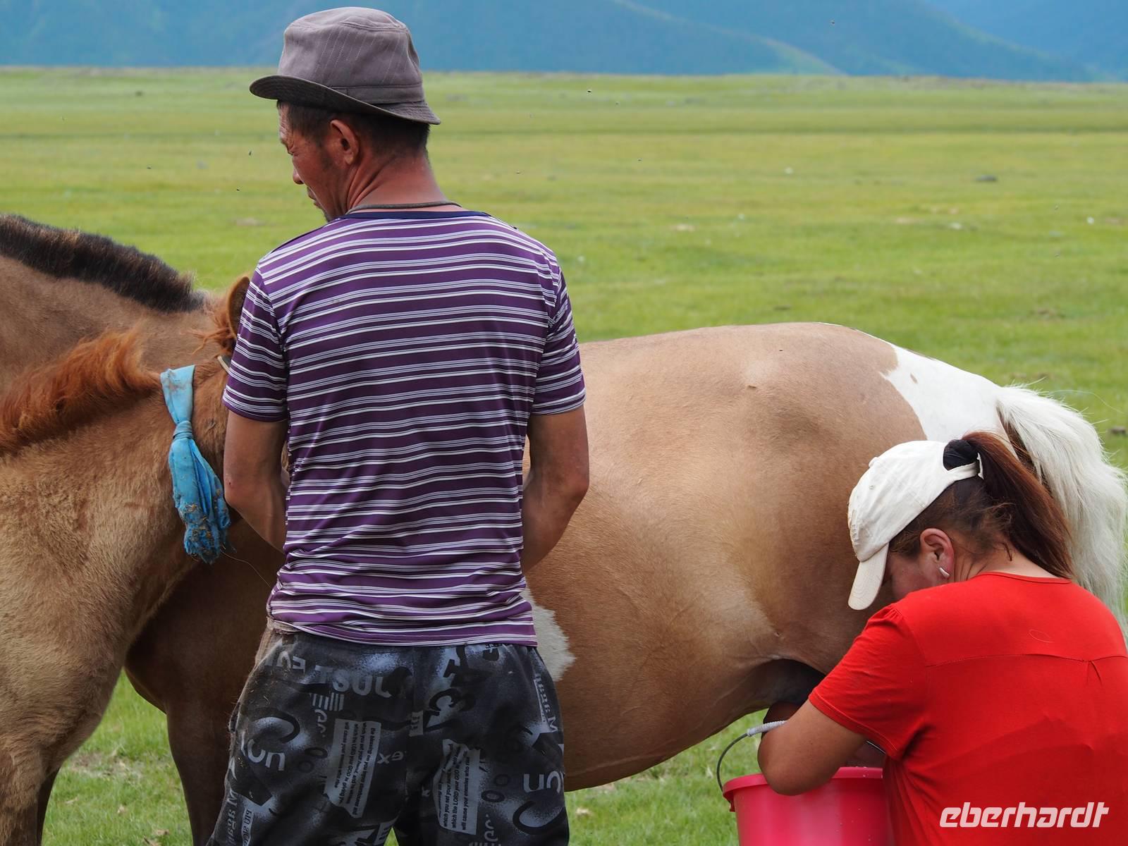 Weiter ging es zu einem 20 Meter tiefen Wasserfall, der in einer malerischen Landschaft lag. Endlich haben wir auch wieder ein paar Bäume sehen können, denn zahlreiche Tannen begleiteten unseren heutigen Weg. Auf dem sehr abenteuerlichen Weg zu unserem nächsten Camp hatten wir auch die Gelegenheit bei einer Nomadenfamilie zu halten, die gerade dabei war Pferde zu melken. So ließen wir es uns nicht nehmen auch hier einen kurzen Stopp einzulegen. Die Familie freute sich sehr über unseren spontanen Besuch und bewirtete uns mit frischer Stutenmilch, Airag, selbstgemachter Quark, Rahmen und Schnaps. Ganz nebenbei wurde uns die halbe Familie vorgestellt und die Ger fühlte sich von Minute zu Minute mehr.