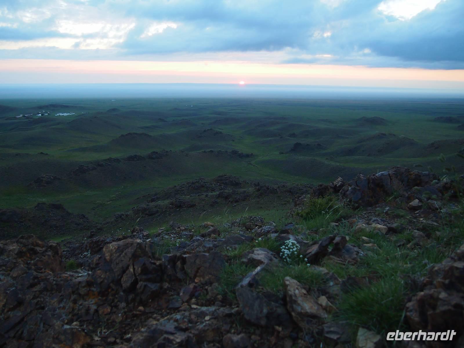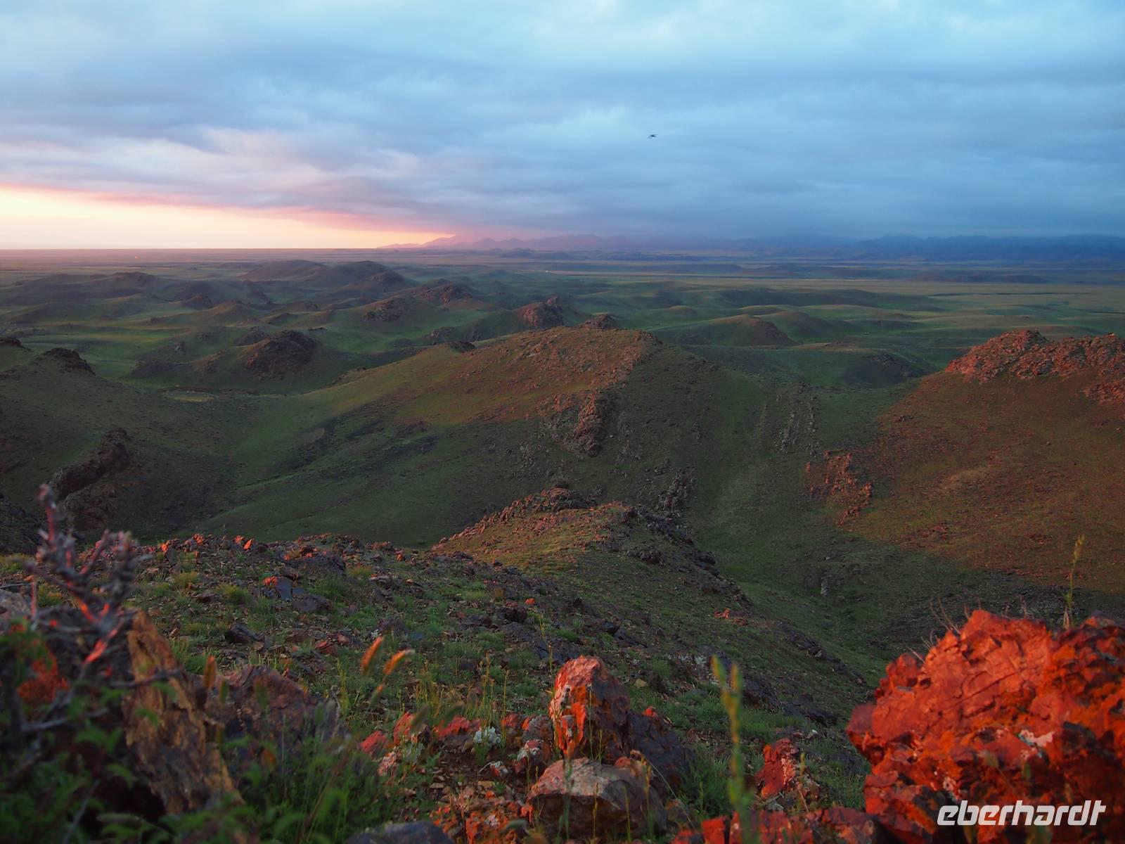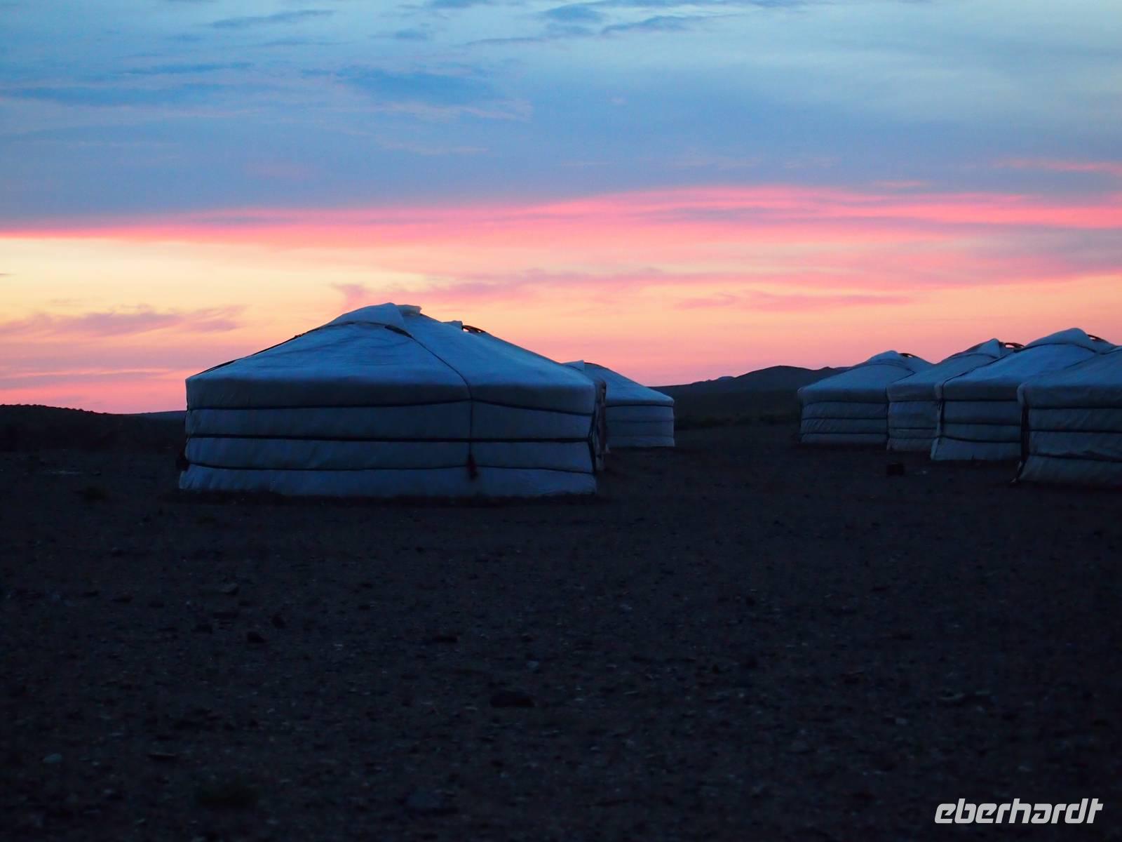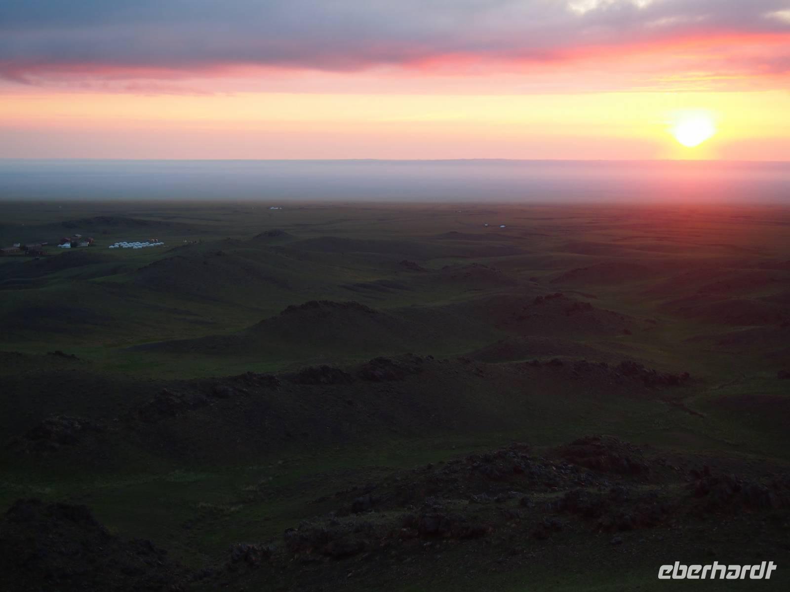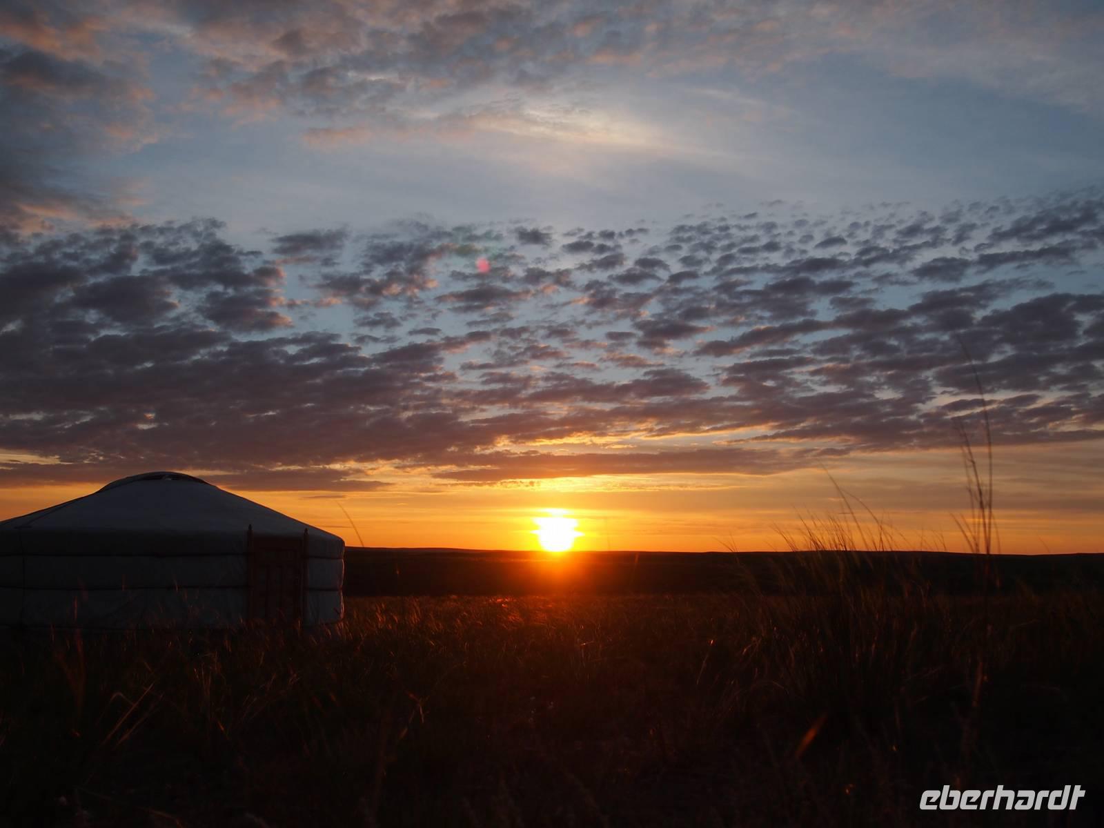 Viele von uns haben sich heute entschieden, den Sonnenaufgang zu beobachten. Da wir uns nicht sicher waren, wann die Sonne genau über dem Horizont zu sehen ist, sind wir doch etwas früher als nötig aufgestanden. Dafür wurden wir vorab schon mit einer wunderschönen Morgenröte entschädigt. Um halb 6 wurden wir für unser Warten mit einem atemberaubenden Sonnenaufgang belohnt. Nach dem Frühstück haben wir das Camp verlassen und fuhren weiter Richtung Süden. Wir haben auf dem Weg mehrere Fotostopps eingelegt und konnten heute uns endlich von den schönen Blumenwiesen der Mongolei überzeugen. Den Fotografen in unserer Gruppe ließ es das Herz höher schlagen und so verstrich einige Zeit beim fotografieren. Einen Stopp legten wir auch im „Land der kleinen Steine" ein. Hierbei handelt es sich um eine ehemalige Klosteranlage aus dem 17.-18. Jahrhundert. Von dem Kloster war nur noch wenig zu erahnen, umso faszinierender war, wie sich die Natur das Stück Land zurückgeholt hat. Den Geruch von frischen Kräutern werden wir wohl in Zukunft immer mit diesem idyllischen Ort in Verbindung bringen.