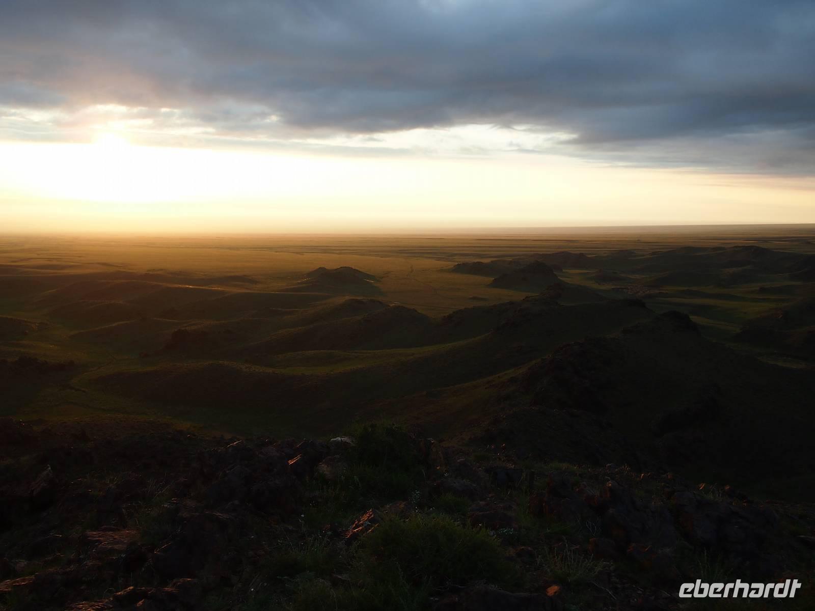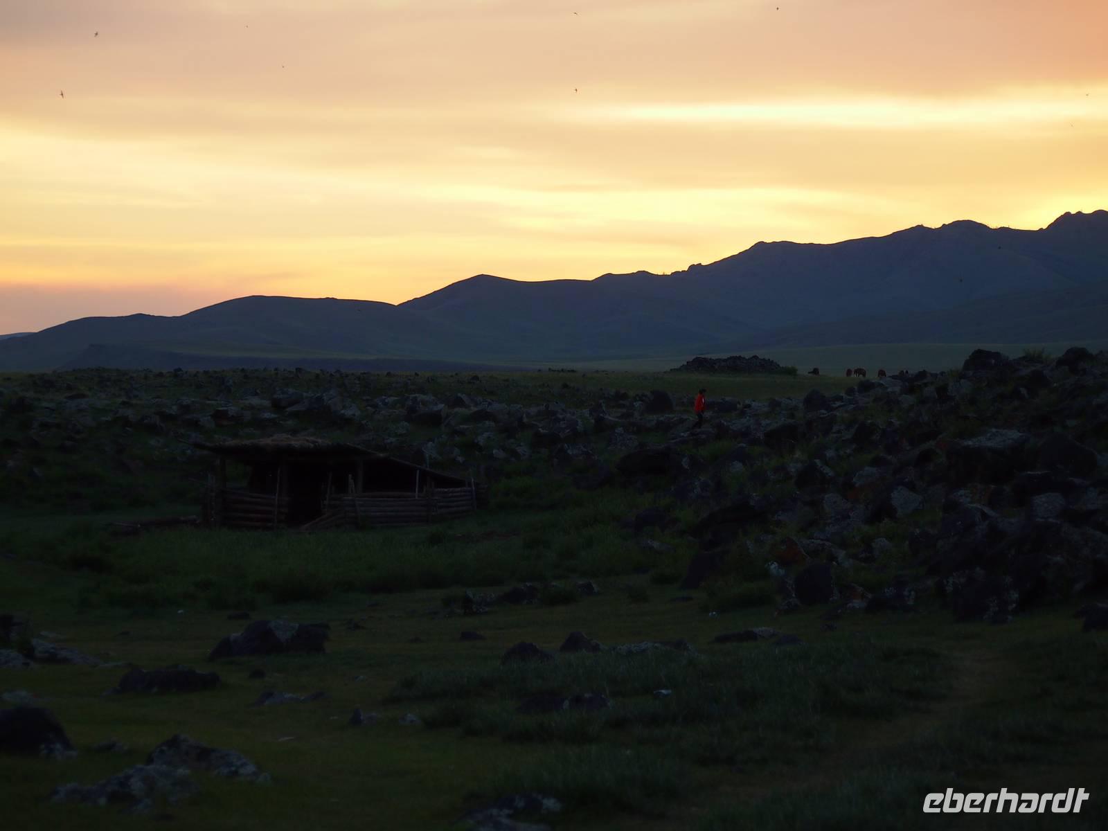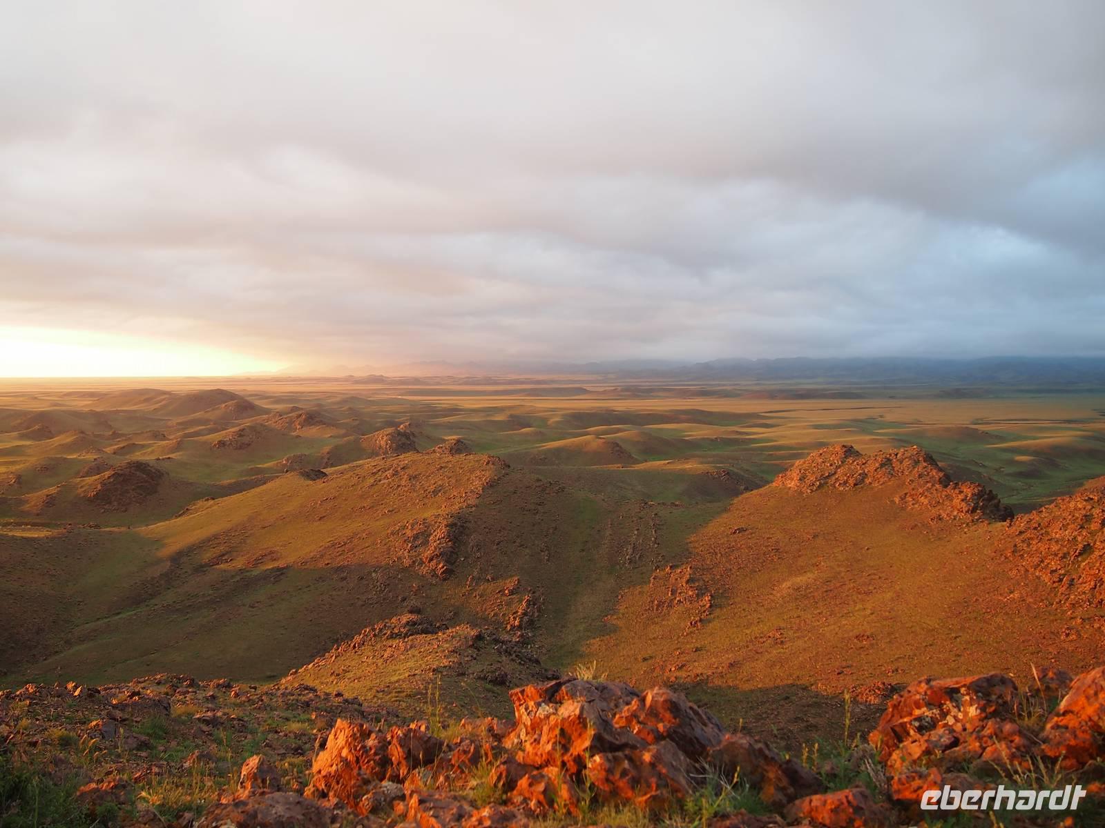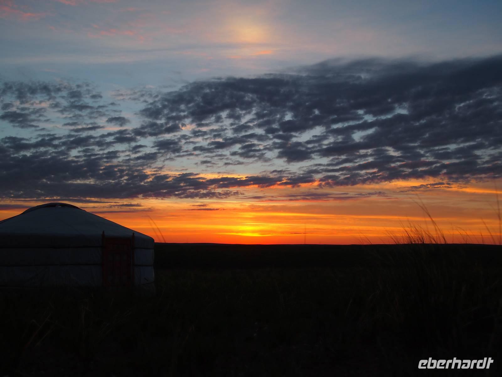 Viele von uns haben sich heute entschieden, den Sonnenaufgang zu beobachten. Da wir uns nicht sicher waren, wann die Sonne genau über dem Horizont zu sehen ist, sind wir doch etwas früher als nötig aufgestanden. Dafür wurden wir vorab schon mit einer wunderschönen Morgenröte entschädigt. Um halb 6 wurden wir für unser Warten mit einem atemberaubenden Sonnenaufgang belohnt. Nach dem Frühstück haben wir das Camp verlassen und fuhren weiter Richtung Süden. Wir haben auf dem Weg mehrere Fotostopps eingelegt und konnten heute uns endlich von den schönen Blumenwiesen der Mongolei überzeugen. Den Fotografen in unserer Gruppe ließ es das Herz höher schlagen und so verstrich einige Zeit beim fotografieren. Einen Stopp legten wir auch im „Land der kleinen Steine" ein. Hierbei handelt es sich um eine ehemalige Klosteranlage aus dem 17.-18. Jahrhundert. Von dem Kloster war nur noch wenig zu erahnen, umso faszinierender war, wie sich die Natur das Stück Land zurückgeholt hat. Den Geruch von frischen Kräutern werden wir wohl in Zukunft immer mit diesem idyllischen Ort in Verbindung bringen.
