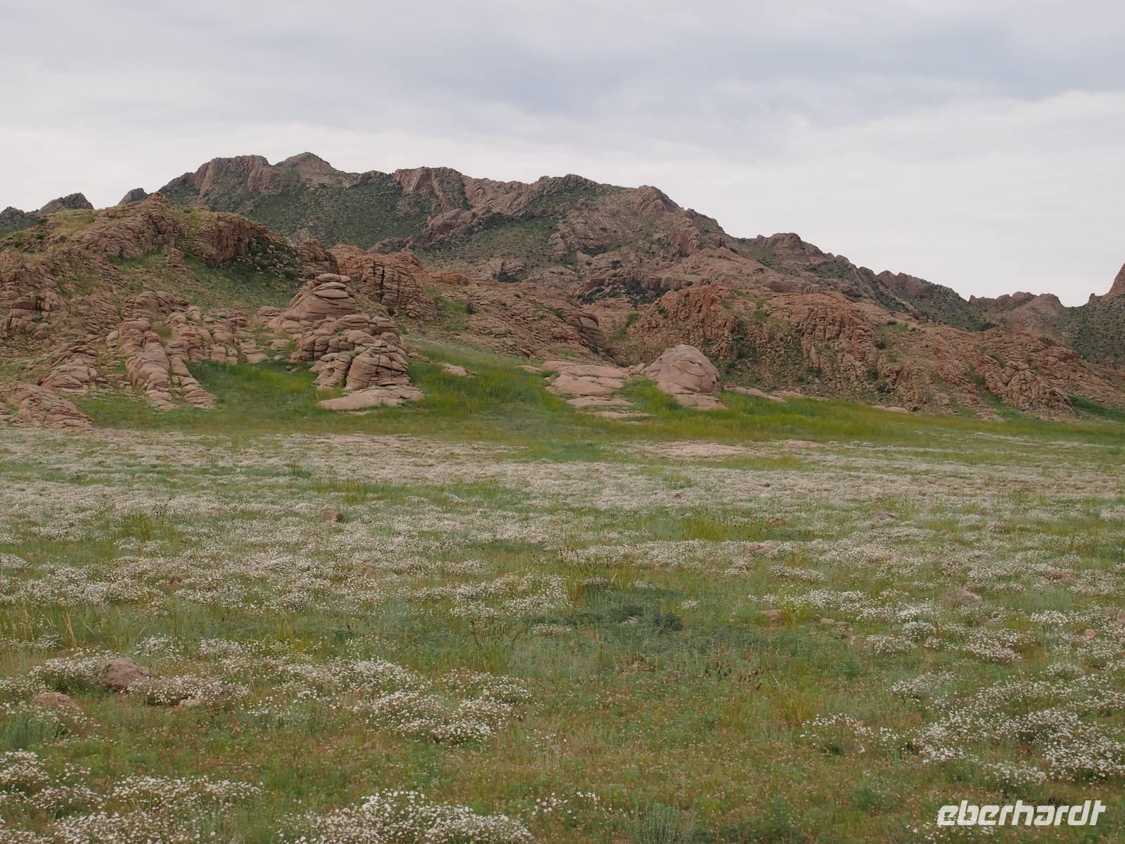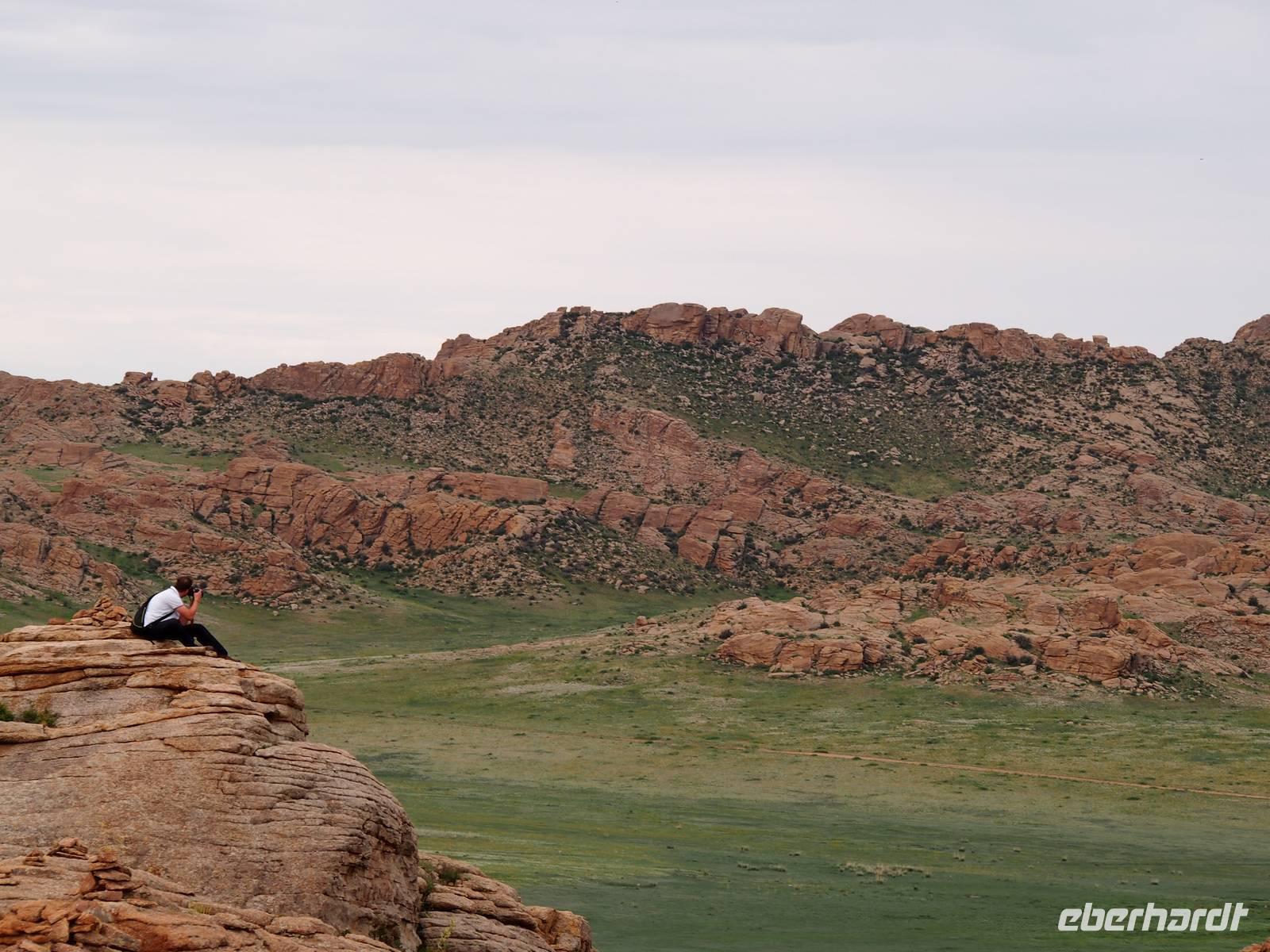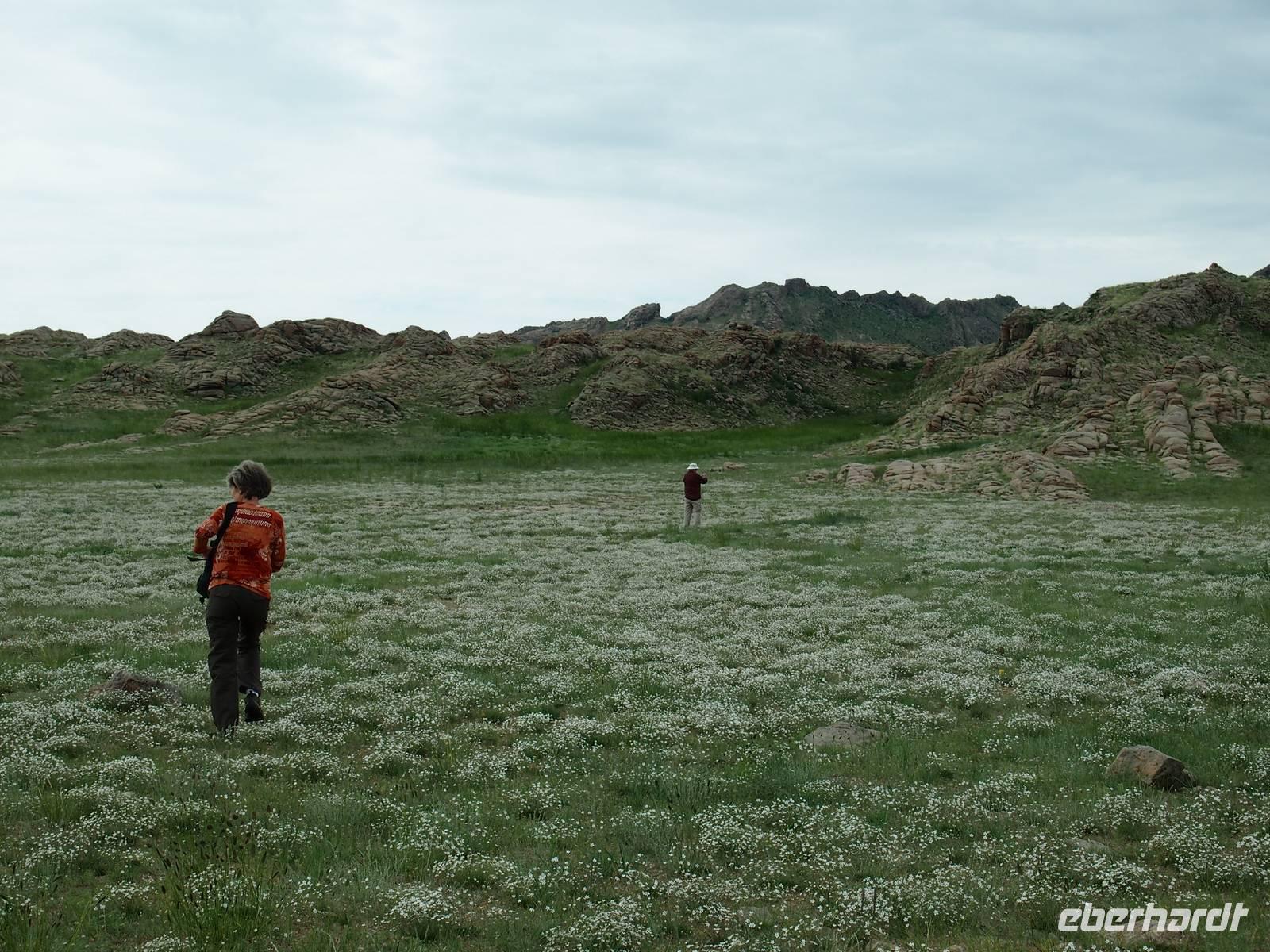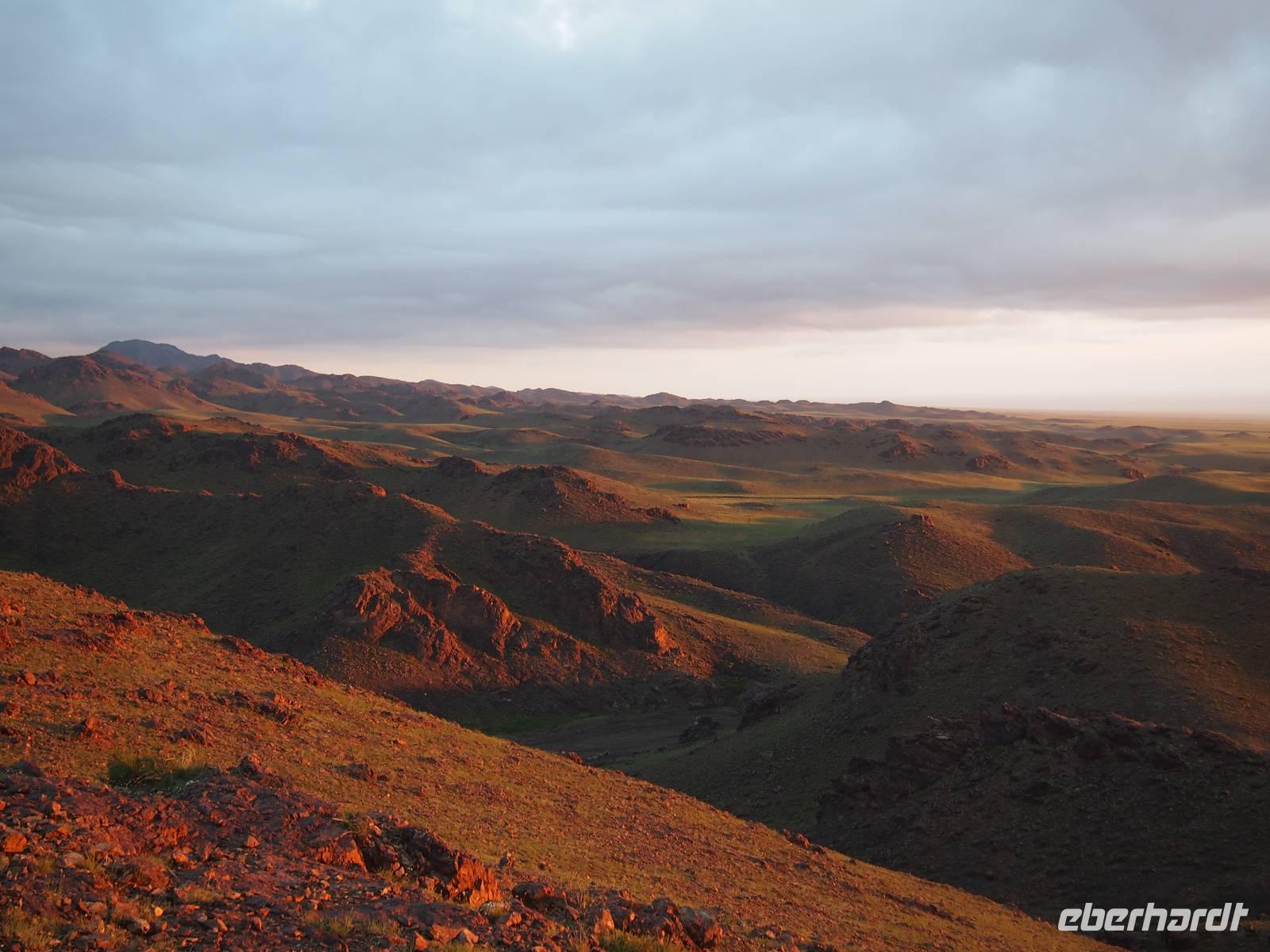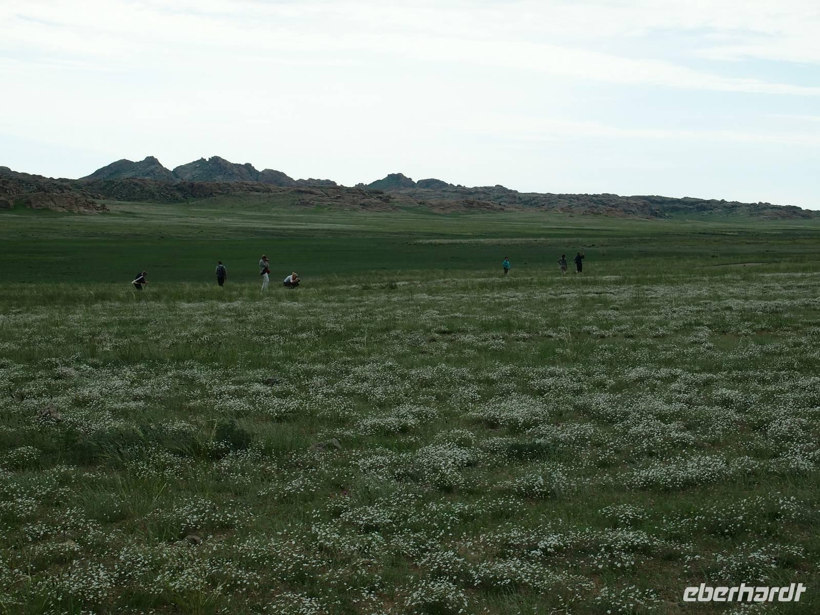 Viele von uns haben sich heute entschieden, den Sonnenaufgang zu beobachten. Da wir uns nicht sicher waren, wann die Sonne genau über dem Horizont zu sehen ist, sind wir doch etwas früher als nötig aufgestanden. Dafür wurden wir vorab schon mit einer wunderschönen Morgenröte entschädigt. Um halb 6 wurden wir für unser Warten mit einem atemberaubenden Sonnenaufgang belohnt. Nach dem Frühstück haben wir das Camp verlassen und fuhren weiter Richtung Süden. Wir haben auf dem Weg mehrere Fotostopps eingelegt und konnten heute uns endlich von den schönen Blumenwiesen der Mongolei überzeugen. Den Fotografen in unserer Gruppe ließ es das Herz höher schlagen und so verstrich einige Zeit beim fotografieren. Einen Stopp legten wir auch im „Land der kleinen Steine" ein. Hierbei handelt es sich um eine ehemalige Klosteranlage aus dem 17.-18. Jahrhundert. Von dem Kloster war nur noch wenig zu erahnen, umso faszinierender war, wie sich die Natur das Stück Land zurückgeholt hat. Den Geruch von frischen Kräutern werden wir wohl in Zukunft immer mit diesem idyllischen Ort in Verbindung bringen.