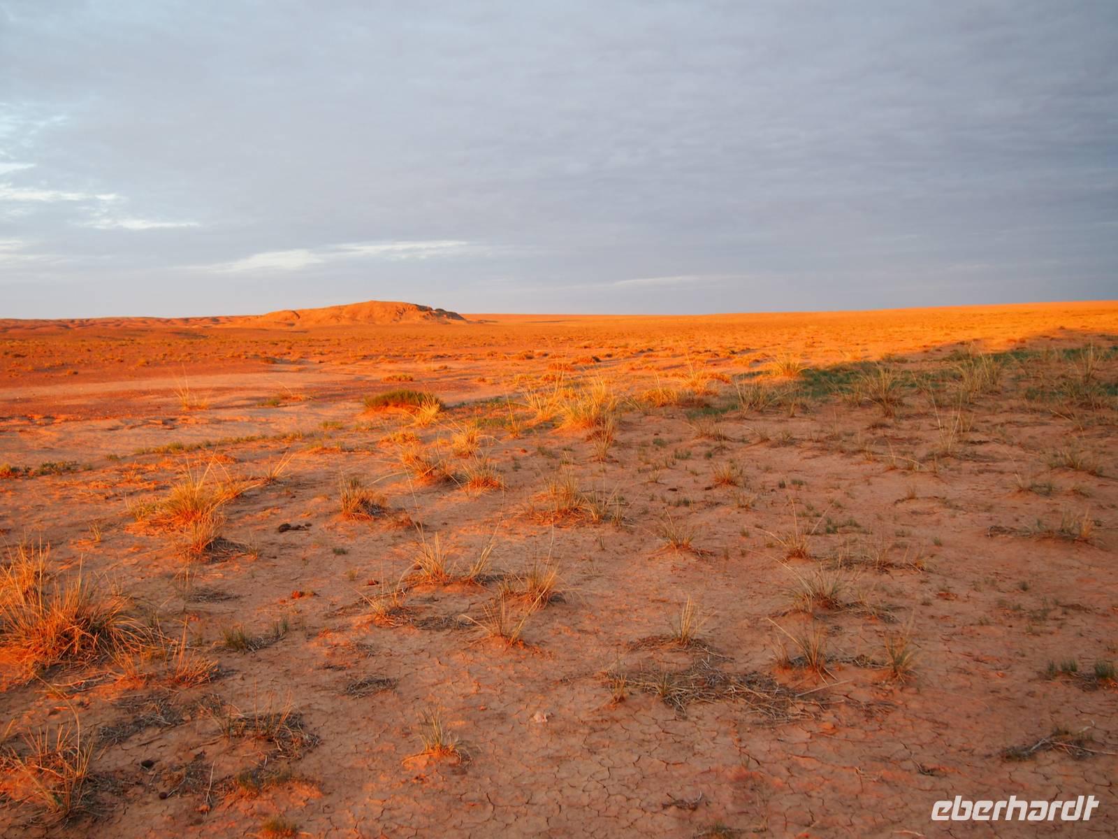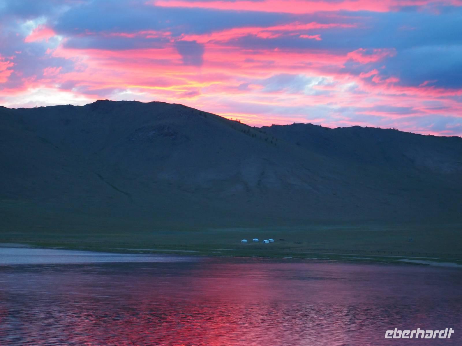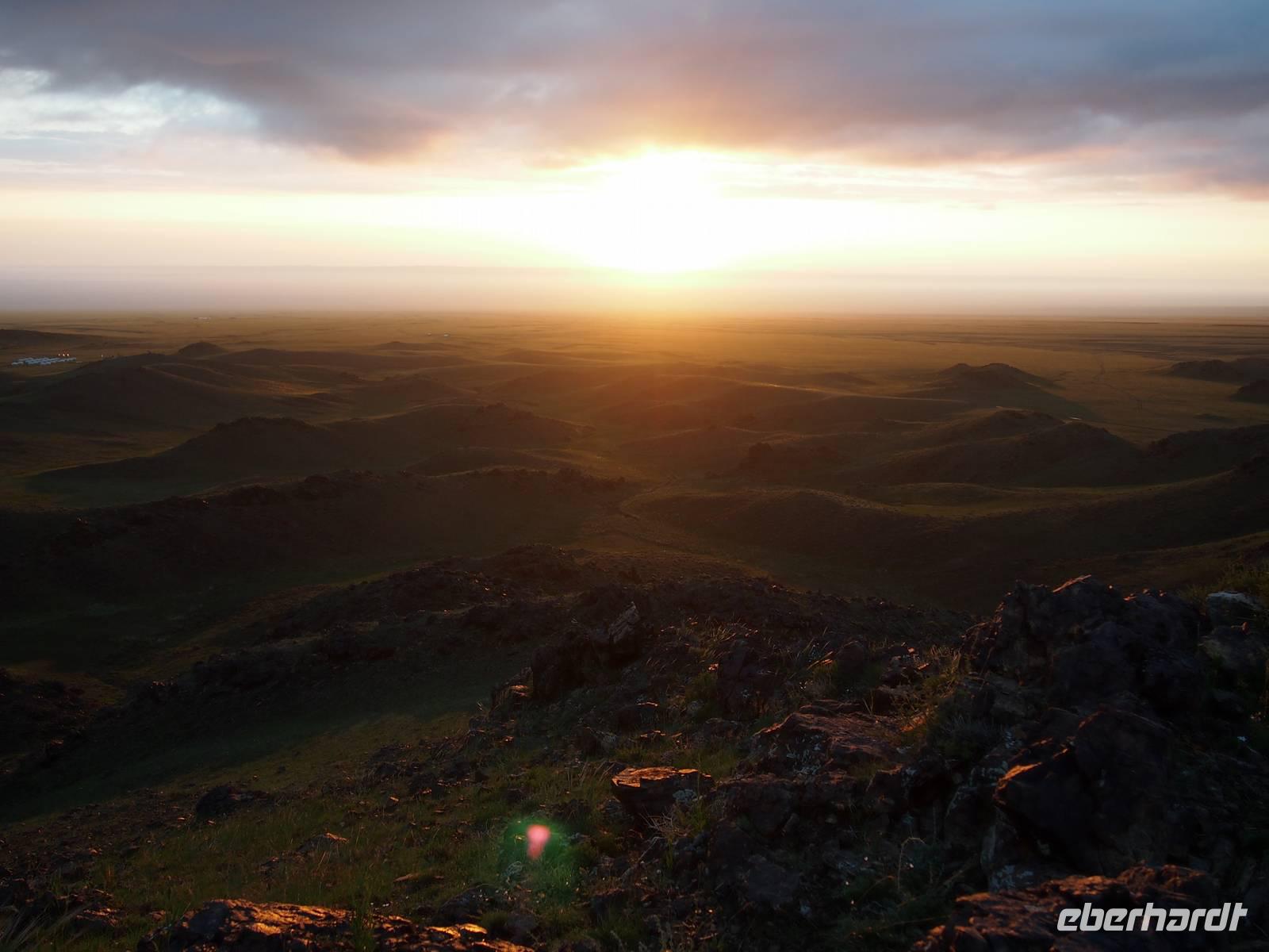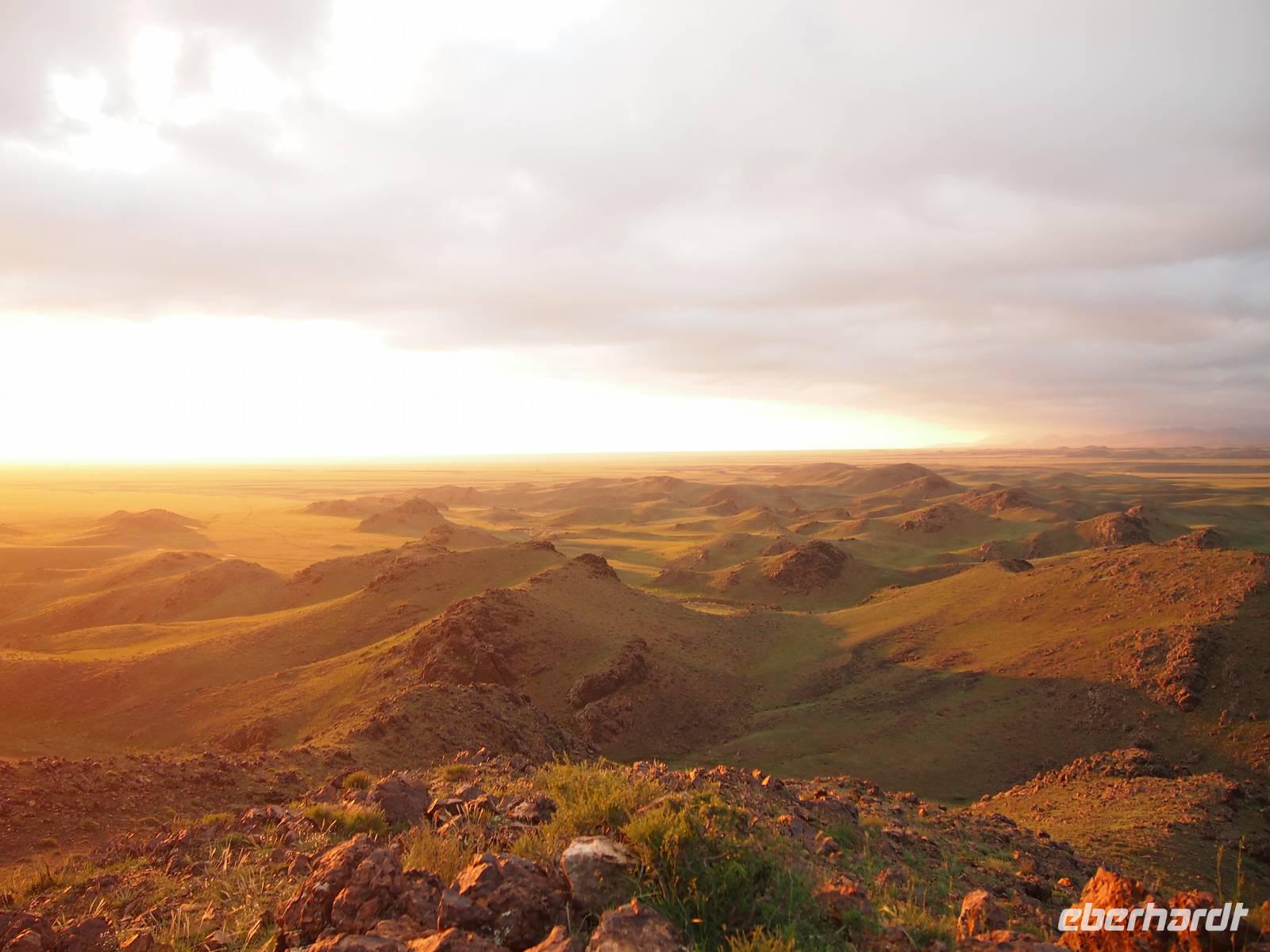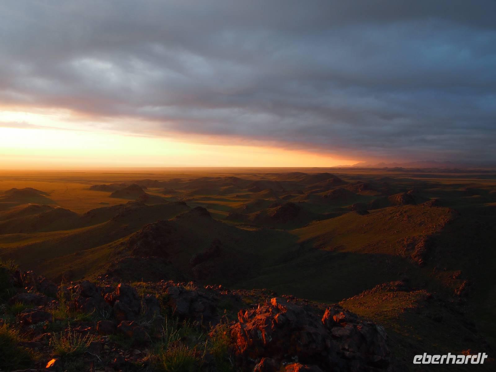 Viele von uns haben sich heute entschieden, den Sonnenaufgang zu beobachten. Da wir uns nicht sicher waren, wann die Sonne genau über dem Horizont zu sehen ist, sind wir doch etwas früher als nötig aufgestanden. Dafür wurden wir vorab schon mit einer wunderschönen Morgenröte entschädigt. Um halb 6 wurden wir für unser Warten mit einem atemberaubenden Sonnenaufgang belohnt. Nach dem Frühstück haben wir das Camp verlassen und fuhren weiter Richtung Süden. Wir haben auf dem Weg mehrere Fotostopps eingelegt und konnten heute uns endlich von den schönen Blumenwiesen der Mongolei überzeugen. Den Fotografen in unserer Gruppe ließ es das Herz höher schlagen und so verstrich einige Zeit beim fotografieren. Einen Stopp legten wir auch im „Land der kleinen Steine" ein. Hierbei handelt es sich um eine ehemalige Klosteranlage aus dem 17.-18. Jahrhundert. Von dem Kloster war nur noch wenig zu erahnen, umso faszinierender war, wie sich die Natur das Stück Land zurückgeholt hat. Den Geruch von frischen Kräutern werden wir wohl in Zukunft immer mit diesem idyllischen Ort in Verbindung bringen.
