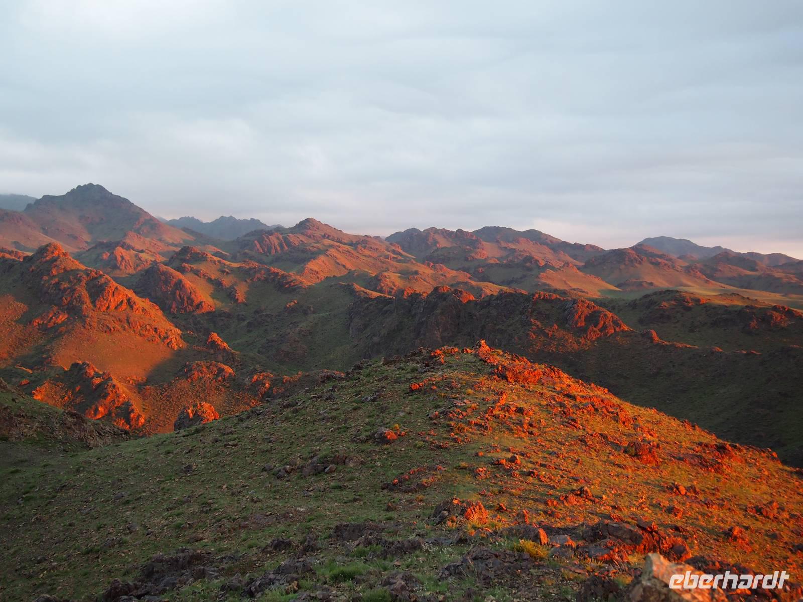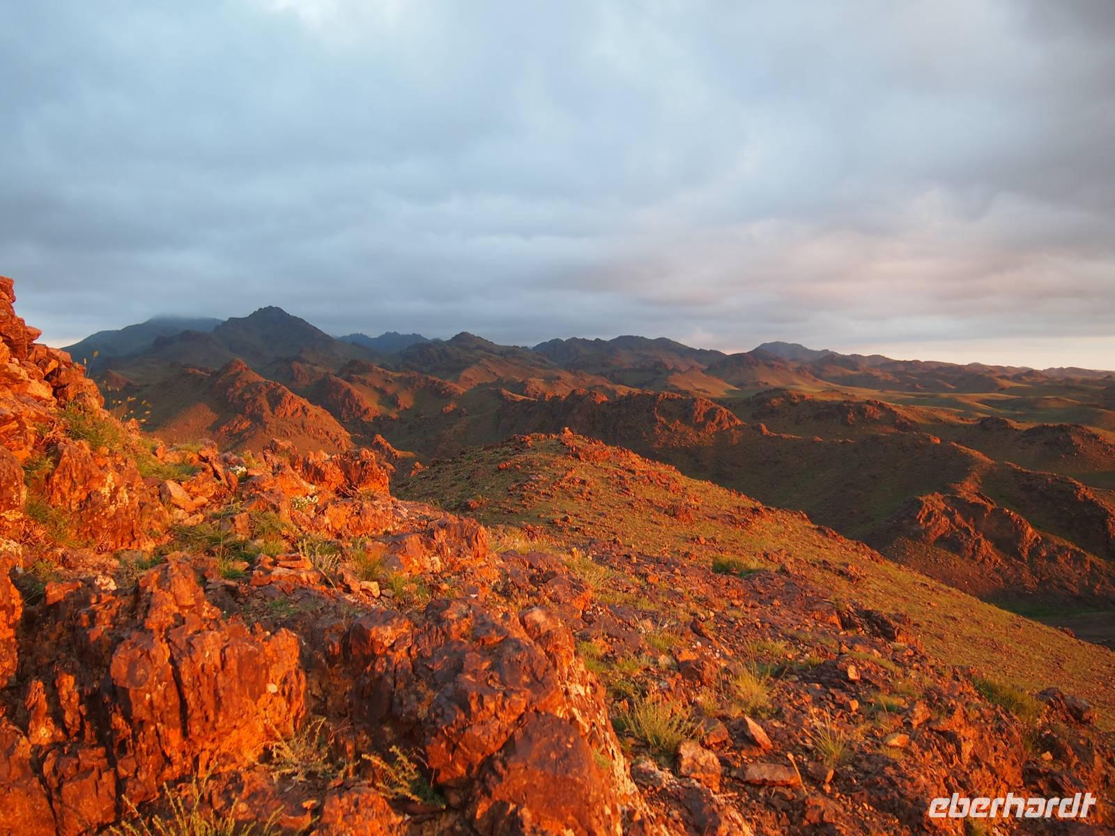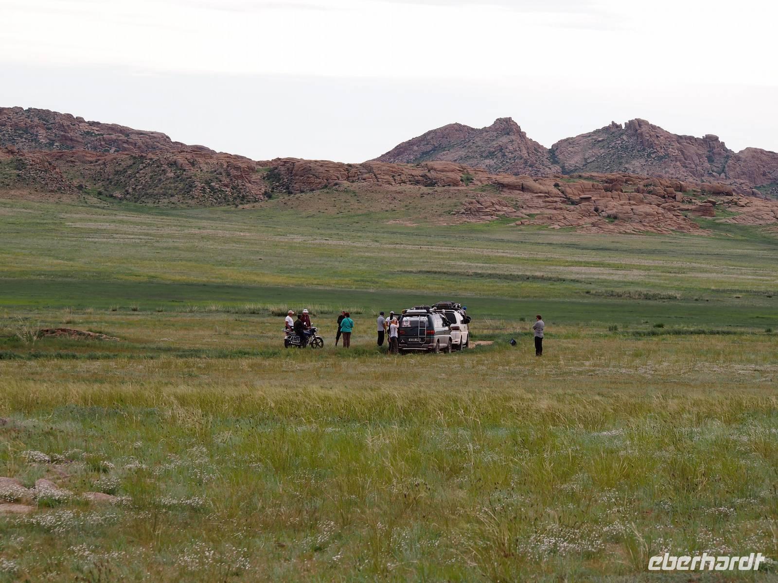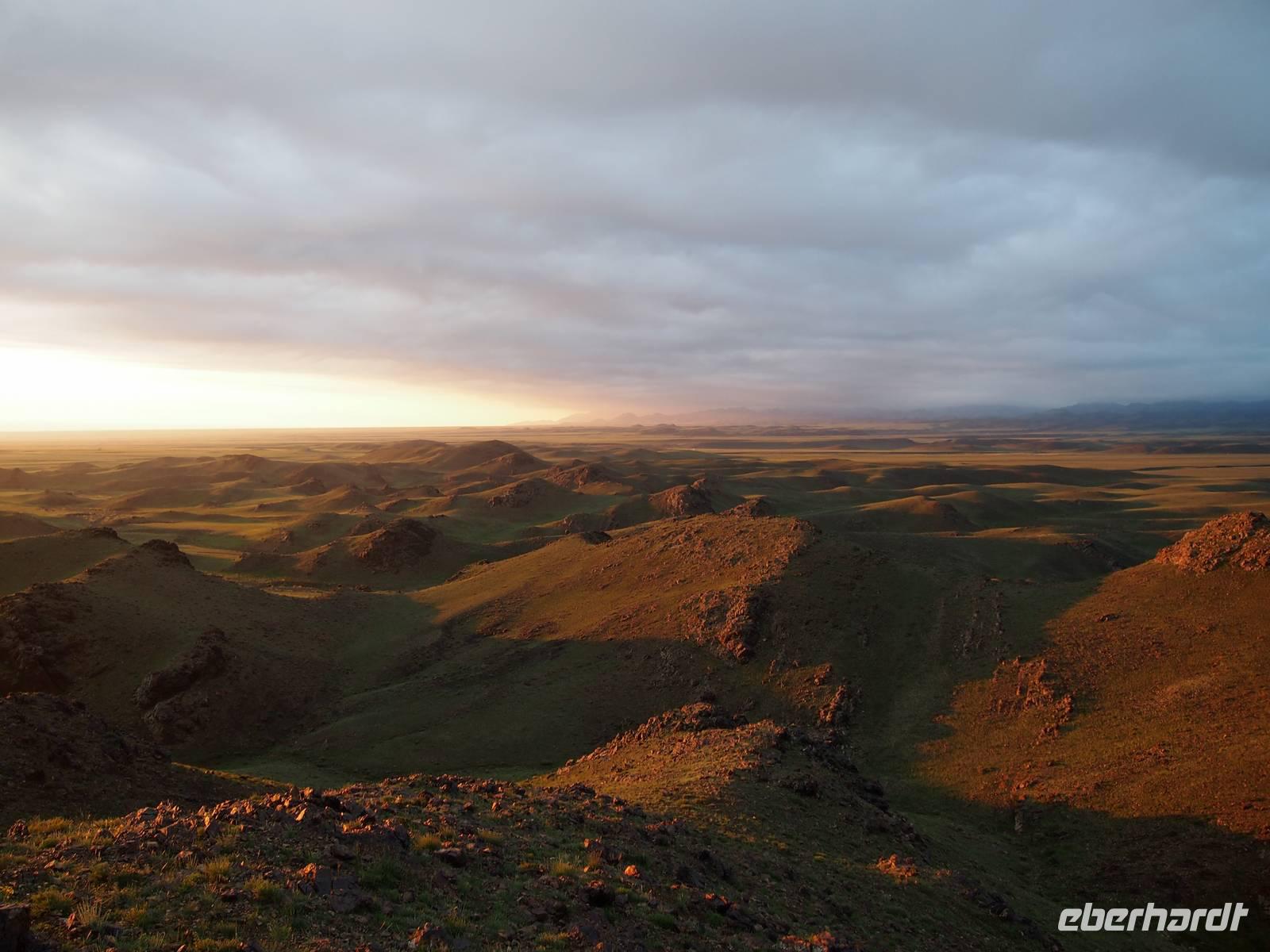 Viele von uns haben sich heute entschieden, den Sonnenaufgang zu beobachten. Da wir uns nicht sicher waren, wann die Sonne genau über dem Horizont zu sehen ist, sind wir doch etwas früher als nötig aufgestanden. Dafür wurden wir vorab schon mit einer wunderschönen Morgenröte entschädigt. Um halb 6 wurden wir für unser Warten mit einem atemberaubenden Sonnenaufgang belohnt. Nach dem Frühstück haben wir das Camp verlassen und fuhren weiter Richtung Süden. Wir haben auf dem Weg mehrere Fotostopps eingelegt und konnten heute uns endlich von den schönen Blumenwiesen der Mongolei überzeugen. Den Fotografen in unserer Gruppe ließ es das Herz höher schlagen und so verstrich einige Zeit beim fotografieren. Einen Stopp legten wir auch im „Land der kleinen Steine" ein. Hierbei handelt es sich um eine ehemalige Klosteranlage aus dem 17.-18. Jahrhundert. Von dem Kloster war nur noch wenig zu erahnen, umso faszinierender war, wie sich die Natur das Stück Land zurückgeholt hat. Den Geruch von frischen Kräutern werden wir wohl in Zukunft immer mit diesem idyllischen Ort in Verbindung bringen.