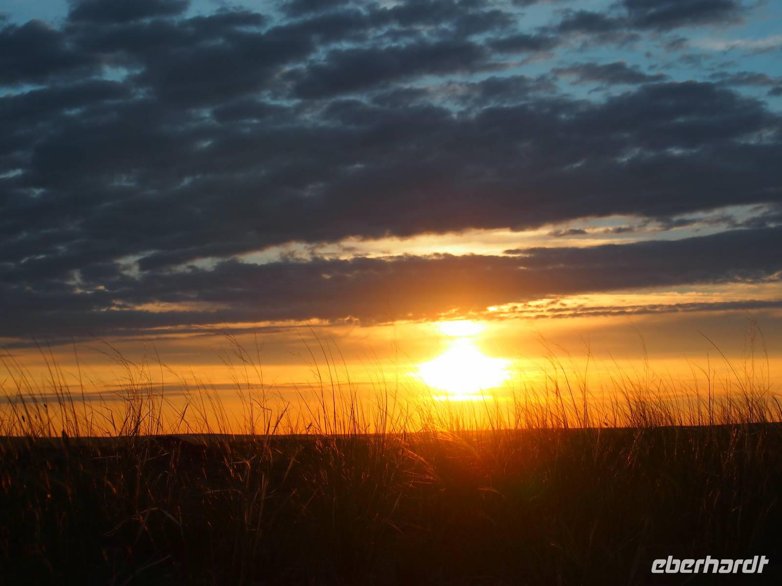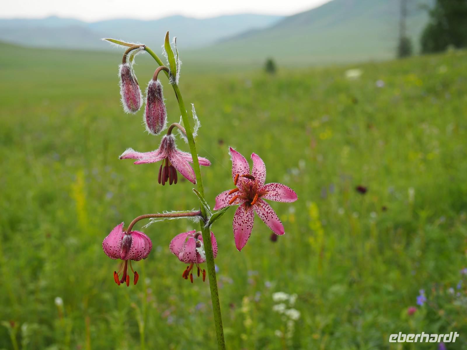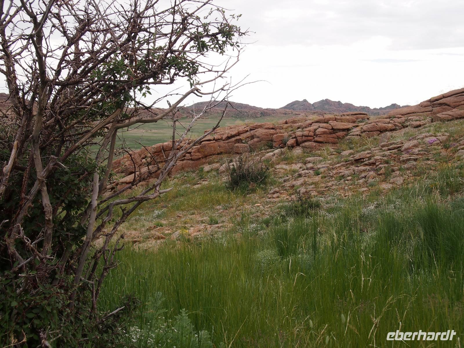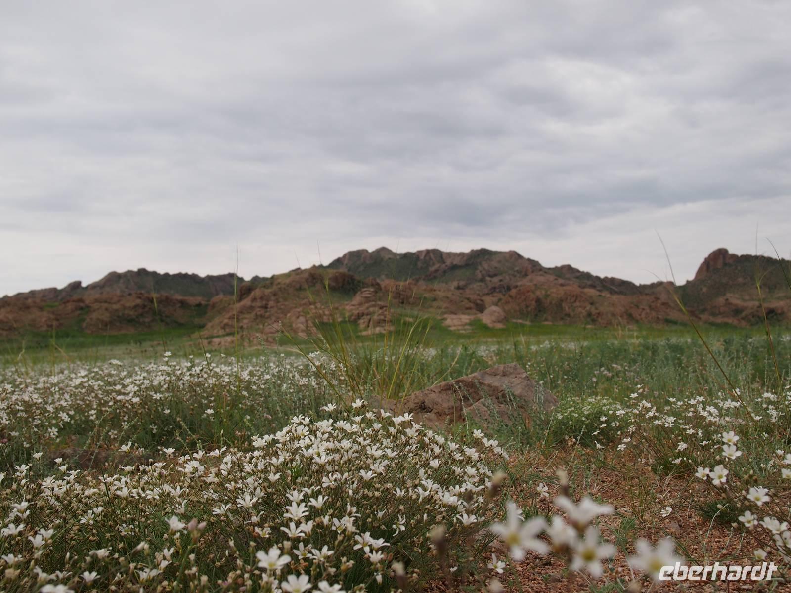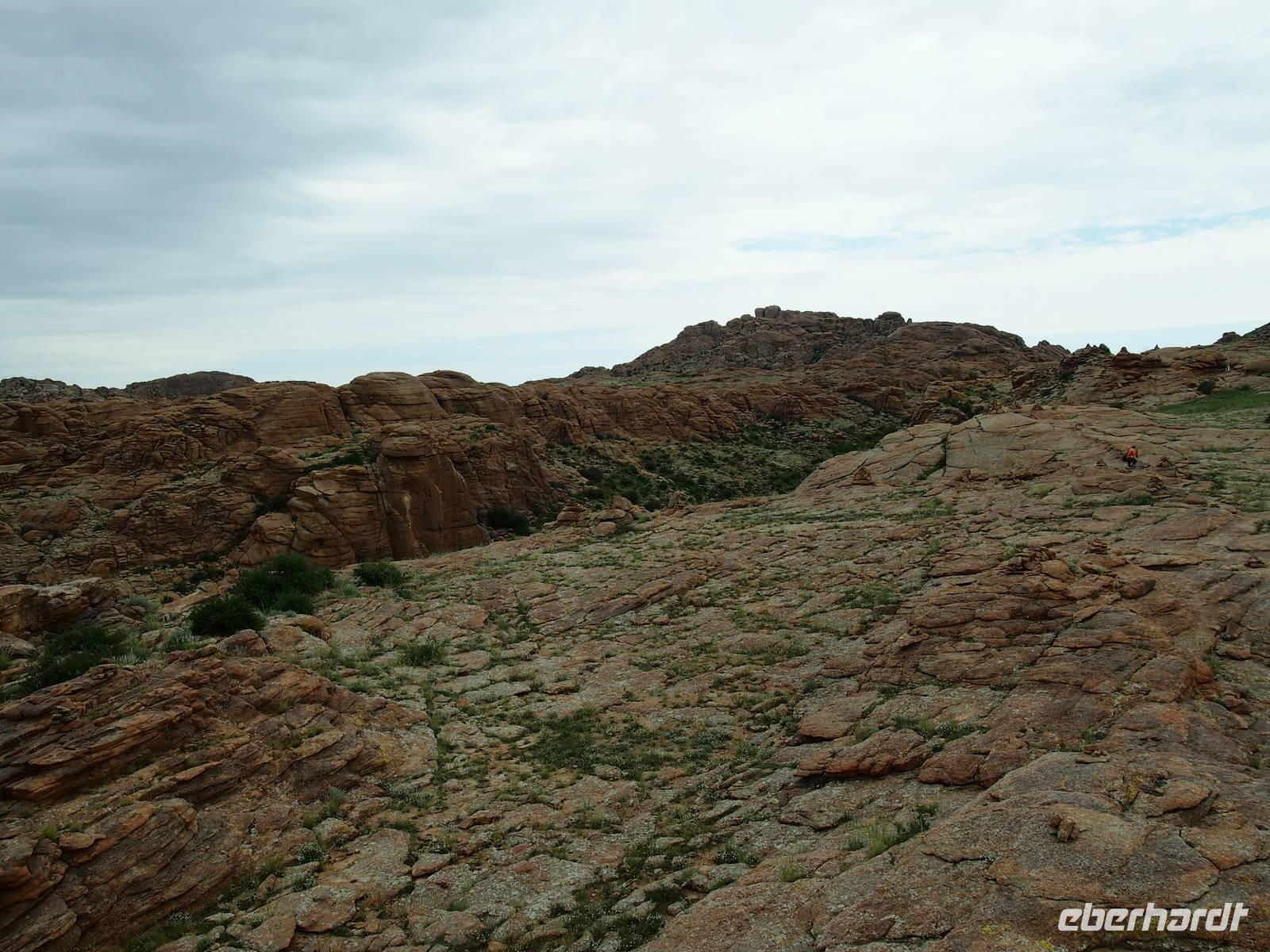 Viele von uns haben sich heute entschieden, den Sonnenaufgang zu beobachten. Da wir uns nicht sicher waren, wann die Sonne genau über dem Horizont zu sehen ist, sind wir doch etwas früher als nötig aufgestanden. Dafür wurden wir vorab schon mit einer wunderschönen Morgenröte entschädigt. Um halb 6 wurden wir für unser Warten mit einem atemberaubenden Sonnenaufgang belohnt. Nach dem Frühstück haben wir das Camp verlassen und fuhren weiter Richtung Süden. Wir haben auf dem Weg mehrere Fotostopps eingelegt und konnten heute uns endlich von den schönen Blumenwiesen der Mongolei überzeugen. Den Fotografen in unserer Gruppe ließ es das Herz höher schlagen und so verstrich einige Zeit beim fotografieren. Einen Stopp legten wir auch im „Land der kleinen Steine" ein. Hierbei handelt es sich um eine ehemalige Klosteranlage aus dem 17.-18. Jahrhundert. Von dem Kloster war nur noch wenig zu erahnen, umso faszinierender war, wie sich die Natur das Stück Land zurückgeholt hat. Den Geruch von frischen Kräutern werden wir wohl in Zukunft immer mit diesem idyllischen Ort in Verbindung bringen.