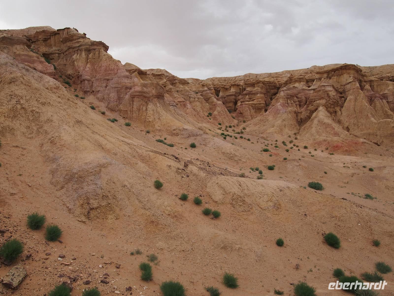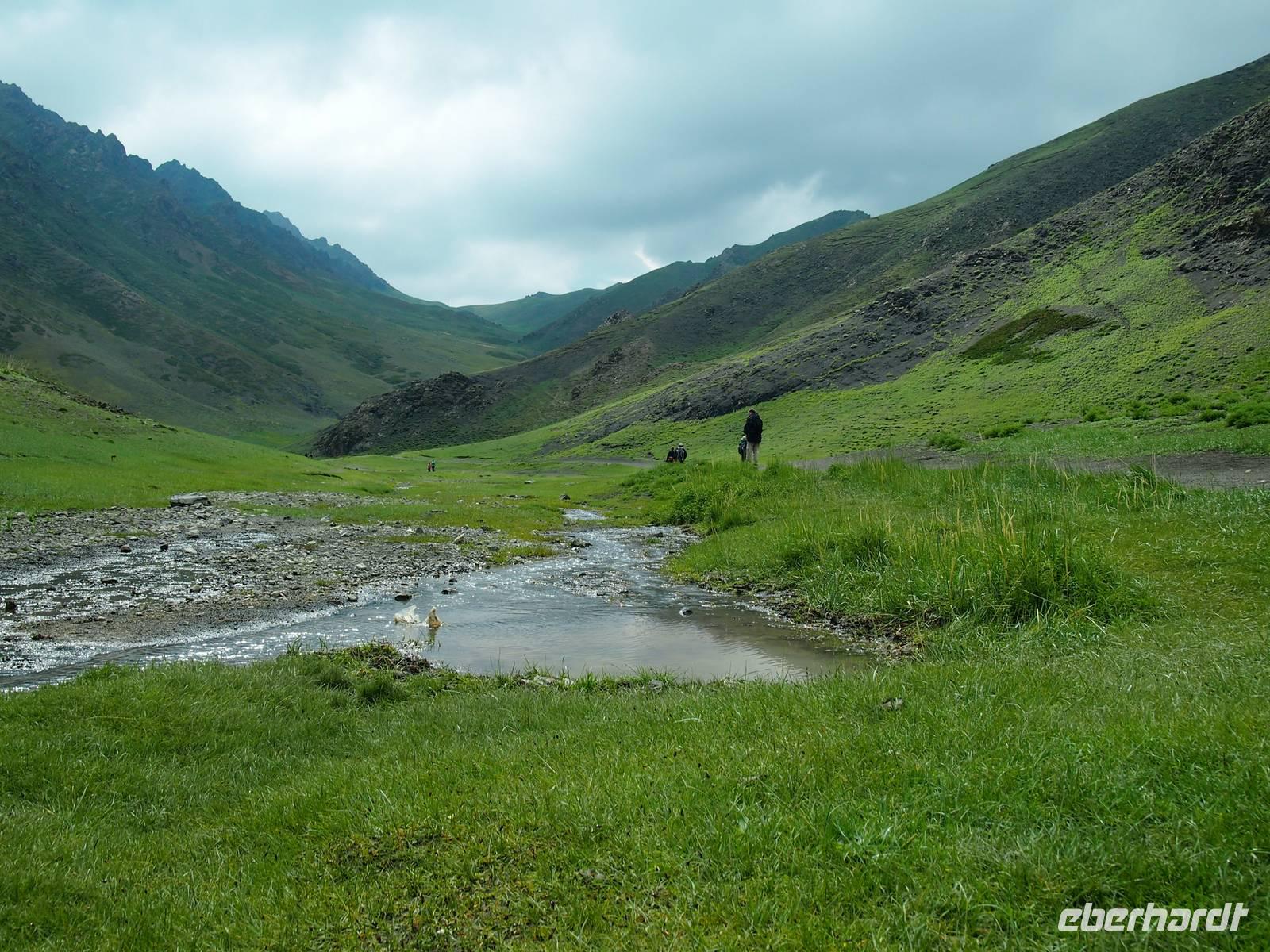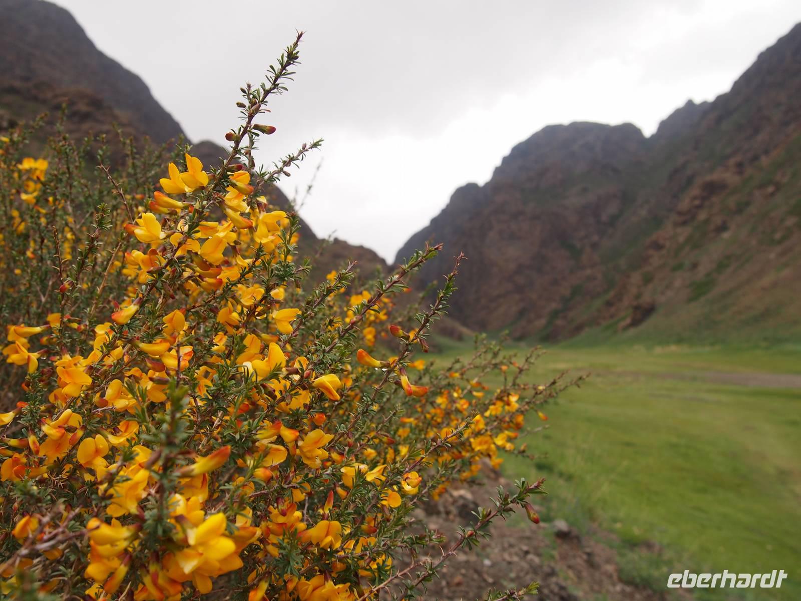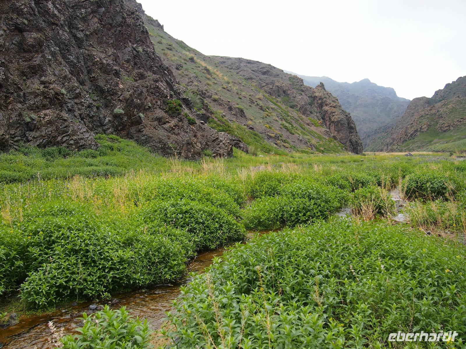 Heute konnten wir mal „ausschlafen", eine halbe Stunde länger als sonst. Nach dem Frühstück fuhren wir mit den Jeeps zur "Geierschlucht". Der Weg dorthin führte uns vorbei an ganz vielen Mäusen, die aussahen wie größere Hamster. Wir hatten redlich Spaß daran die kleinen Tiere zu beobachten, wie sie sich gegenseitig jagten und rumtollten. Das Wetter spielte auch so gut es ging mit, zu mindestens blieben wir trocken. Dadurch dass sich die Wolken in den Bergen festhingen, hatte die Schlucht einen ganz eigenen mystischen Charme. Anfangs war der Weg recht einfach und breit, aber je weiter man in die Schlucht kam, umso beschwerlicher wurde er. Der schwierigste Teil bestand aus einer etwa 500 Meter langen Gletschereisschicht, die wir nur mit gegenseitiger Hilfe bewältigen konnten. Auf der anderen Seite angekommen, führte der Weg uns weiter durch die atemberaubende Schlucht. Irgendwann wurde der Weg etwas breiter und man stieß auf eine wunderbare Flora und Fauna. Die Farben, das Nasse und die tiefhängenden Wolken machten diese Wanderung zu einem einmaligen und packenden Erlebnis. Für den Rückweg nahmen wir uns etwas Erde mit, um das Eis heil überwinden zu können. Einige Gäste brachen die Wanderung schon eher ab und entschieden sich für einen anderen Weg, auf dem man ebenfalls die Möglichkeit hatte verschiedene Schluchten zu durchwandern. Dabei hatten sie sogar das Glück, einen Uhu beobachten zu können. Geschafft und zufrieden besuchten wir das dazugehörige Museum des Nationalparks, bevor wir zum Mittagessen zum Camp zurück gefahren sind. Nach dem Essen besuchten wir heute auch noch eine Nomadenfamilie. Wir hörten gespannt zu und stellten der Hausherrin unsere Fragen. Bewirtet wurden wir mit getrocknetem Quark und selbstgemachten Joghurt. Natürlich war die Nomadenfrau auch neugierig auf uns und stellte einige Fragen. Ungewöhnlich war, dass die Familie drei Jurten besitzt, eine Schlafjurte, eine Jurte für die Küche und eine Gastjurte. Insgesamt besitzt die Familie außerdem noch 250 Schafe und Ziegen und drei Pferde. Die Frau braucht etwas über eine Stunde am Tag, um ihre insgesamt 68 Ziegen zu melken. Das war für uns absolut unvorstellbar. Nach diesem interessanten Besuch ging es zurück zum Camp. Einige Gäste nutzen die Freizeit bis zum Abendbrot und schrieben Postkarten oder erklommen noch den ein oder anderen Berg in der näheren Umgebung. Nach dem Essen gingen wir wieder zeitig zu Bett.