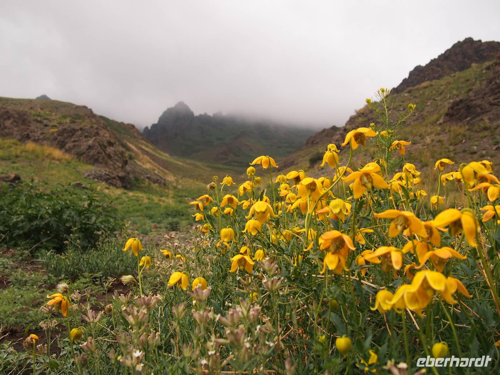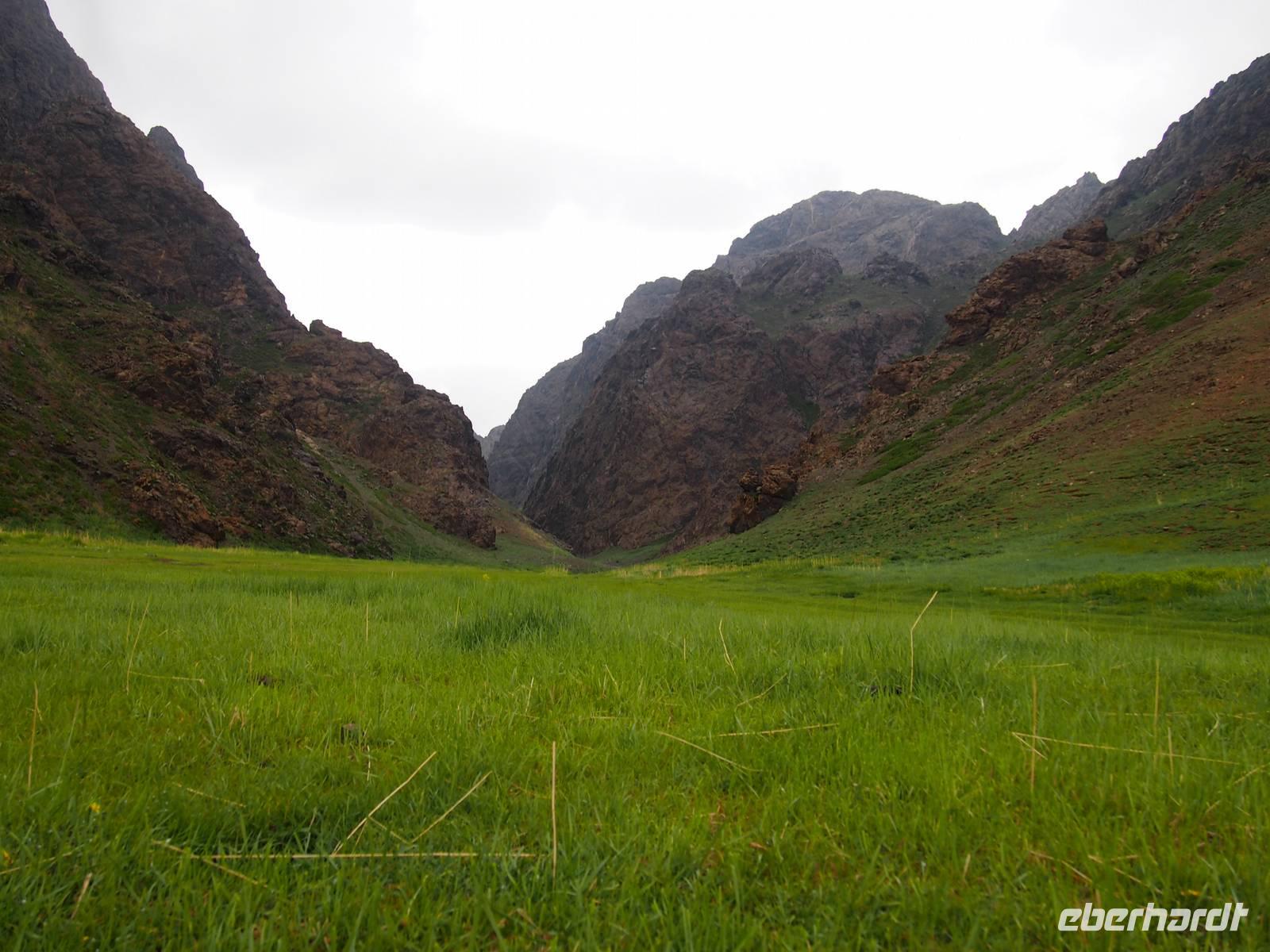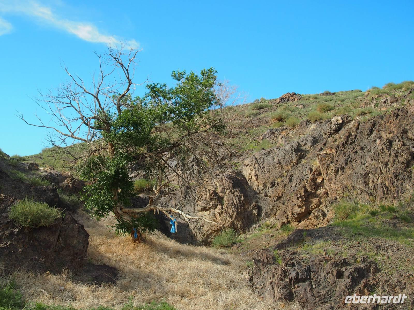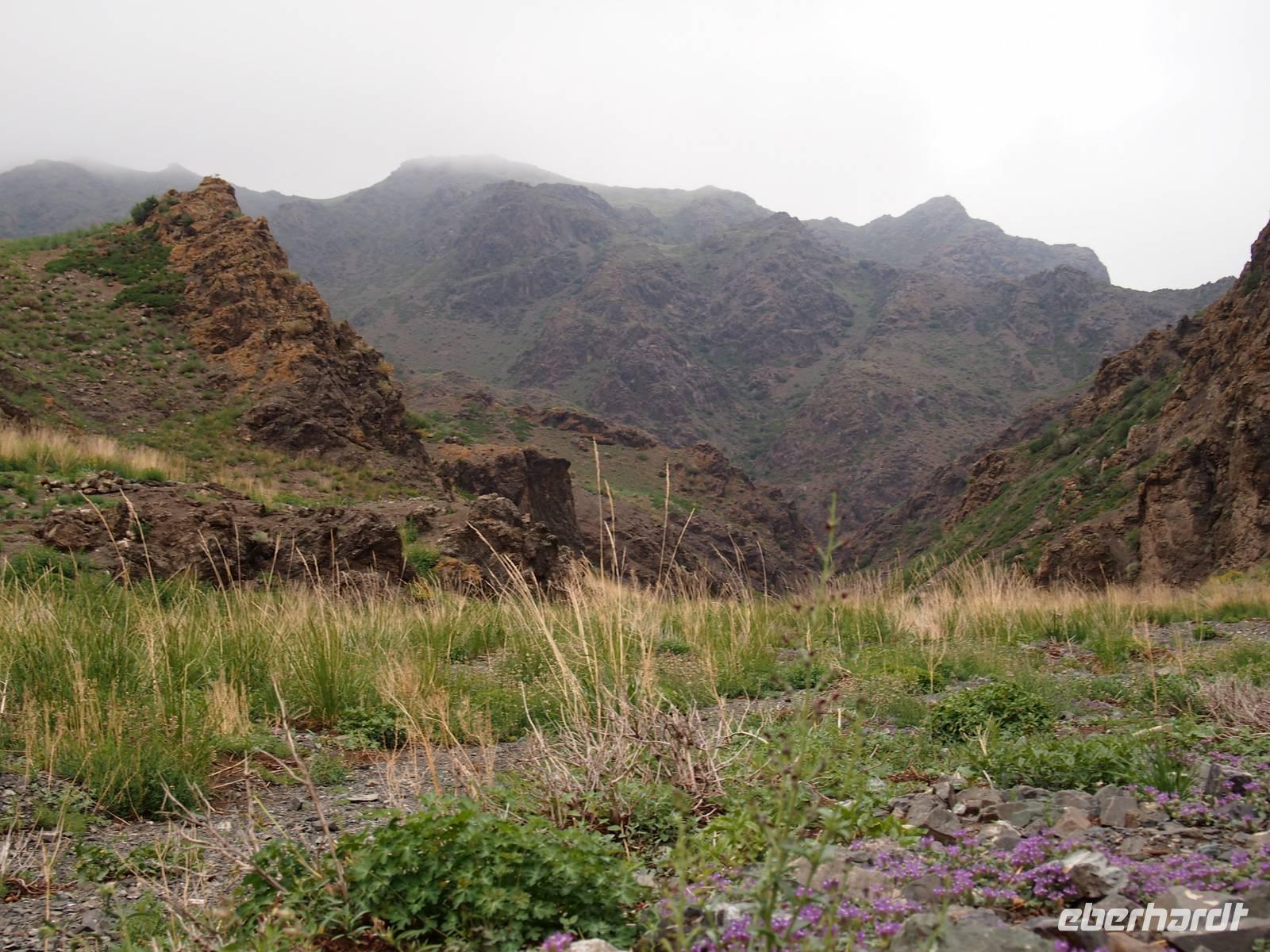 Heute konnten wir mal „ausschlafen", eine halbe Stunde länger als sonst. Nach dem Frühstück fuhren wir mit den Jeeps zur "Geierschlucht". Der Weg dorthin führte uns vorbei an ganz vielen Mäusen, die aussahen wie größere Hamster. Wir hatten redlich Spaß daran die kleinen Tiere zu beobachten, wie sie sich gegenseitig jagten und rumtollten. Das Wetter spielte auch so gut es ging mit, zu mindestens blieben wir trocken. Dadurch dass sich die Wolken in den Bergen festhingen, hatte die Schlucht einen ganz eigenen mystischen Charme. Anfangs war der Weg recht einfach und breit, aber je weiter man in die Schlucht kam, umso beschwerlicher wurde er. Der schwierigste Teil bestand aus einer etwa 500 Meter langen Gletschereisschicht, die wir nur mit gegenseitiger Hilfe bewältigen konnten. Auf der anderen Seite angekommen, führte der Weg uns weiter durch die atemberaubende Schlucht. Irgendwann wurde der Weg etwas breiter und man stieß auf eine wunderbare Flora und Fauna. Die Farben, das Nasse und die tiefhängenden Wolken machten diese Wanderung zu einem einmaligen und packenden Erlebnis. Für den Rückweg nahmen wir uns etwas Erde mit, um das Eis heil überwinden zu können. Einige Gäste brachen die Wanderung schon eher ab und entschieden sich für einen anderen Weg, auf dem man ebenfalls die Möglichkeit hatte verschiedene Schluchten zu durchwandern. Dabei hatten sie sogar das Glück, einen Uhu beobachten zu können. Geschafft und zufrieden besuchten wir das dazugehörige Museum des Nationalparks, bevor wir zum Mittagessen zum Camp zurück gefahren sind. Nach dem Essen besuchten wir heute auch noch eine Nomadenfamilie. Wir hörten gespannt zu und stellten der Hausherrin unsere Fragen. Bewirtet wurden wir mit getrocknetem Quark und selbstgemachten Joghurt. Natürlich war die Nomadenfrau auch neugierig auf uns und stellte einige Fragen. Ungewöhnlich war, dass die Familie drei Jurten besitzt, eine Schlafjurte, eine Jurte für die Küche und eine Gastjurte. Insgesamt besitzt die Familie außerdem noch 250 Schafe und Ziegen und drei Pferde. Die Frau braucht etwas über eine Stunde am Tag, um ihre insgesamt 68 Ziegen zu melken. Das war für uns absolut unvorstellbar. Nach diesem interessanten Besuch ging es zurück zum Camp. Einige Gäste nutzen die Freizeit bis zum Abendbrot und schrieben Postkarten oder erklommen noch den ein oder anderen Berg in der näheren Umgebung. Nach dem Essen gingen wir wieder zeitig zu Bett.