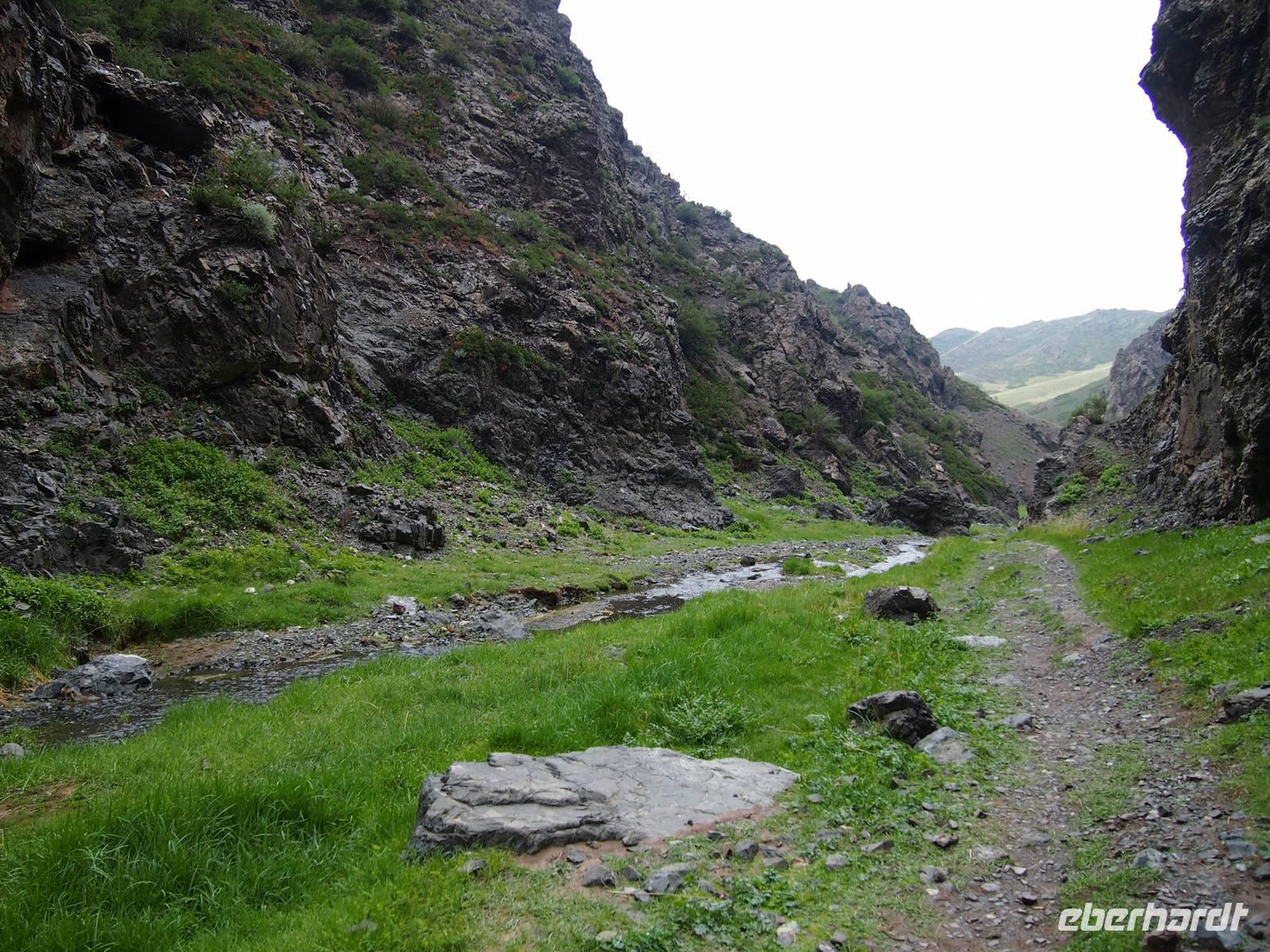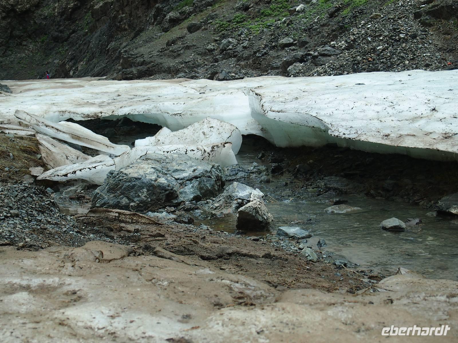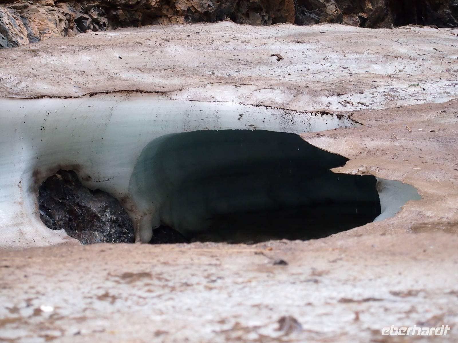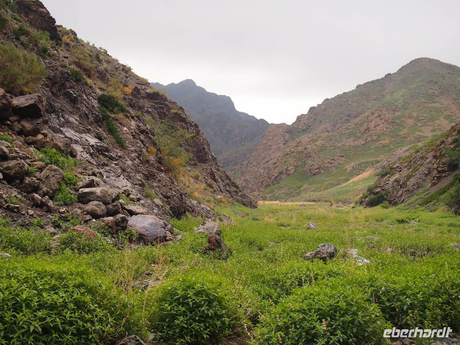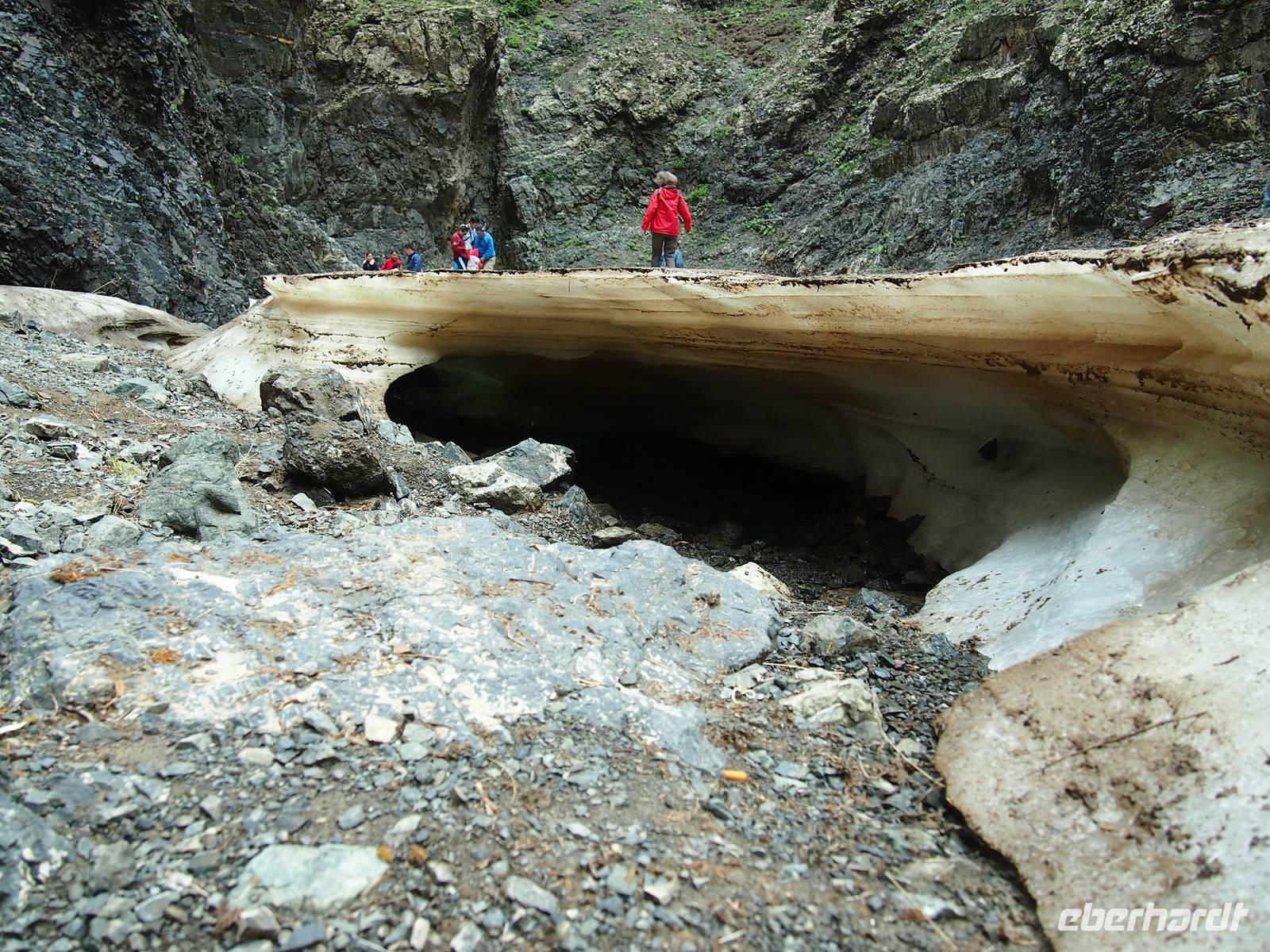 Heute konnten wir mal „ausschlafen", eine halbe Stunde länger als sonst. Nach dem Frühstück fuhren wir mit den Jeeps zur "Geierschlucht". Der Weg dorthin führte uns vorbei an ganz vielen Mäusen, die aussahen wie größere Hamster. Wir hatten redlich Spaß daran die kleinen Tiere zu beobachten, wie sie sich gegenseitig jagten und rumtollten. Das Wetter spielte auch so gut es ging mit, zu mindestens blieben wir trocken. Dadurch dass sich die Wolken in den Bergen festhingen, hatte die Schlucht einen ganz eigenen mystischen Charme. Anfangs war der Weg recht einfach und breit, aber je weiter man in die Schlucht kam, umso beschwerlicher wurde er. Der schwierigste Teil bestand aus einer etwa 500 Meter langen Gletschereisschicht, die wir nur mit gegenseitiger Hilfe bewältigen konnten. Auf der anderen Seite angekommen, führte der Weg uns weiter durch die atemberaubende Schlucht. Irgendwann wurde der Weg etwas breiter und man stieß auf eine wunderbare Flora und Fauna. Die Farben, das Nasse und die tiefhängenden Wolken machten diese Wanderung zu einem einmaligen und packenden Erlebnis. Für den Rückweg nahmen wir uns etwas Erde mit, um das Eis heil überwinden zu können. Einige Gäste brachen die Wanderung schon eher ab und entschieden sich für einen anderen Weg, auf dem man ebenfalls die Möglichkeit hatte verschiedene Schluchten zu durchwandern. Dabei hatten sie sogar das Glück, einen Uhu beobachten zu können. Geschafft und zufrieden besuchten wir das dazugehörige Museum des Nationalparks, bevor wir zum Mittagessen zum Camp zurück gefahren sind. Nach dem Essen besuchten wir heute auch noch eine Nomadenfamilie. Wir hörten gespannt zu und stellten der Hausherrin unsere Fragen. Bewirtet wurden wir mit getrocknetem Quark und selbstgemachten Joghurt. Natürlich war die Nomadenfrau auch neugierig auf uns und stellte einige Fragen. Ungewöhnlich war, dass die Familie drei Jurten besitzt, eine Schlafjurte, eine Jurte für die Küche und eine Gastjurte. Insgesamt besitzt die Familie außerdem noch 250 Schafe und Ziegen und drei Pferde. Die Frau braucht etwas über eine Stunde am Tag, um ihre insgesamt 68 Ziegen zu melken. Das war für uns absolut unvorstellbar. Nach diesem interessanten Besuch ging es zurück zum Camp. Einige Gäste nutzen die Freizeit bis zum Abendbrot und schrieben Postkarten oder erklommen noch den ein oder anderen Berg in der näheren Umgebung. Nach dem Essen gingen wir wieder zeitig zu Bett.