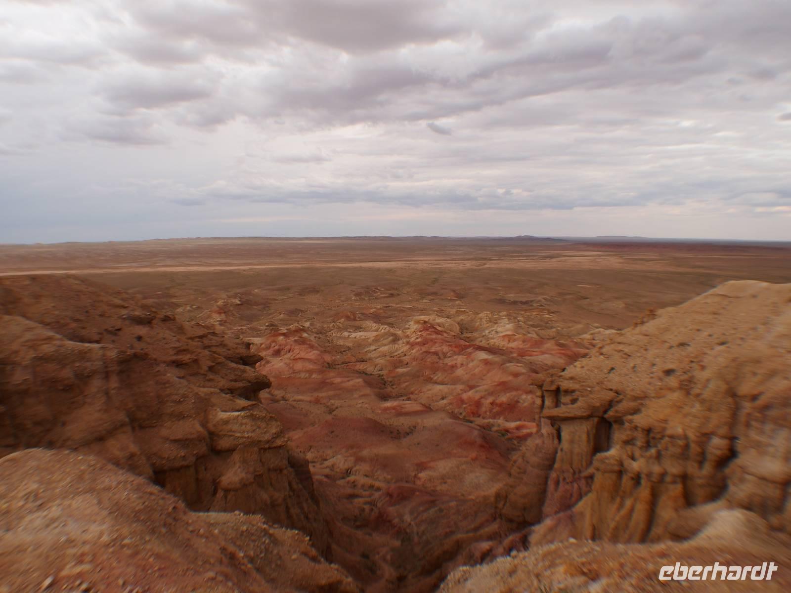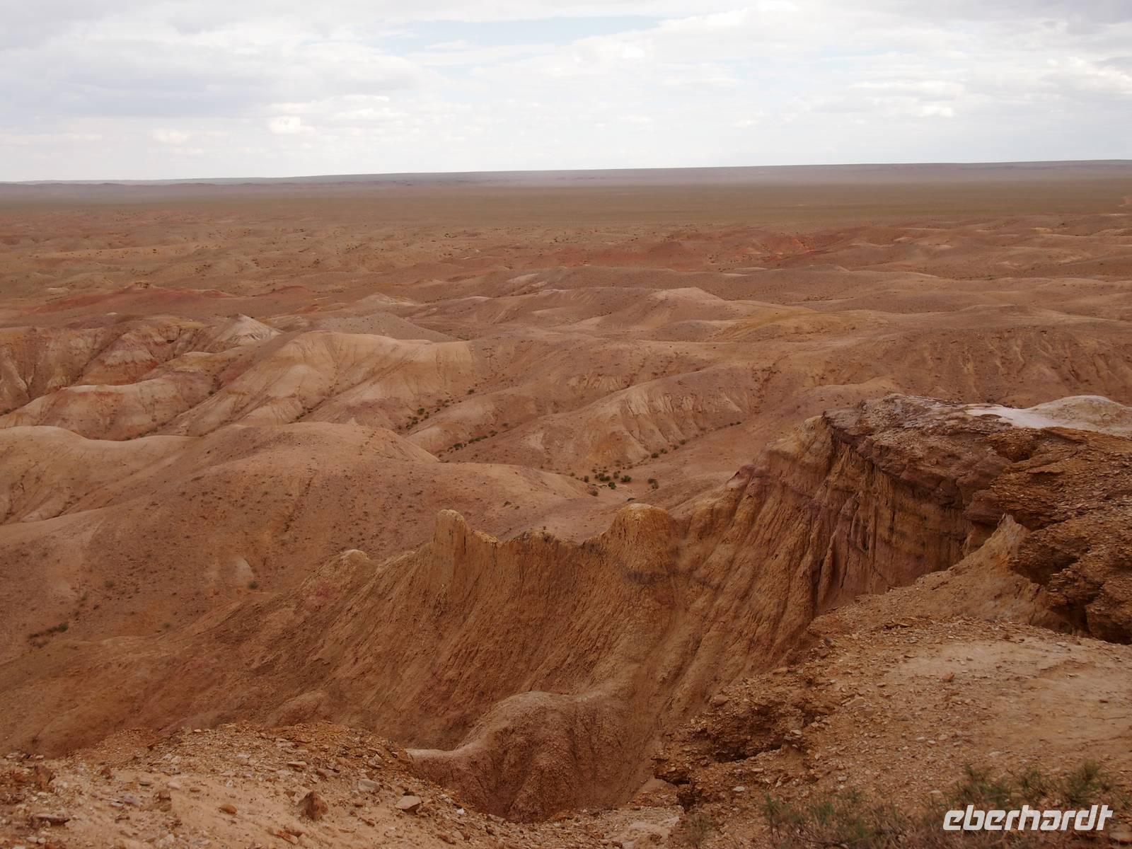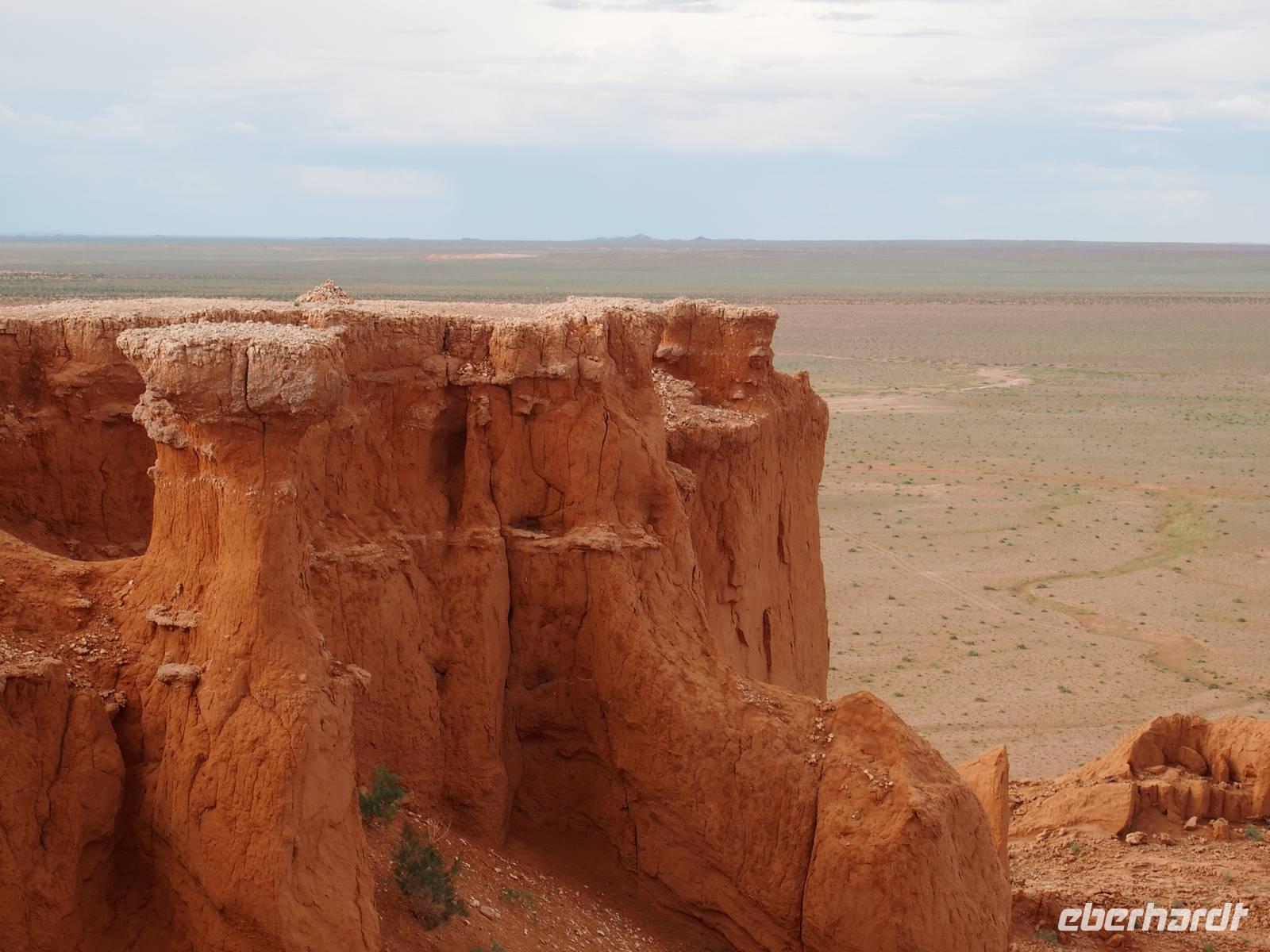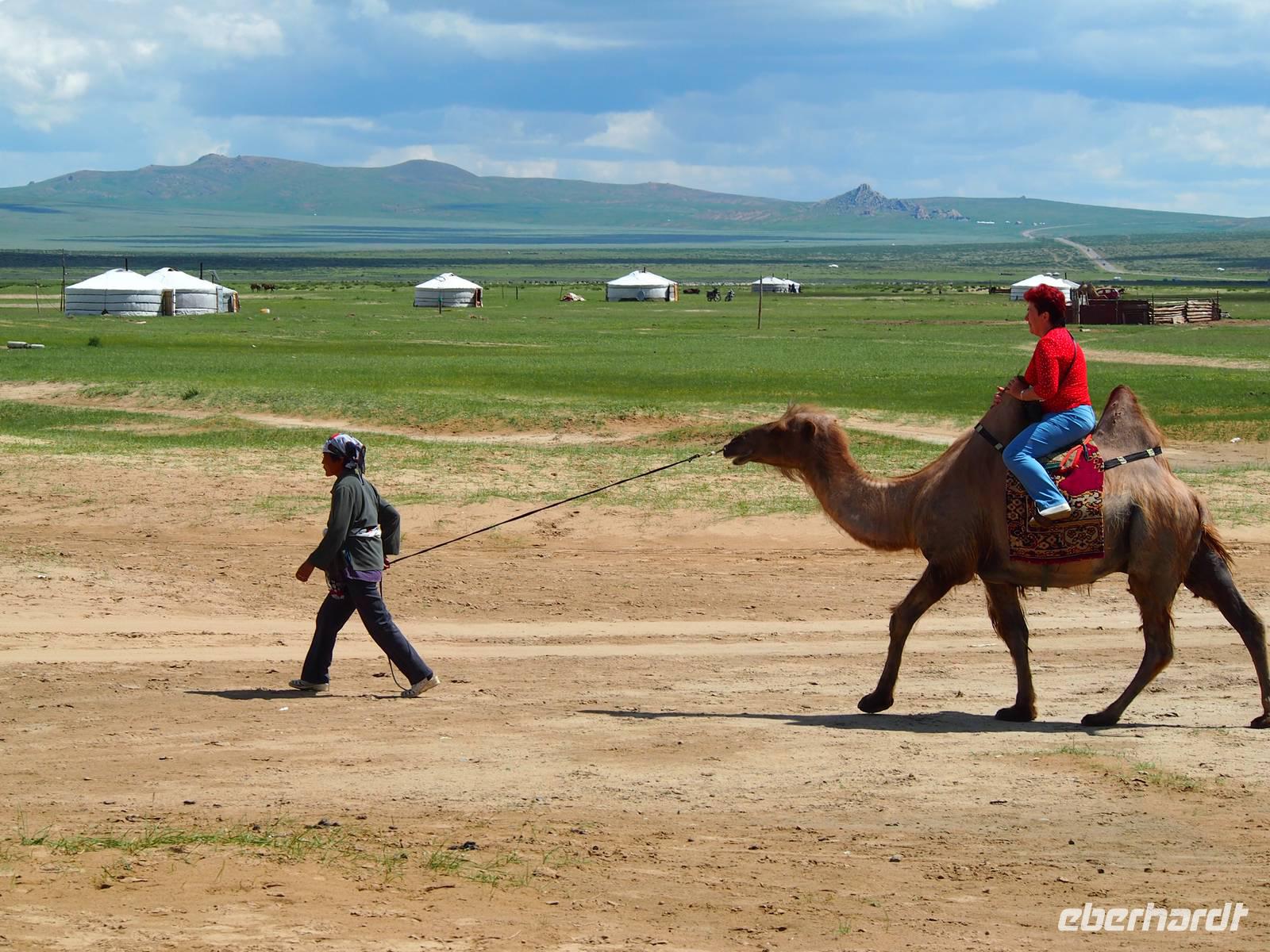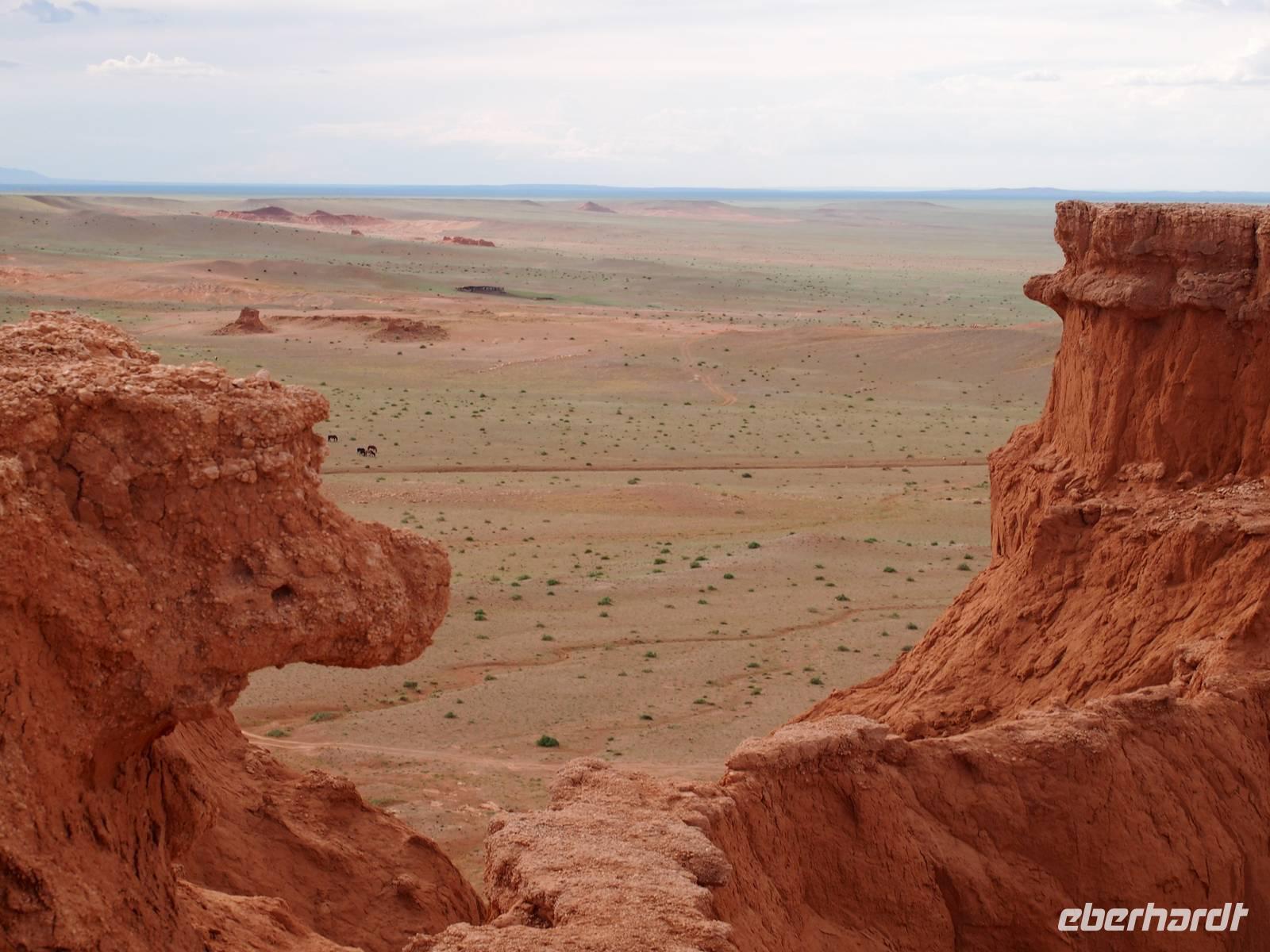 Weiter ging es vorbei an einem Kohletagebau. Wieder kam eine andere Geruchswelt auf uns zu und faszinierte uns irgendwie, dennoch passte es trotzdem nicht zu den schönen Blumenwiesen, die wir kurz zuvor gesehen haben. Nach gut1 ½ Tagen sind wir heute auf eine größere Stadt gestoßen, Mandalgovi, mit 10.000 Einwohnern. Hier sah man zum ersten Mal eingezäunte Jurten und endlich wieder eine asphaltierte Straße. Am Ortsausgang haben wir eine kleine Mittagspause eingelegt. Die weitere Fahrt führte uns vorbei an einer Herde Kamele. Mittlerweile fuhren wir wieder auf einer asphaltierten Straße, die einfach nur gerade durch das Land führte. Man hatte das Gefühl, als würde sie niemals enden. Nach einer knappen Stunde Fahrt über diese Straße wurden wir endlich wieder durchgeschüttelt, da die Fahrer auf die Schotterpiste in Richtung „White Stupa" abbogen. Auffallend war zu beobachten, wie die Steppe langsam zur Wüste überging. Die Pflanzen wurden immer weniger und es tauchte immer mehr Sand auf. Das absolute Highlight des Tages war die „White Stupa", eine Schlucht die mit Worten kaum zu beschreiben ist. Eine gleichzeitig skurrile und anmutige Gesteinsformation. Einige Gäste waren besonders waghalsig und mutig und stellten sich auf einen Felsvorsprung, um die Weite noch besser auf sich wirken zu lassen.