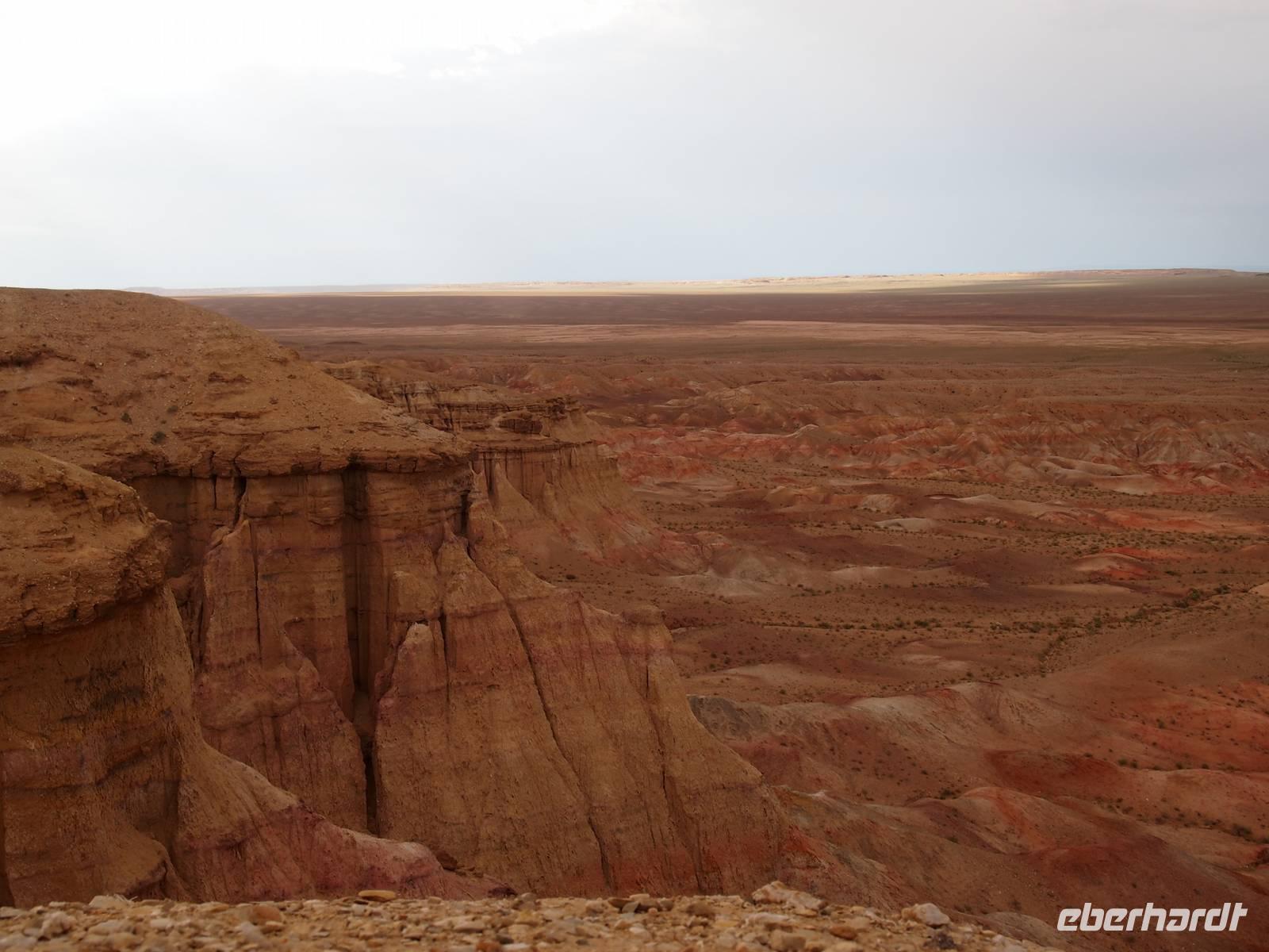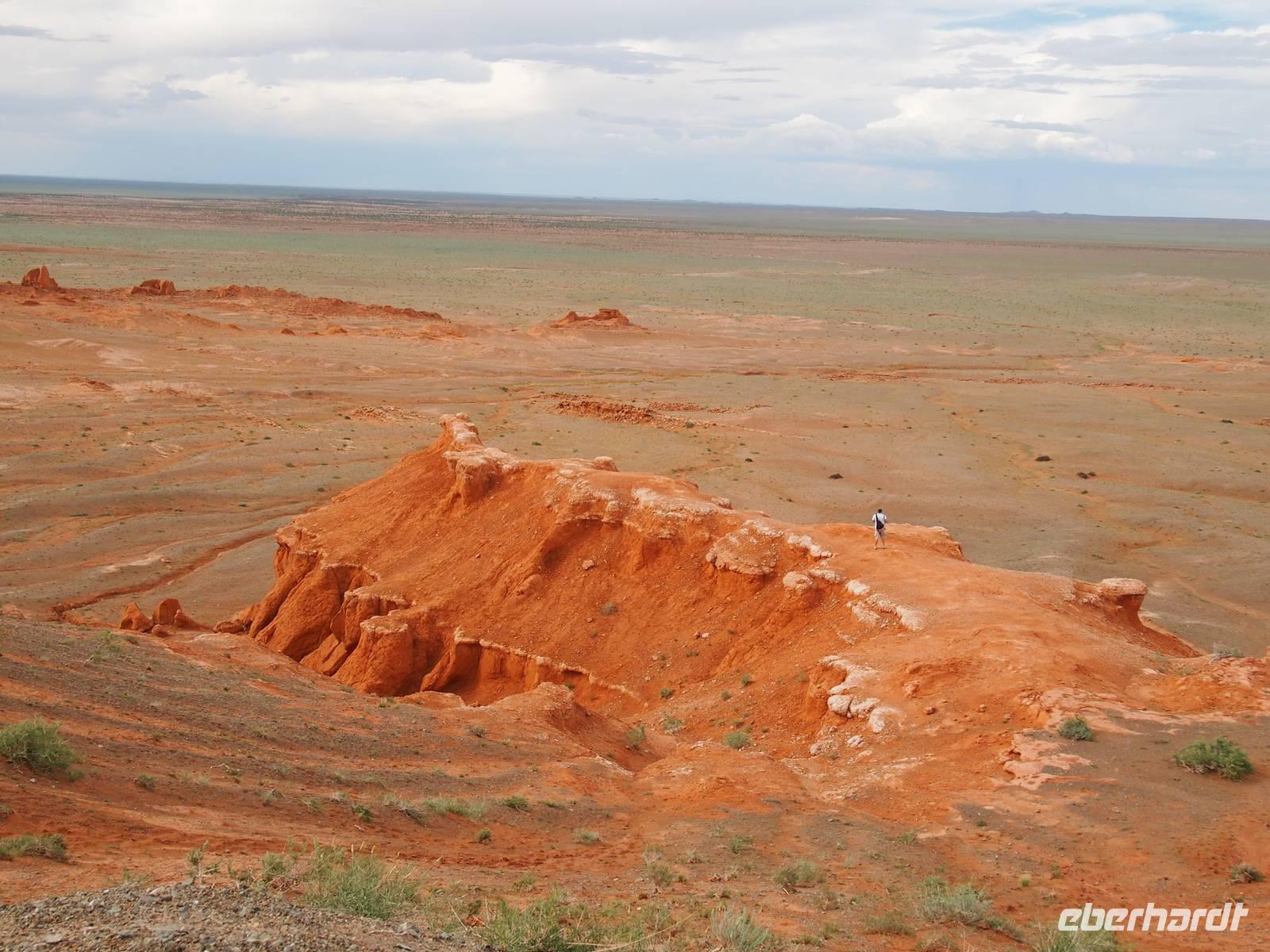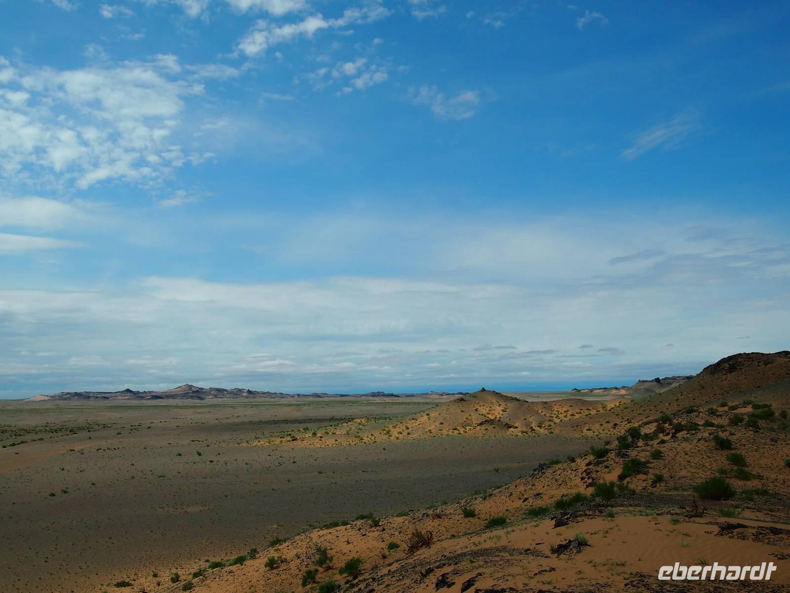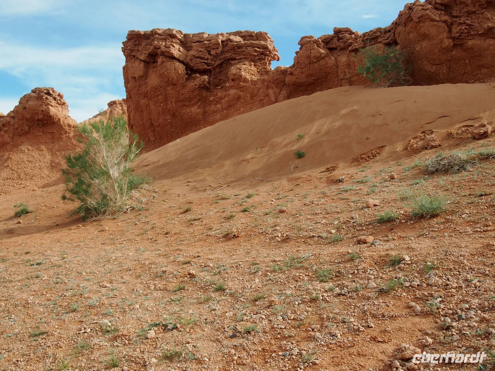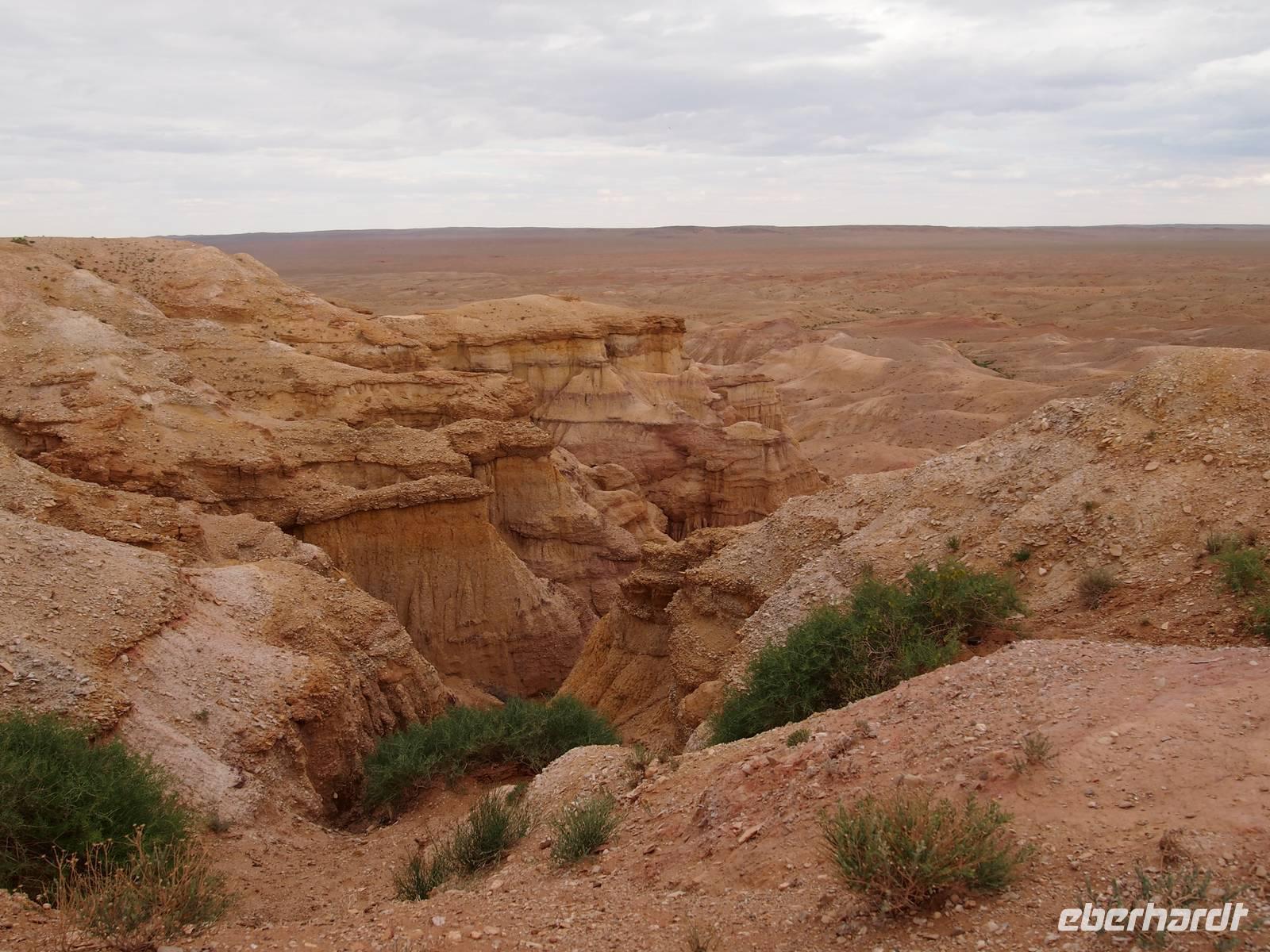 Weiter ging es vorbei an einem Kohletagebau. Wieder kam eine andere Geruchswelt auf uns zu und faszinierte uns irgendwie, dennoch passte es trotzdem nicht zu den schönen Blumenwiesen, die wir kurz zuvor gesehen haben. Nach gut1 ½ Tagen sind wir heute auf eine größere Stadt gestoßen, Mandalgovi, mit 10.000 Einwohnern. Hier sah man zum ersten Mal eingezäunte Jurten und endlich wieder eine asphaltierte Straße. Am Ortsausgang haben wir eine kleine Mittagspause eingelegt. Die weitere Fahrt führte uns vorbei an einer Herde Kamele. Mittlerweile fuhren wir wieder auf einer asphaltierten Straße, die einfach nur gerade durch das Land führte. Man hatte das Gefühl, als würde sie niemals enden. Nach einer knappen Stunde Fahrt über diese Straße wurden wir endlich wieder durchgeschüttelt, da die Fahrer auf die Schotterpiste in Richtung „White Stupa" abbogen. Auffallend war zu beobachten, wie die Steppe langsam zur Wüste überging. Die Pflanzen wurden immer weniger und es tauchte immer mehr Sand auf. Das absolute Highlight des Tages war die „White Stupa", eine Schlucht die mit Worten kaum zu beschreiben ist. Eine gleichzeitig skurrile und anmutige Gesteinsformation. Einige Gäste waren besonders waghalsig und mutig und stellten sich auf einen Felsvorsprung, um die Weite noch besser auf sich wirken zu lassen.