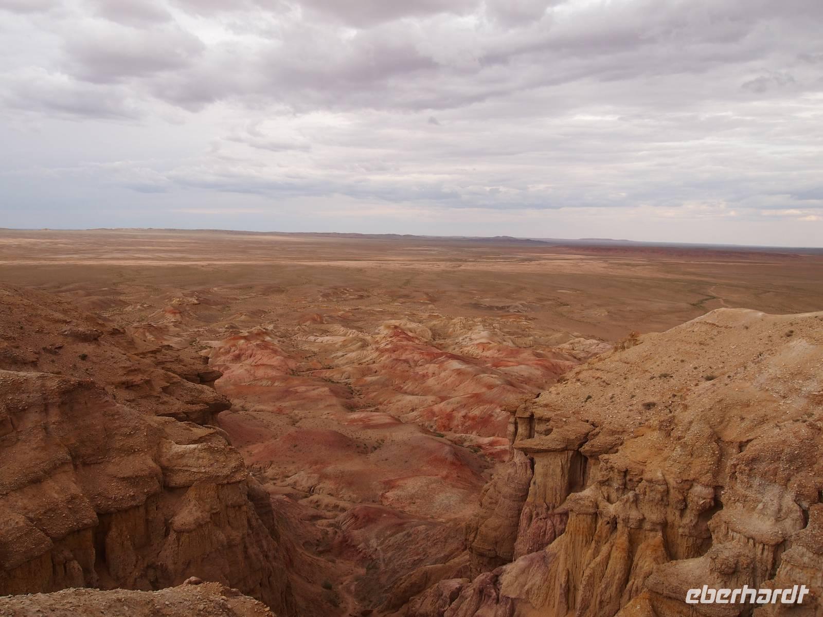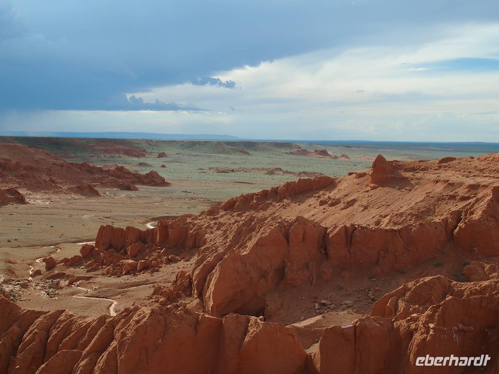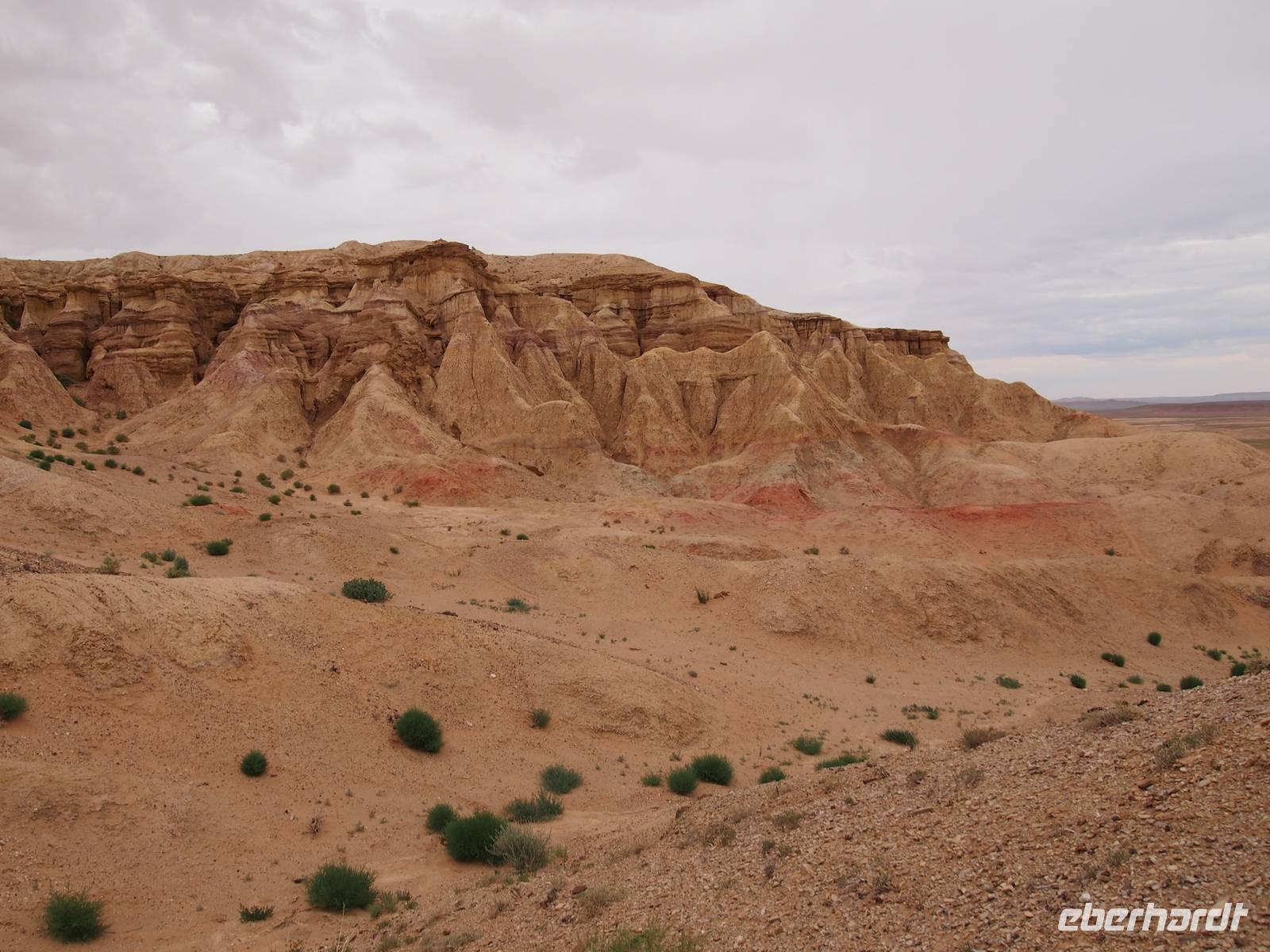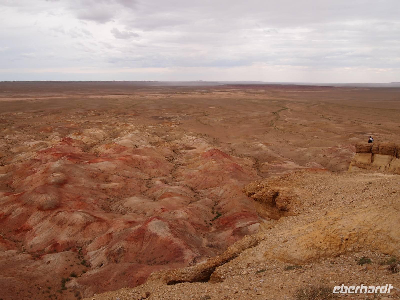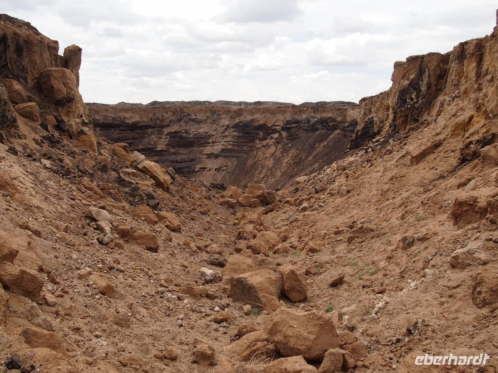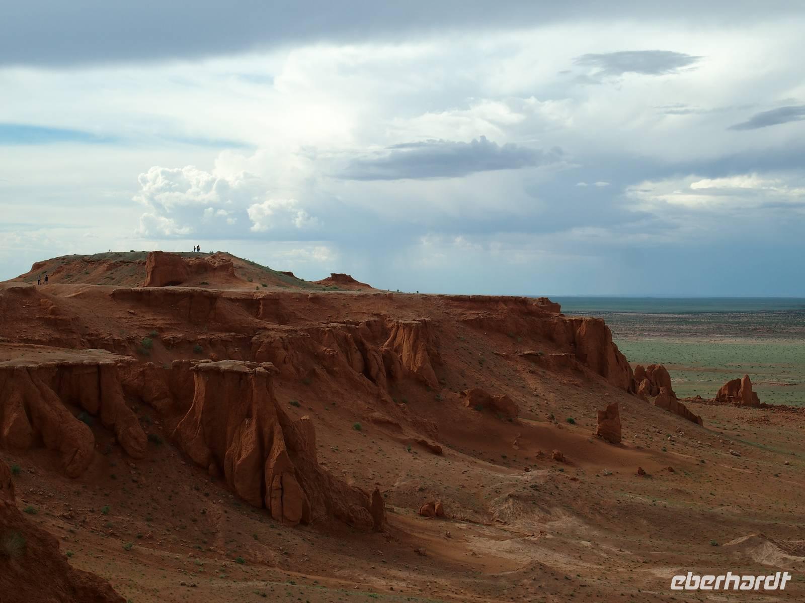Weiter ging es vorbei an einem Kohletagebau. Wieder kam eine andere Geruchswelt auf uns zu und faszinierte uns irgendwie, dennoch passte es trotzdem nicht zu den schönen Blumenwiesen, die wir kurz zuvor gesehen haben. Nach gut1 ½ Tagen sind wir heute auf eine größere Stadt gestoßen, Mandalgovi, mit 10.000 Einwohnern. Hier sah man zum ersten Mal eingezäunte Jurten und endlich wieder eine asphaltierte Straße. Am Ortsausgang haben wir eine kleine Mittagspause eingelegt. Die weitere Fahrt führte uns vorbei an einer Herde Kamele. Mittlerweile fuhren wir wieder auf einer asphaltierten Straße, die einfach nur gerade durch das Land führte. Man hatte das Gefühl, als würde sie niemals enden. Nach einer knappen Stunde Fahrt über diese Straße wurden wir endlich wieder durchgeschüttelt, da die Fahrer auf die Schotterpiste in Richtung „White Stupa" abbogen. Auffallend war zu beobachten, wie die Steppe langsam zur Wüste überging. Die Pflanzen wurden immer weniger und es tauchte immer mehr Sand auf. Das absolute Highlight des Tages war die „White Stupa", eine Schlucht die mit Worten kaum zu beschreiben ist. Eine gleichzeitig skurrile und anmutige Gesteinsformation. Einige Gäste waren besonders waghalsig und mutig und stellten sich auf einen Felsvorsprung, um die Weite noch besser auf sich wirken zu lassen.