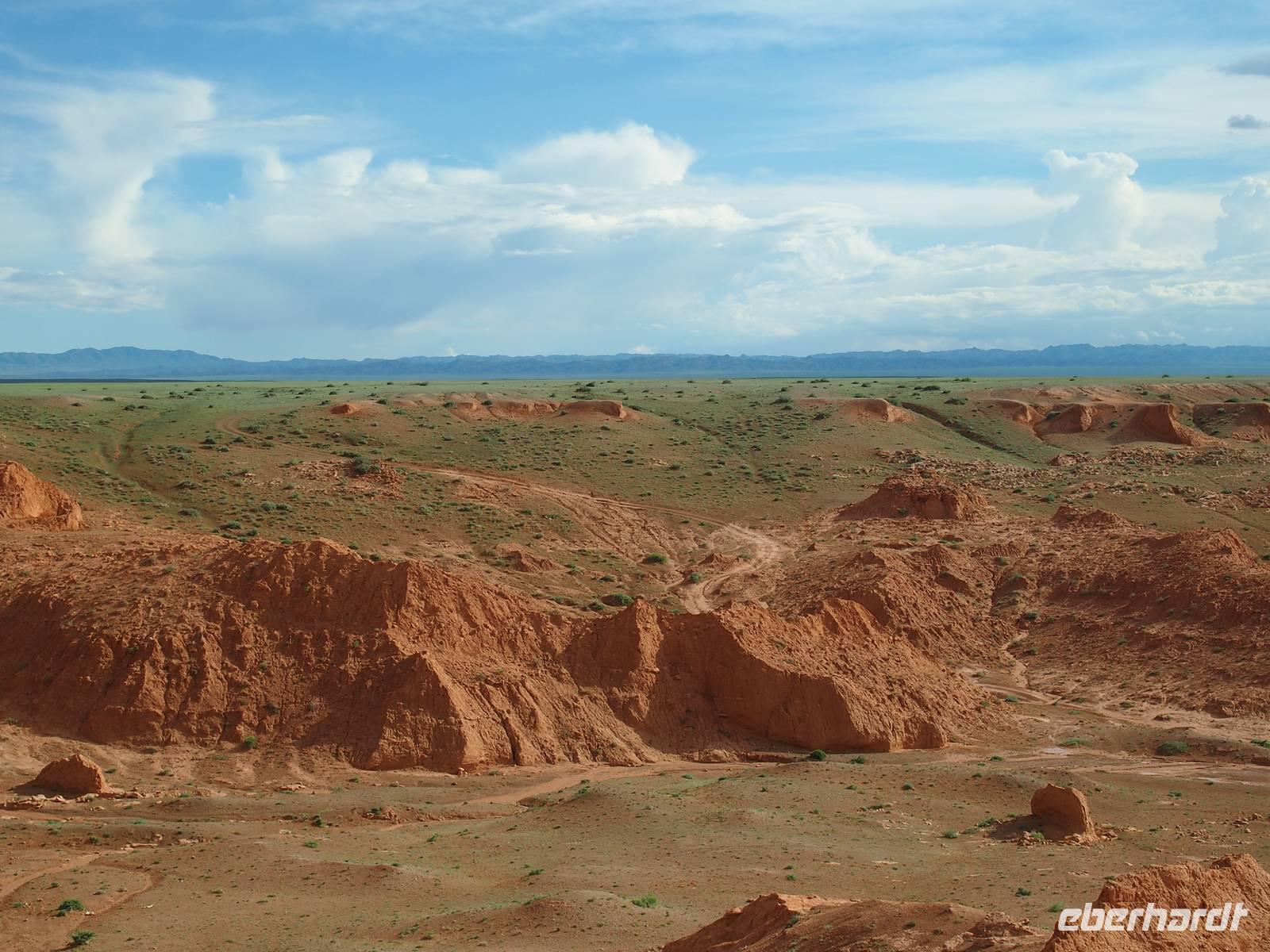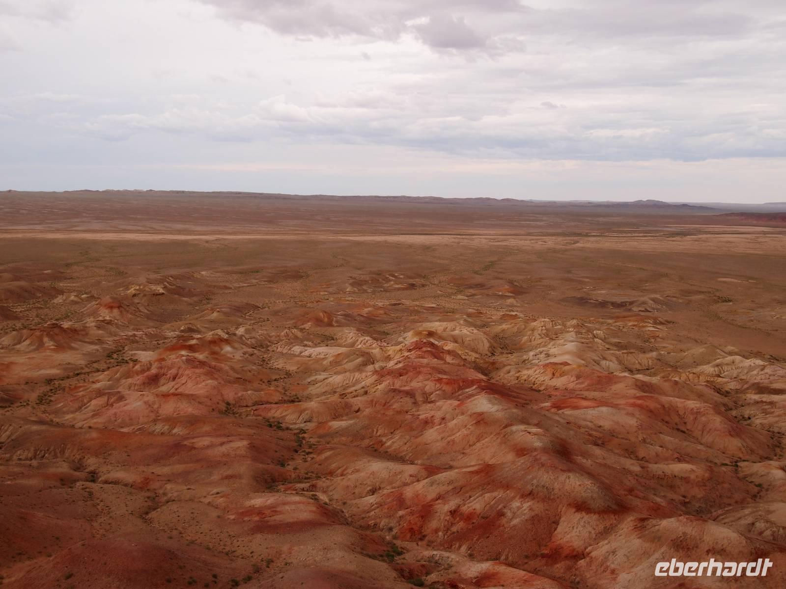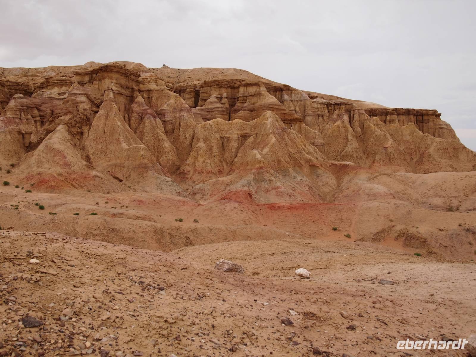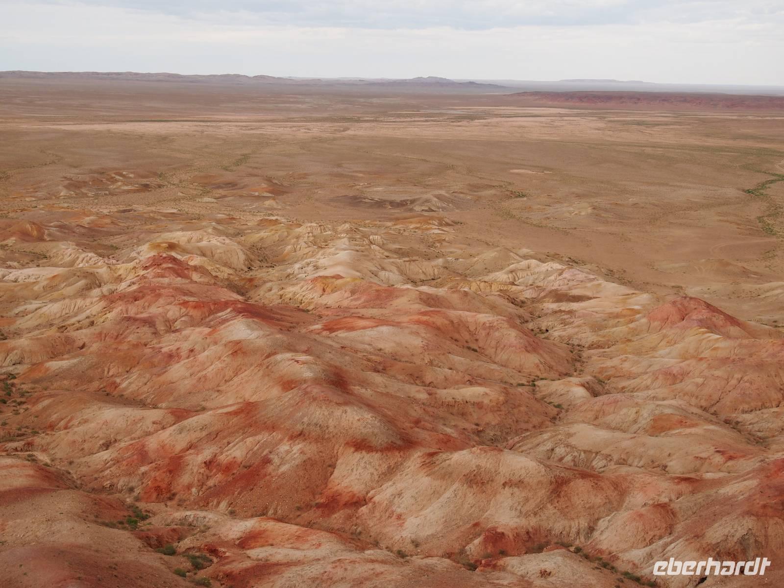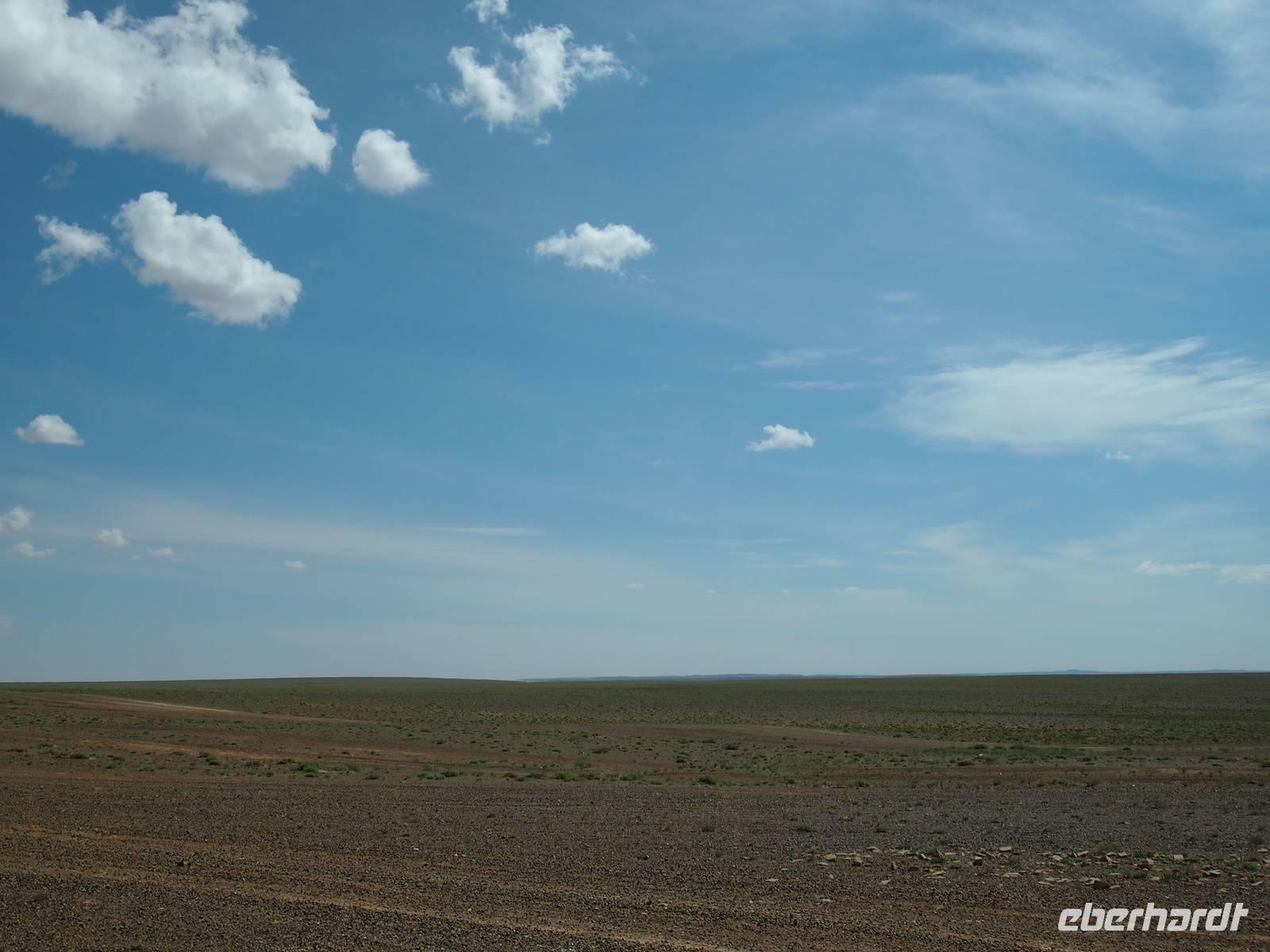 Weiter ging es vorbei an einem Kohletagebau. Wieder kam eine andere Geruchswelt auf uns zu und faszinierte uns irgendwie, dennoch passte es trotzdem nicht zu den schönen Blumenwiesen, die wir kurz zuvor gesehen haben. Nach gut1 ½ Tagen sind wir heute auf eine größere Stadt gestoßen, Mandalgovi, mit 10.000 Einwohnern. Hier sah man zum ersten Mal eingezäunte Jurten und endlich wieder eine asphaltierte Straße. Am Ortsausgang haben wir eine kleine Mittagspause eingelegt. Die weitere Fahrt führte uns vorbei an einer Herde Kamele. Mittlerweile fuhren wir wieder auf einer asphaltierten Straße, die einfach nur gerade durch das Land führte. Man hatte das Gefühl, als würde sie niemals enden. Nach einer knappen Stunde Fahrt über diese Straße wurden wir endlich wieder durchgeschüttelt, da die Fahrer auf die Schotterpiste in Richtung „White Stupa" abbogen. Auffallend war zu beobachten, wie die Steppe langsam zur Wüste überging. Die Pflanzen wurden immer weniger und es tauchte immer mehr Sand auf. Das absolute Highlight des Tages war die „White Stupa", eine Schlucht die mit Worten kaum zu beschreiben ist. Eine gleichzeitig skurrile und anmutige Gesteinsformation. Einige Gäste waren besonders waghalsig und mutig und stellten sich auf einen Felsvorsprung, um die Weite noch besser auf sich wirken zu lassen.