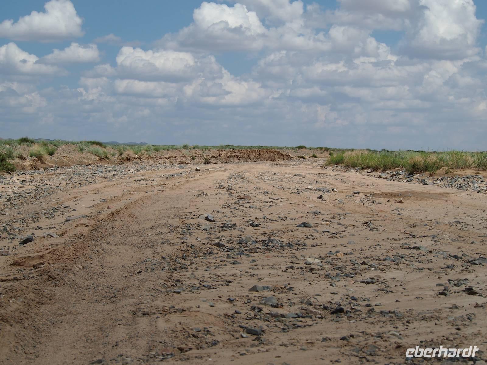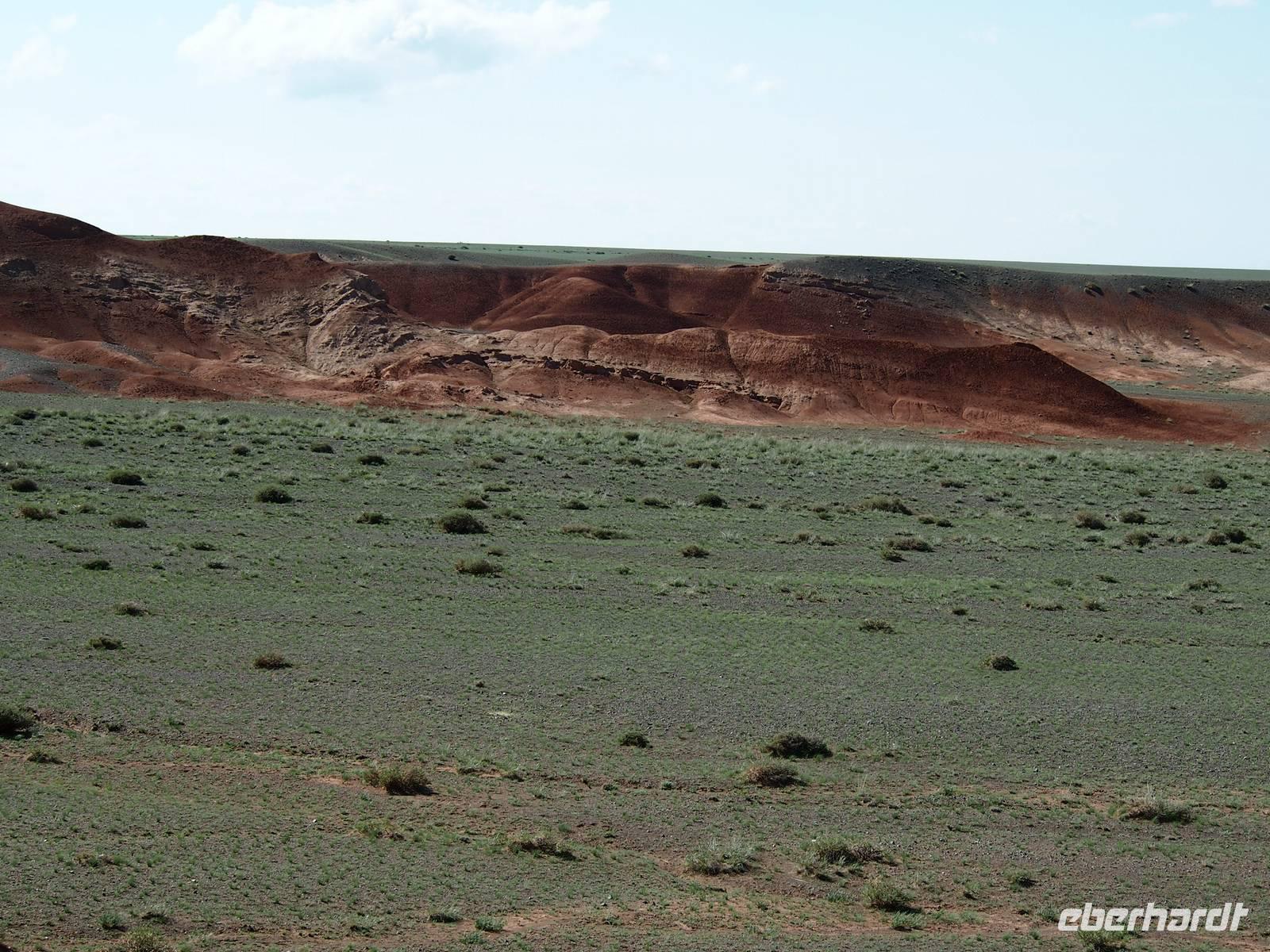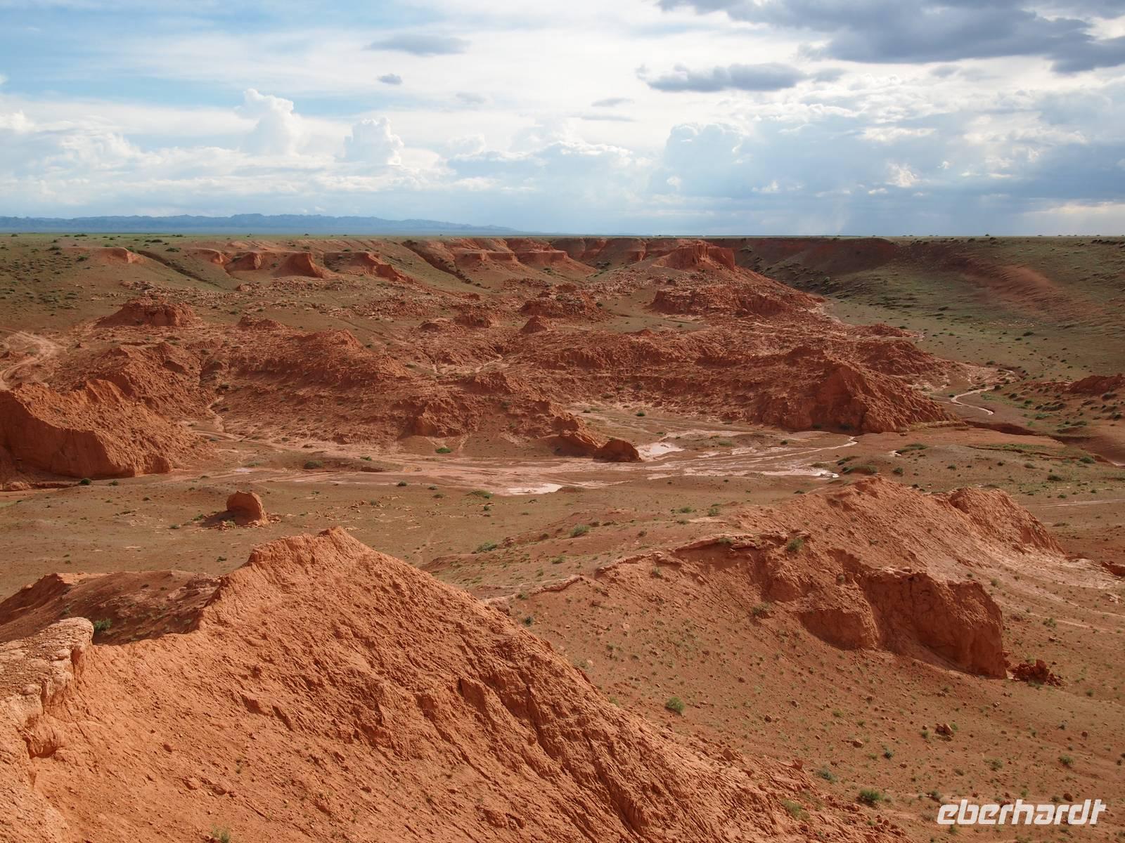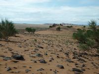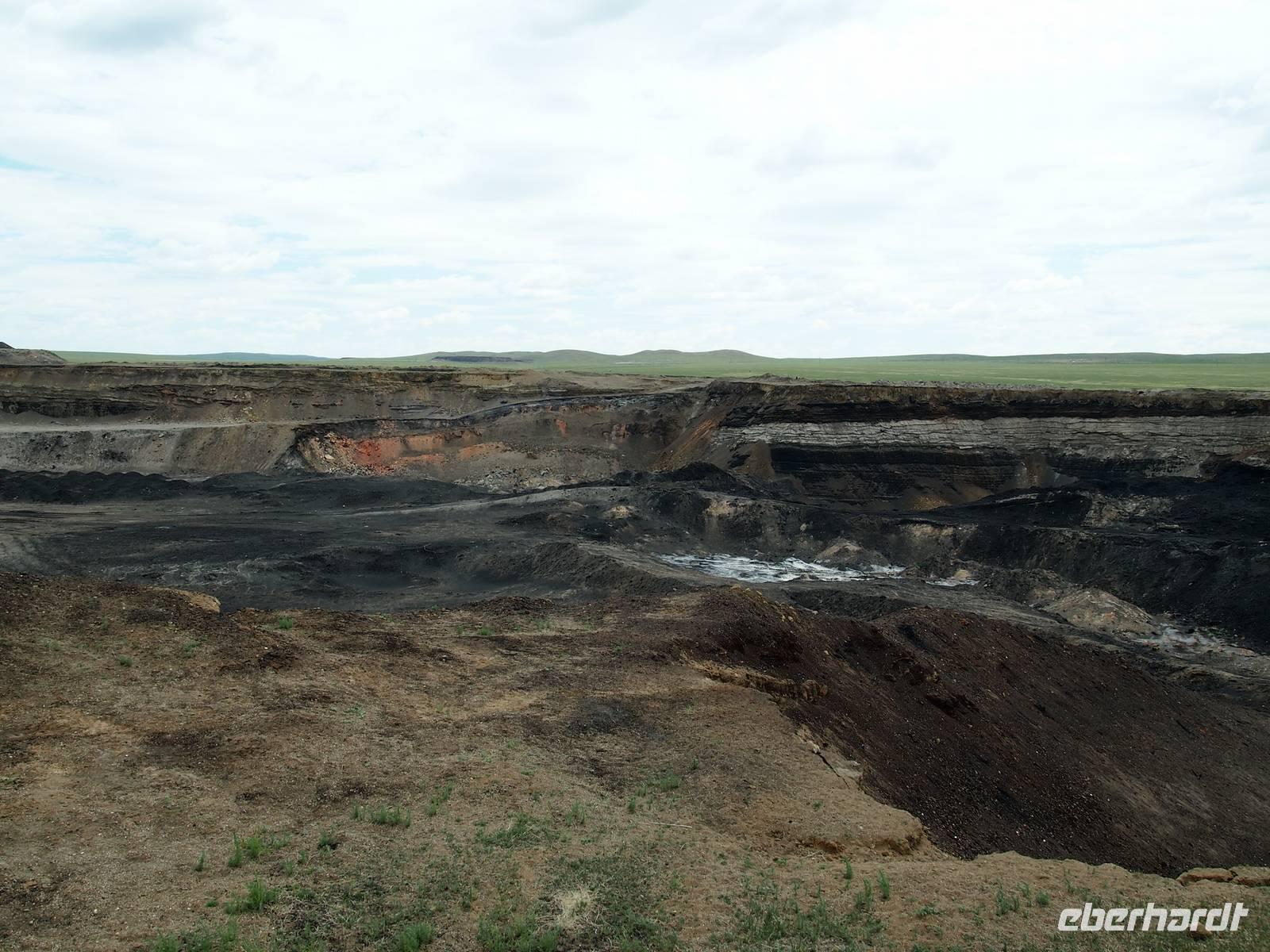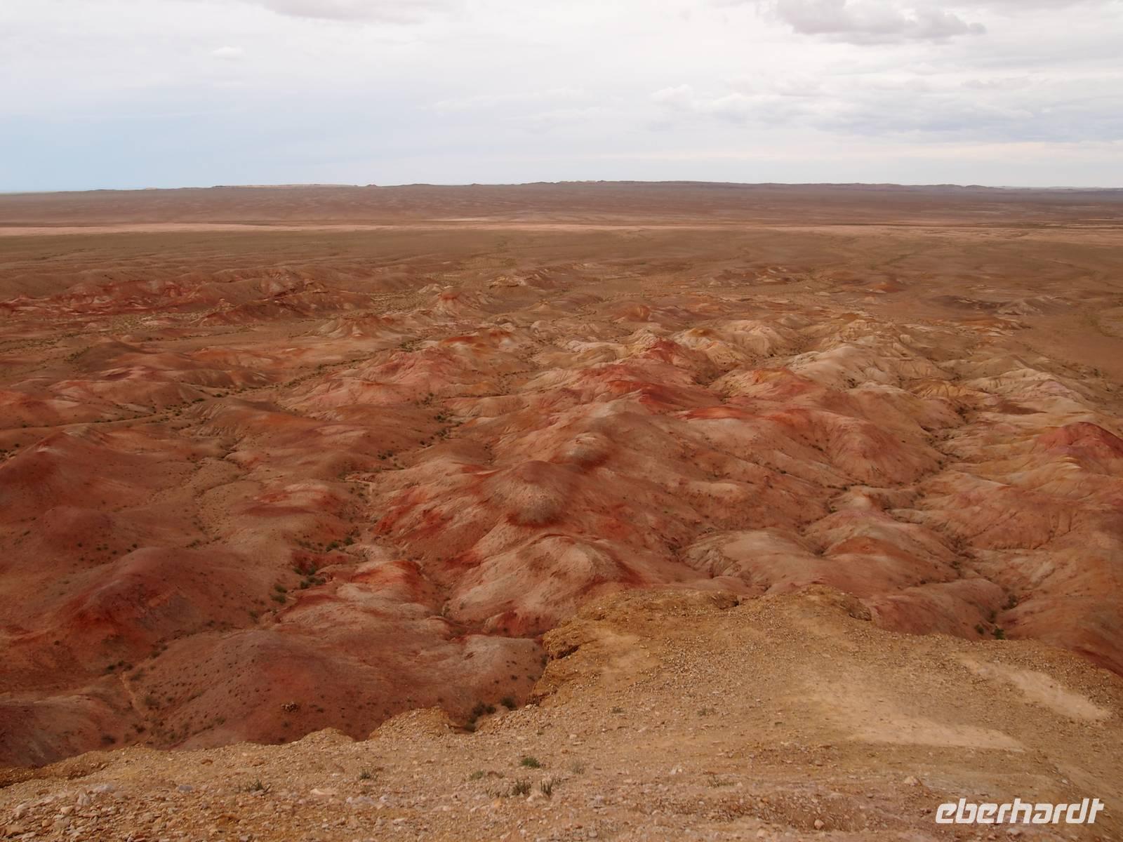 Weiter ging es vorbei an einem Kohletagebau. Wieder kam eine andere Geruchswelt auf uns zu und faszinierte uns irgendwie, dennoch passte es trotzdem nicht zu den schönen Blumenwiesen, die wir kurz zuvor gesehen haben. Nach gut1 ½ Tagen sind wir heute auf eine größere Stadt gestoßen, Mandalgovi, mit 10.000 Einwohnern. Hier sah man zum ersten Mal eingezäunte Jurten und endlich wieder eine asphaltierte Straße. Am Ortsausgang haben wir eine kleine Mittagspause eingelegt. Die weitere Fahrt führte uns vorbei an einer Herde Kamele. Mittlerweile fuhren wir wieder auf einer asphaltierten Straße, die einfach nur gerade durch das Land führte. Man hatte das Gefühl, als würde sie niemals enden. Nach einer knappen Stunde Fahrt über diese Straße wurden wir endlich wieder durchgeschüttelt, da die Fahrer auf die Schotterpiste in Richtung „White Stupa" abbogen. Auffallend war zu beobachten, wie die Steppe langsam zur Wüste überging. Die Pflanzen wurden immer weniger und es tauchte immer mehr Sand auf. Das absolute Highlight des Tages war die „White Stupa", eine Schlucht die mit Worten kaum zu beschreiben ist. Eine gleichzeitig skurrile und anmutige Gesteinsformation. Einige Gäste waren besonders waghalsig und mutig und stellten sich auf einen Felsvorsprung, um die Weite noch besser auf sich wirken zu lassen.