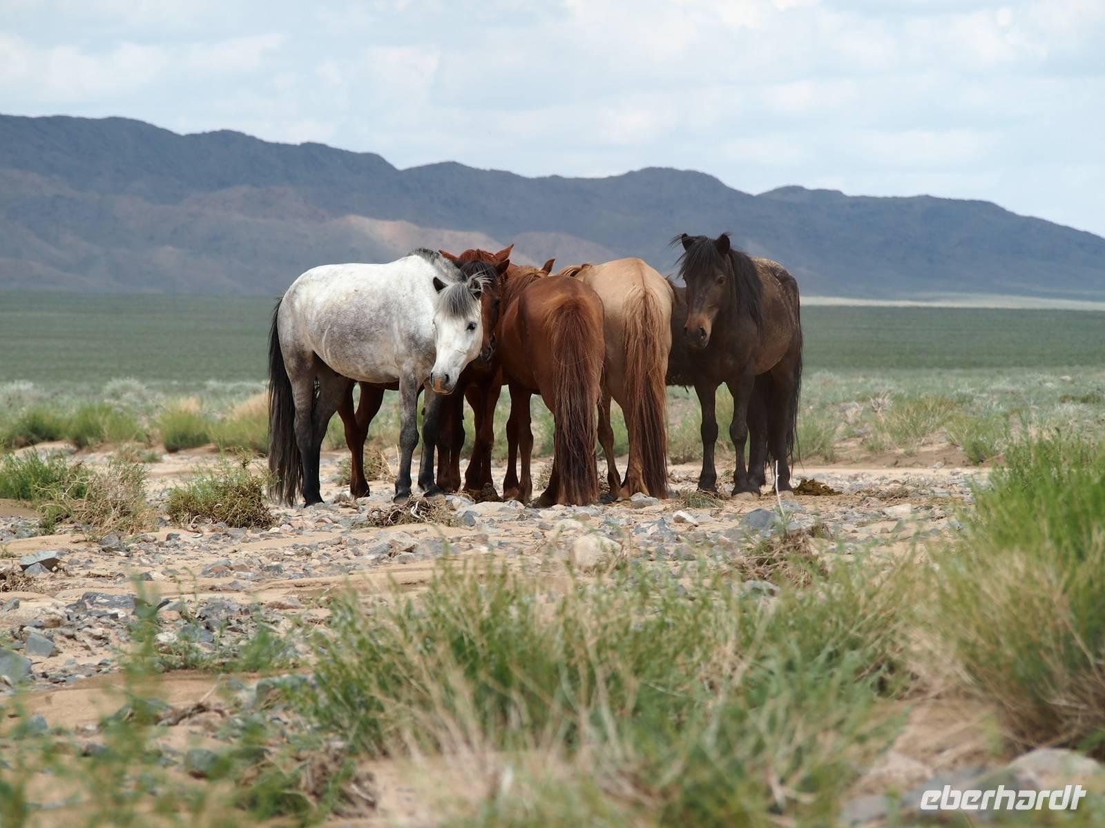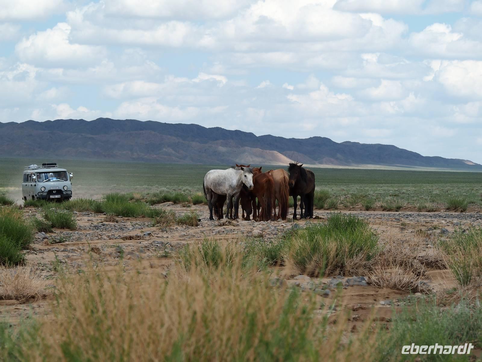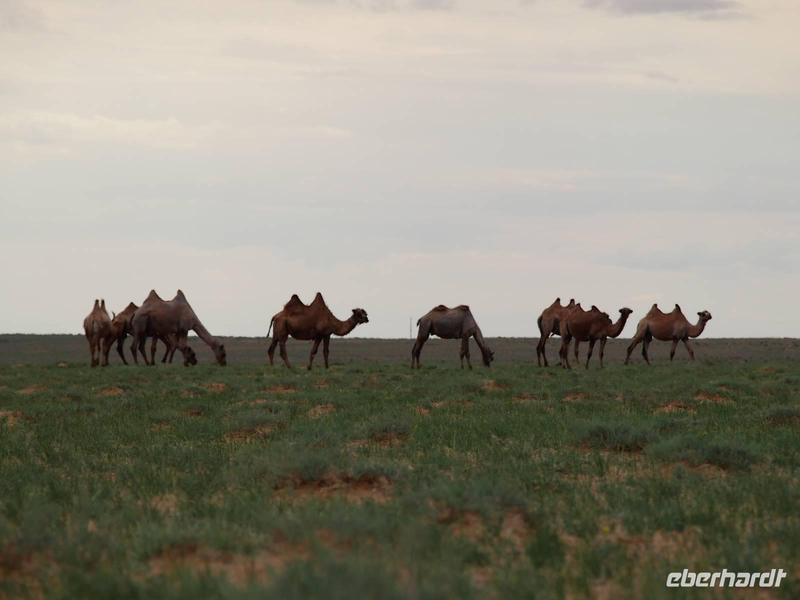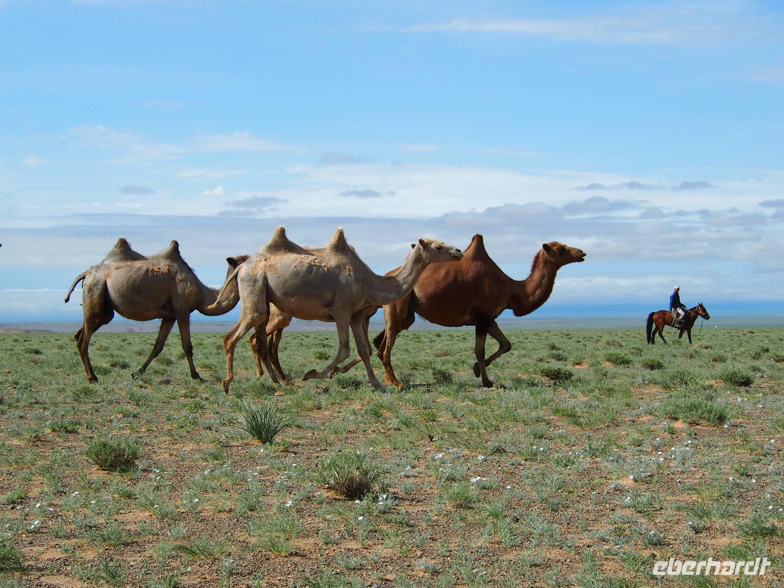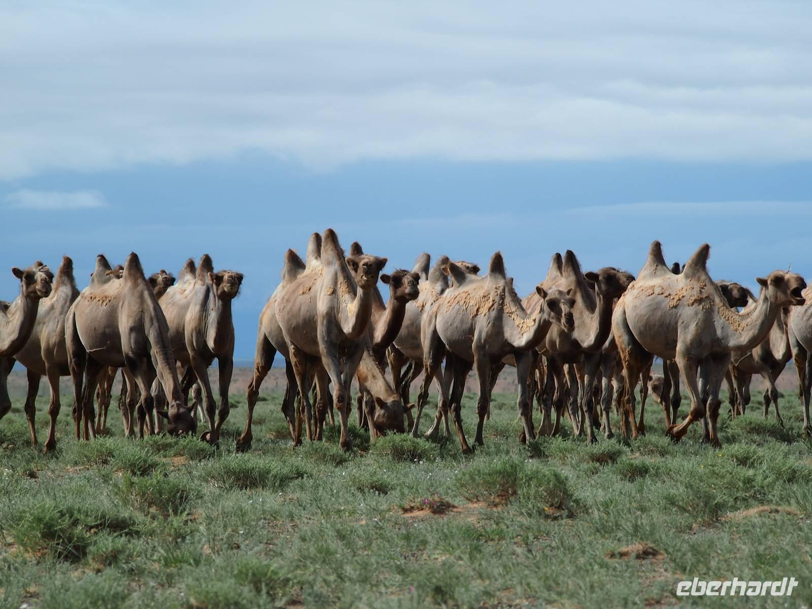 Am frühen Morgen machten sich wieder ein paar wenige Gäste auf, um den Sonnenaufgang zu sehen. Nach dem Frühstück ging es weiter Richtung Gobi-Wüste. Heute stand uns wieder eine lange Strecke bevor, die uns hauptsächlich durch die Halbwüste führte. Auf unserer Fahrt zum nächsten Jurten Camp legten wir wieder mehrere Fotostopps ein. Wir hatten heute beispielsweise die Möglichkeit, Kamele aus unmittelbarer Nähe zu beobachten. Die Herde schien sichtlich Spaß zu haben und ließ sich aus nächster Nähe fotografieren.