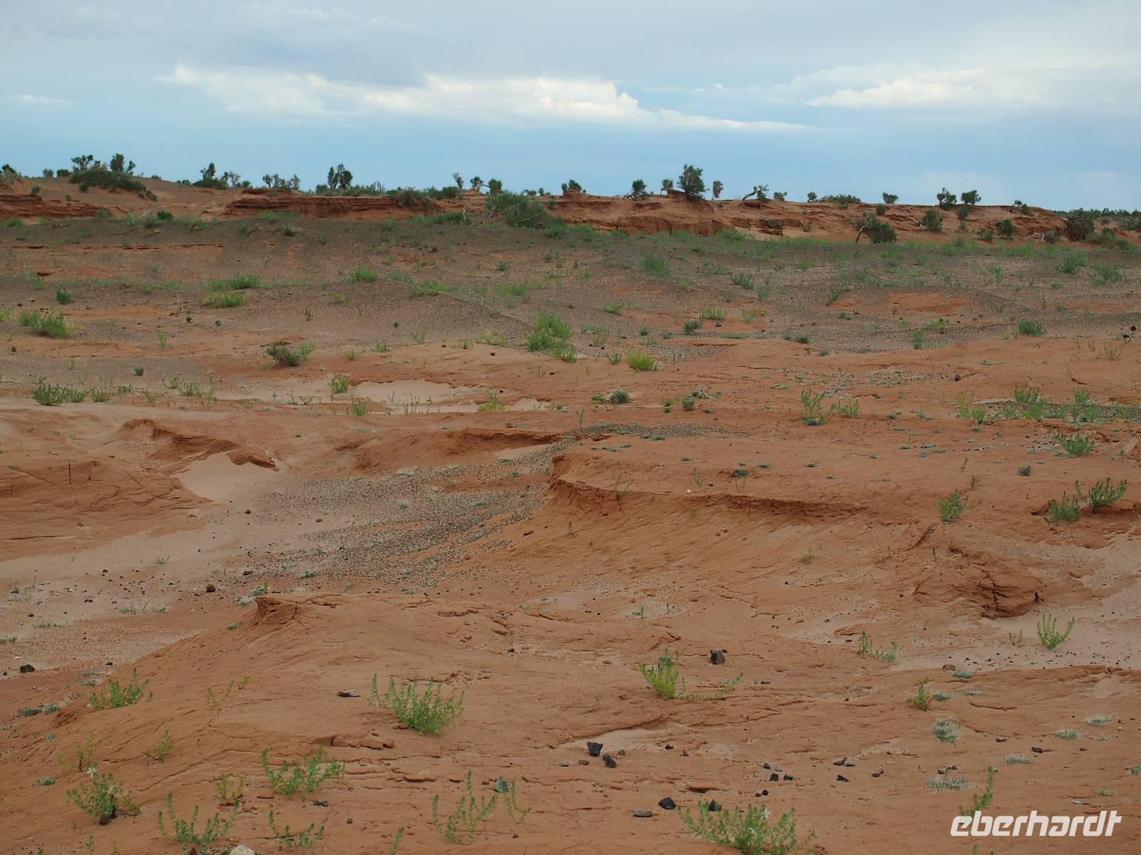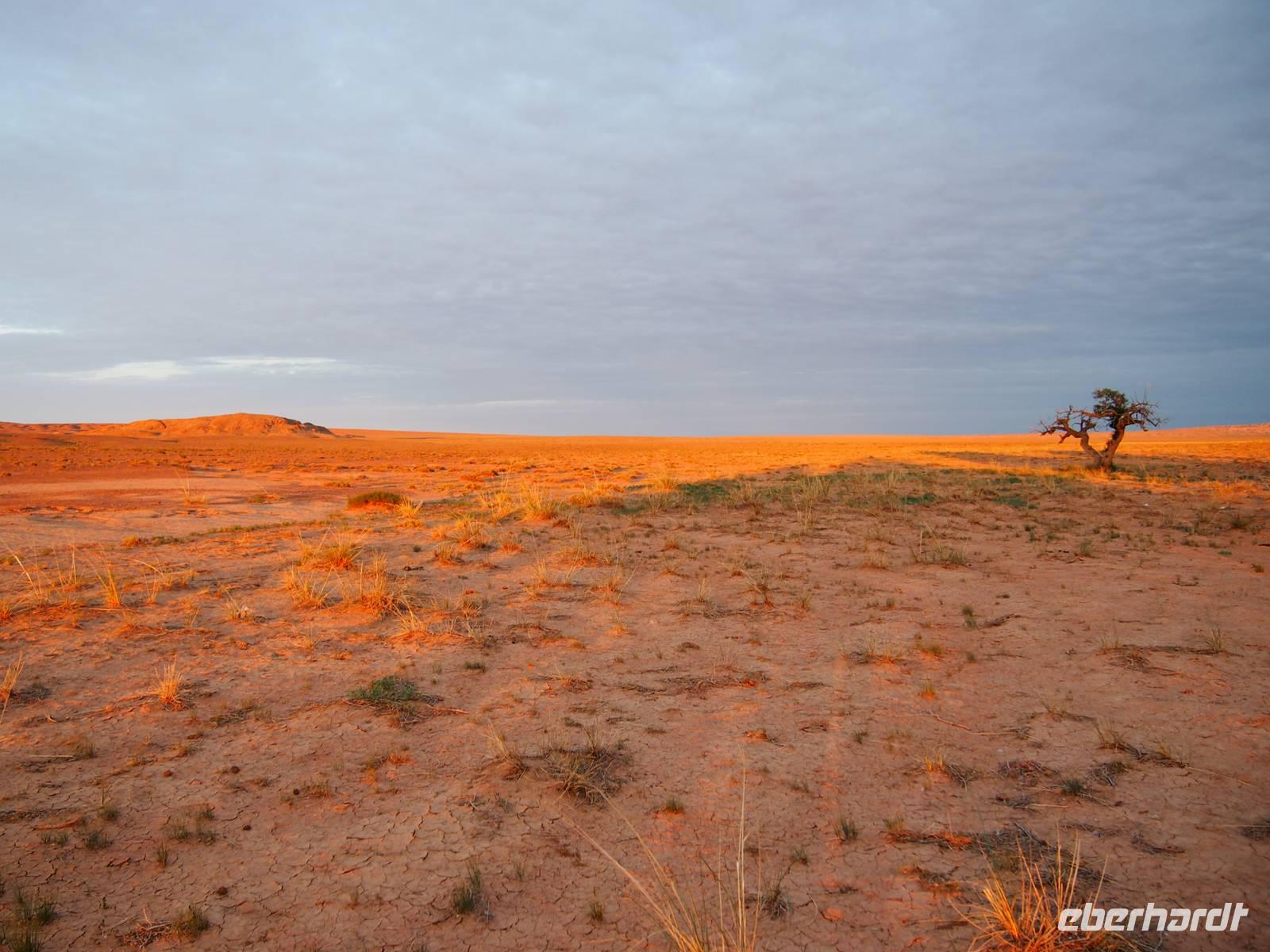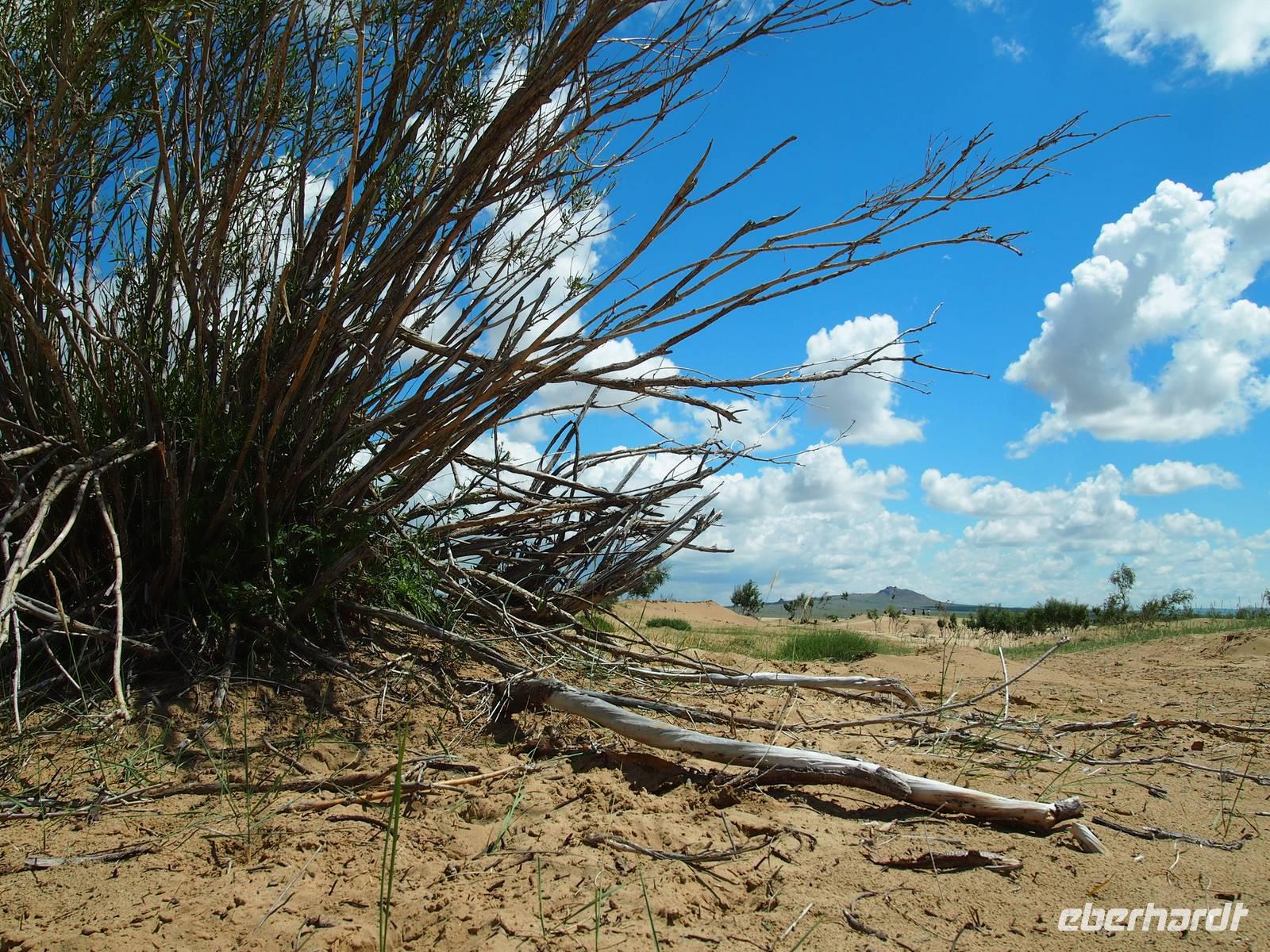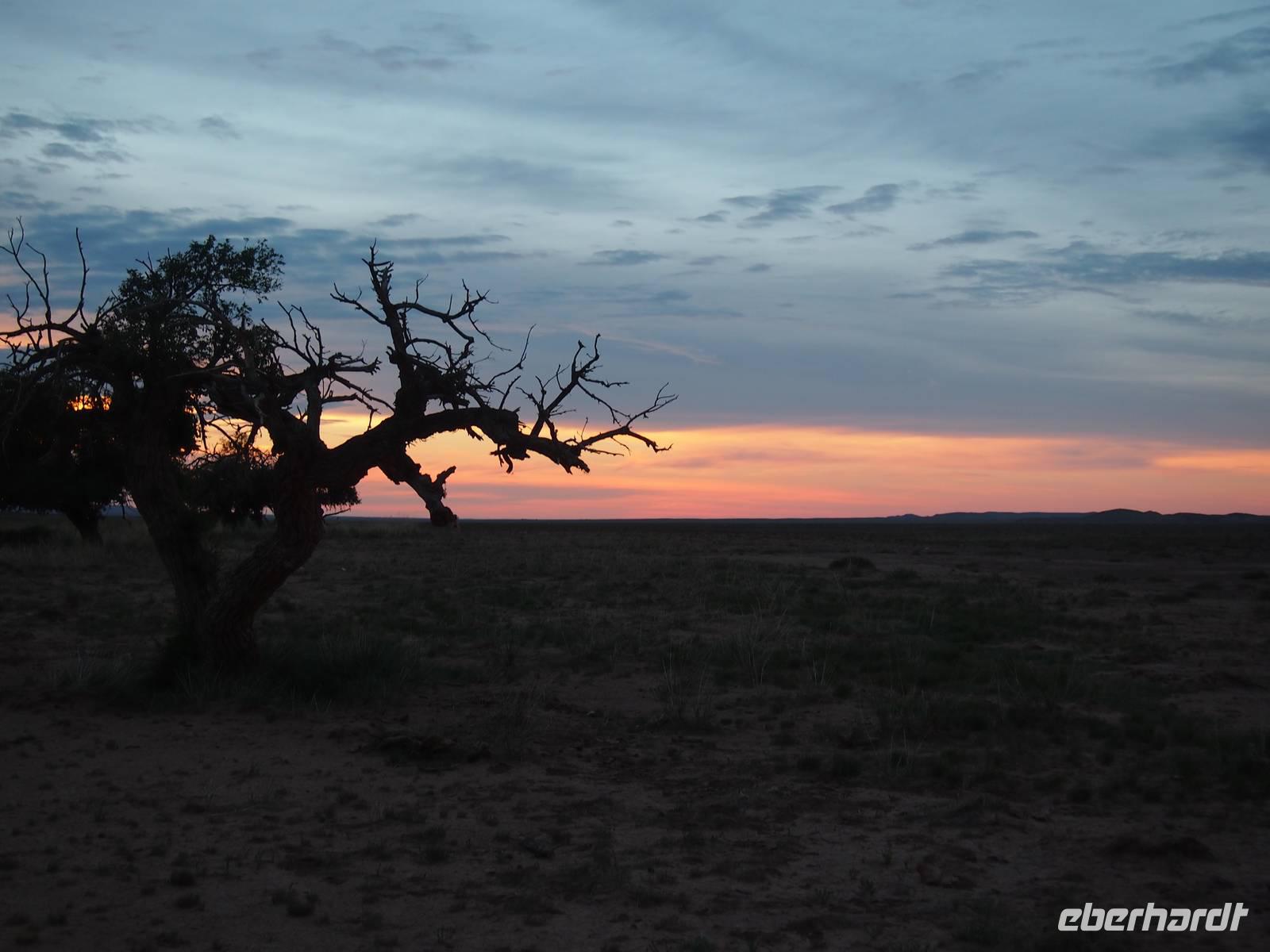 Bevor wir uns auf den Weg zu den Dinosaurierfundstellen machten, guckten wir noch einen kurzen Film über die Fundstelle an. welche nicht weit von unserem Camp entfernt lag. Man hatte einen wunderschönen Blick in den Canyon, der aus rotem Lehm bestand. Hier wurden neben Dinosaurierknochen auch Eier vom Tyrannosaurus Rex gefunden. In der Ferne konnten wir schon den Sauxalwald erahnen. Wir machten uns mit unseren Kameras und Ferngläsern auf den Weg, die Gegend zu erkunden. Im Anschluss fuhren wir zu dem Sauxalwald, wo wir individuell die Gegend erkundeten. Es war total spannend, wie sich die kleinen knochigen Bäume der Landschaft angepasst haben und was für lange Wurzeln sie schlagen können. Nach dem hervorragenden Ausflug ging es zurück zum Camp zum Abendessen. Nach dem Essen spielten einige noch gegen unsere mongolischen Fahrer bis zur Dämmerung Basketball. Am heutigen Abend konnte man ausgezeichnet die Milchstraße und einen sternenklaren Himmel beobachten. Was für ein beeindruckendes Land!