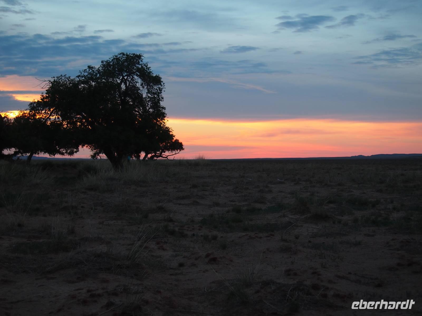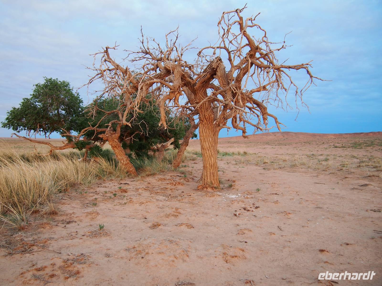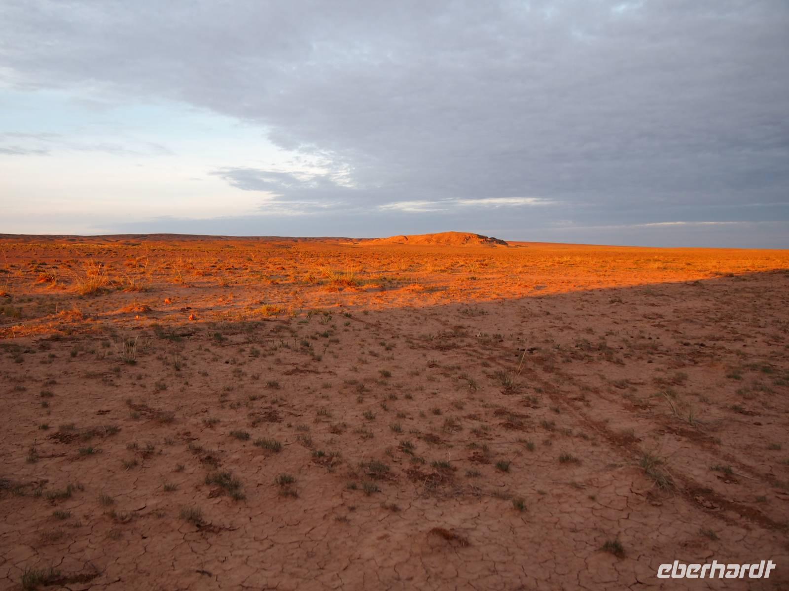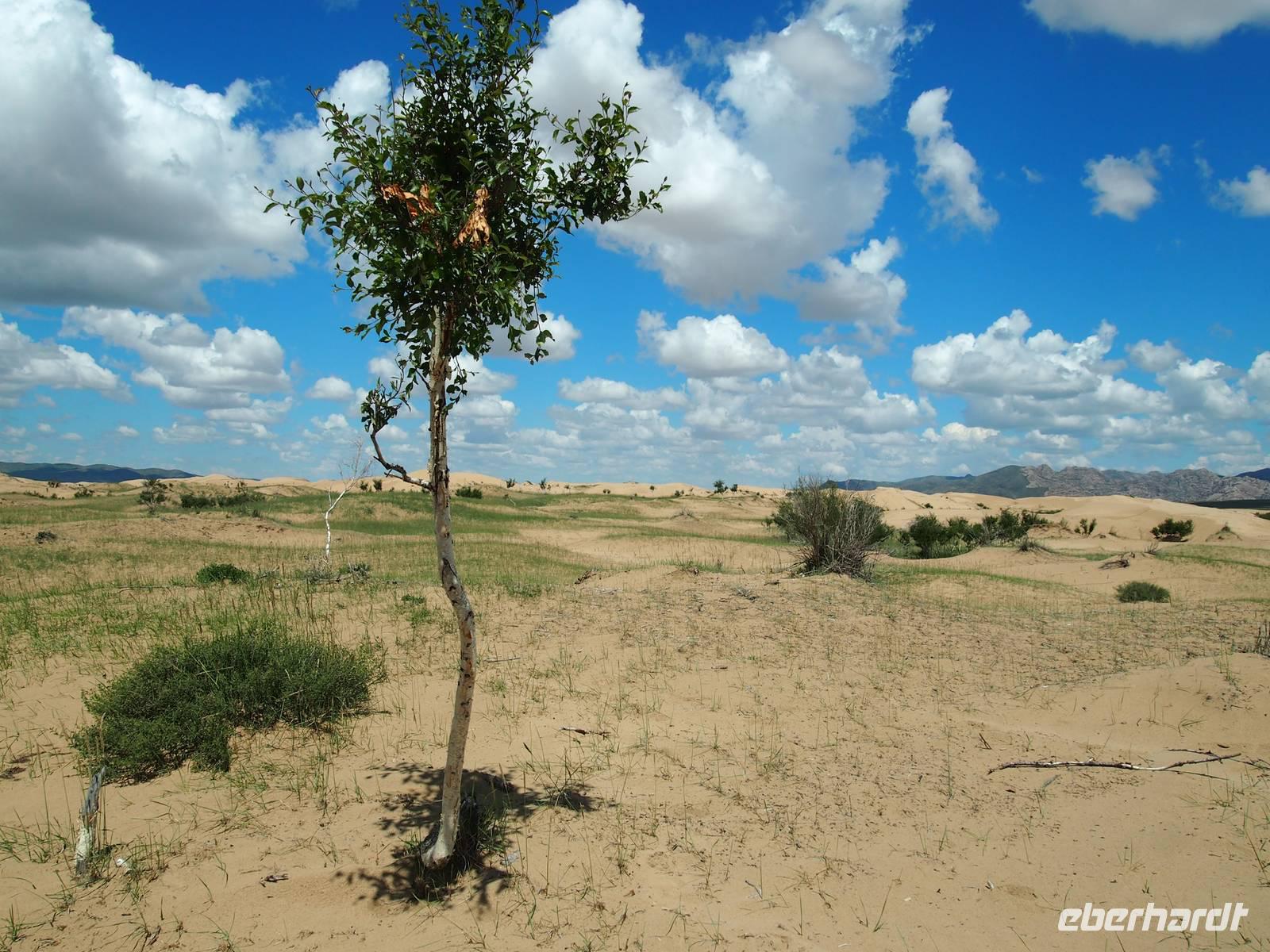 Bevor wir uns auf den Weg zu den Dinosaurierfundstellen machten, guckten wir noch einen kurzen Film über die Fundstelle an. welche nicht weit von unserem Camp entfernt lag. Man hatte einen wunderschönen Blick in den Canyon, der aus rotem Lehm bestand. Hier wurden neben Dinosaurierknochen auch Eier vom Tyrannosaurus Rex gefunden. In der Ferne konnten wir schon den Sauxalwald erahnen. Wir machten uns mit unseren Kameras und Ferngläsern auf den Weg, die Gegend zu erkunden. Im Anschluss fuhren wir zu dem Sauxalwald, wo wir individuell die Gegend erkundeten. Es war total spannend, wie sich die kleinen knochigen Bäume der Landschaft angepasst haben und was für lange Wurzeln sie schlagen können. Nach dem hervorragenden Ausflug ging es zurück zum Camp zum Abendessen. Nach dem Essen spielten einige noch gegen unsere mongolischen Fahrer bis zur Dämmerung Basketball. Am heutigen Abend konnte man ausgezeichnet die Milchstraße und einen sternenklaren Himmel beobachten. Was für ein beeindruckendes Land!