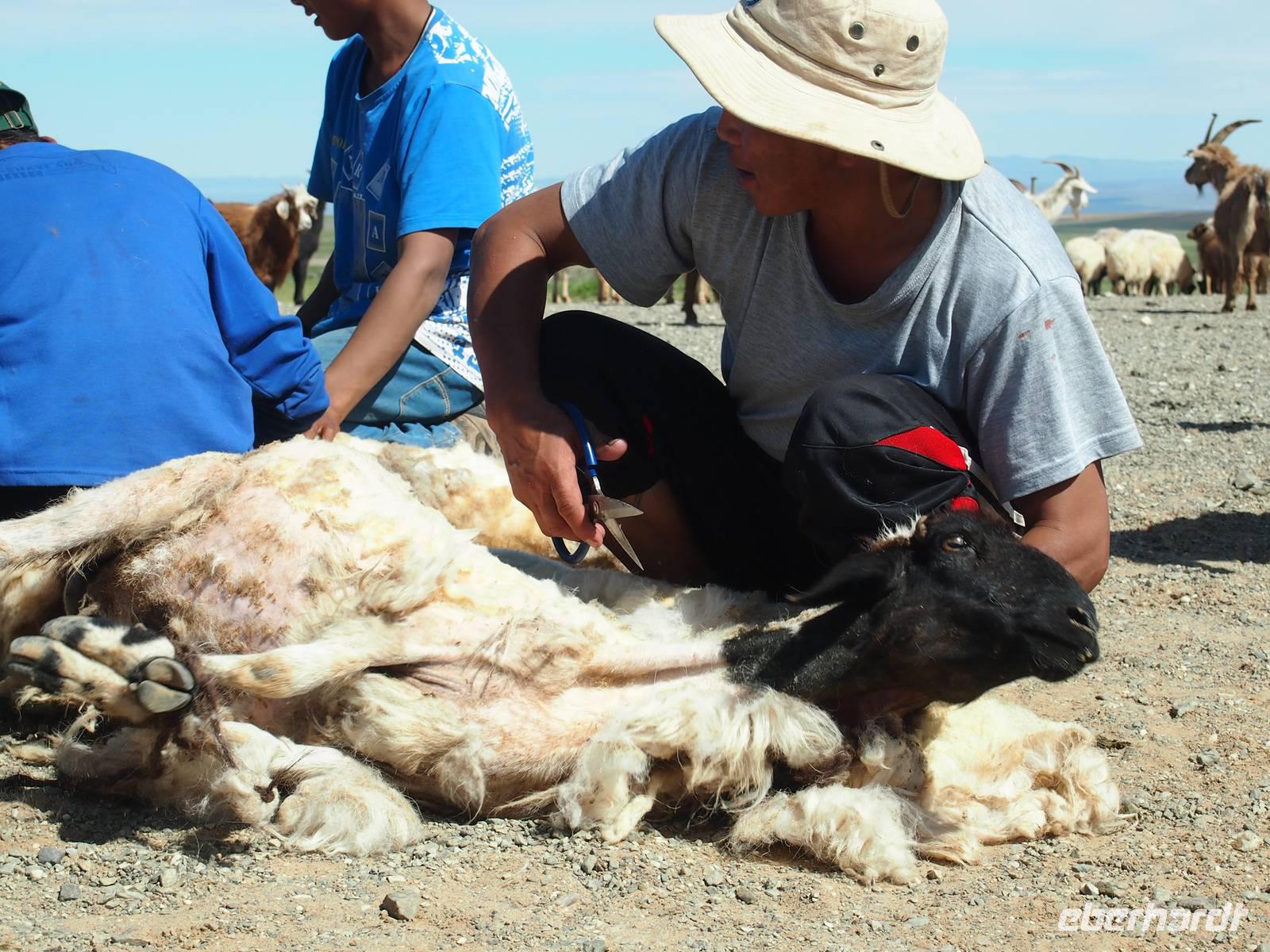 Heute haben sich wieder einige Aktive am frühen Morgen auf den Weg gemacht, um die Morgenstunden zu nutzen. So beobachten wieder einige den Sonnenaufgang oder erkundeten noch einmal die Sanddünen. Nach dem Frühstück fuhren wir weiter Richtung Bayanzag, zu einer Dinosaurierfundstelle und unserem neuen Jurten Camp. Der Weg dahin war spannend. Wir fuhren durch eine Bergwelt, die landschaftlich ein richtiger Augenschmaus war, bevor wir weiter durch die Steppenlandschaft fuhren. Auf dem Weg zum Camp haben wir gesehen, wie eine Familie ihre Schafe geschoren hat. Dies war Grund genug für uns einen kurzen Halt einzulegen. Wir konnten in aller Ruhe fotografieren und die Kinder freuten sich über unsere Süßigkeiten. Kurz vor dem Camp haben wir noch einen kurzen Halt in einem kleinen Versorgungszentrum gemacht. Wir kauften noch Getränke ein und erkundeten kurz das kleine Örtchen. Am Camp angekommen wartete die Camp-Leitung schon mit dem Mittagessen auf uns. Anschließend ruhten wir uns noch ein wenig aus.