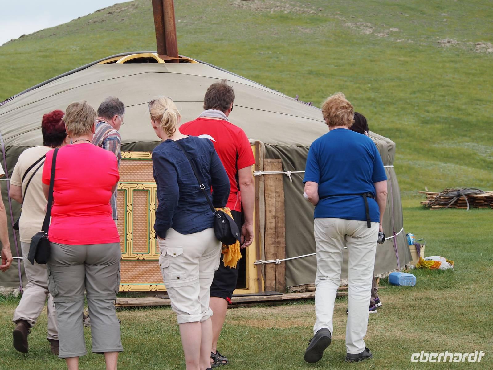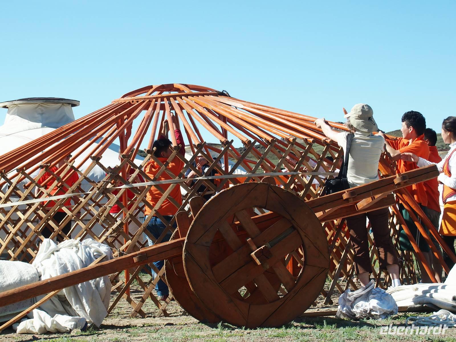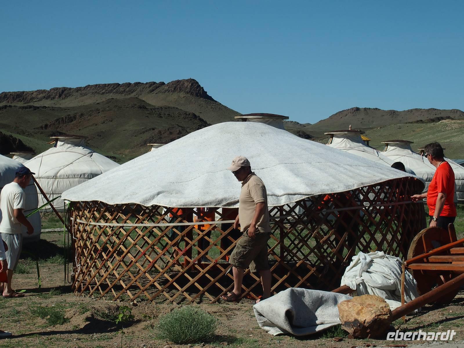 Bevor wir heute unser Camp verließen, hatte wir die Gelegenheit bei dem Aufbau einer Jurte zuzuschauen. Anfangs bauten nur vier junge Männer die Jurte auf, später halfen unsere Fahrer und das Servicepersonal des Camps, sowie einige von uns bei dem Aufbau mit. Nach nur 25 Minuten stand die Ger, wie die typisch mongolische Behausung auch genannt wird. Es war ein tolles Erlebnis, den Bau Schritt für Schritt zu beobachten und dabei mitzuhelfen.