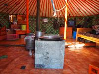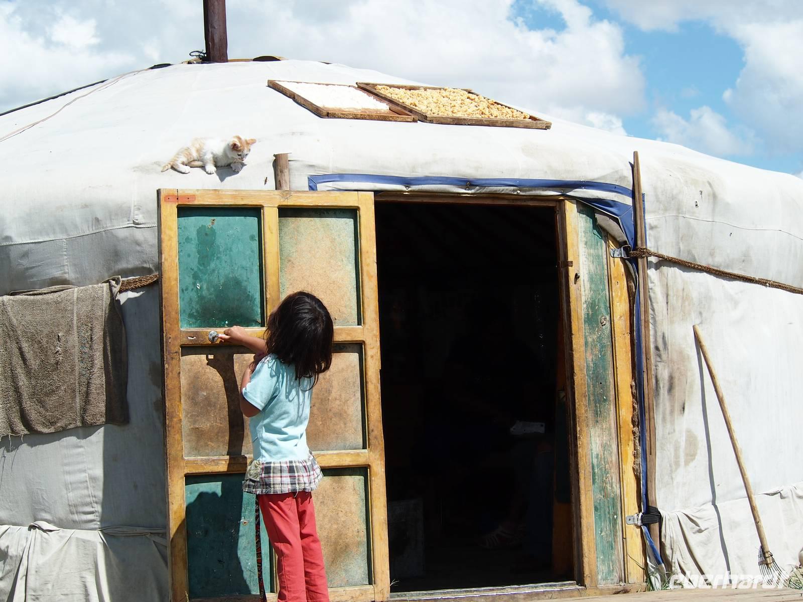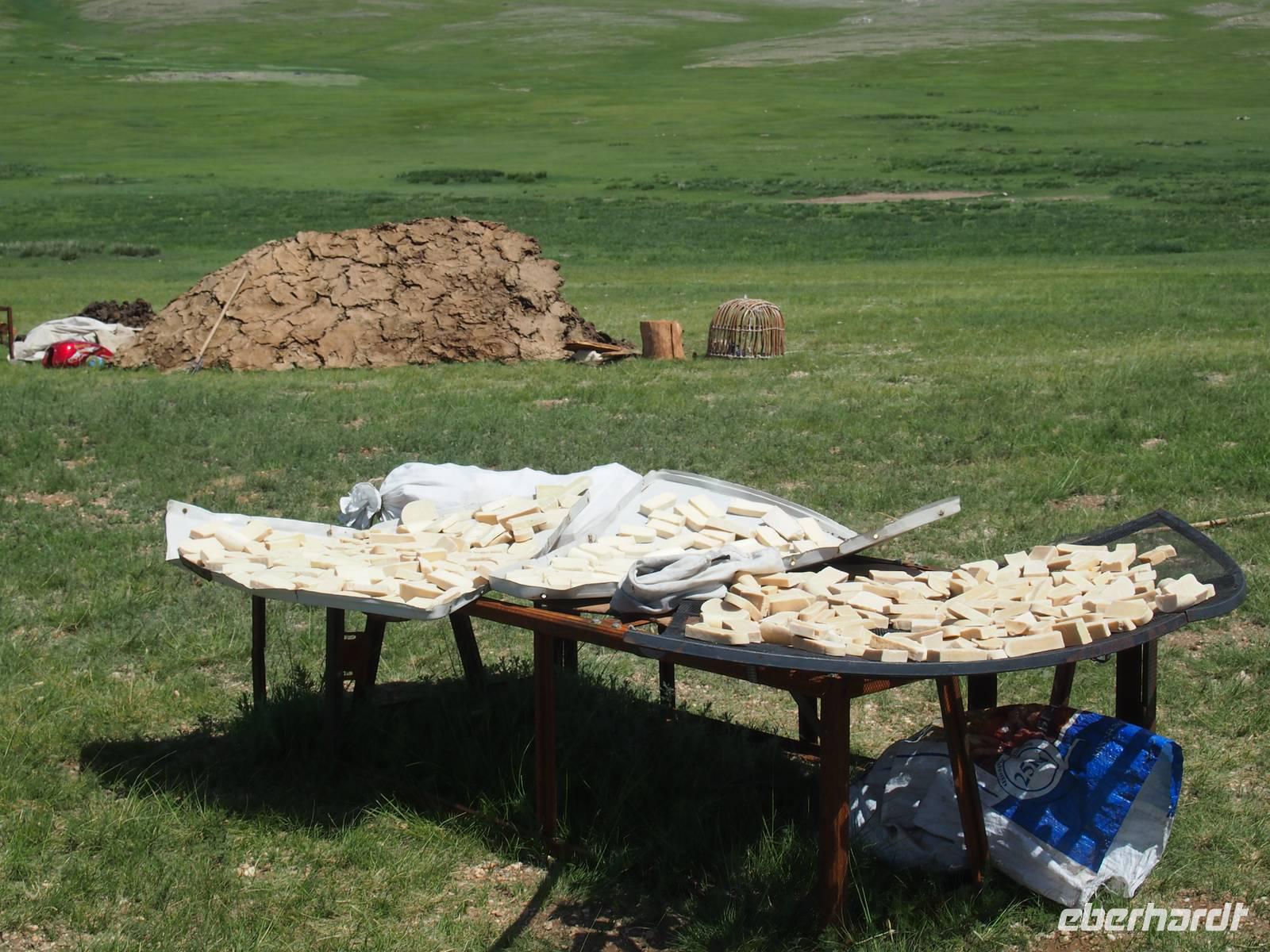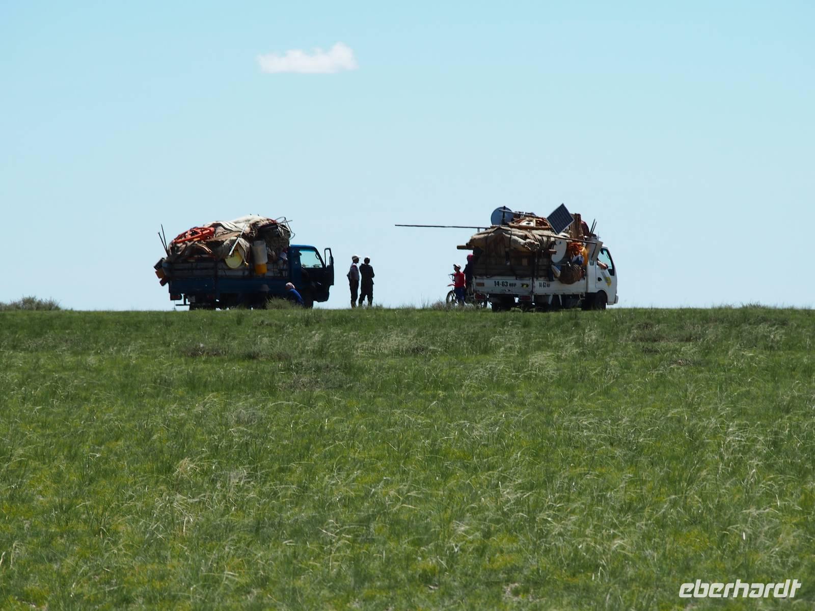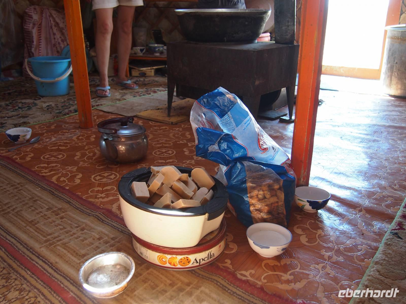Danach verließen wir die Gobi-Wüste und fuhren weiter durch die Steppenlandschaft. Auf dem Weg hielten wir bei einer Kamelnomadenfamilie. Wir probierten viele leckere Sachen, beispielsweise Kamelkäse, Wodka und Airak, was aus vergorener Kamelmilch besteht. Die Familie war sehr gastfreundlich und freute sich riesig über unsere kleinen Geschenke. Unterwegs sahen wir eine weiter Familie, die gerade mit ihren Gers umzog.