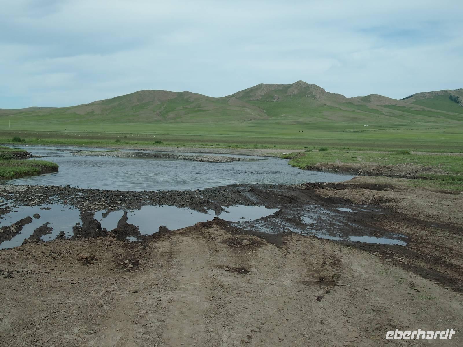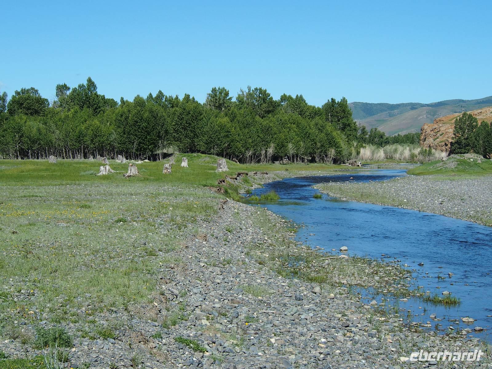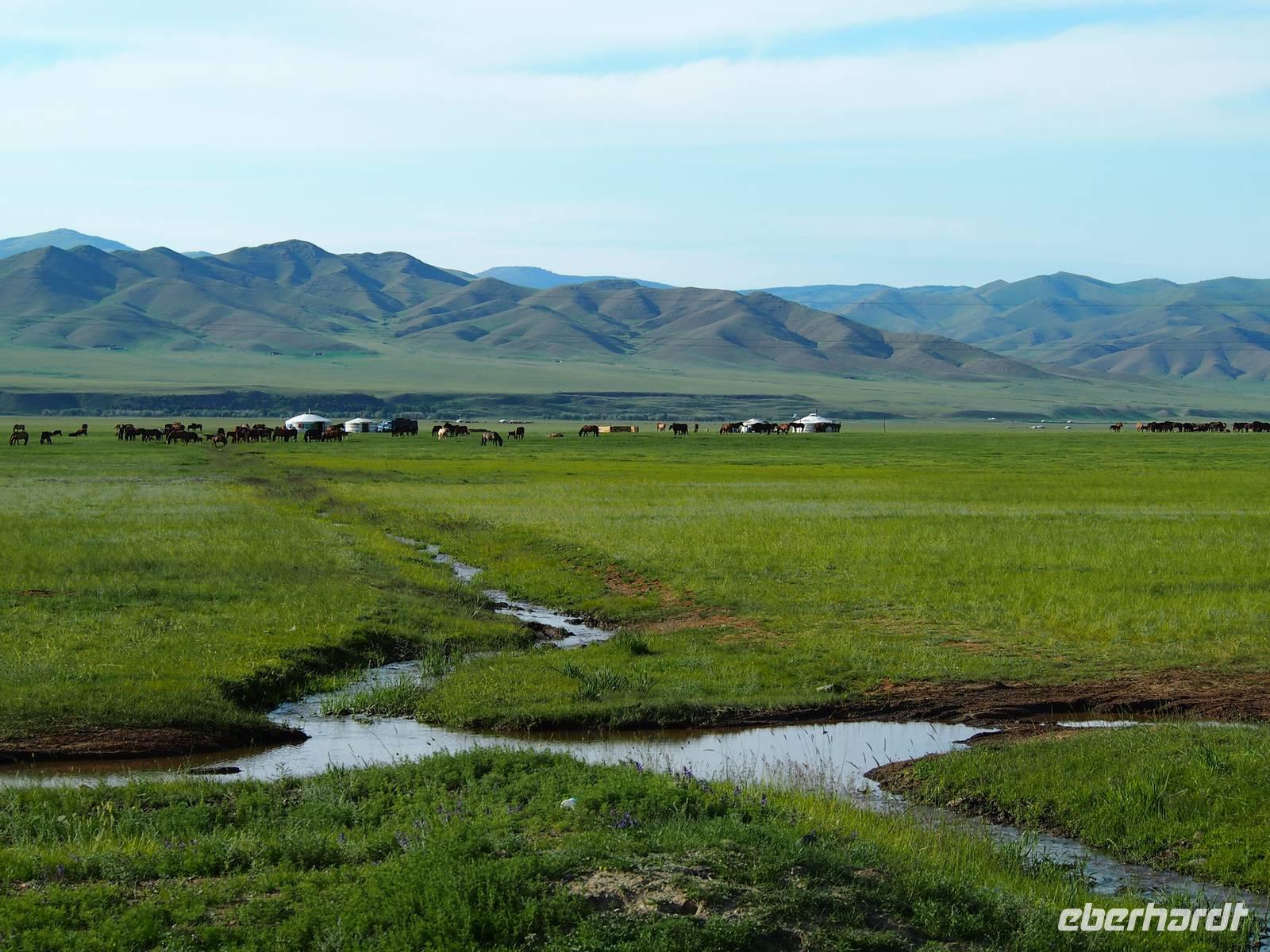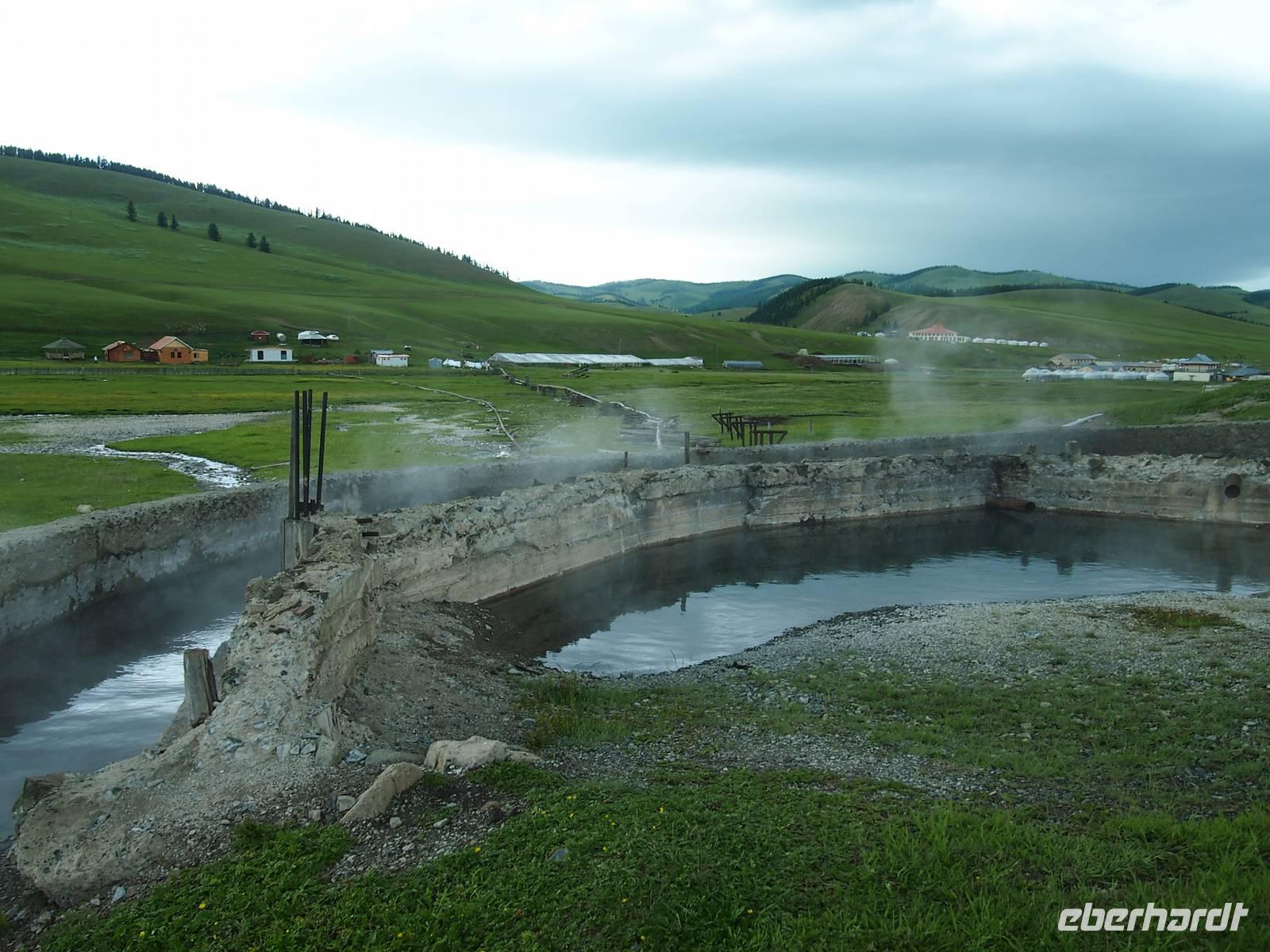 Die Fahrt war heute sehr lang aber führte uns gleichzeitig durch eine traumhafte Landschaft, vorbei an Waldwiesen, die man heute in Deutschland wohl nur noch selten findet. Unser Abenteuer führte uns außerdem durch den ein oder anderen Fluss, über fragwürdige Holzbücken und an unzähligen Tierherden vorbei. Am Nachmittag erreichten wir unser neues Camp. Nach kurzer Erkundungstour begutachteten wir den Ursprung der heißen Quellen, bevor einige von uns diese anschließend im Camp genossen. Nach so einer Fahrt war dies genau das richtige für uns. Abends aßen wir das Nationalgericht Khorgo Khorg, was es nur zu besonderen Anlässen gibt. Da wir auch einige fußballbegeisterte Gäste auf unserer Reise hatten, ließ unsere Reiseleiterin es nicht nehmen, für uns die Liveübertragung im Nachbarcamp zu organisieren.