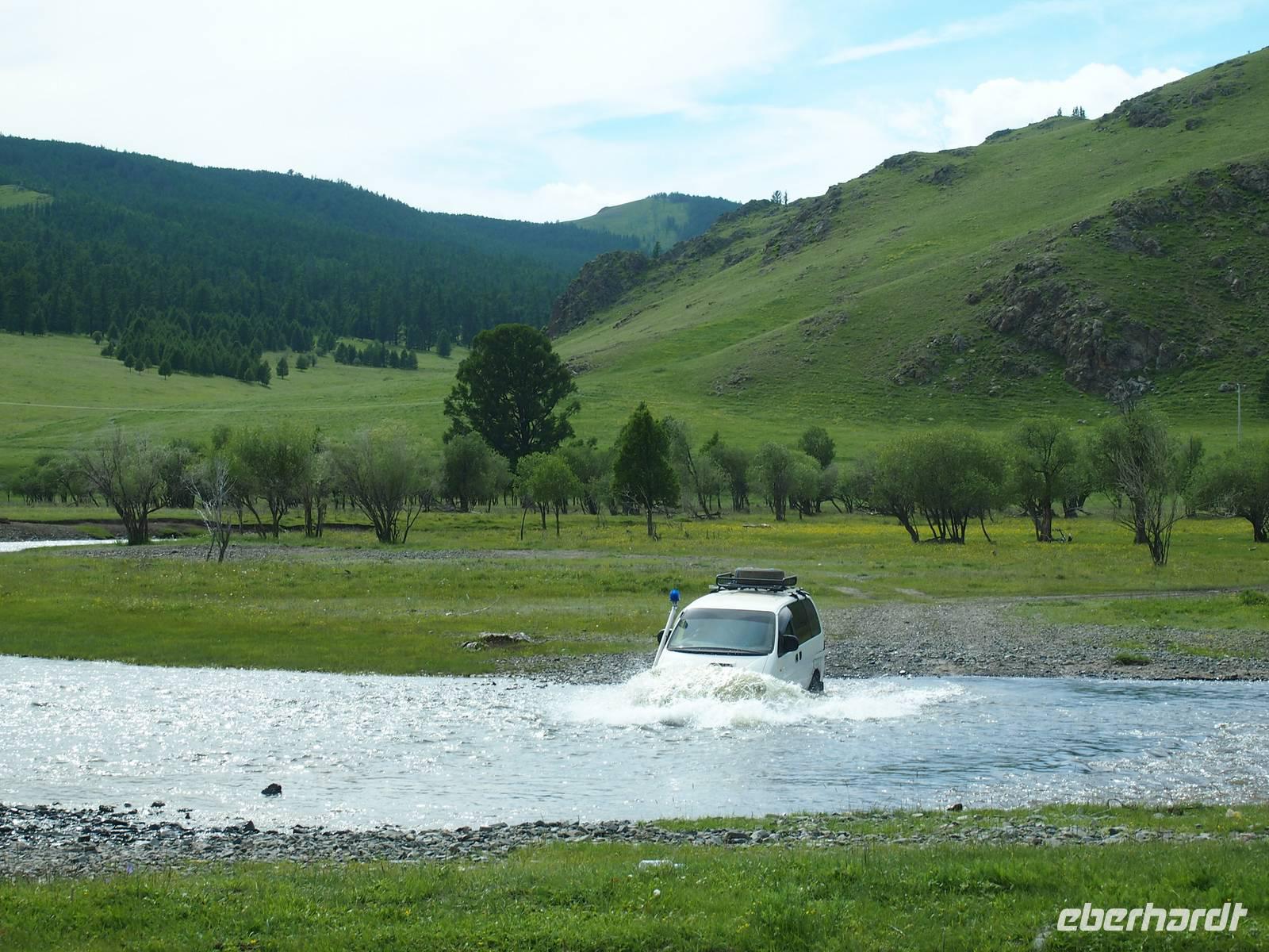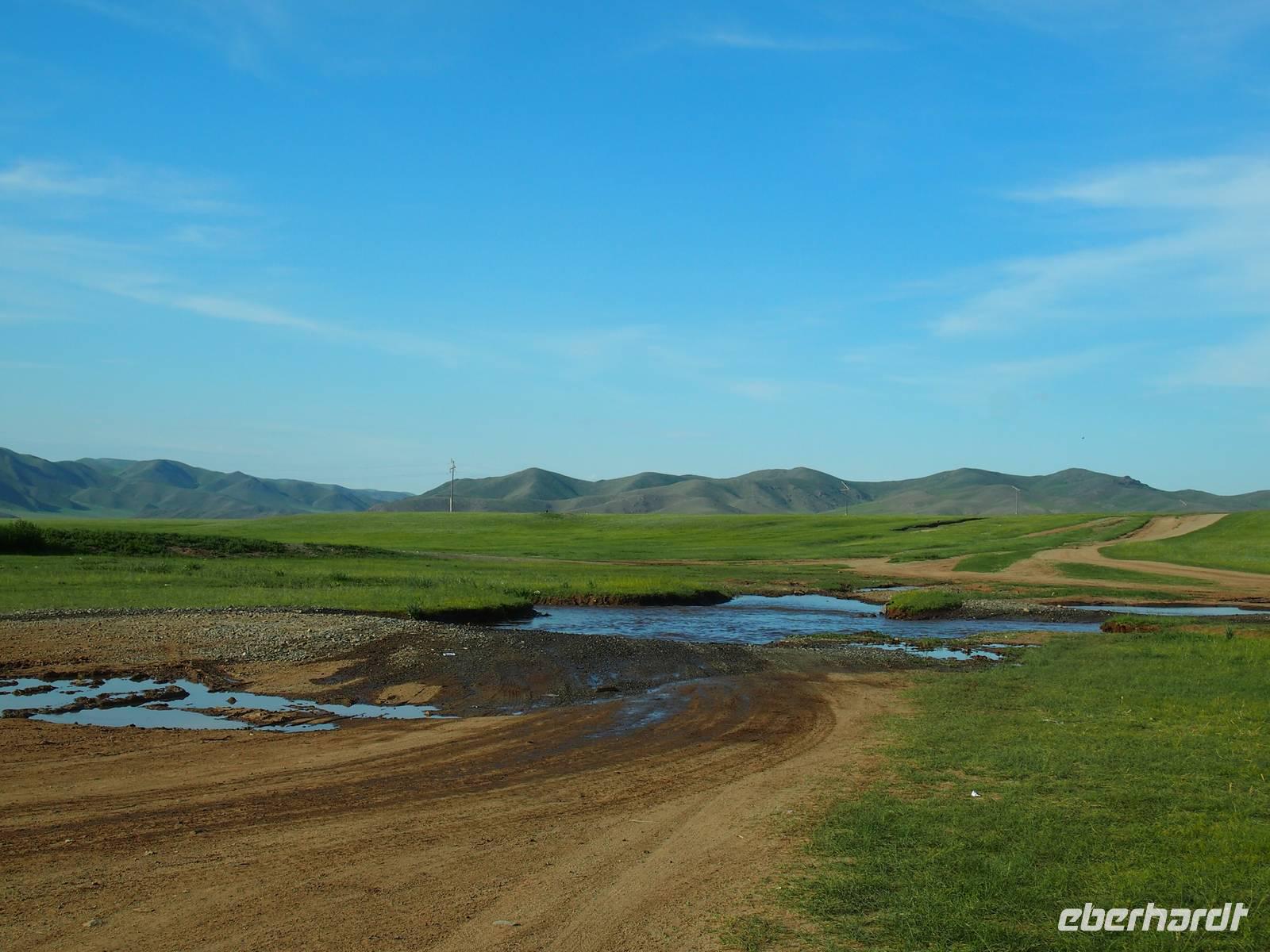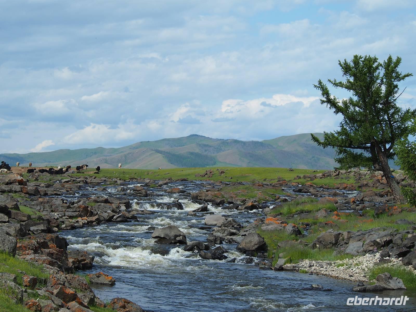 Die Fahrt war heute sehr lang aber führte uns gleichzeitig durch eine traumhafte Landschaft, vorbei an Waldwiesen, die man heute in Deutschland wohl nur noch selten findet. Unser Abenteuer führte uns außerdem durch den ein oder anderen Fluss, über fragwürdige Holzbücken und an unzähligen Tierherden vorbei. Am Nachmittag erreichten wir unser neues Camp. Nach kurzer Erkundungstour begutachteten wir den Ursprung der heißen Quellen, bevor einige von uns diese anschließend im Camp genossen. Nach so einer Fahrt war dies genau das richtige für uns. Abends aßen wir das Nationalgericht Khorgo Khorg, was es nur zu besonderen Anlässen gibt. Da wir auch einige fußballbegeisterte Gäste auf unserer Reise hatten, ließ unsere Reiseleiterin es nicht nehmen, für uns die Liveübertragung im Nachbarcamp zu organisieren.