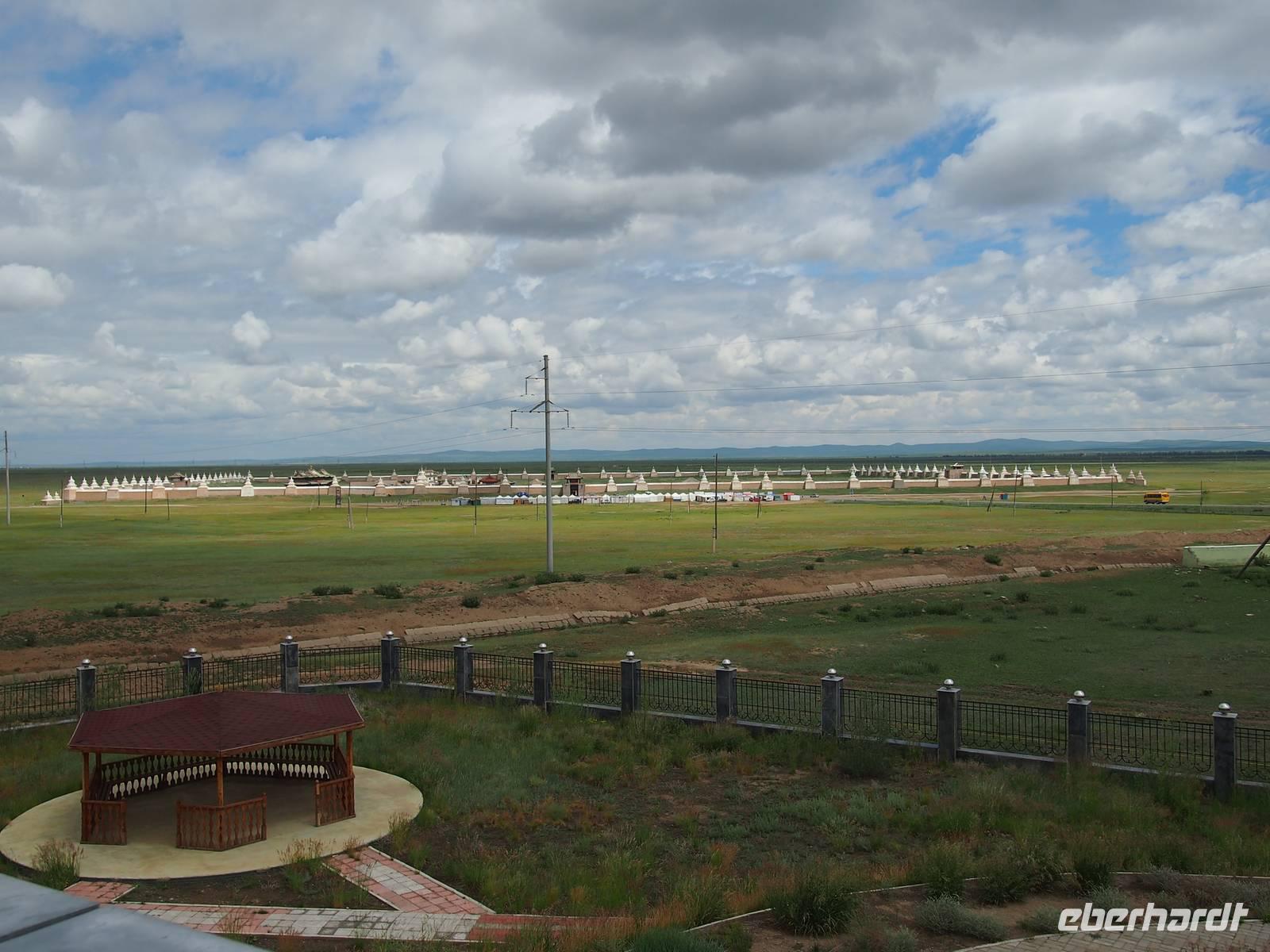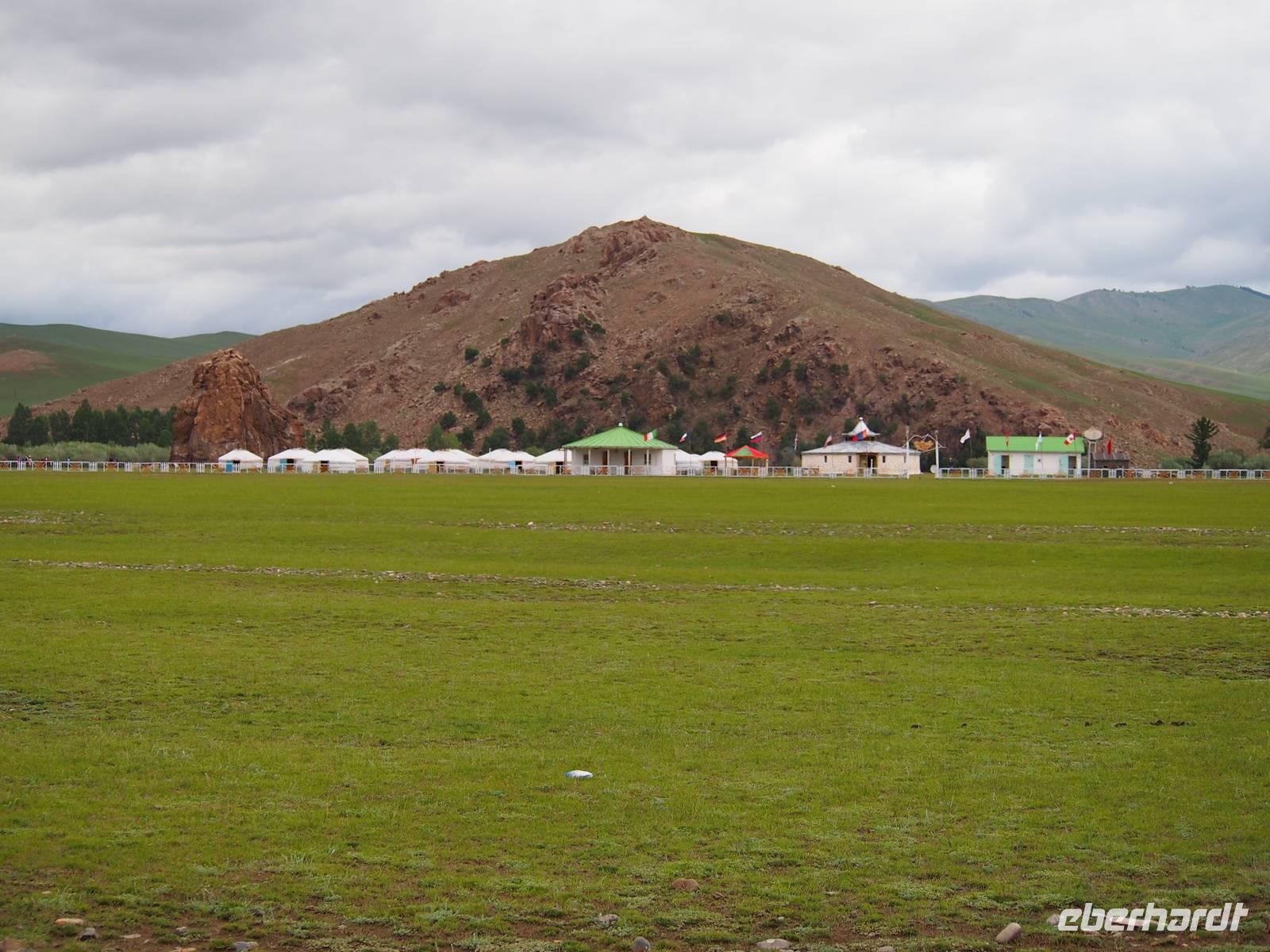 Das Wetter schlug genau gegen Ende unserer Besichtigung um und so fuhren wir zu unserem Camp, wo wir erstmal Mittag aßen. Im Anschluss bezogen wir unsere Gers und ruhten uns etwas aus. Außerdem ließ der Regen erstmal keine Outdoor Aktivitäten zu. Am späten Nachmittag sind wir noch zum Naadam Fest gefahren, was am heutigen Tag in Karakorum stattfand. Leider neigte sich das Fest dem Ende zu, aber es war trotzdem total spannend, das bunte Treiben auf den Festwiesen zu beobachten. So konnte man beispielsweise mongolische Trachten anprobieren, sich mit einem Adler fotografieren lassen oder die Einheimischen auf ihren Pferden bestaunen. Nach dem etwas kurzen aber schönen Ereignis fuhren wir mit den Bussen noch etwas durch die Stadt und zu einem Aussichtspunkt, von wo aus man nochmal die ganze Stadt sehen konnte. Außerdem befand sich auf dem Hügel ein Denkmal, welches nochmal die ehemaligen Ausmaße der Mongolei zeigte. Nach dem Abendessen saßen wir noch gemütlich zusammen und die Fußballbegeisterten fieberten der alles entscheidenden Antwort entgegen, ob man die Möglichkeit hatte, das Halbfinalspiel Deutschland - Brasilien irgendwo zu sehen.