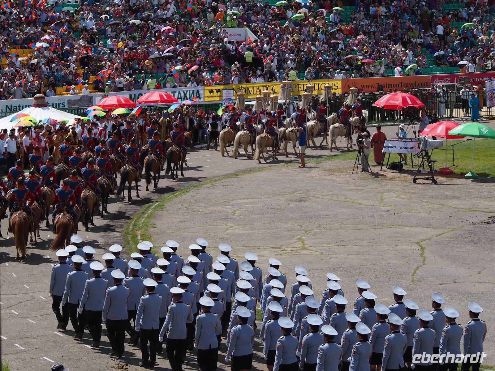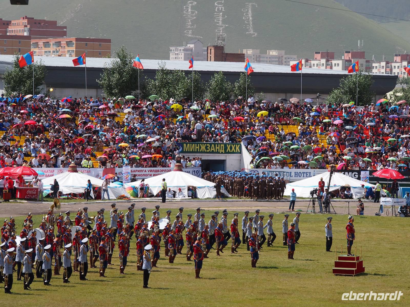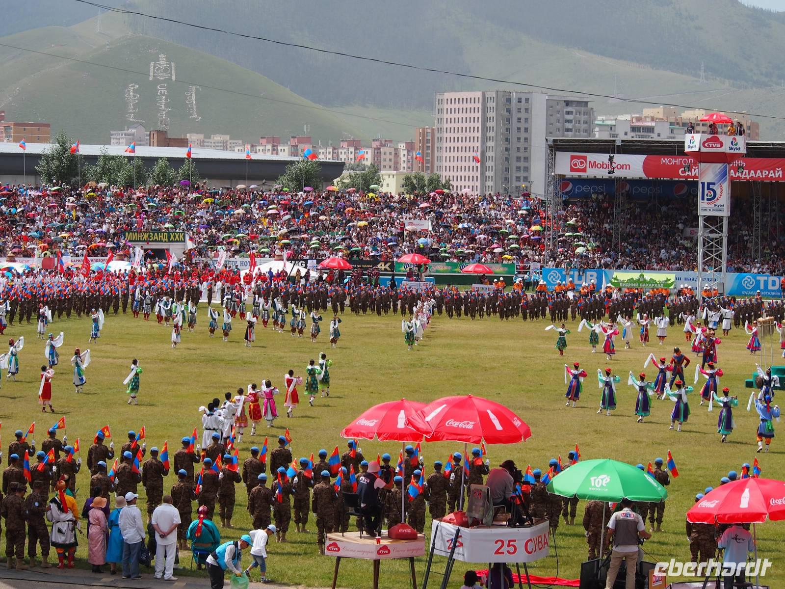 Heute stand uns der Höhepunkt der Reise bevor und gleichzeitig ein krönender Abschluss. Gleich nach dem Frühstück holte uns unser Busfahrer für das Naadam-Fest ab. Um pünktlich bei der Zeremonie vor Ort zu sein, sind wir zeitig losgefahren. Die Straßen waren aber glücklicherweise frei und so erreichten wir das Stadion rechtzeitig und hatten sogar vorab noch Zeit rund um das Stadion den einen oder anderen Stand zu besuchen. Die Zeremonie war wirklich ein absolutes Highlight und ist unvergleichbar. Das Stadion war restlos ausverkauft. Die Eröffnungsfeier war ein riesiges Spektakel, aus vier Eingängen kamen unzählig viele Reiter, Tänzer, Soldaten, Bogenschützen und einzelne Berufsgruppen der Mongolei. Begleitet wurde die Zeremonie von einem unglaublich guten Orchester, das die Stimmung sehr gut rüberbrachte. Die Eröffnungsfeier dauerte insgesamt zwei Stunden. Anschließend kamen die Ringer in das Stadion, sie bereiteten sich auf die bevorstehenden Wettkämpfe vor. Nach der Zeremonie hatte jeder von uns individuell Zeit, das Naadam zu erleben. Viele von uns blieben im Stadion um die ersten Ringkämpfe zu sehen. Es fanden auf dem Rasen mehrere Wettkämpfe gleichzeitig statt und es war schwer, den Überblick zu behalten, wer bei welchem Kampf Schiedsrichter war. Am faszinierendsten war dabei der Tanz des Gewinners der jeweiligen Runde. Die Sieger bewegte seine Arme und Schultern, wie ein Adler seine Flügel. Mindestens genauso spannend war aber auch das Bogenschießen. Bei dem Wettkampf traten sowohl Männer als auch Frauen gegeneinander an. Die Frauen standen den Männern dabei in nichts nach. Auf dem Fest konnte man noch weitere tolle Sachen und Wettkämpfe erleben, so beispielsweise den Wettkampf des Knochenwerfens. Dabei hockten Männer auf dem Boden und schnipsten Ziegenknochen auf einen Haufen mit Schafsknochen. Das Festgelände glich einer Kirmes, zahlreiche Buden lockten zum Stöbern und Verweilen ein. Viele von uns gönnten sich zum Mittag einen leckeren Schaschlik-Spieß, die mit viel Liebe zubereitet wurden. Am Nachmittag fuhren wir zu unserem Hotel zurück und ruhten uns etwas aus. Da wir auf unserer Reise schon das ein oder andere Pferderennen gesehen hatten, beschlossen wir auf das große Pferderennen zu verzichten. Den Abschluss unserer einmaligen und großartigen Reise genossen wir in einem mongolischen Grillrestaurant, in dem jeder sein Essen individuell zusammenstellen und auf dem Grill zubereiten lassen konnte. Nach dem Essen trennte sich unsere Gruppe, einige wollten zeitig zu Bett gehen, weil es am nächsten Morgen zeitig raus ging. Die anderen wollten noch ein wenig das Fest auf dem Dschingis-Khan- Platz erleben. So oder so war es ein gelungener Abschluss. Wir verabschiedeten uns von Tsegi, unserer Reiseleiterin und so langsam wurde es allen bewusst, dass es morgen wieder in die Heimat geht.