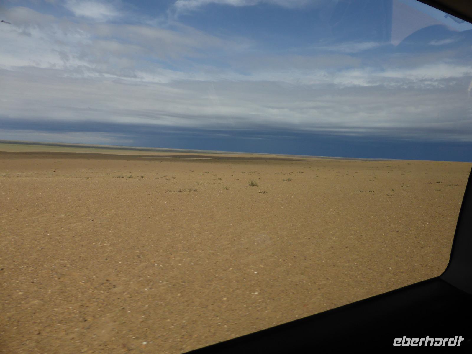 Jetzt wieder offroad Richtung Sanddüne. Weiter entlang der drei Berge, rechts von uns. Ansonsten eine Ebene soweit das Auge reicht. Der Boden wird sandiger, nur Steppengras und die sogenannten Kamelbüschel. So gut wie gar keine Nomaden. Tierherden nicht mehr zu sehen. Wüstenpferde wohl.