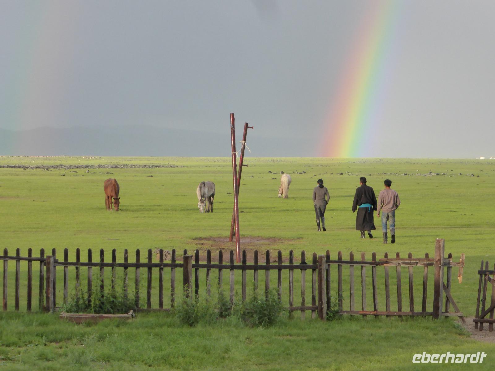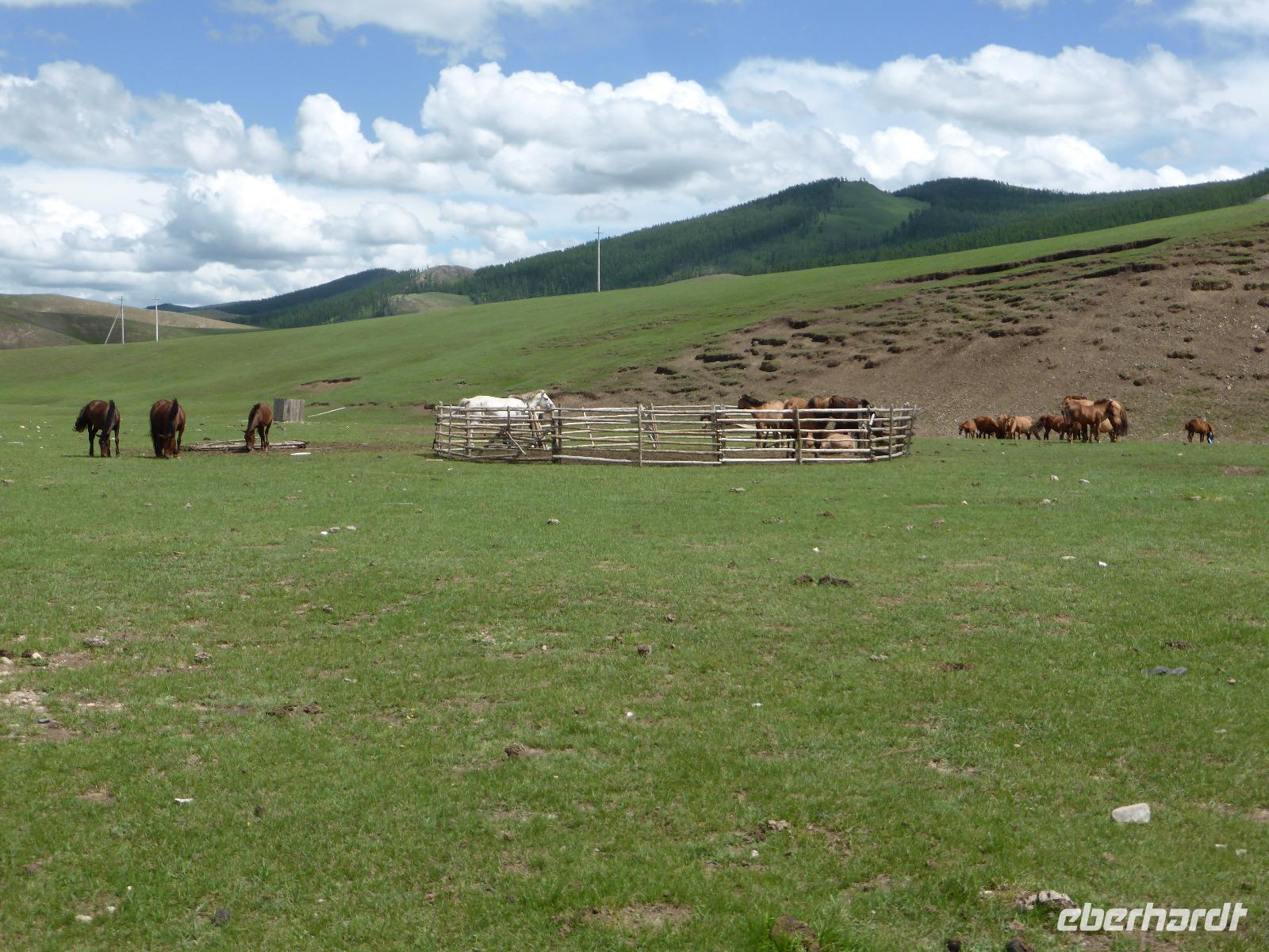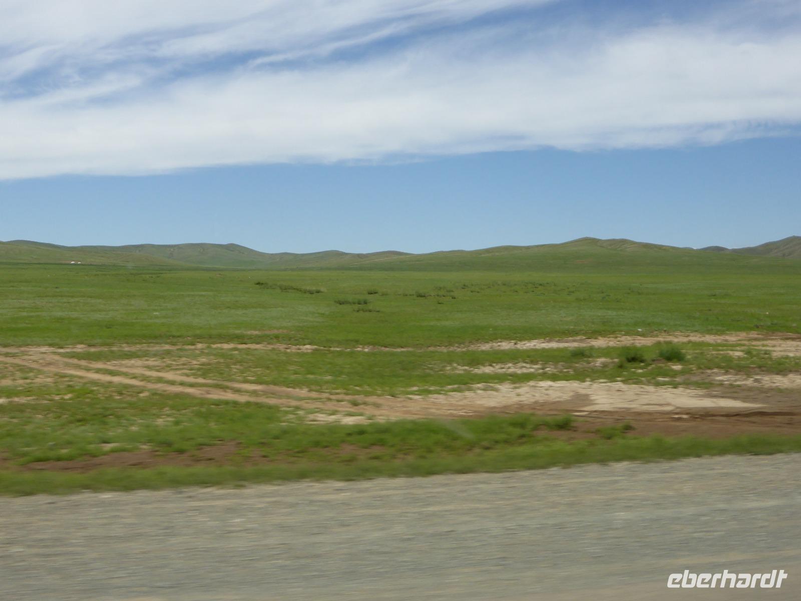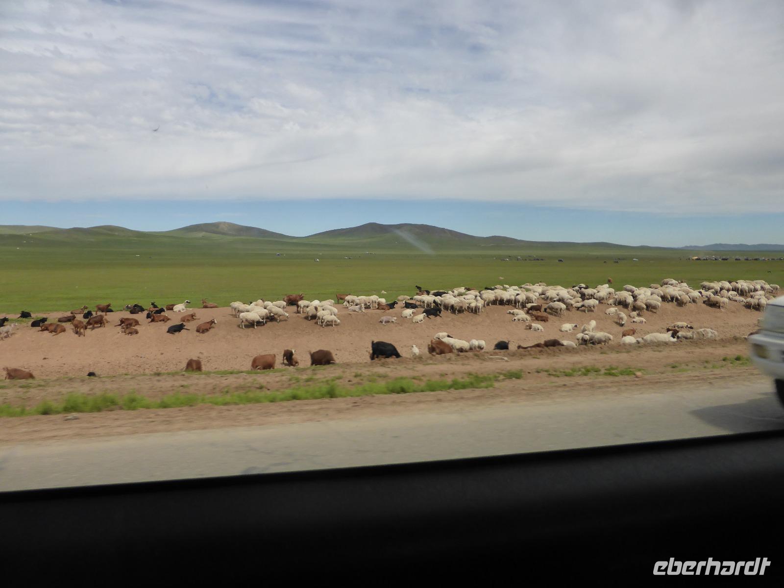 Erst um die Mittagszeit endet der Regen. Dicke weiße Haufenwolken in malerischen Gebilden am Himmel. Dazwischen Blau. Die Landschaft in verschiedenen Grüntöne, geradewegs fahren wir hinein. Mehrere Fahrspuren erlauben nebeneinander zu fahren. Fast wie im Alpenvorland sieht es aus. Immer häufiger sehen wir Jurten und Tierherden. Mittagessen gibt es unterwegs als wir auf die Straße stoßen. Gewissermaßen fahren wir jetzt pausenlos an Tierherden vorbei, freuen uns über einen klassischen Nomaden, der Tiere mit dem Lasso einfangen will.